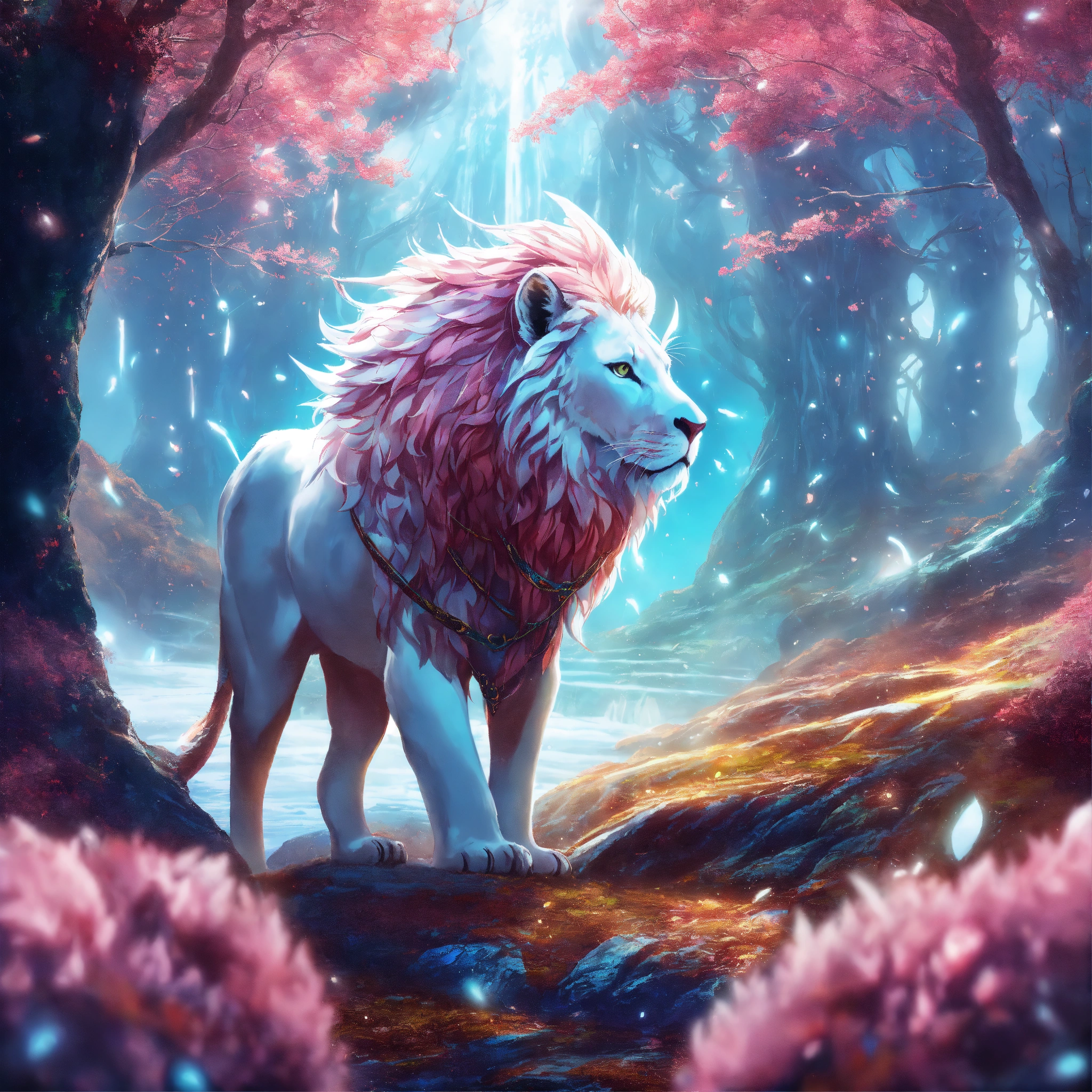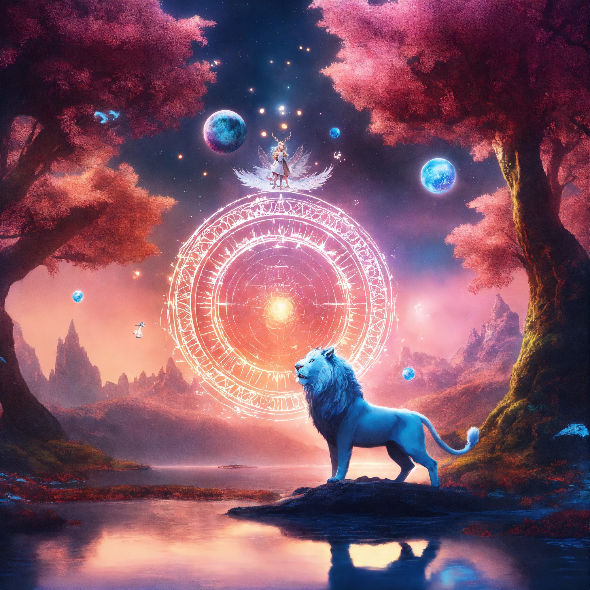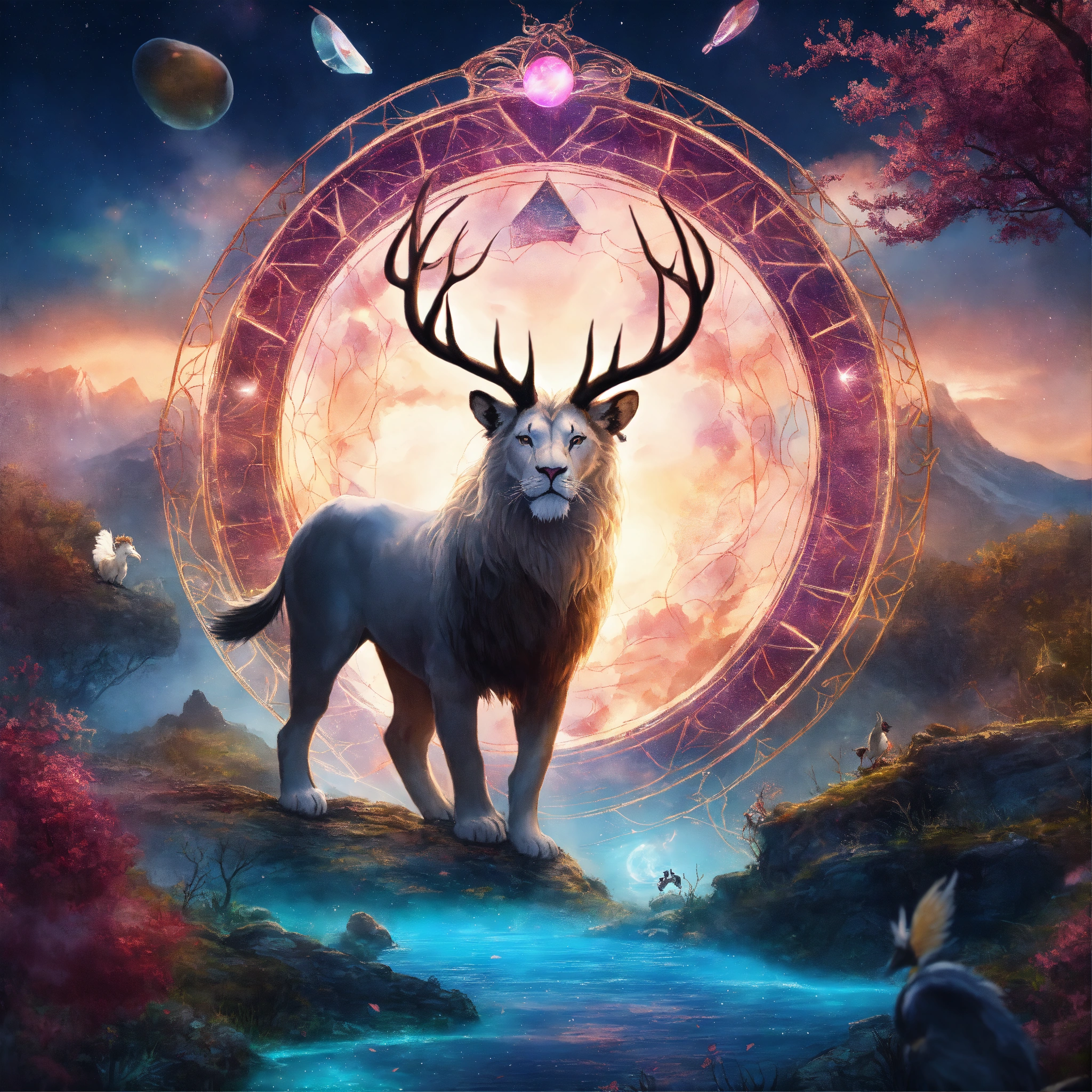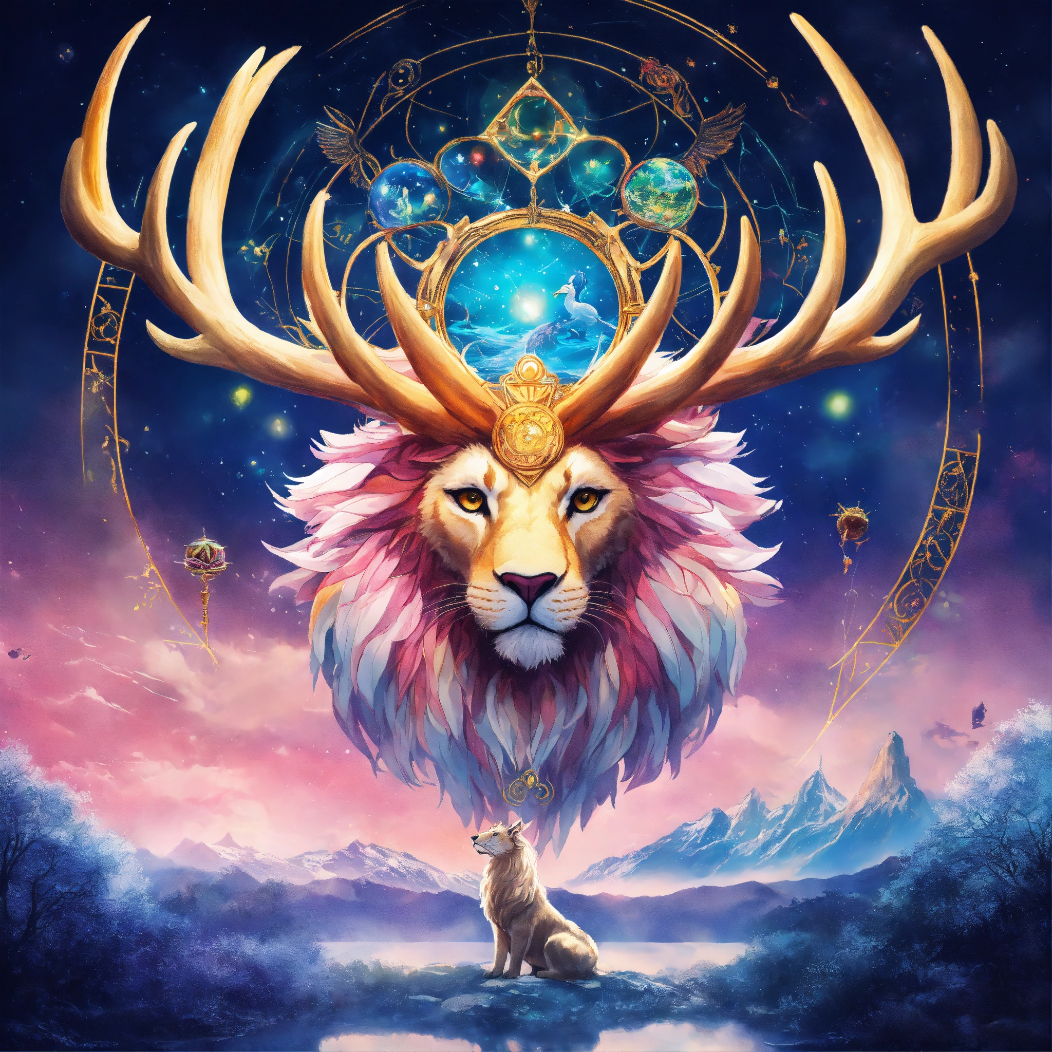 Underwater long exposure photography style, cartoon style, white giant lion elk antler, eagle wings flying in the cosmos with orbs and portals, x-ray style, in the style of tim burton, lion king, the chronicles of narnia, beauty and the beast, and peter pan. with sacred geometric patterns on the body. enchanting aura. the chronicles of narnia, wizard of oz, and alice in wonderland background with snow mountains, and trees with pink leaves.