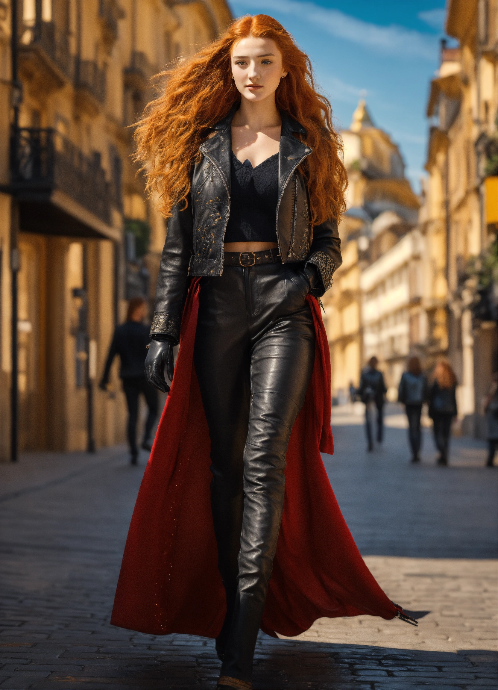 A beautiful 20 years old girl wearing a black leather jacket, pants and gloves walking in a sunny european city outside golden summer light, by gustav klimt art, deco art nouveau style, stunning intricate details, high definition, 8k render fullbody, very long red hair looks like a real life version of sansa stark