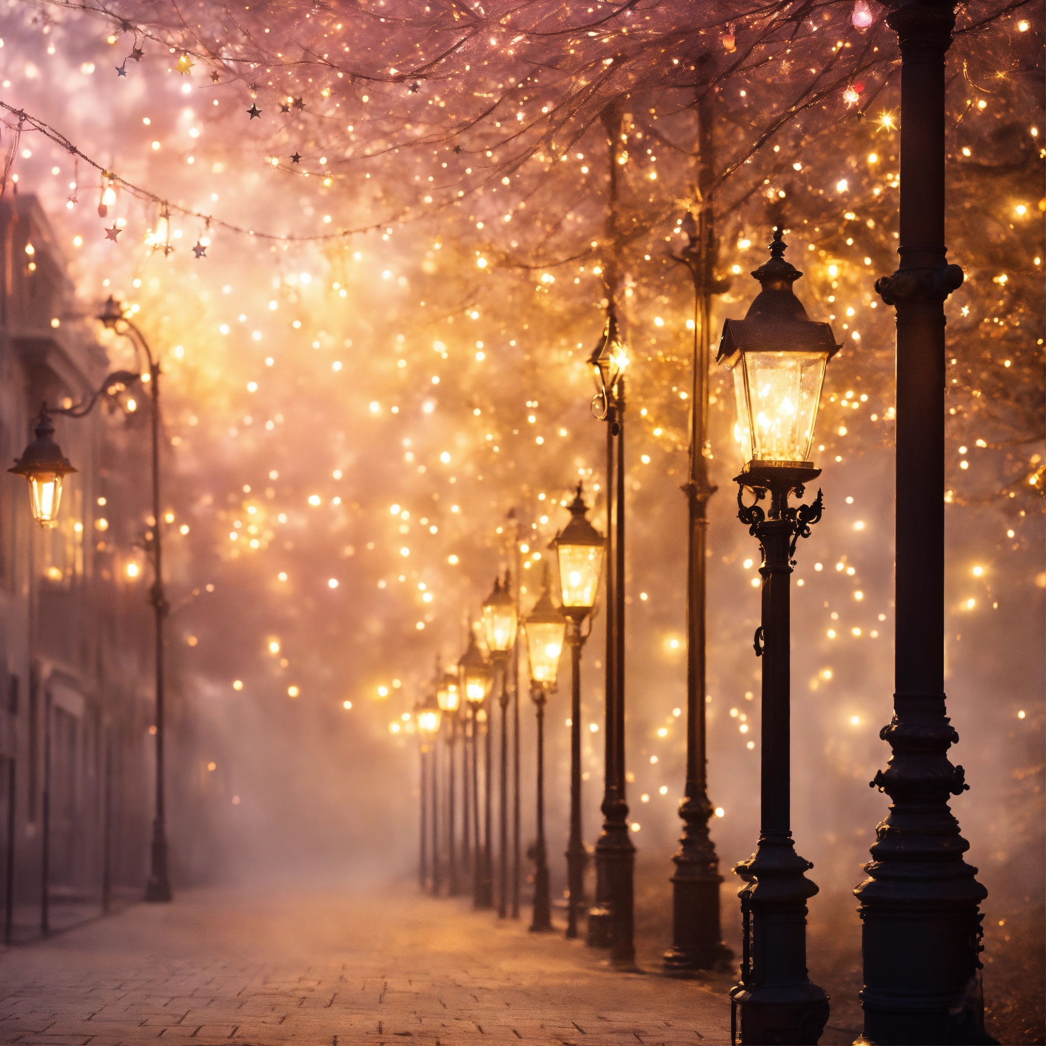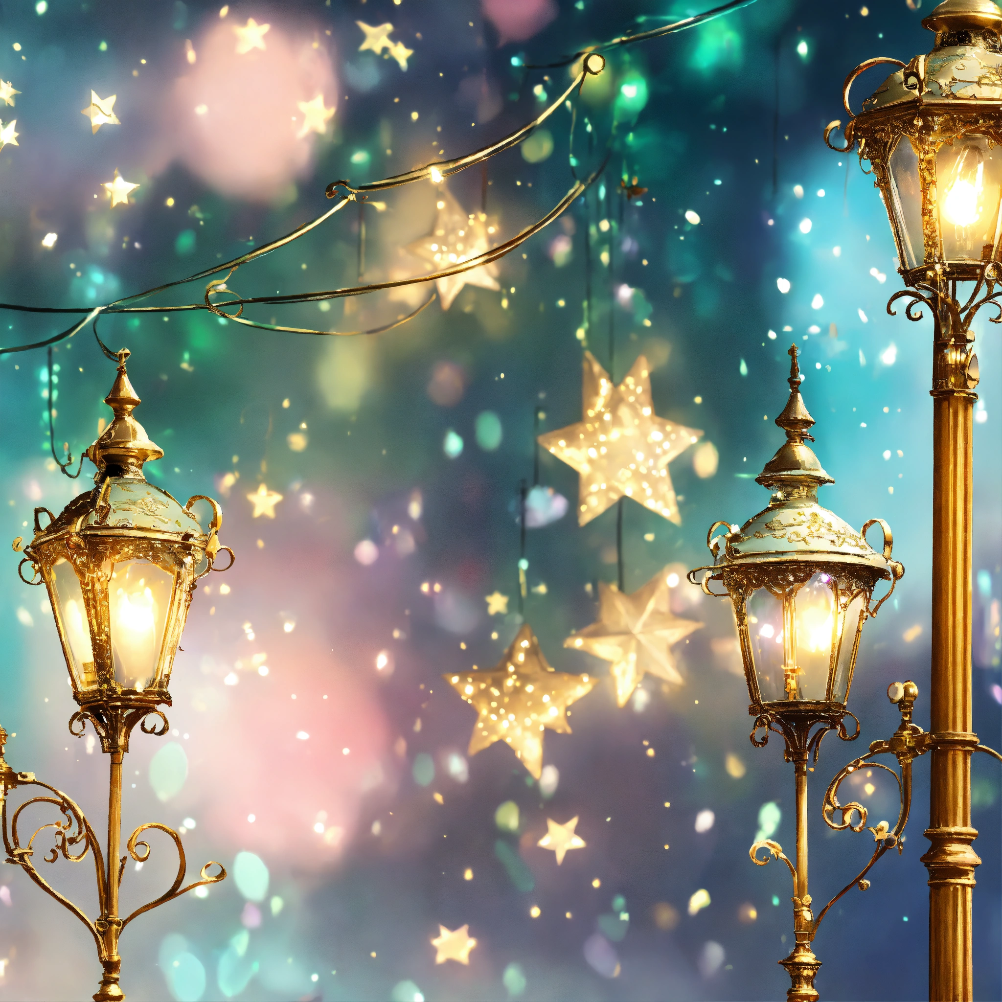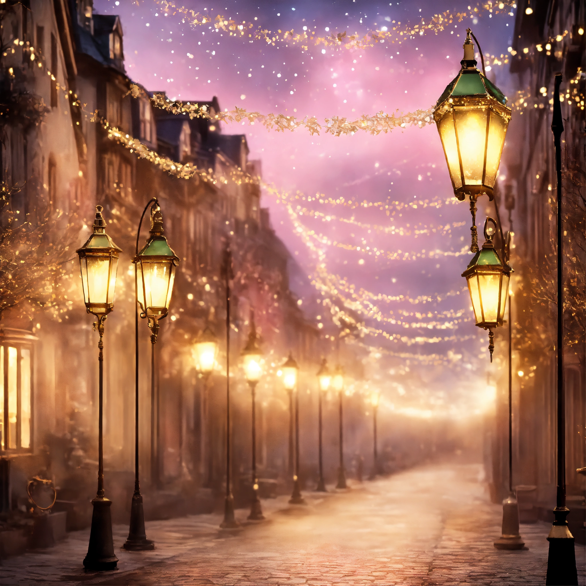 Shabby chic dreamy mist pastel junk journals vintage retro old age street lamps lights and gold sparkeling stars and with christmas decorations swirling magical fairytale abstract art style