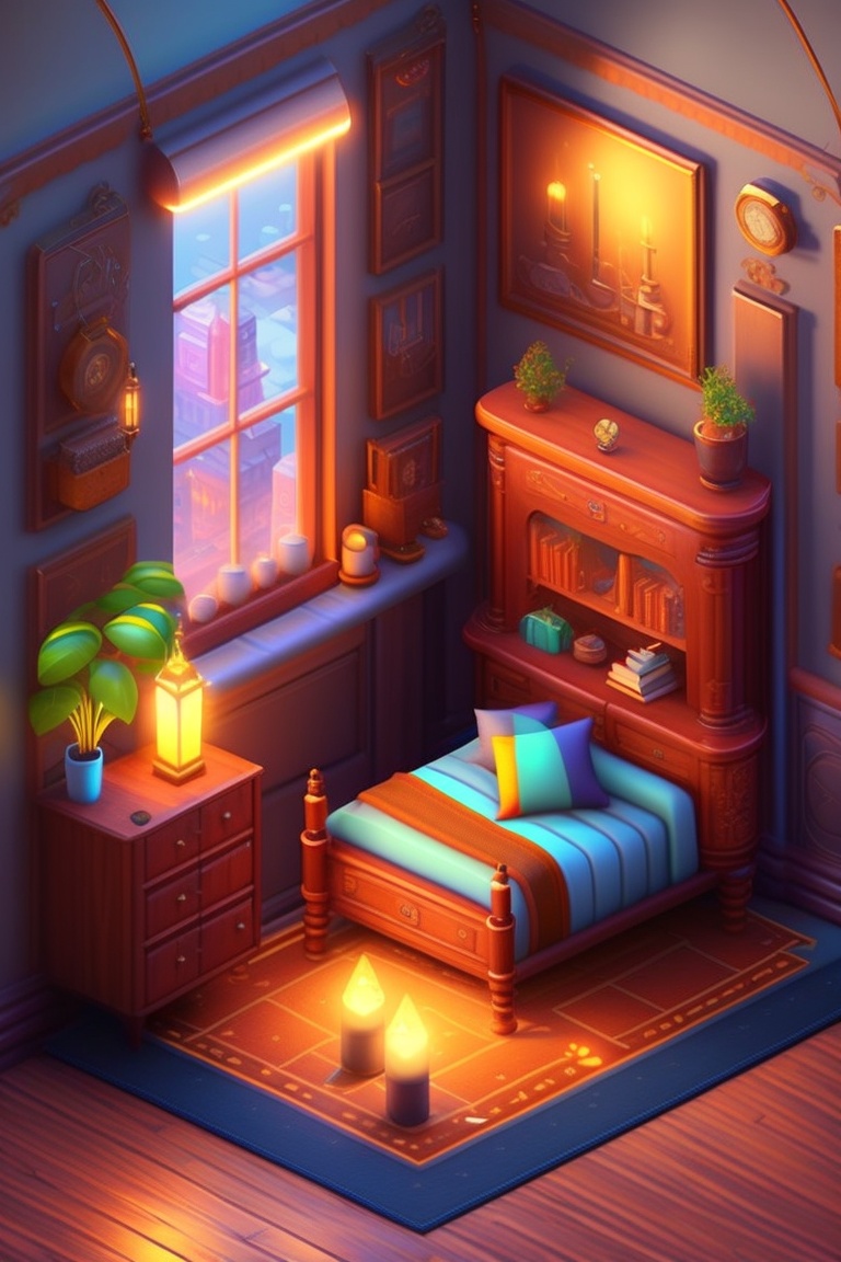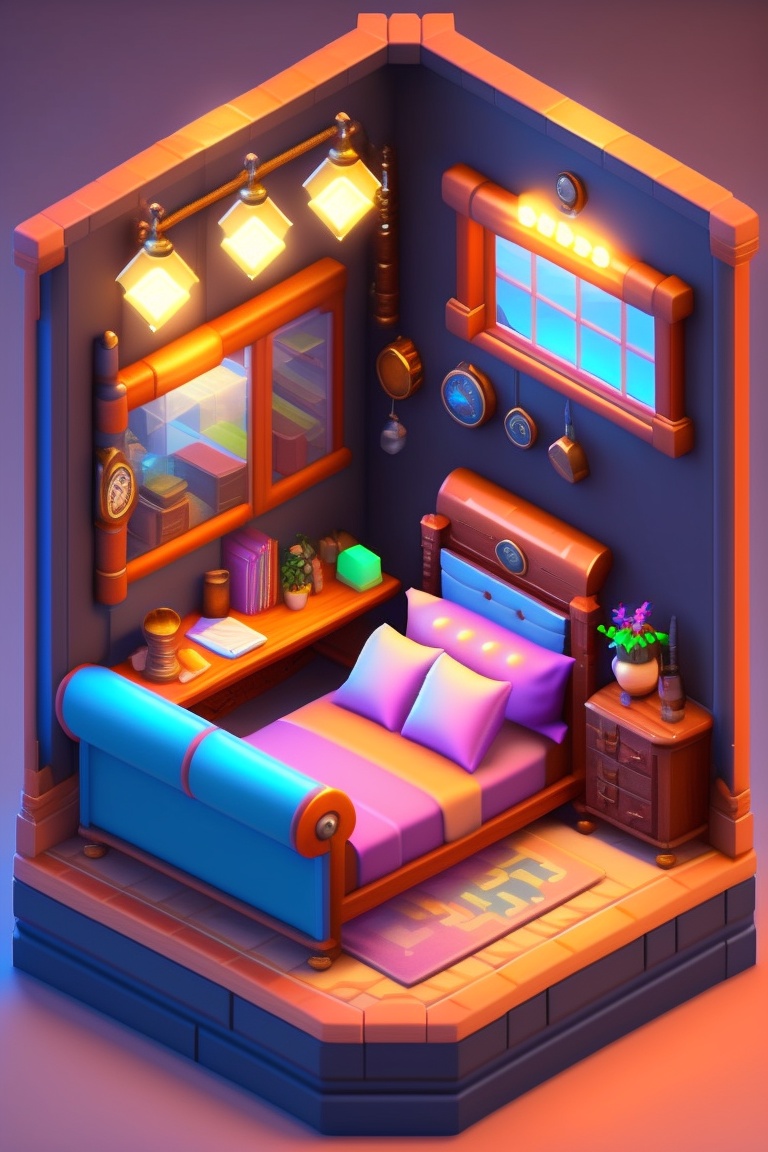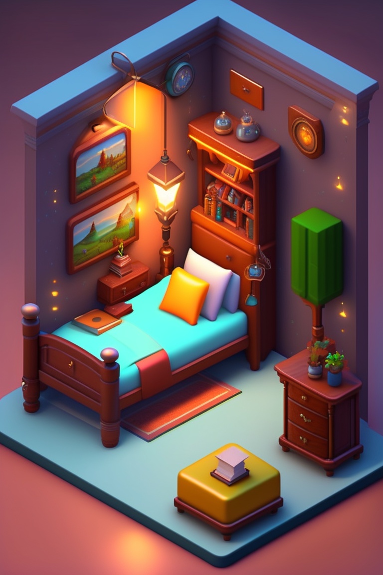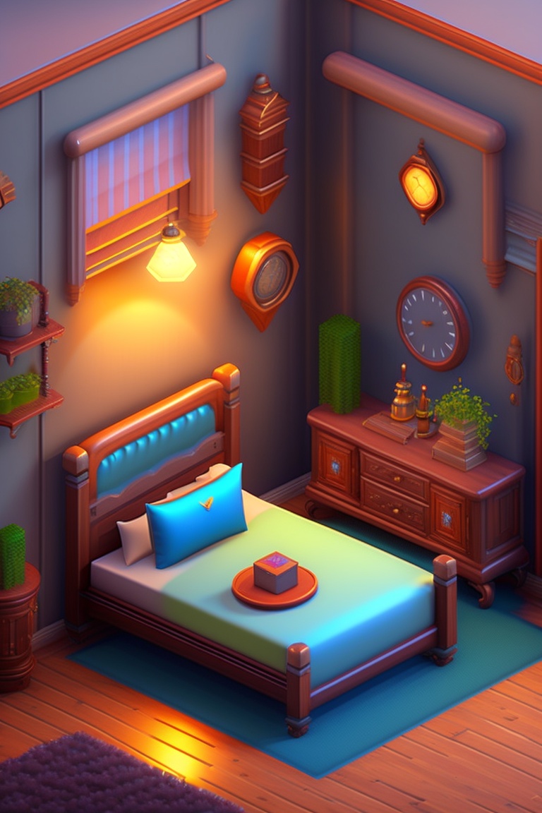 Isometric clean game screenshot image of a cozy steampunk bedroom, robot character pixel art, unreal engine