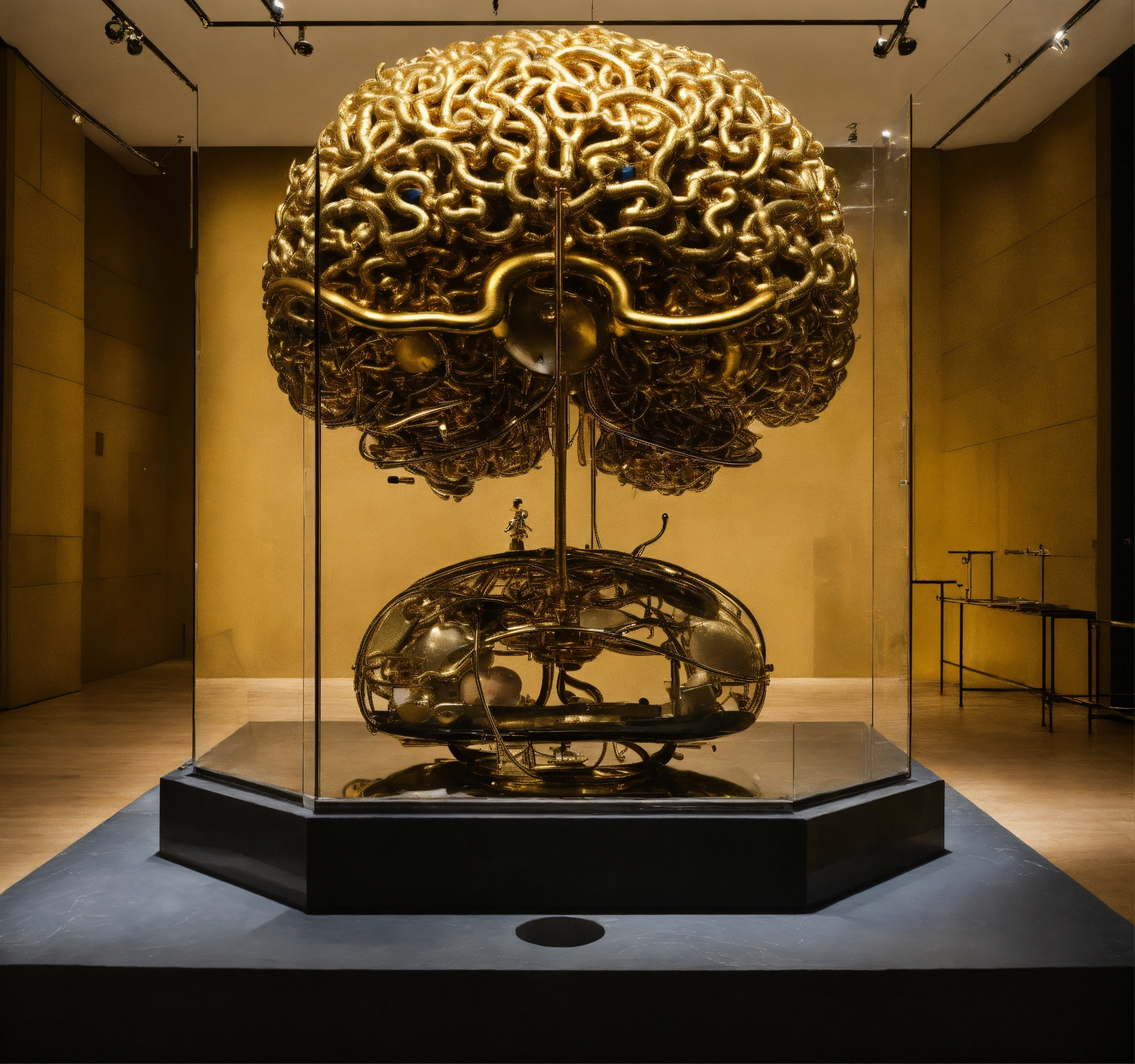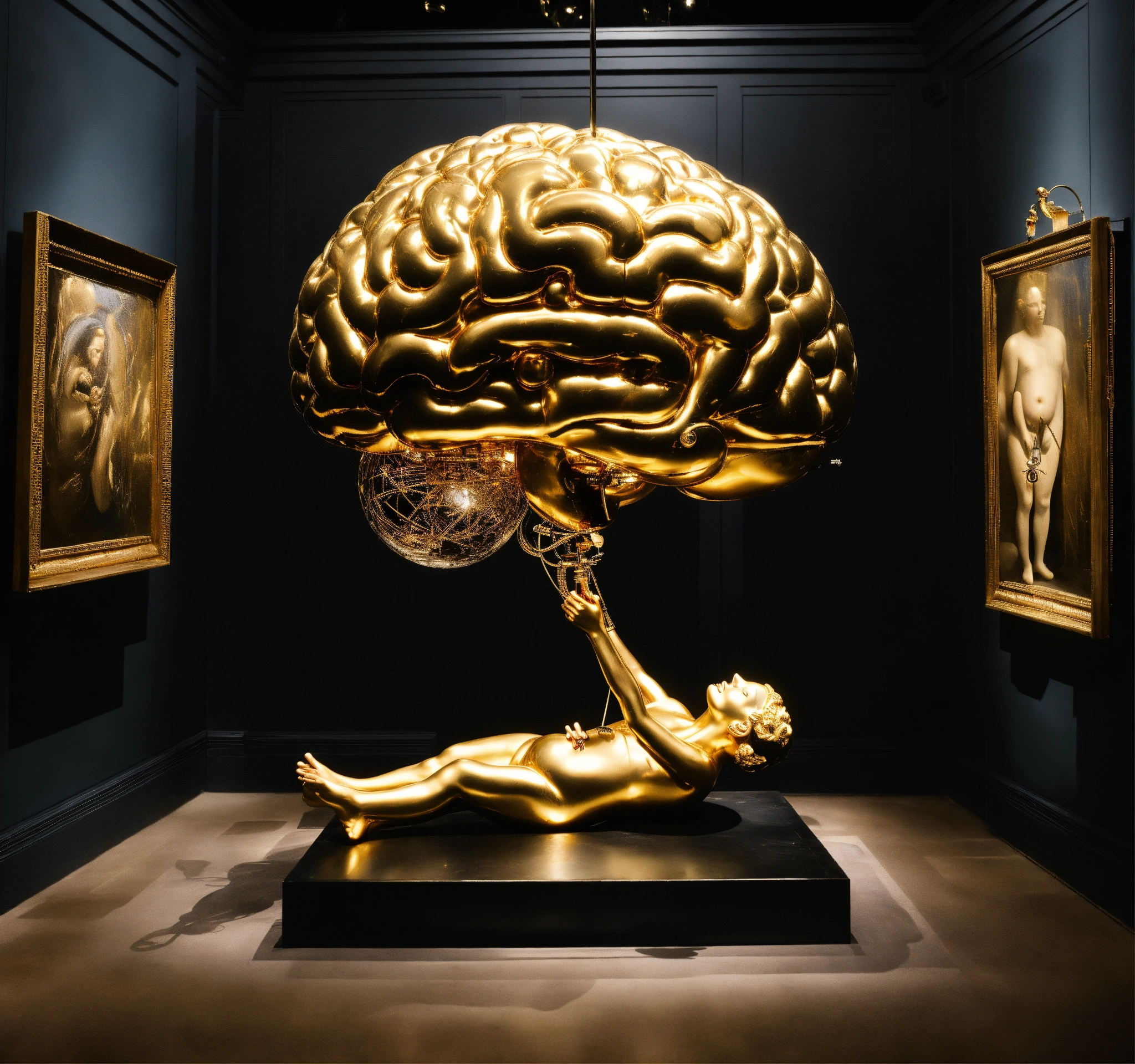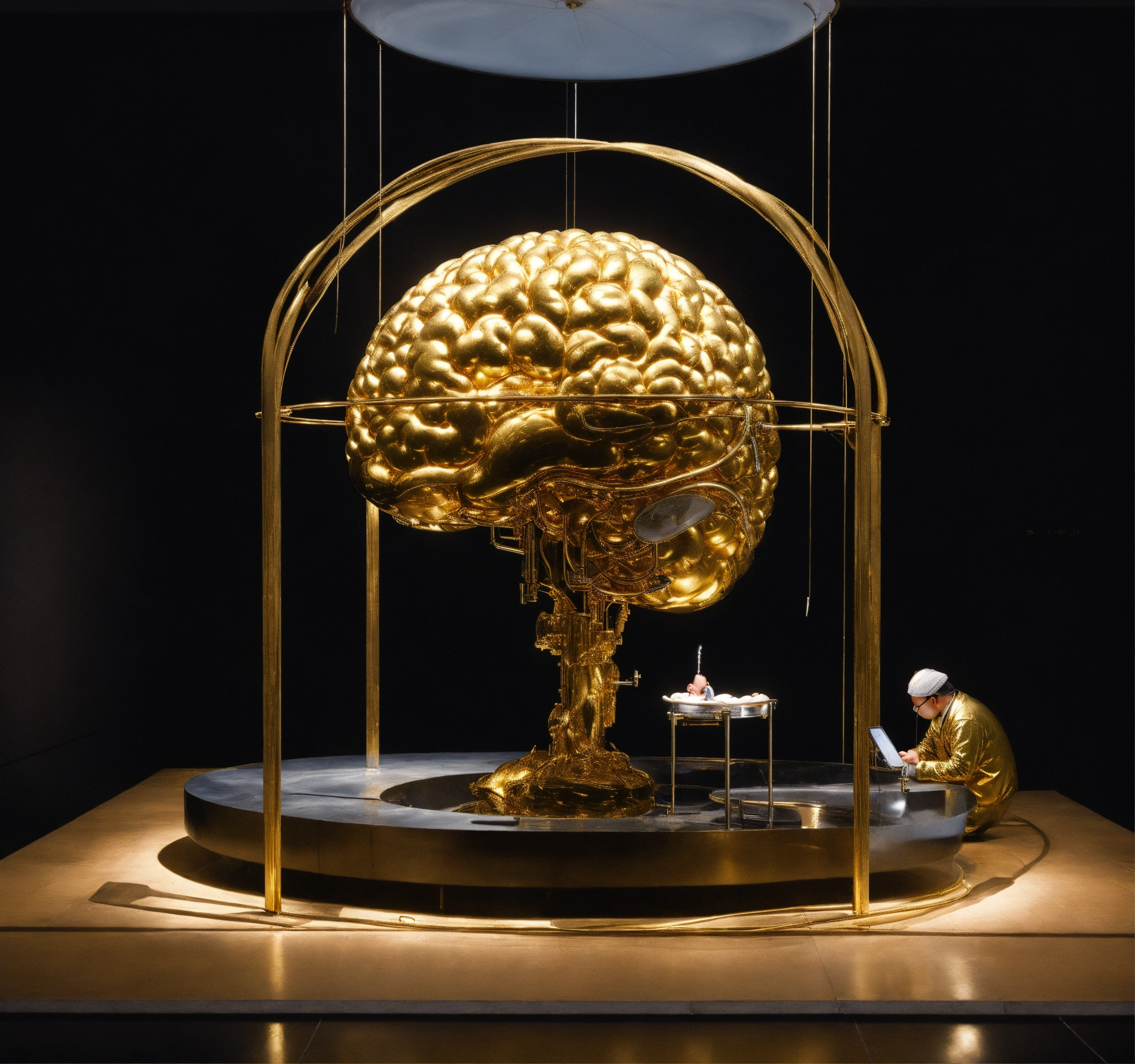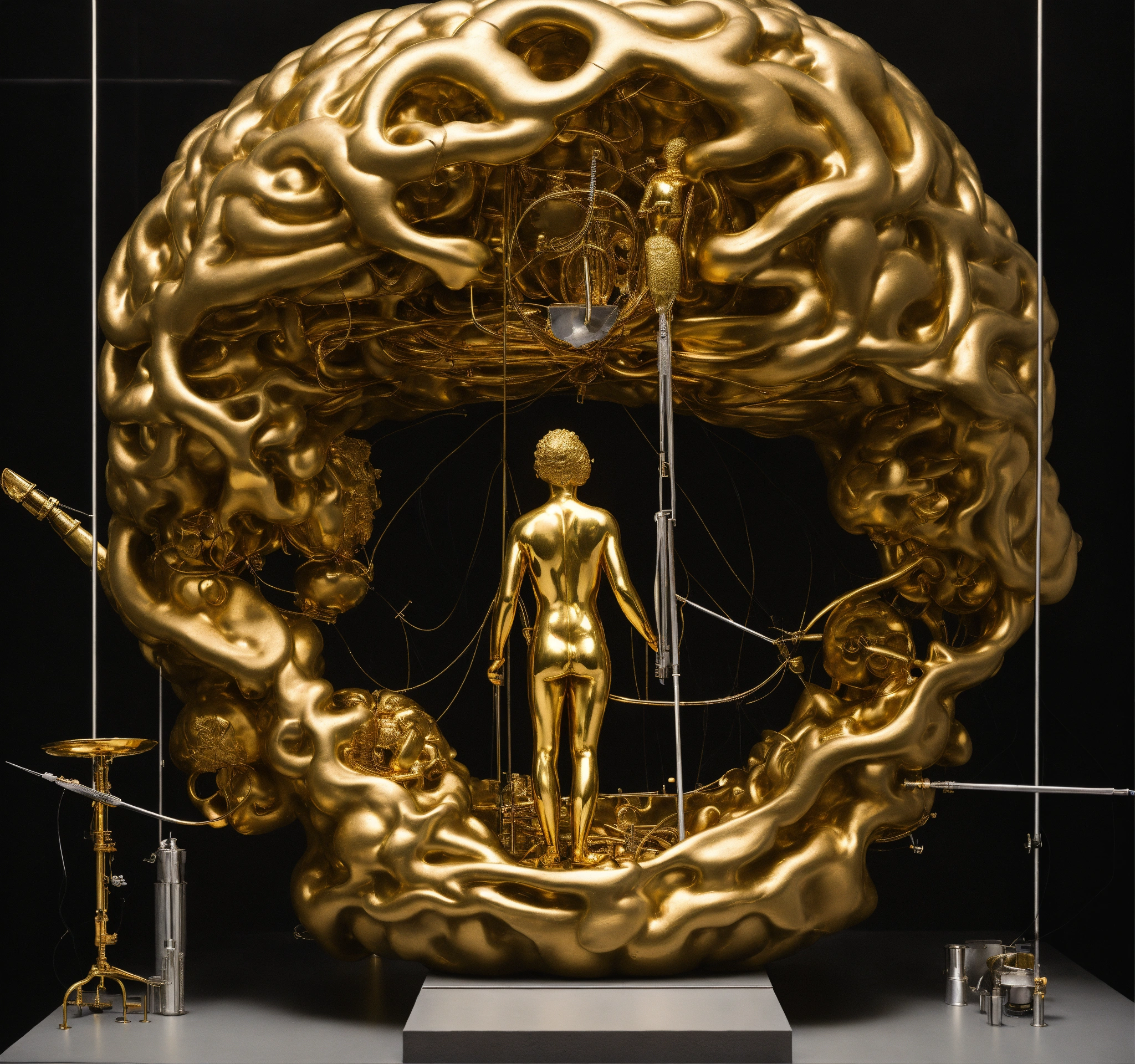 A huge golden brain supported by complex surgical instruments, very small beautiful human body and a newborn boy within a time vortex, surrealism, symbolism, minimalism, black background, installation, sculpture by lucian freud, rene magritte, salvador dali