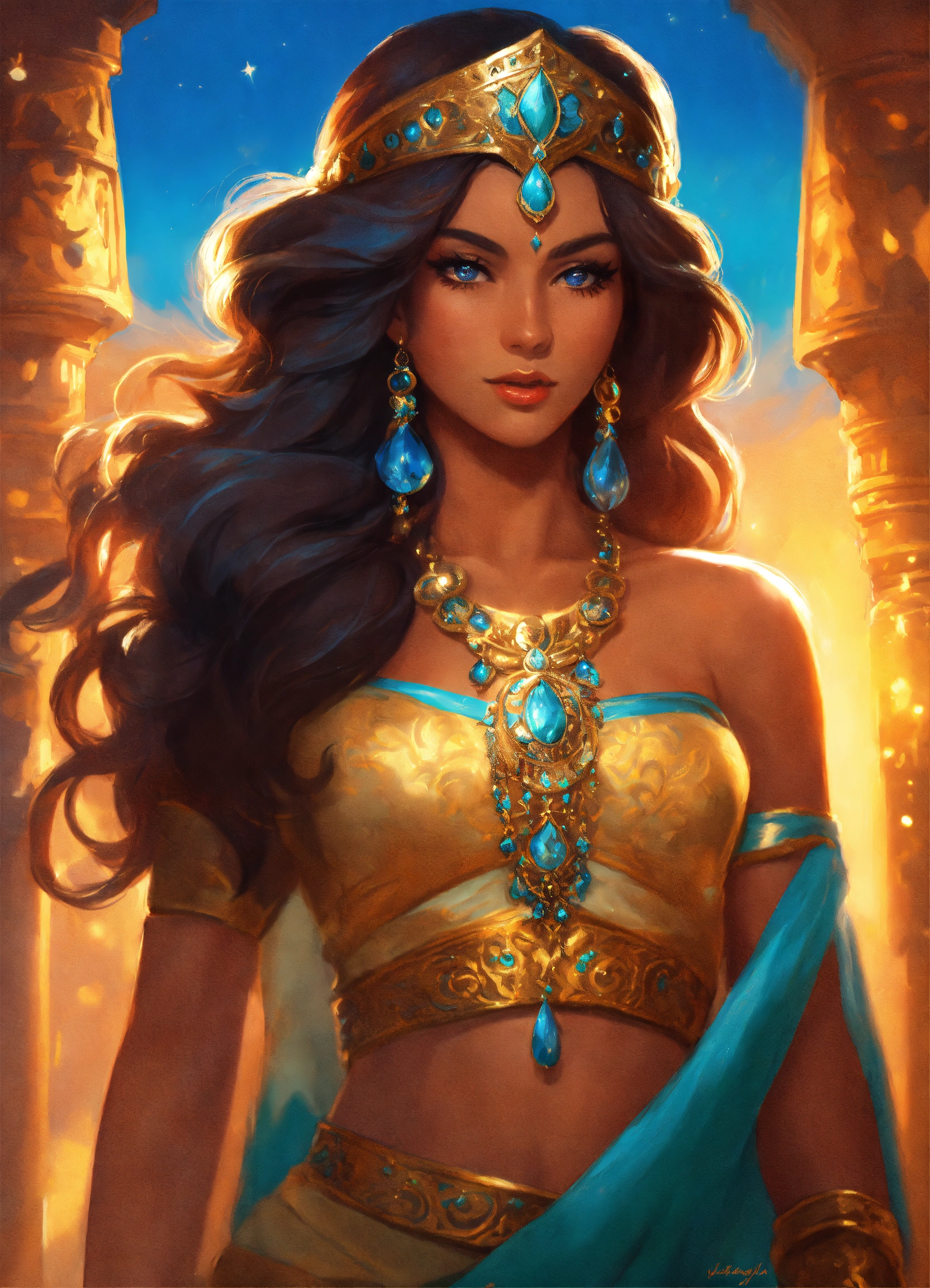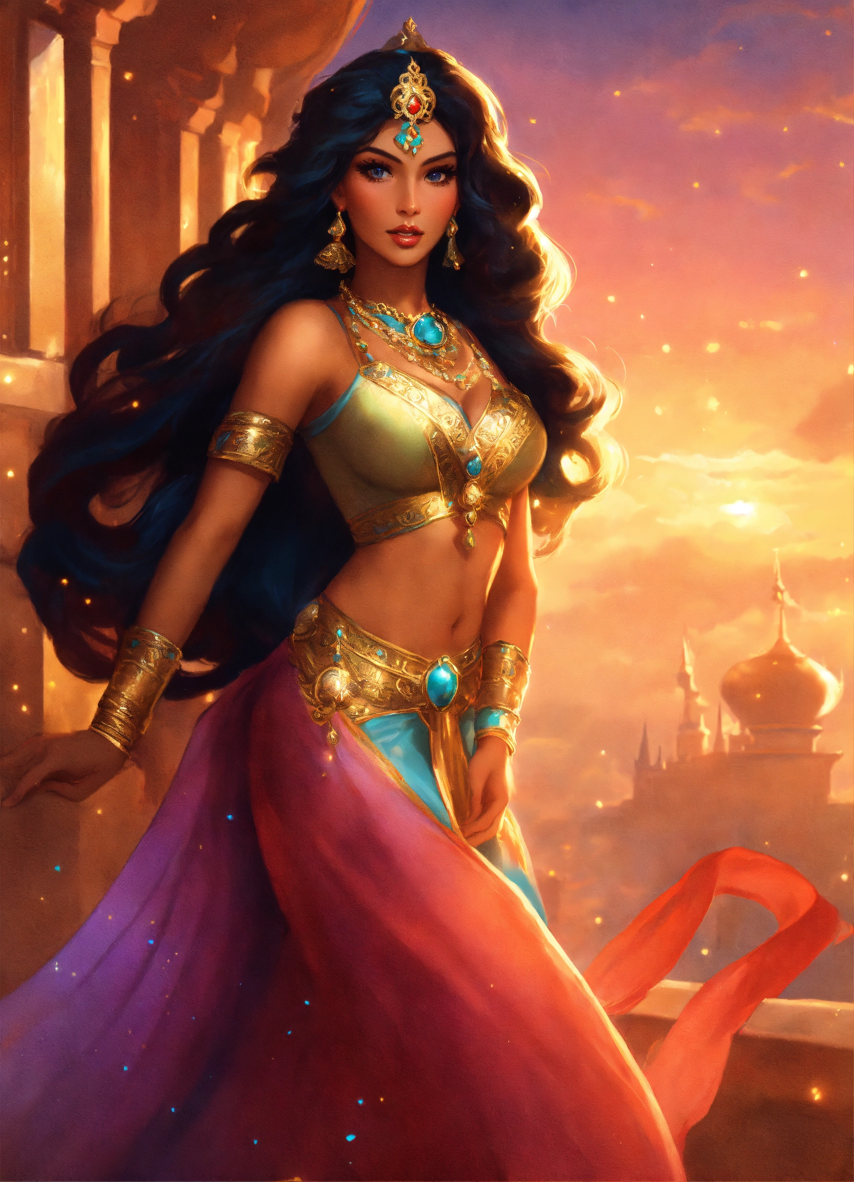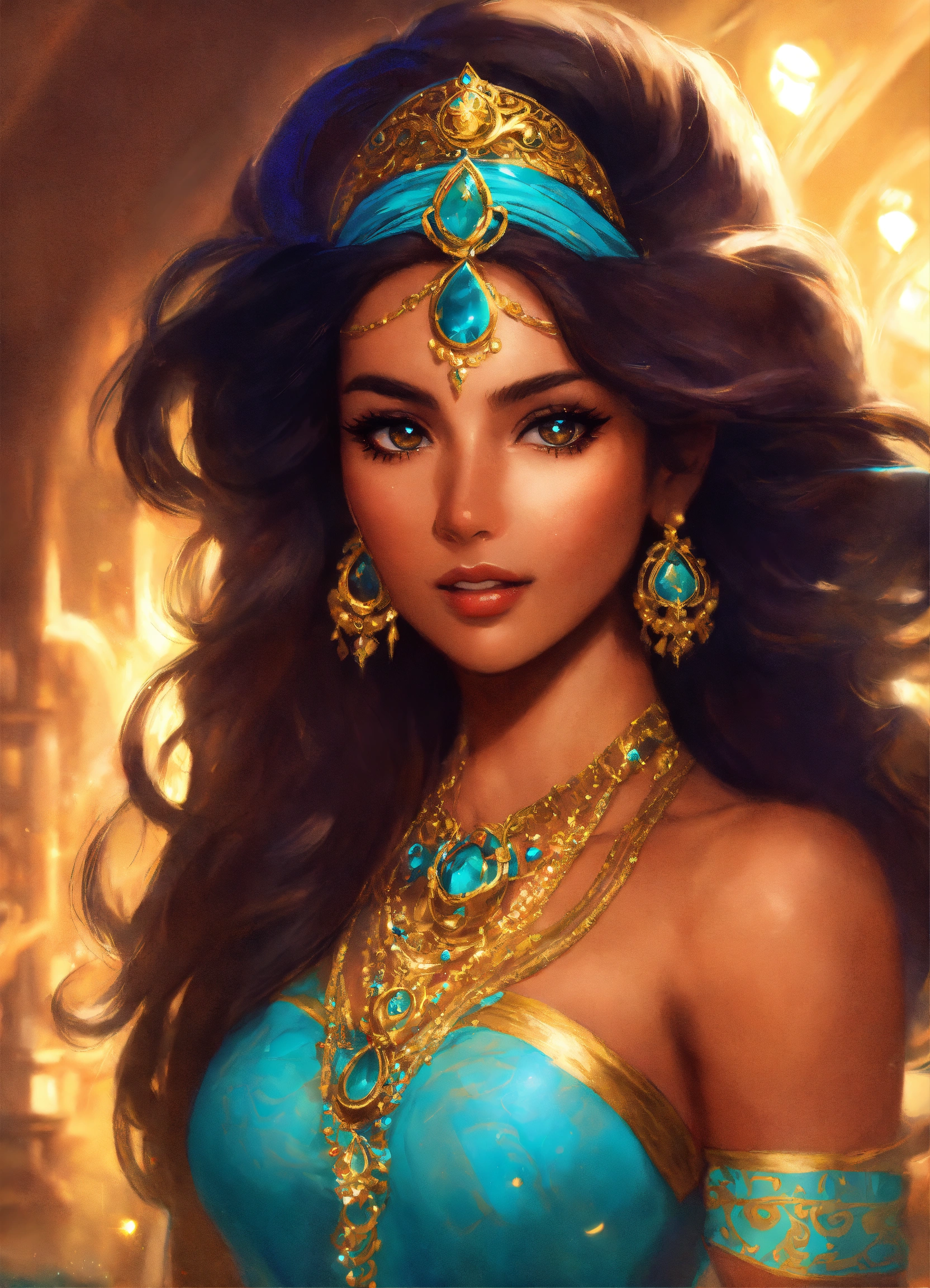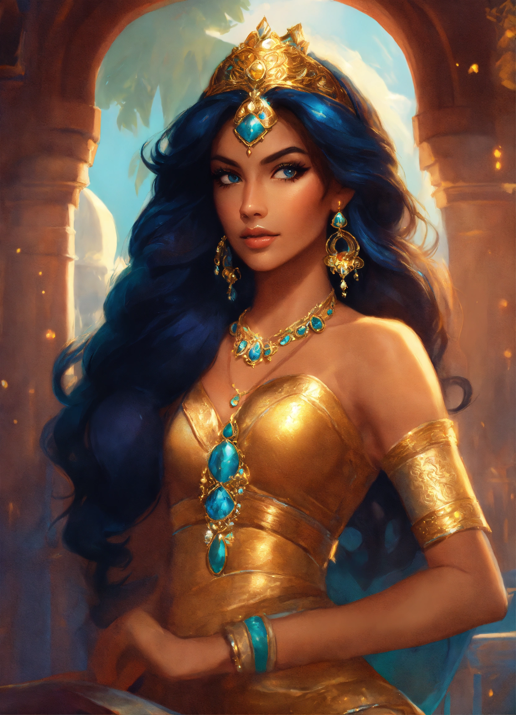 "legendary fantasy princess jasmine", big hair, tan skin, sparkling, historical, fantasy art, concept art