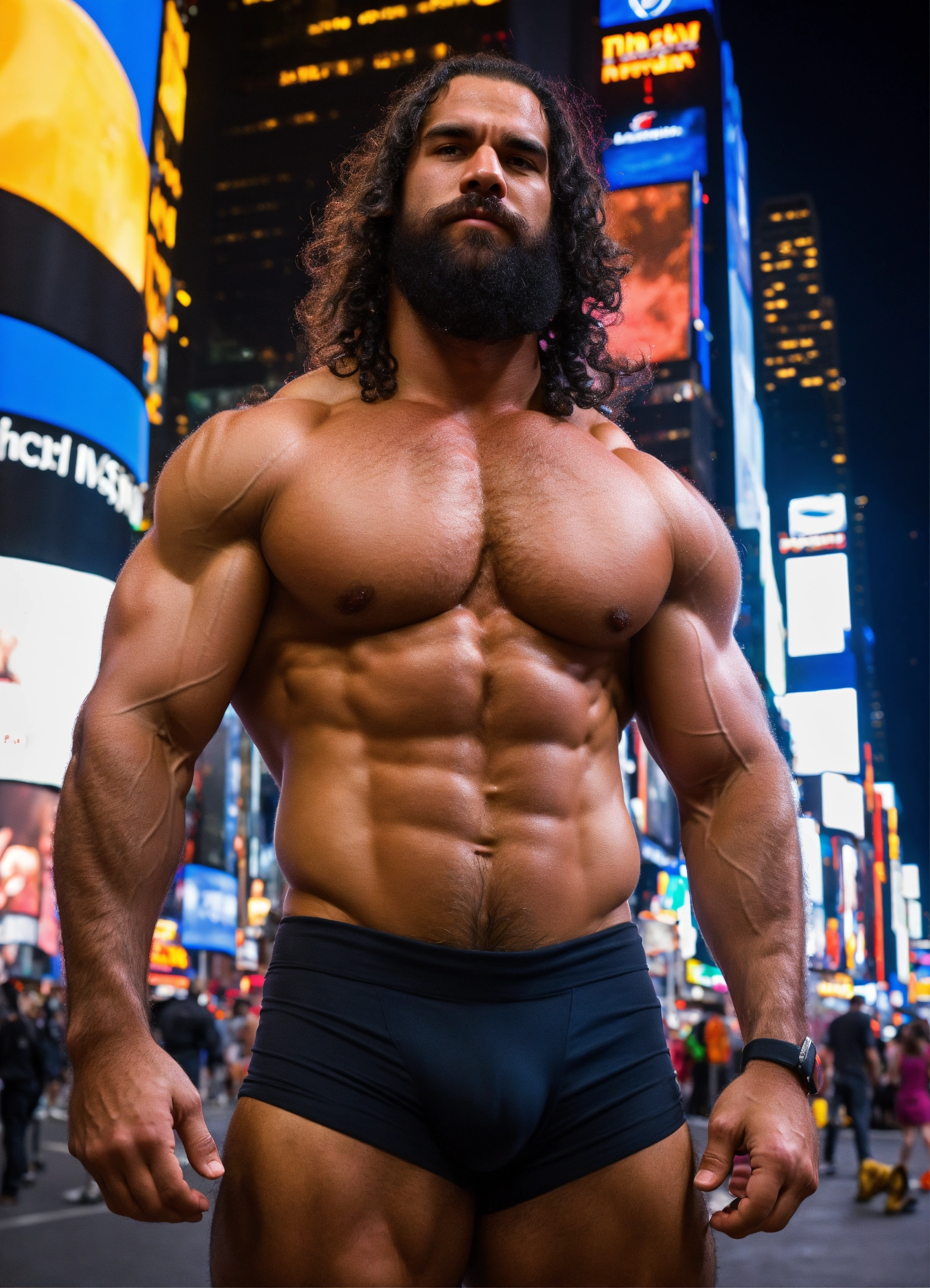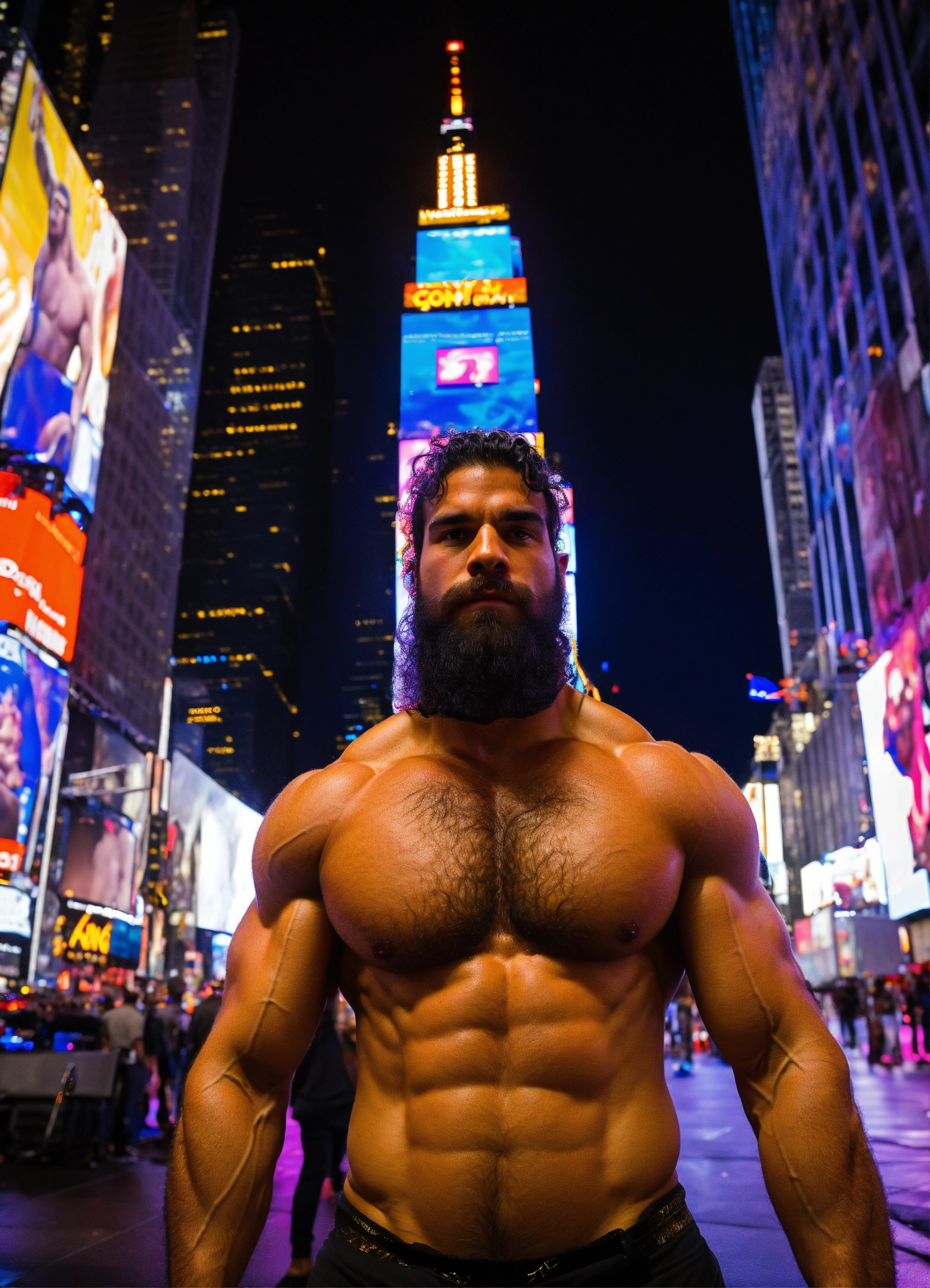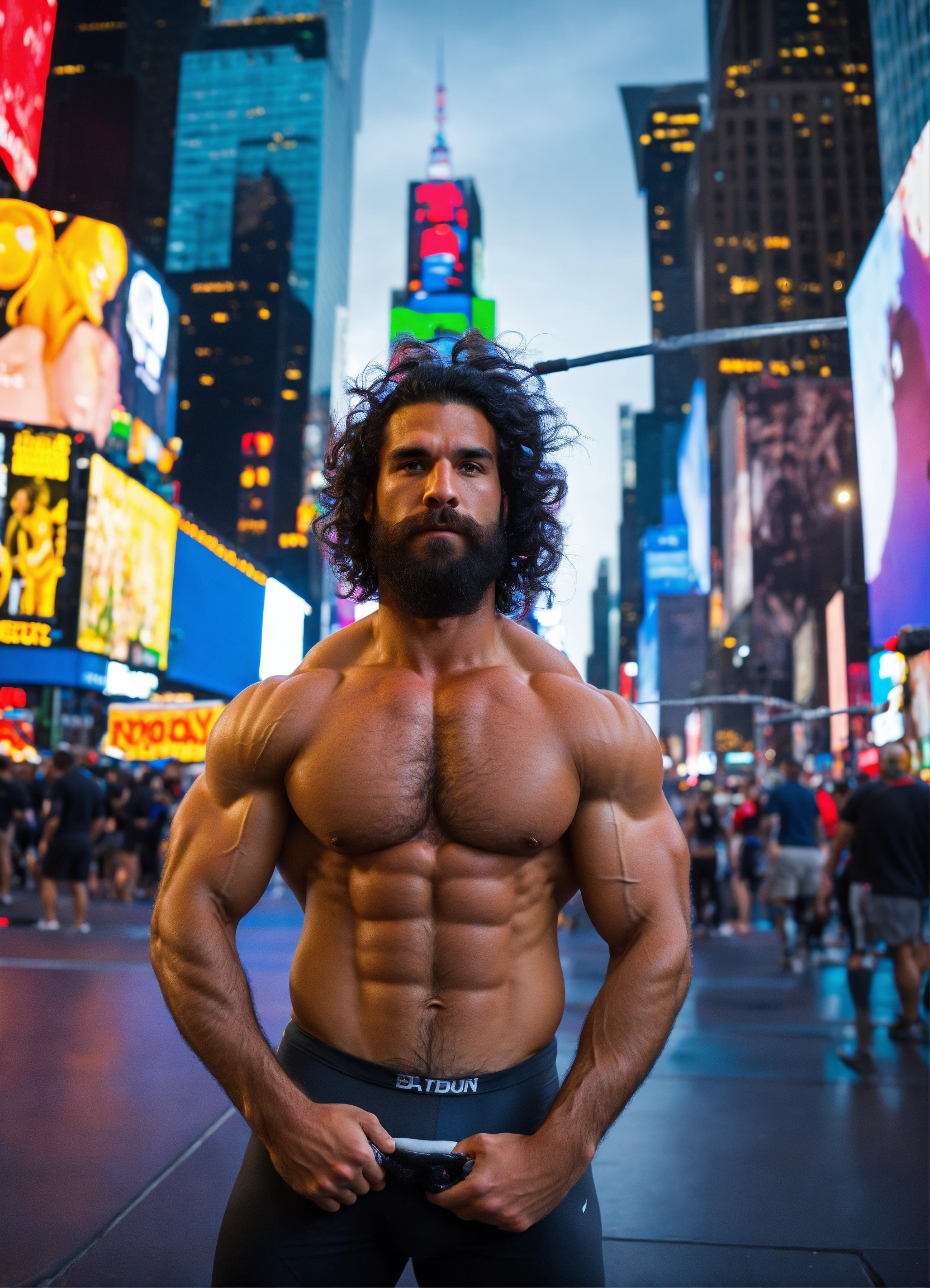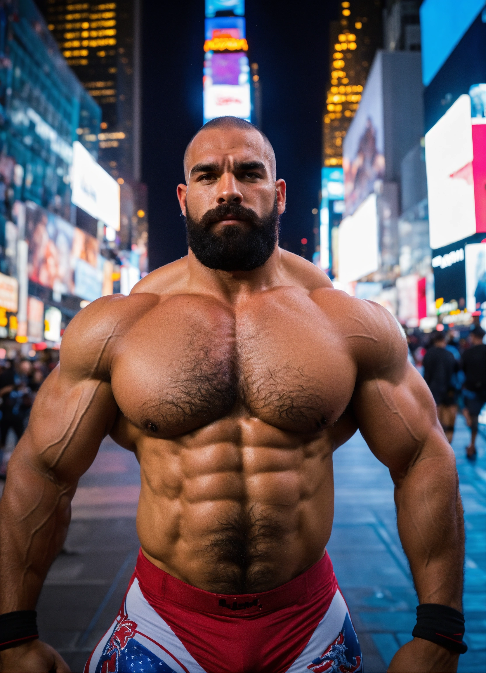 30-year-old hairy portuguese man with big muscles, big bodybuilder, body like a wrestler, in times square at night