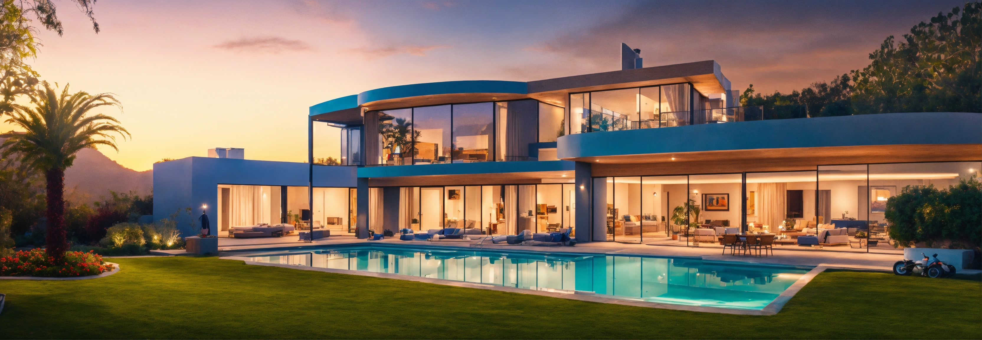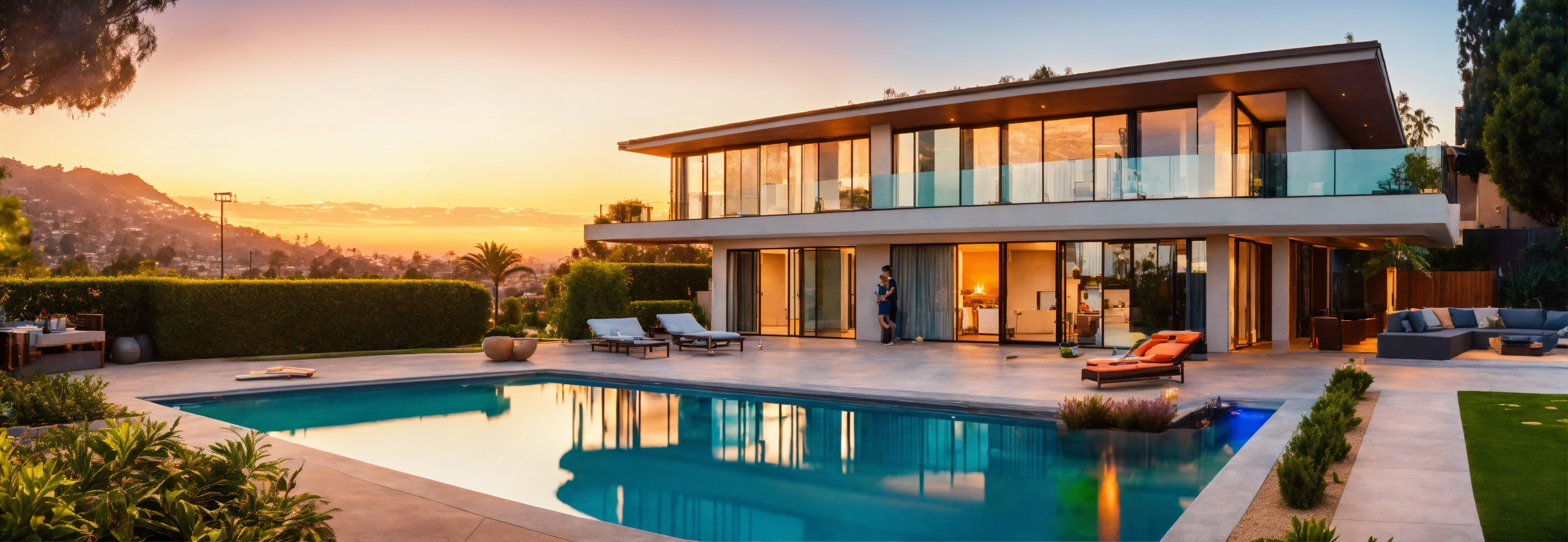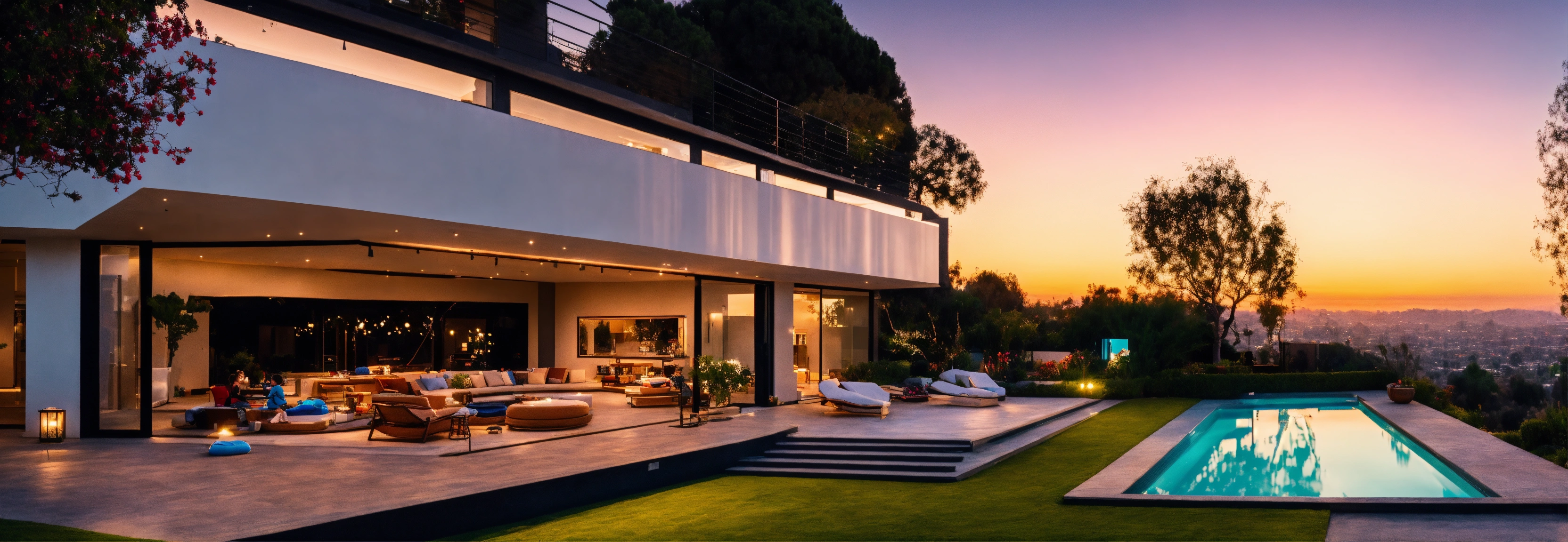 Villa moderne with sunset view in los angeles with a family playing together in the garden and swimming pool with sports cars, high quality 8k