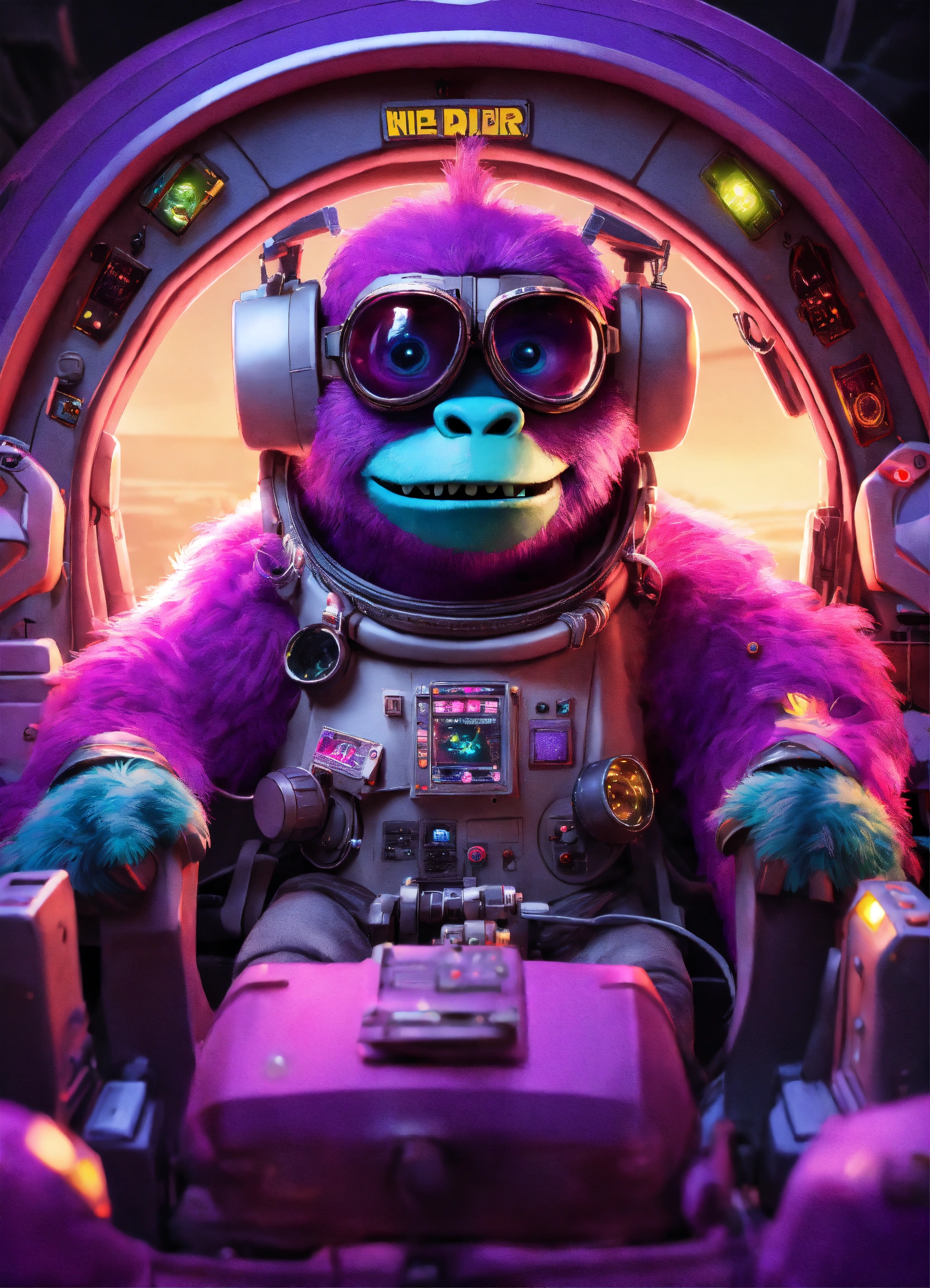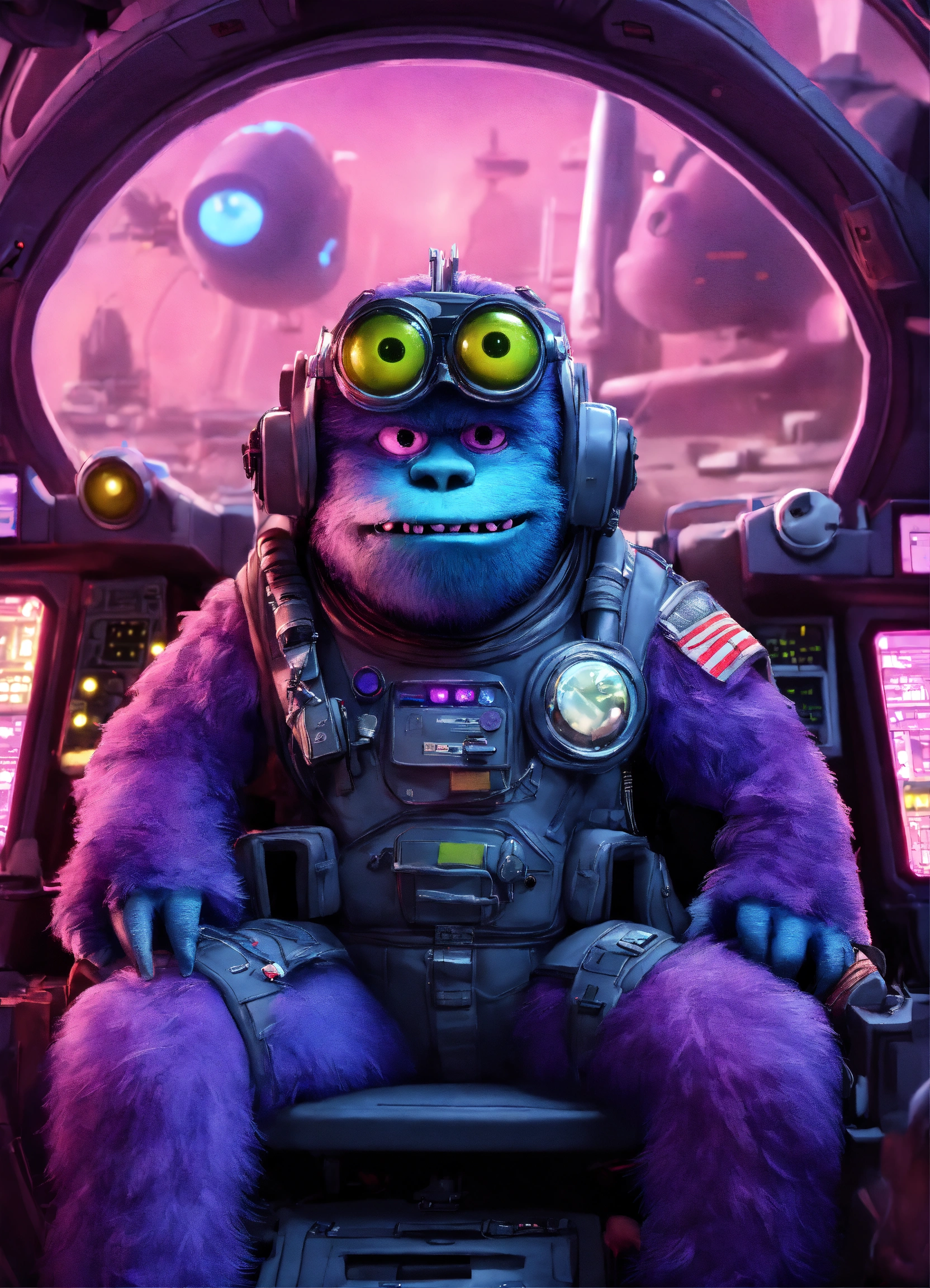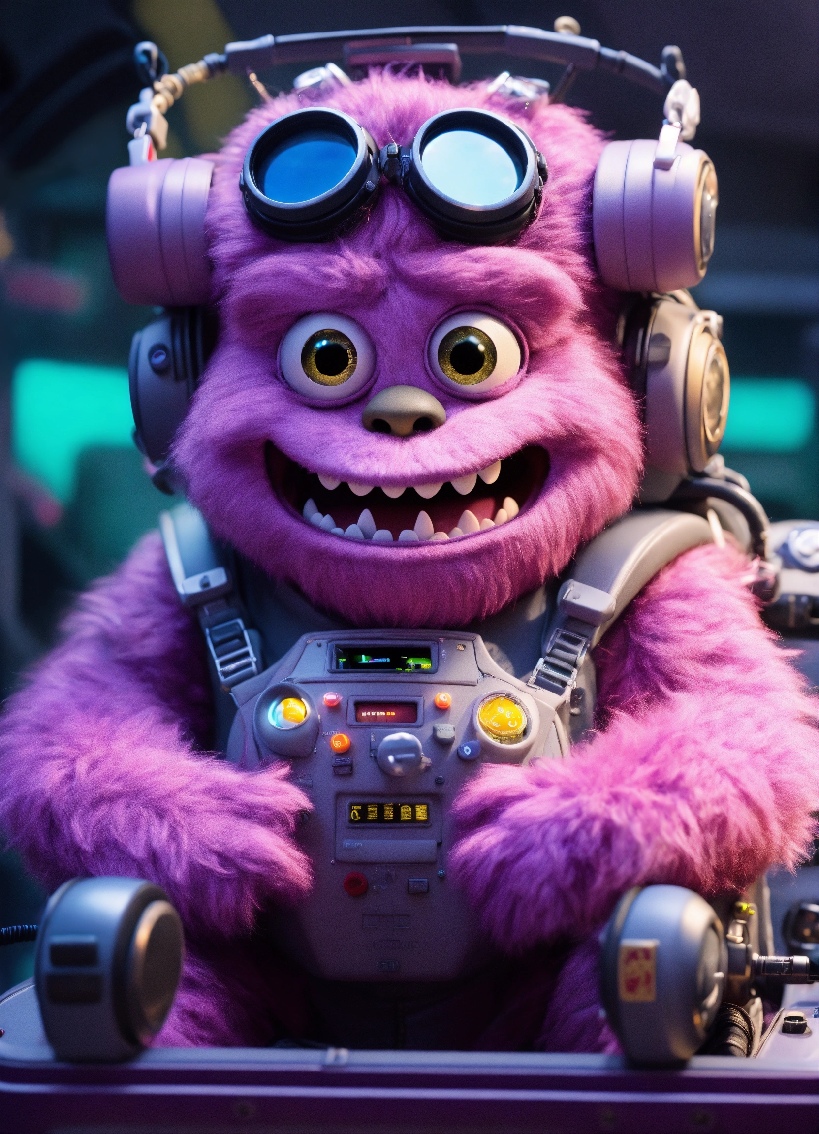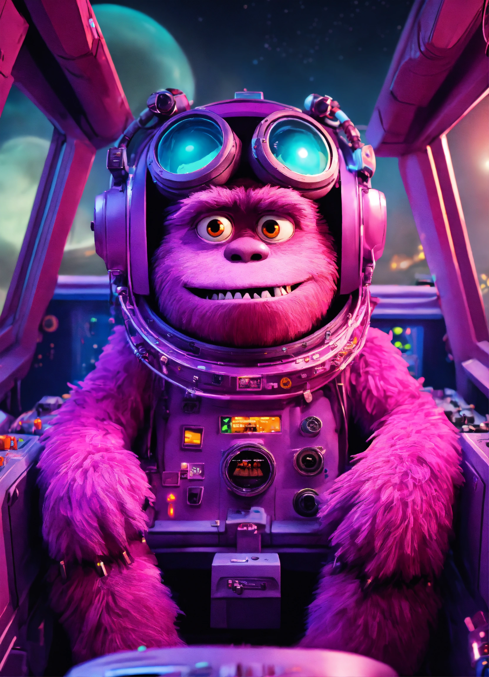 Big pink and purple hairy grimace face monster wearing space goggles and gray pilot suit, sitting in cockpit with high tech controls, knobs, and lighted buttons, pixar, monsters inc, realistic, fantasy
