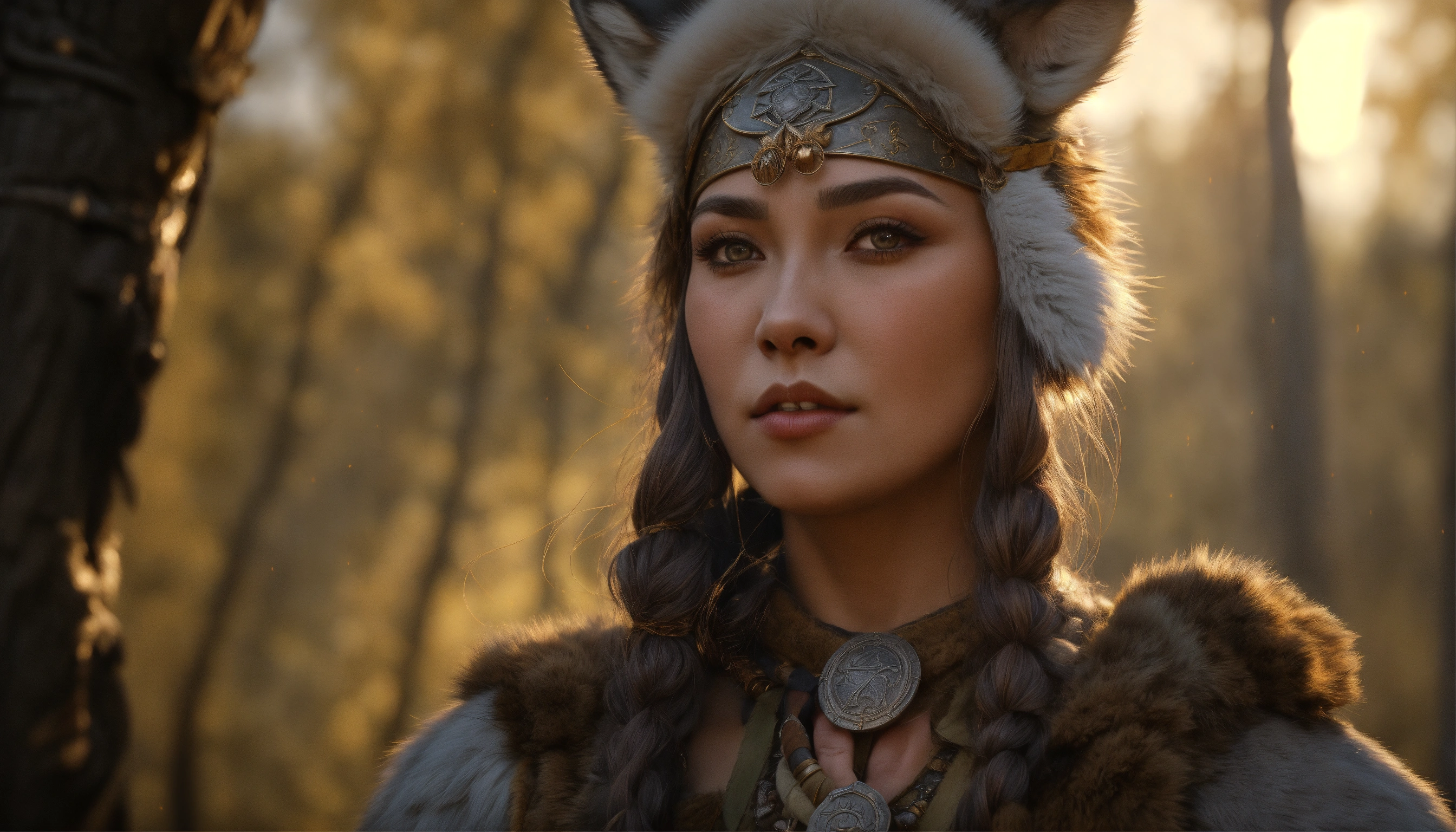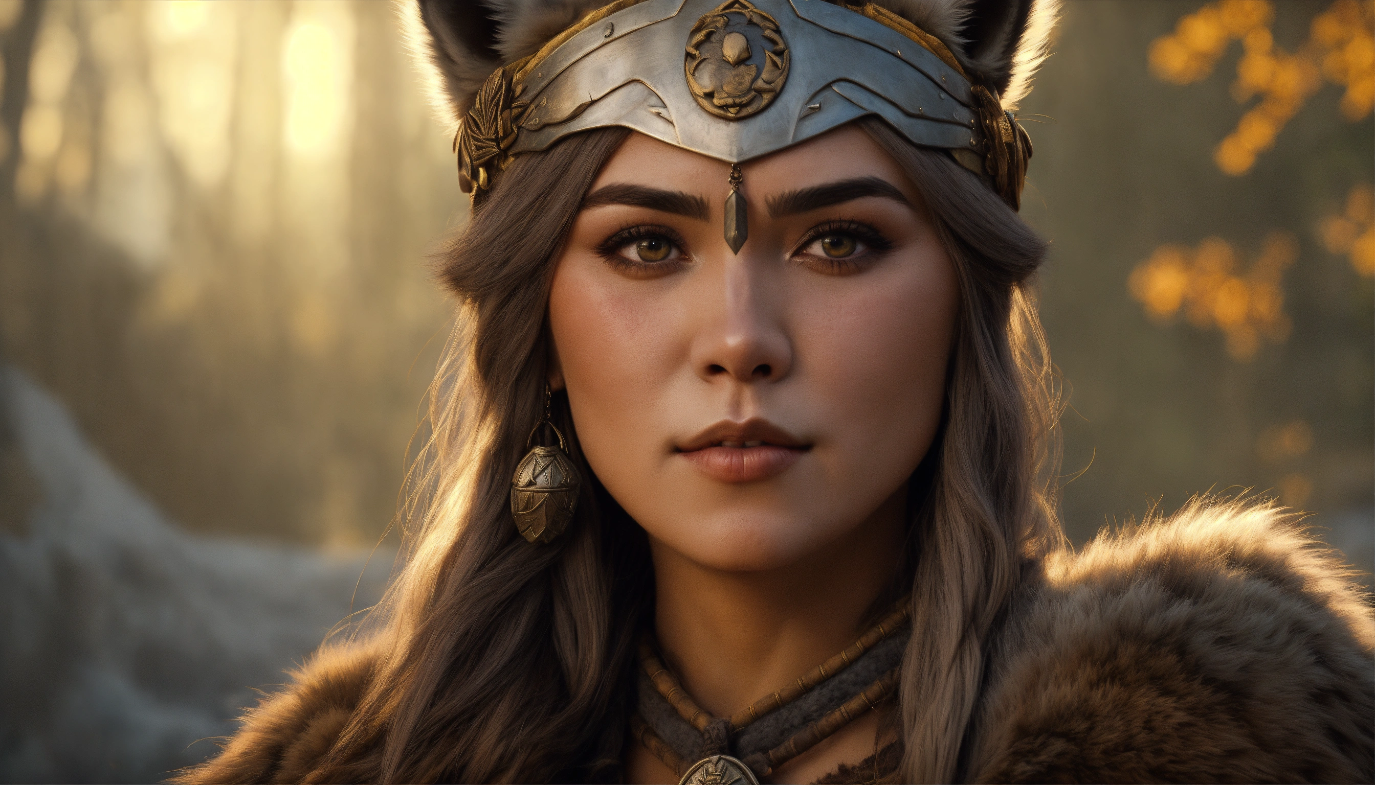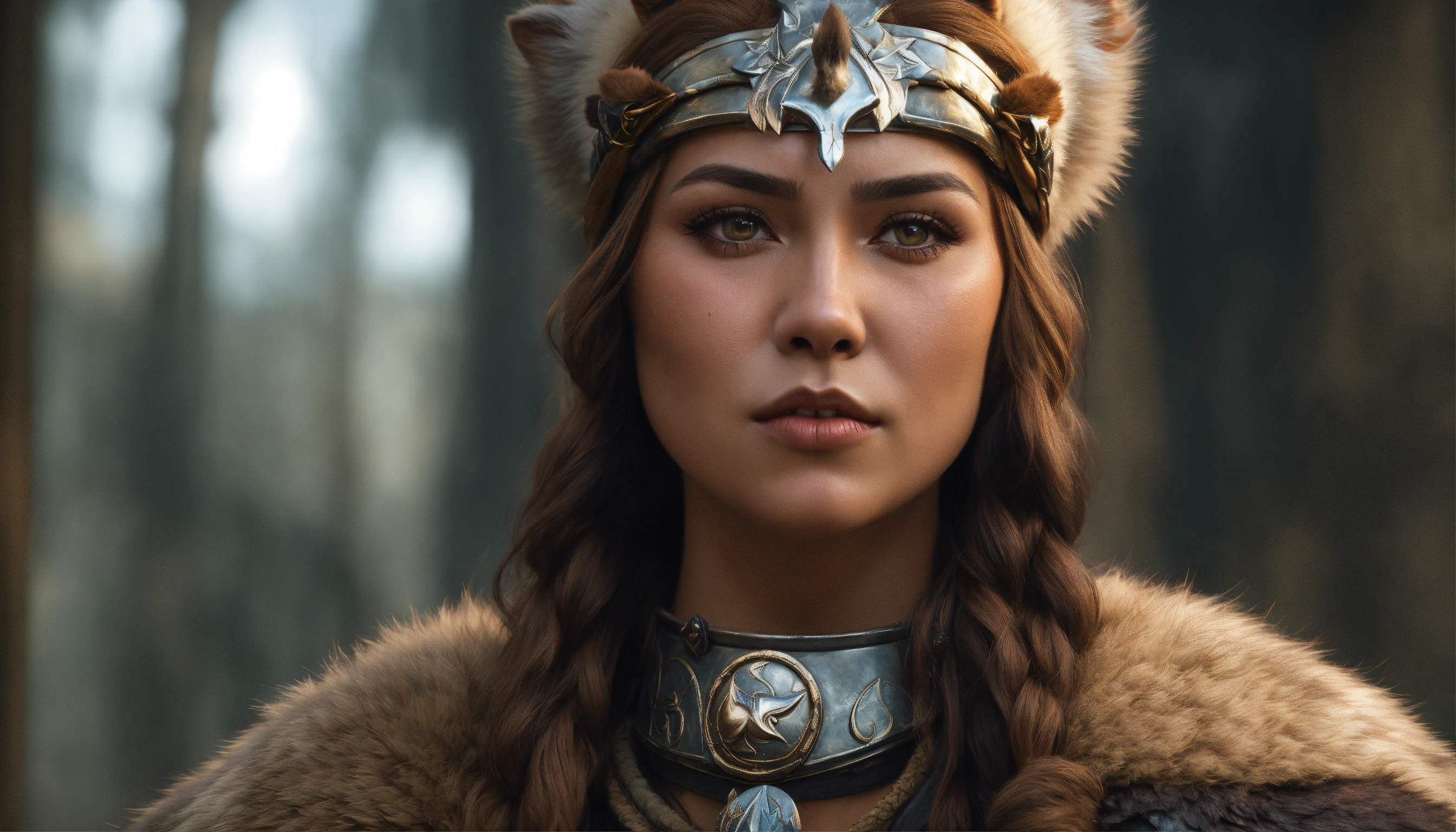 Germanic shaman woman with a rounded nose and pear-shaped head. muted greyish bow lips and a wolf paw over her left cheek. she has beautiful hazel eyes and wears bearskin armor with a clawed gauntlet on her right hand. d&d, 4k