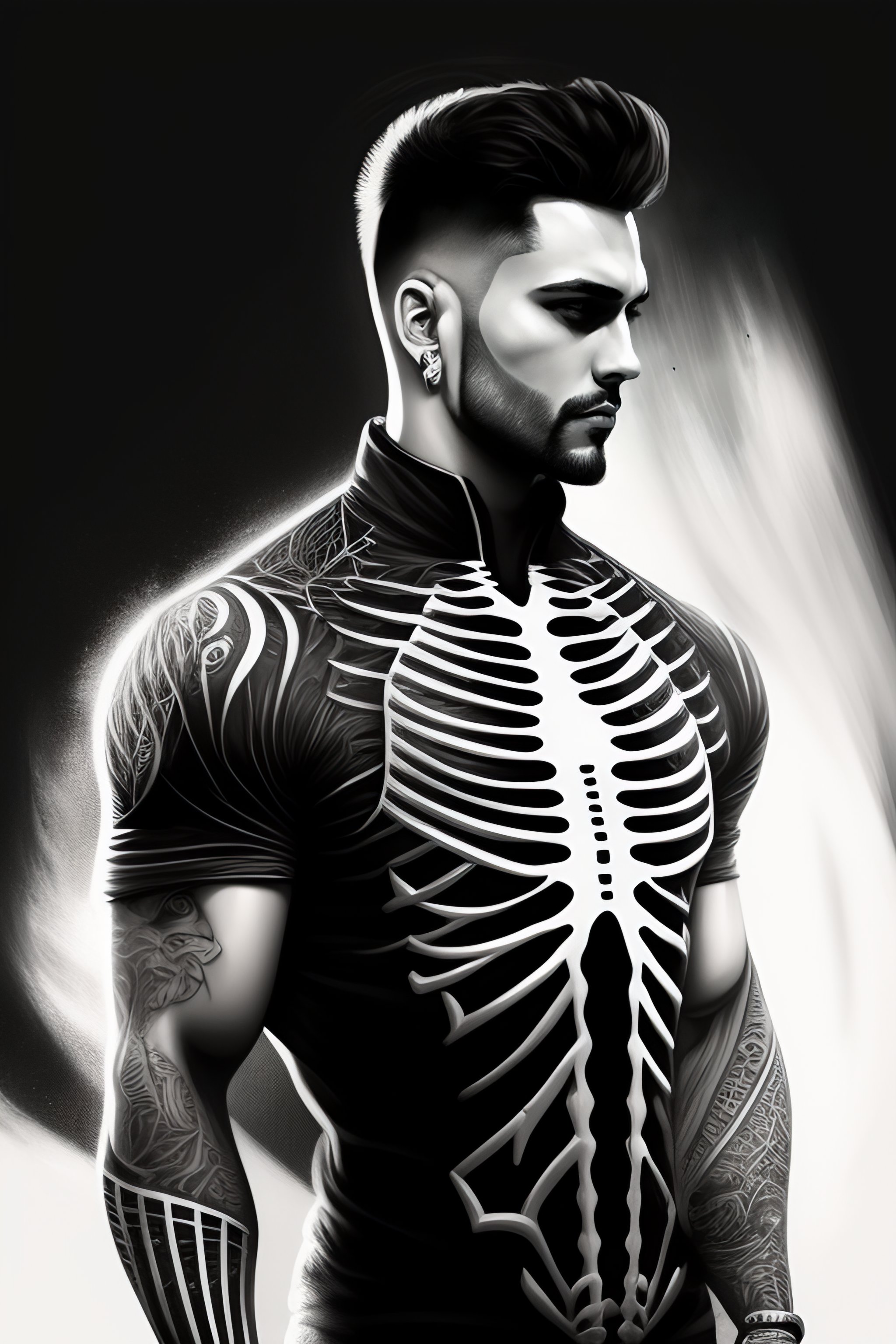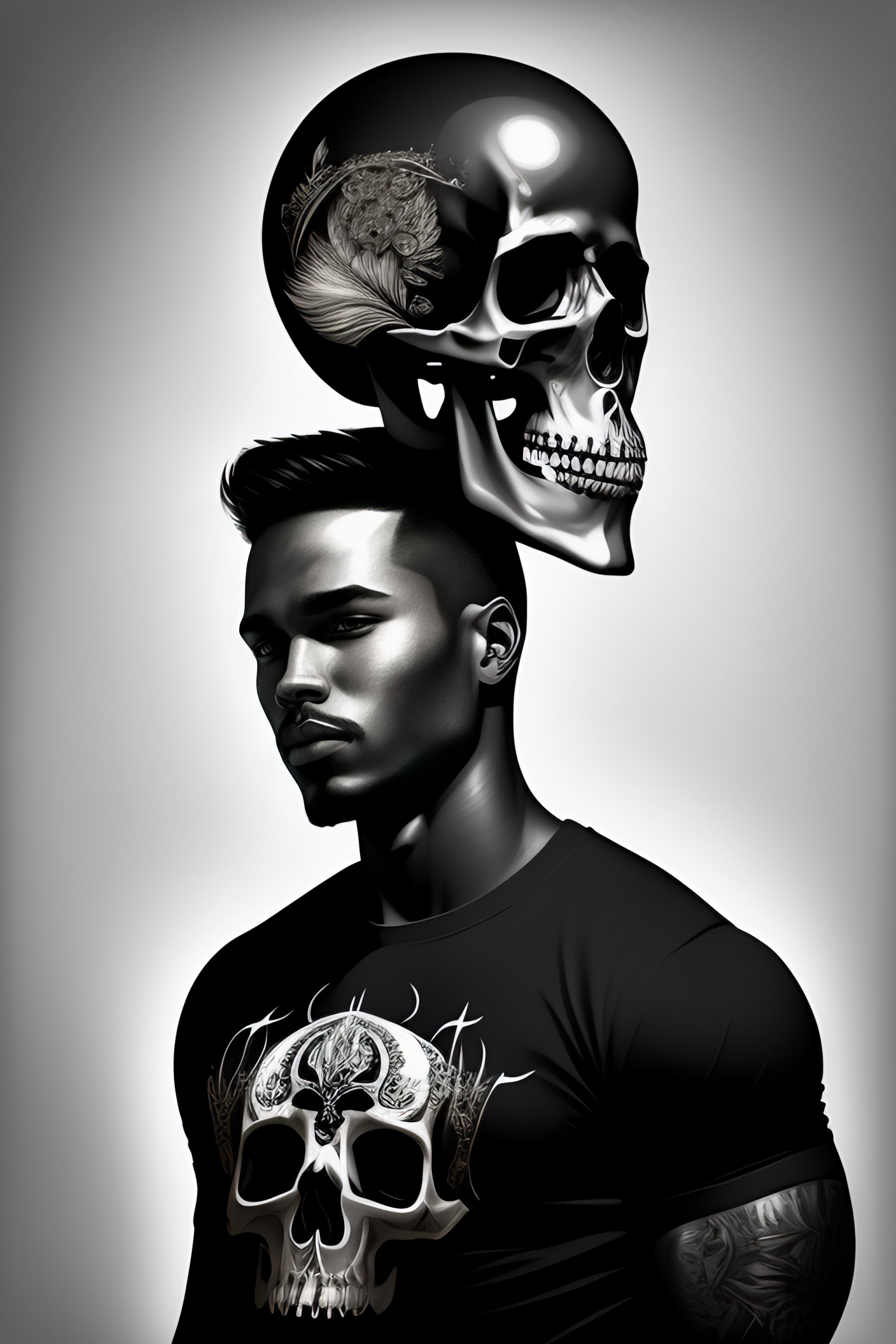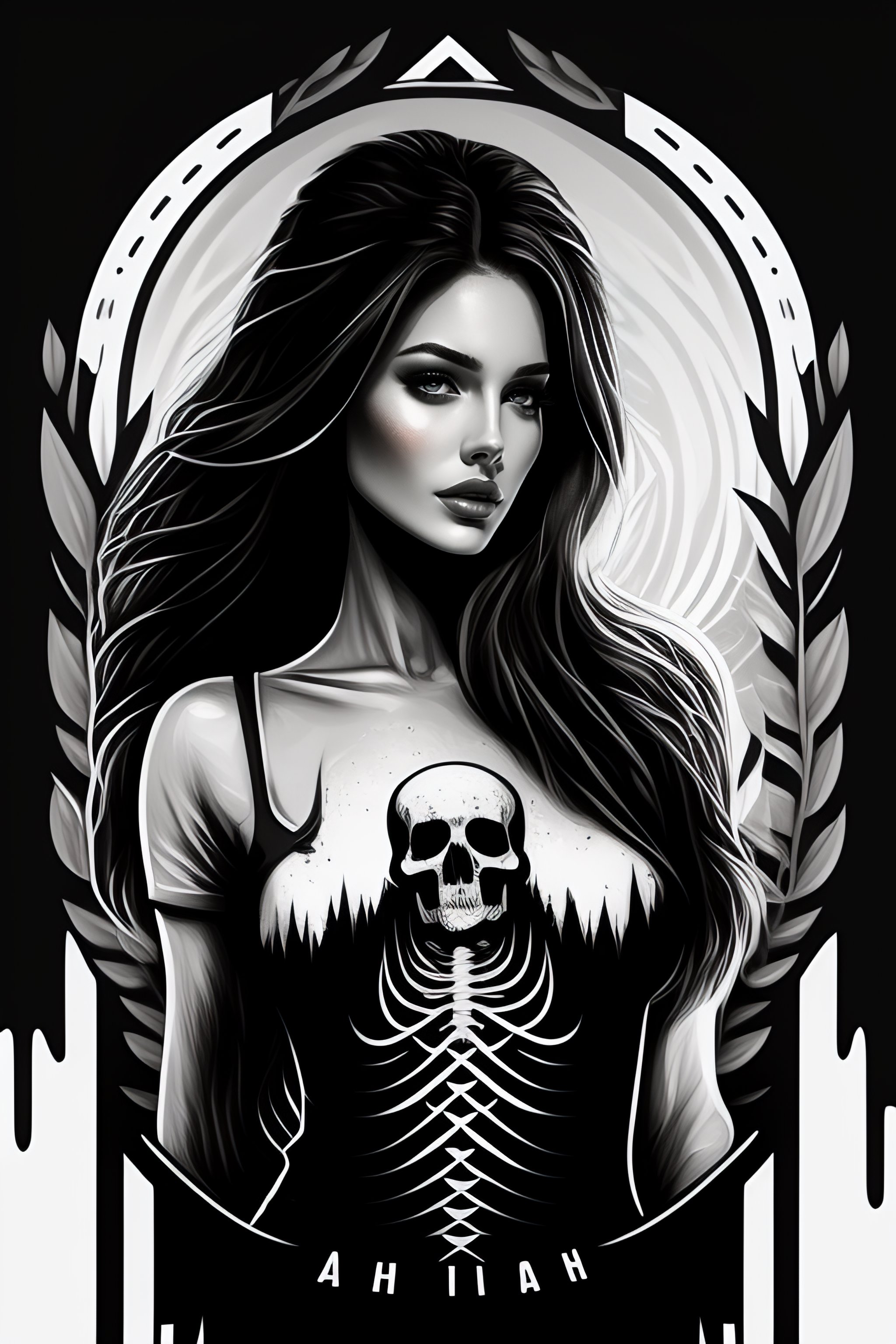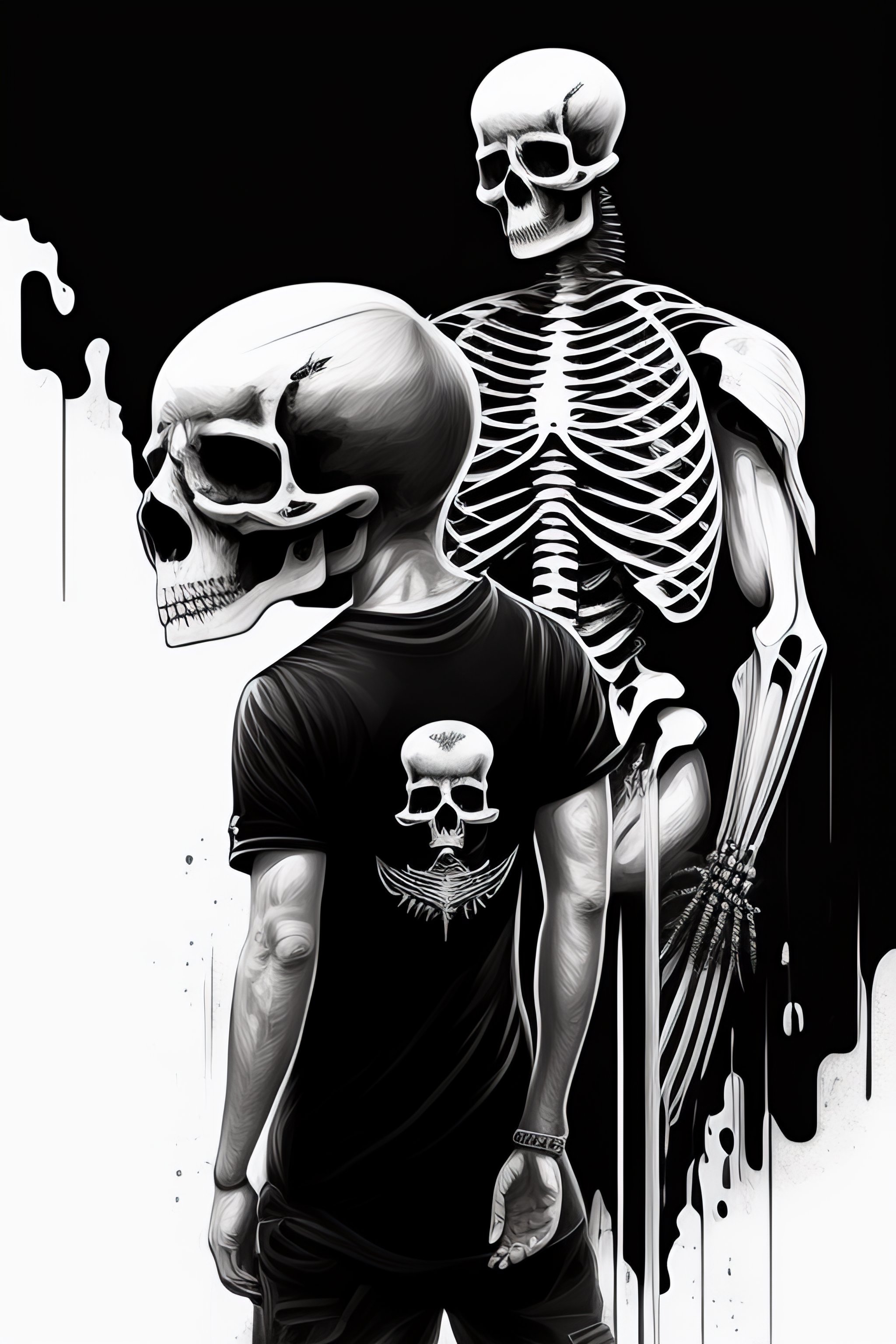 A tshirt design of a person held by a skeleton, low details, digital art, solid colors, sharp focus, trending on art station, print art, black and white, empty background, grunge