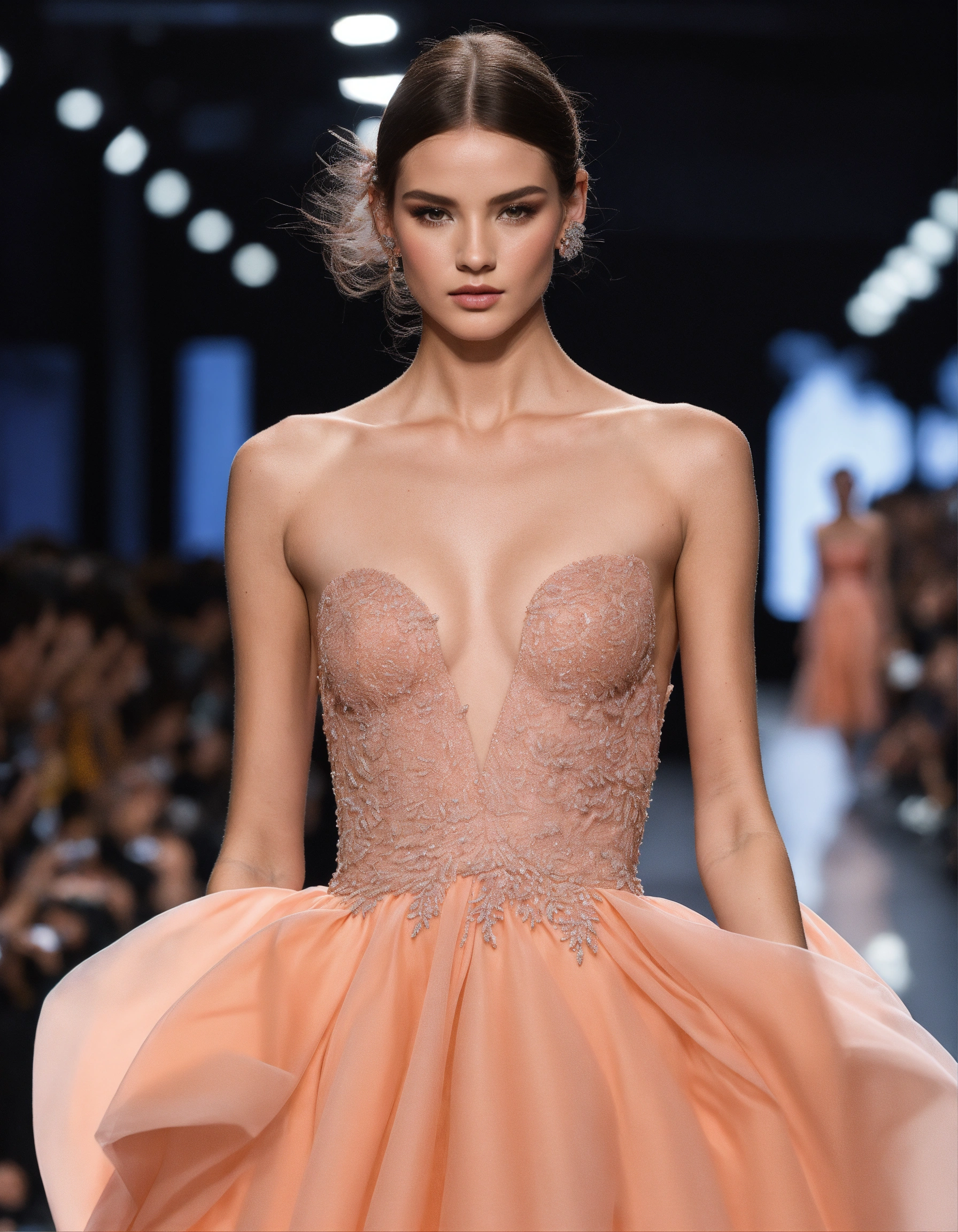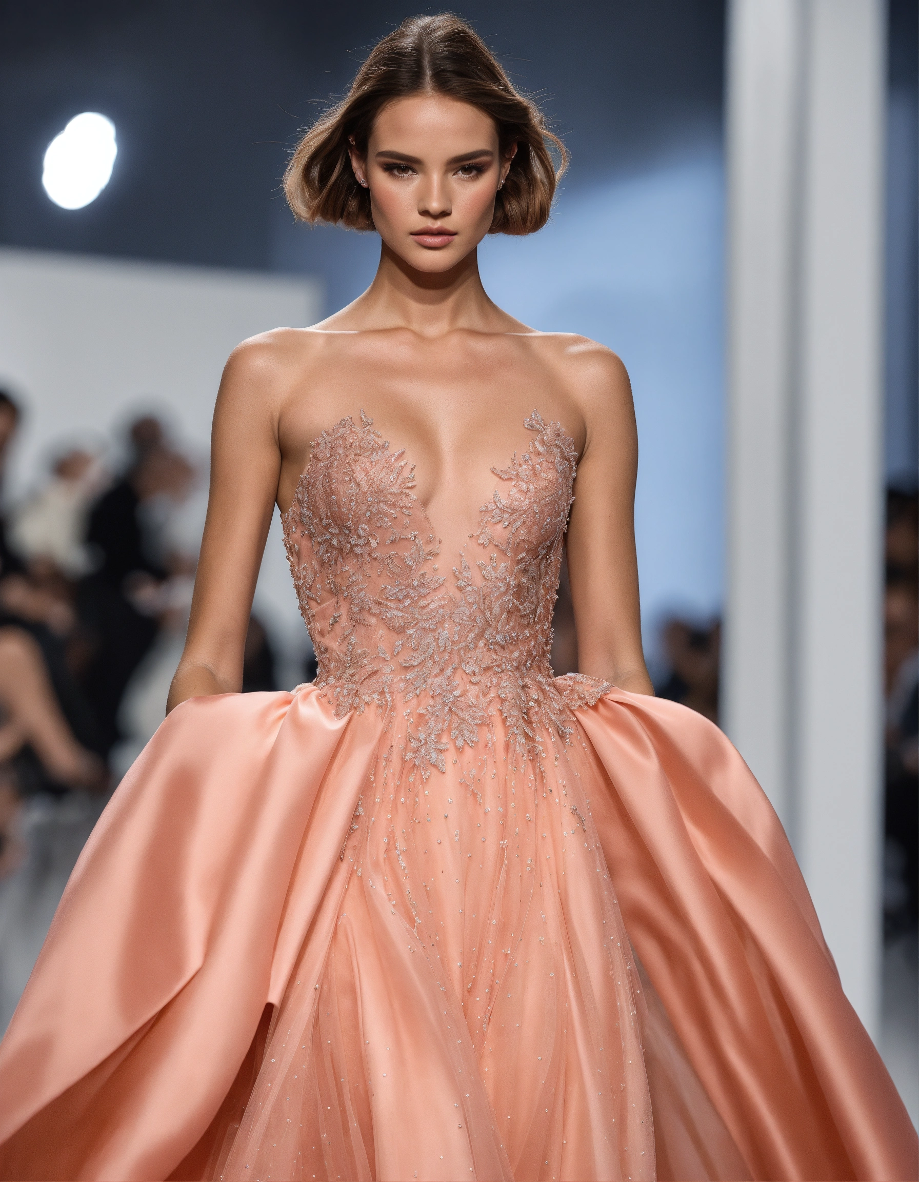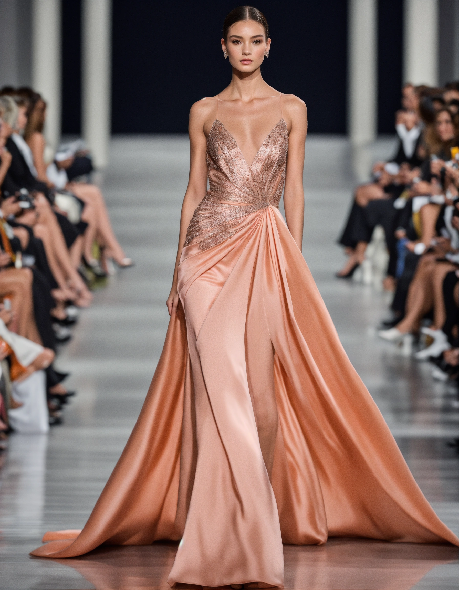 Crie uma fotografia de um modelo em um vestido tendencia de seda de alta costura em tons tender peach, com detalhes metálicos com decote profundo para uma gala 2024. inspire-se no estilo armani. alta resolução, 8k