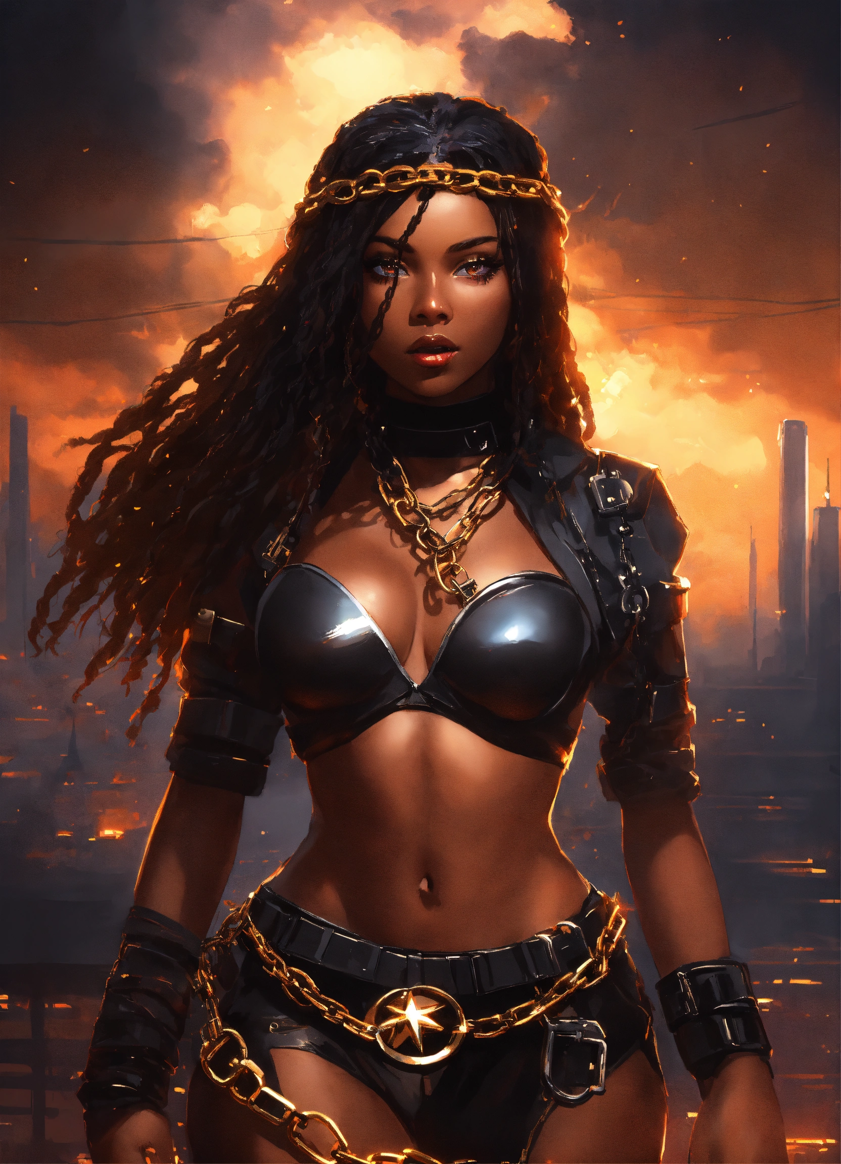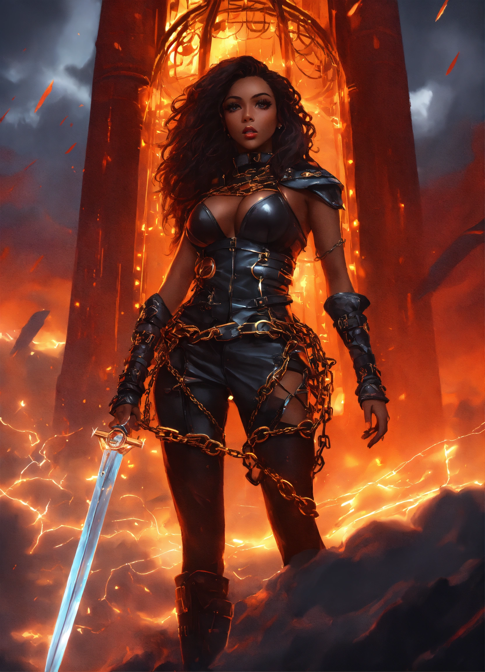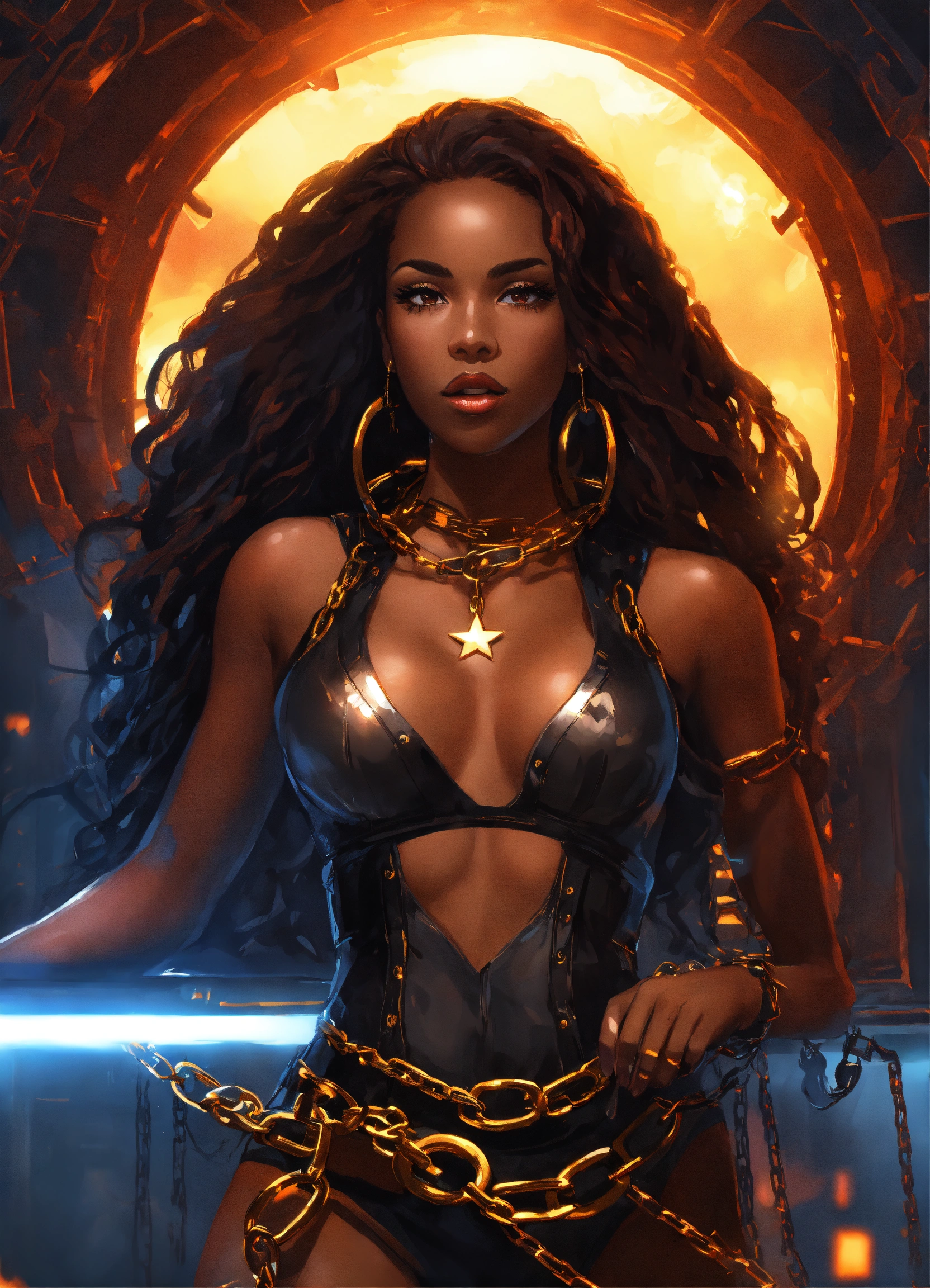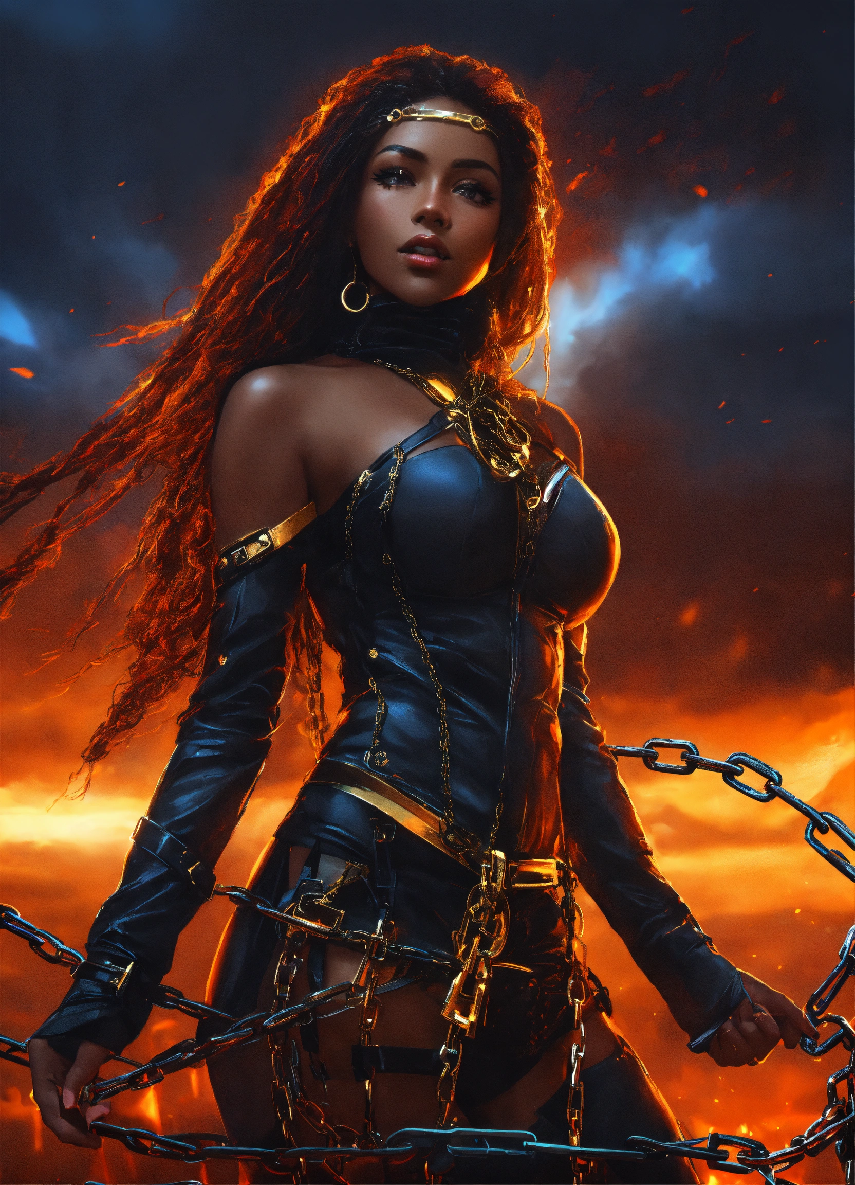 Handcuffed black futuristic warrior prisoner, chained beautiful black futuristic warrior girl dark brown skin chained to tower, beautiful perfect face, shapely hour-glass figure long flowing hair in fiery chains arms chained to her side, wearing a black super spy stealth outfit with a gold star on her chest bound in fiery chains, hands on her hips she's floating in the sky with dark clouds and red lightning behind her, fantasy, high detail, realistic photo, high detail, digital painting, cinematic, stunning, hyper-realistic, sharp focus, high resolution 8k, insanely detailed