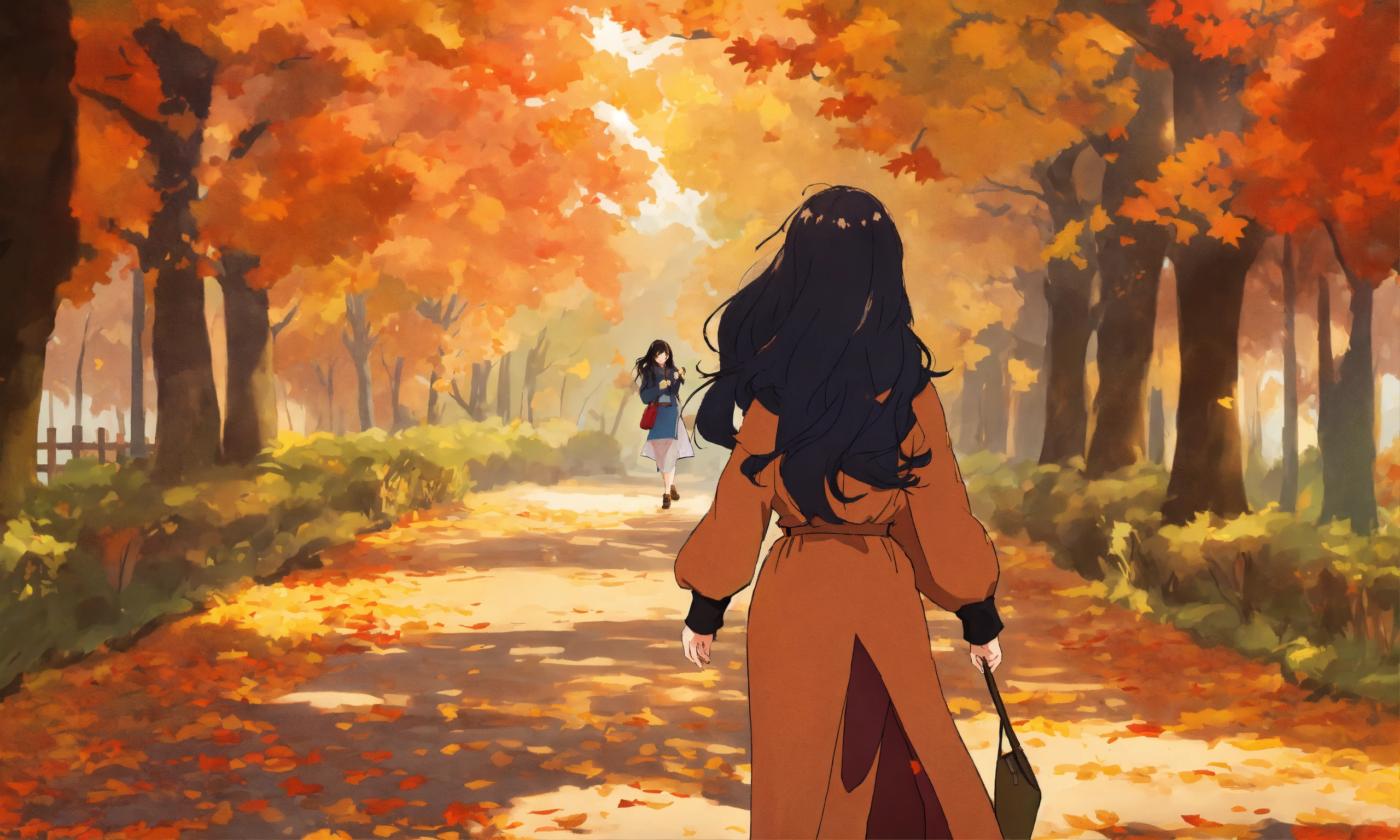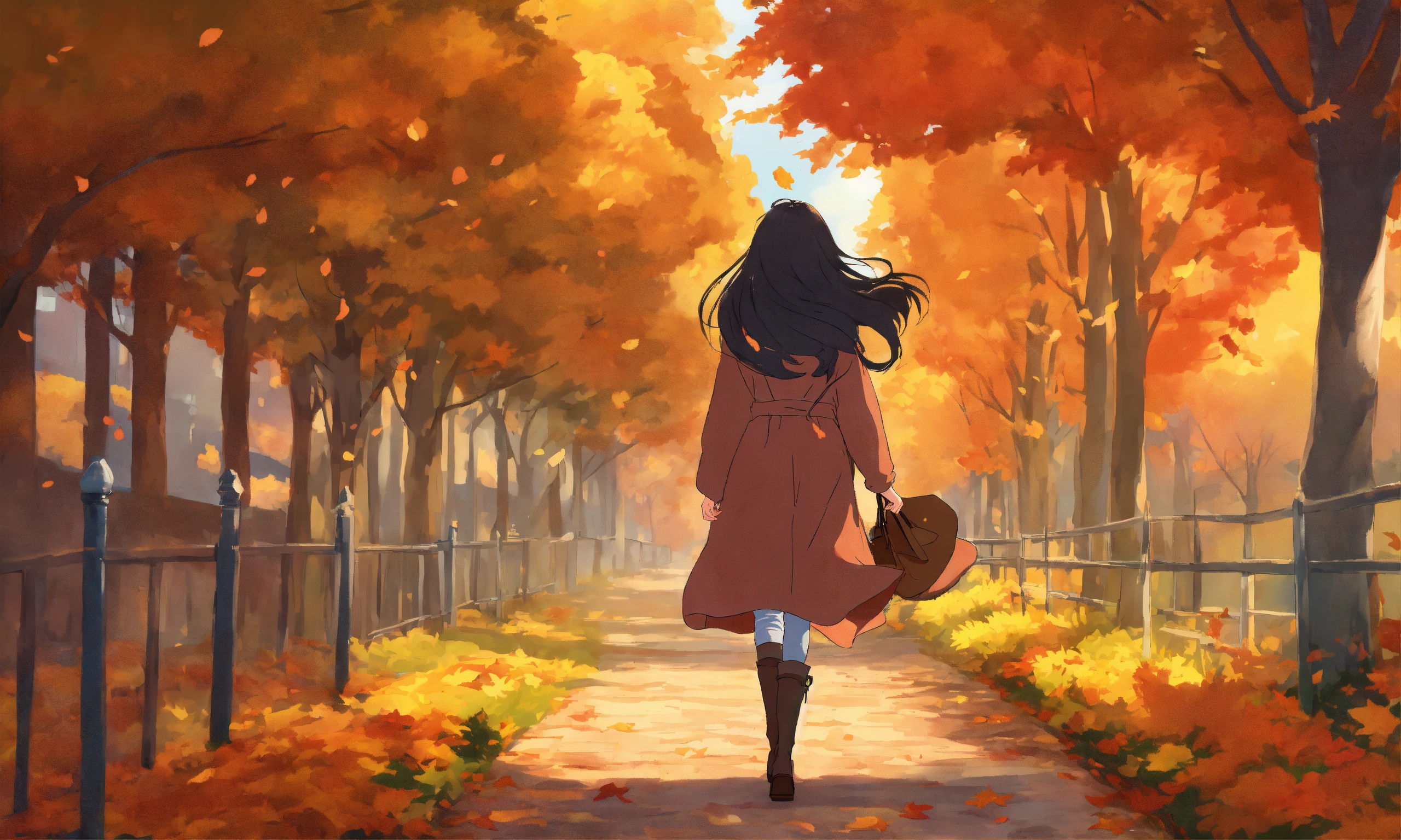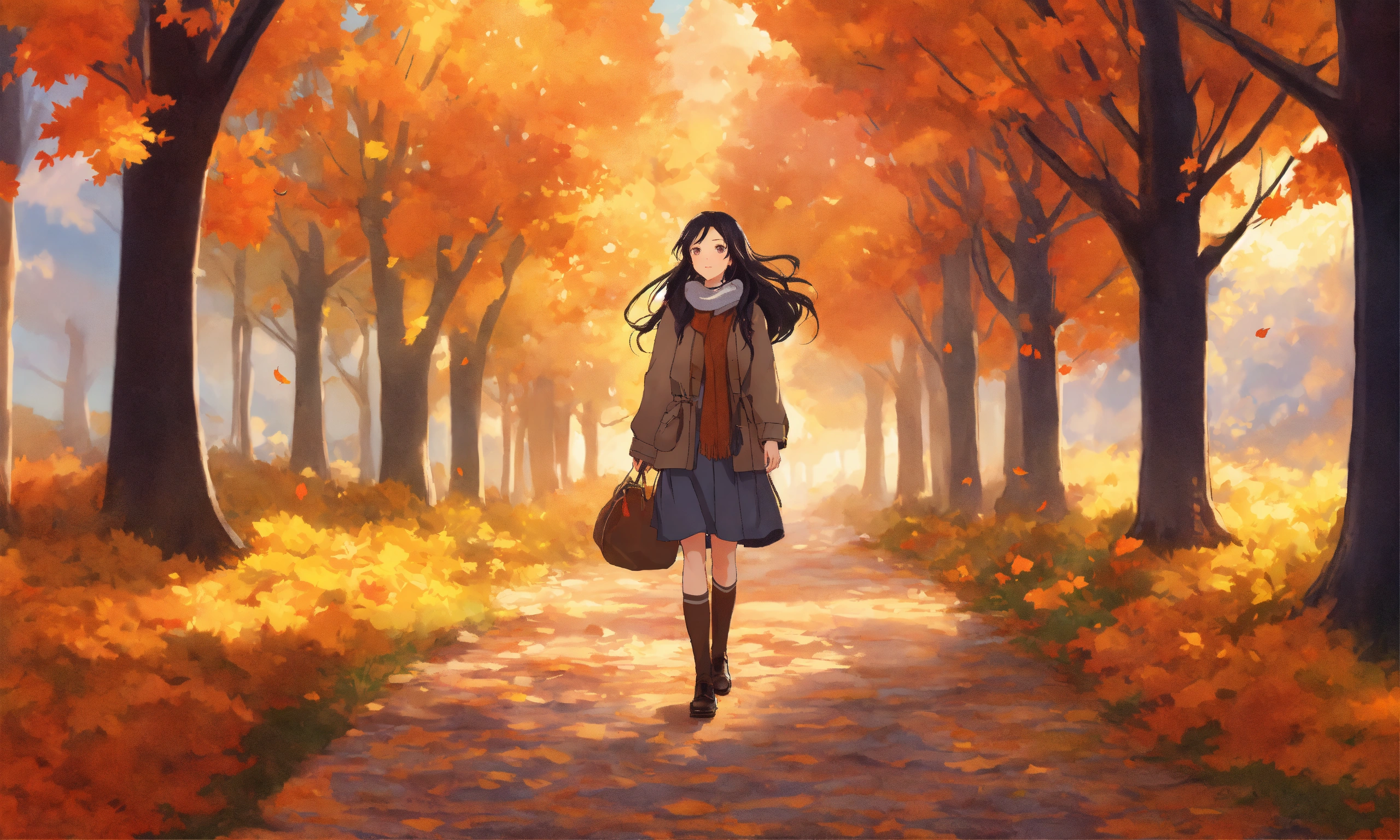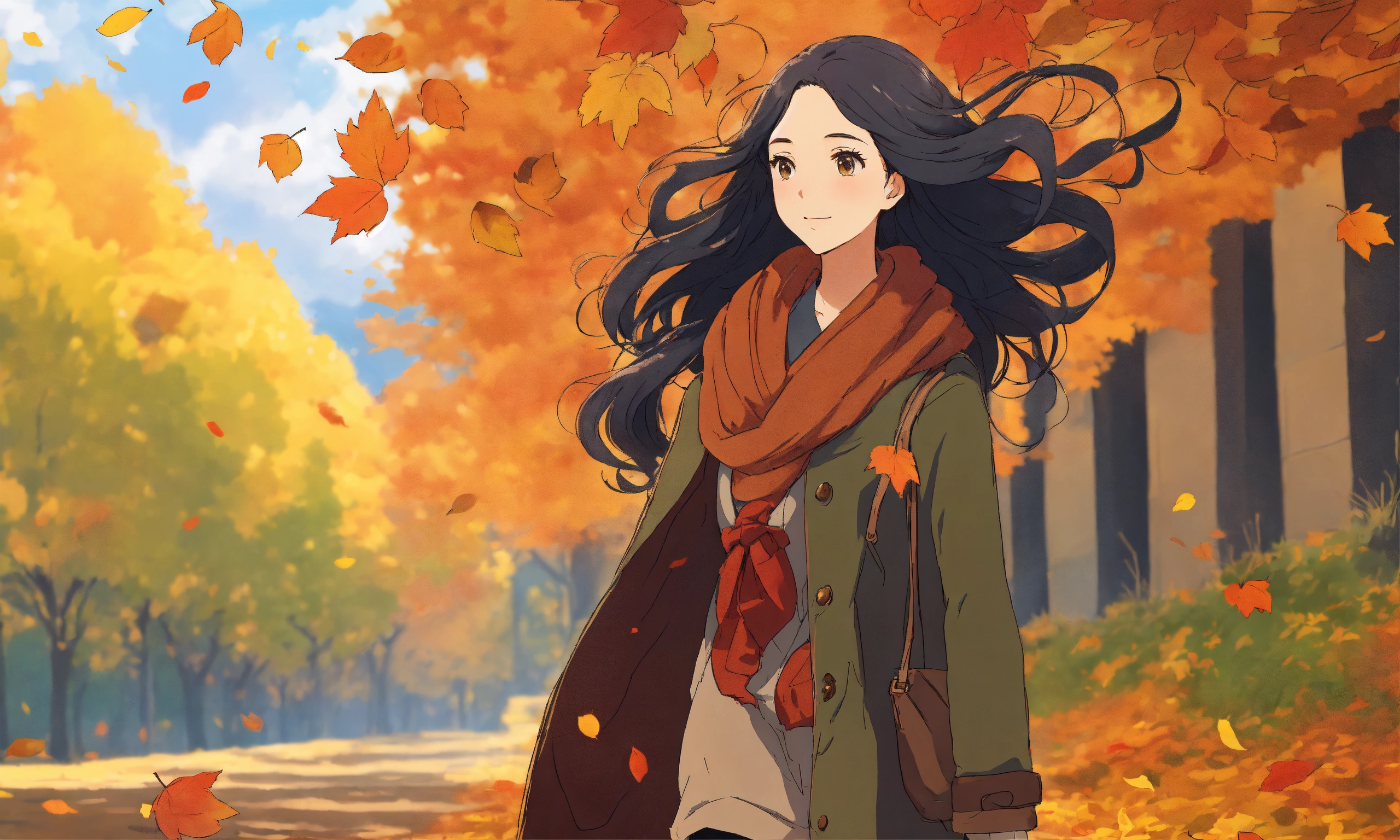 In a studio ghibli-inspired style, depict a girl with long flowing black hair gently tousled by the breeze as she walks on a path lined with autumn leaves. she's dressed in cozy autumn attire, fitting for the season.