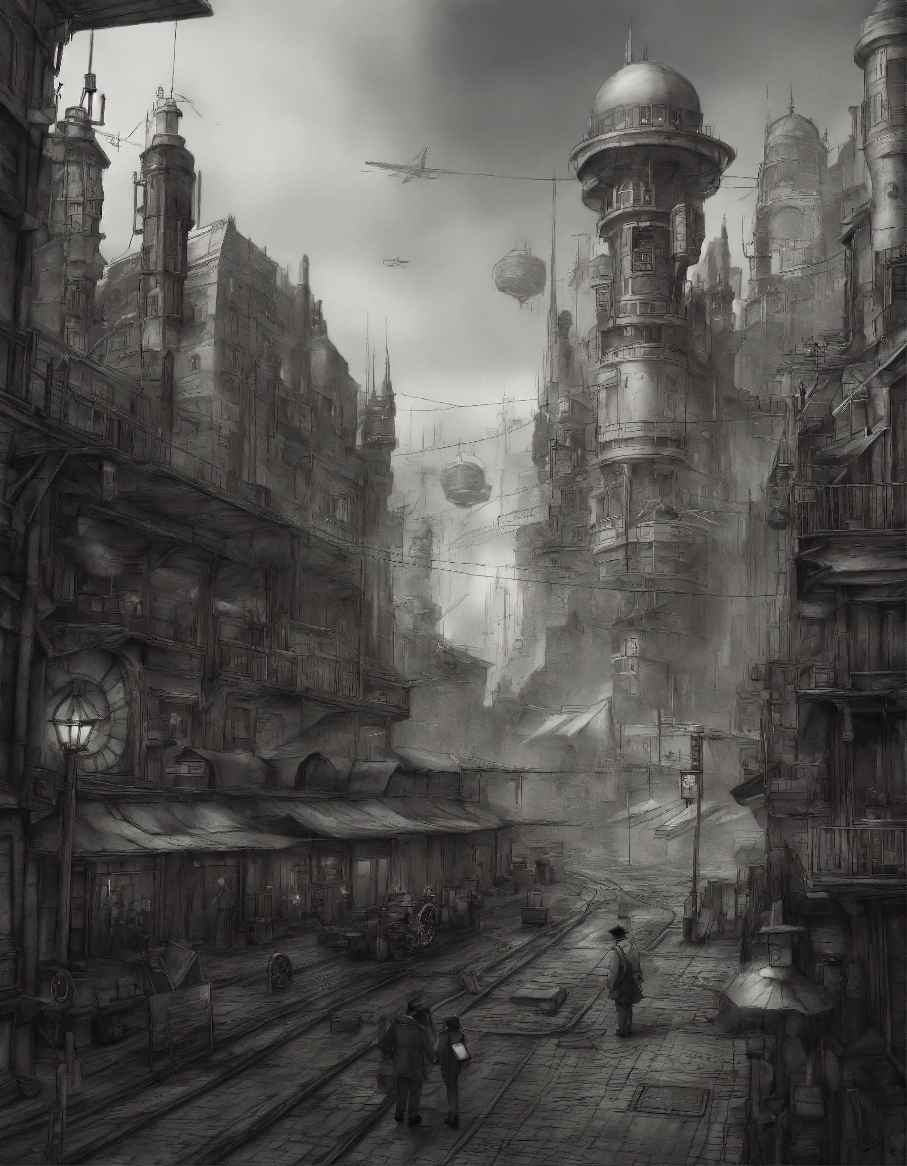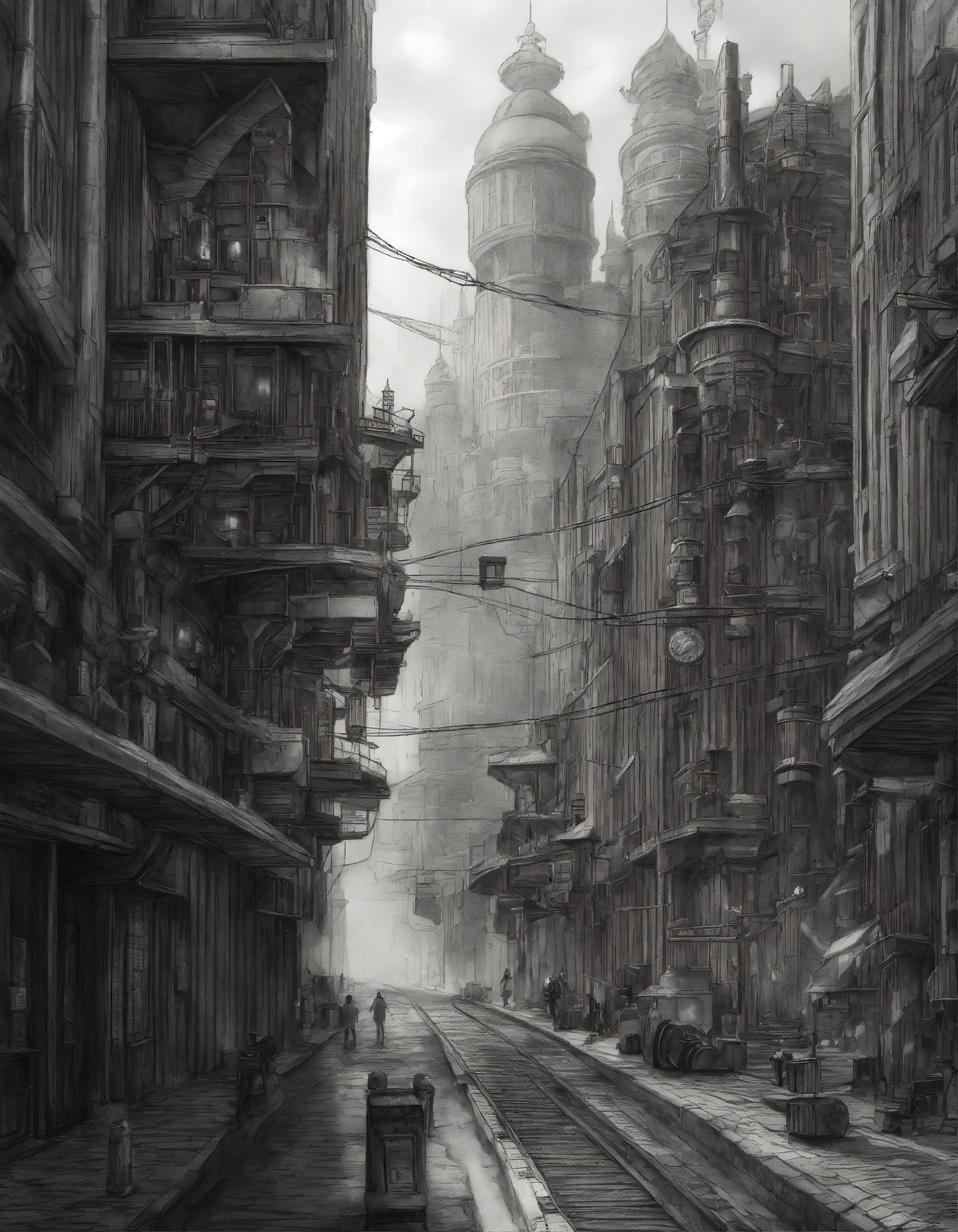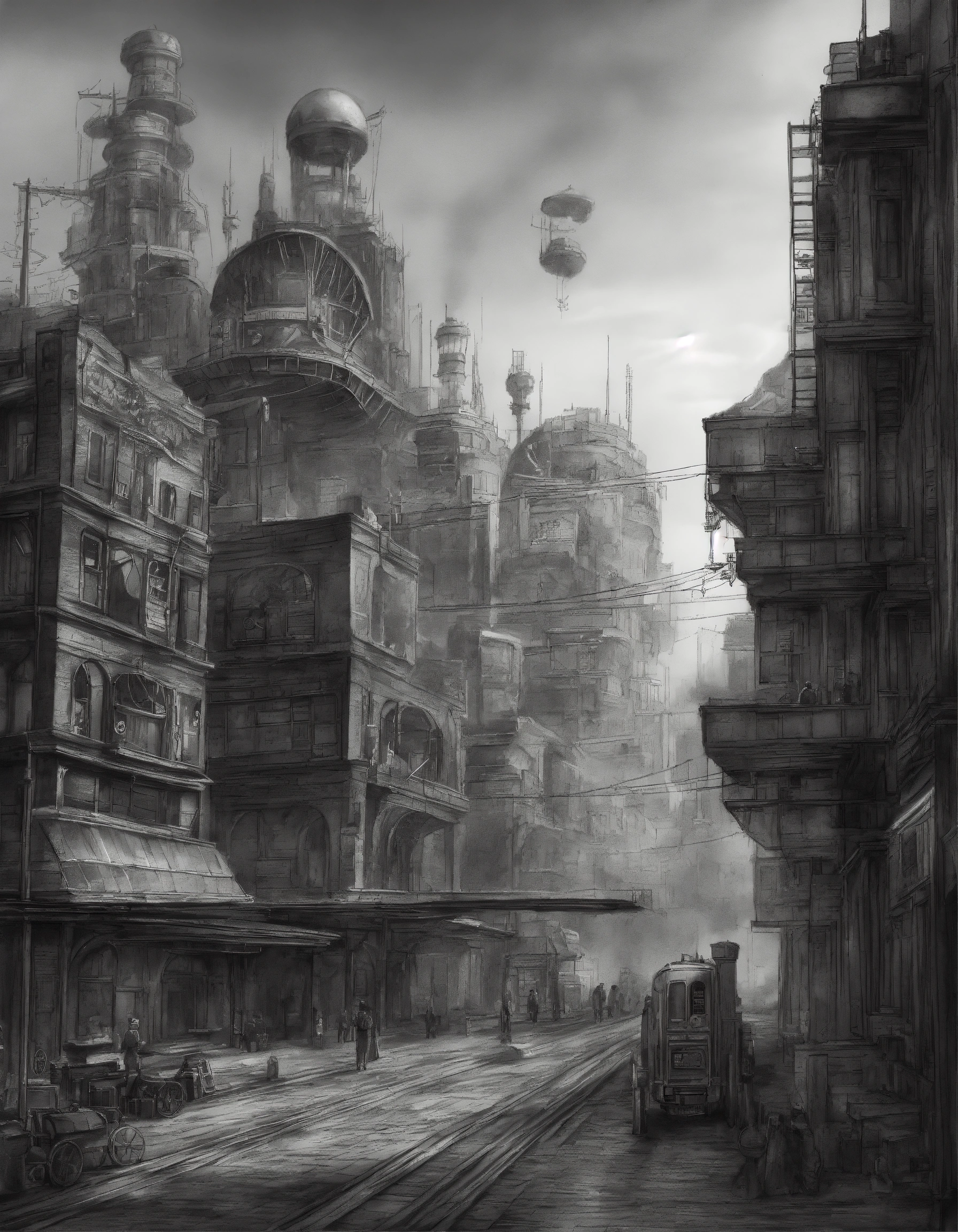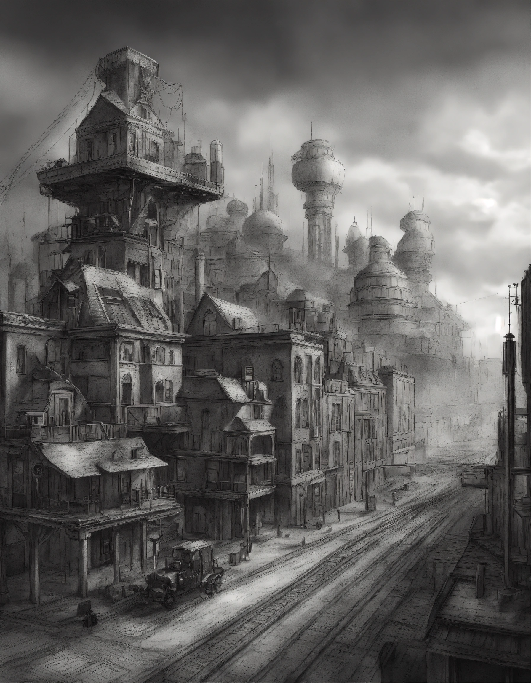 A pencil sketch depicting a post cataclysm steampunk city. realistic. high detailed
