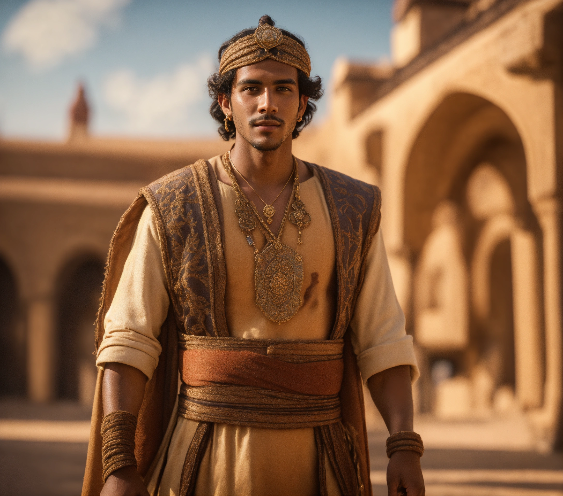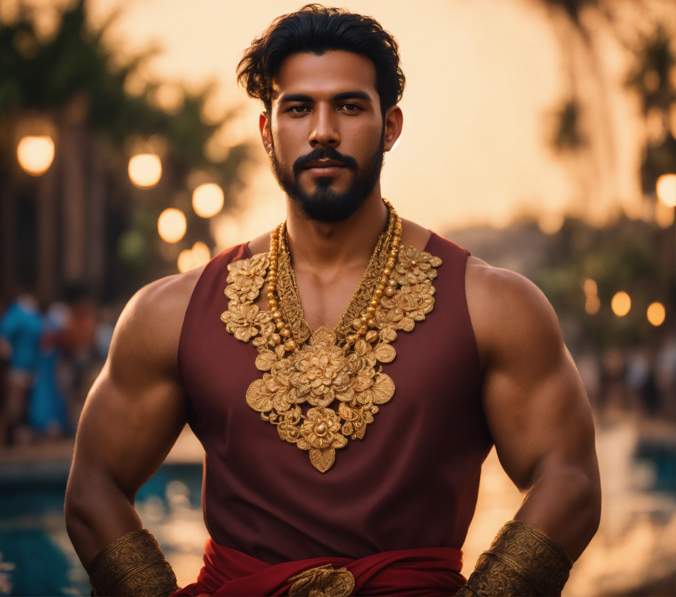 Handsome suntanned aladim from disney, portrait, best quality, full body portrait, real picture, intricate details, depth of field, fujifilm xt3, raw photo, 8k uhd, film grain, unreal engine 5, ray tracing