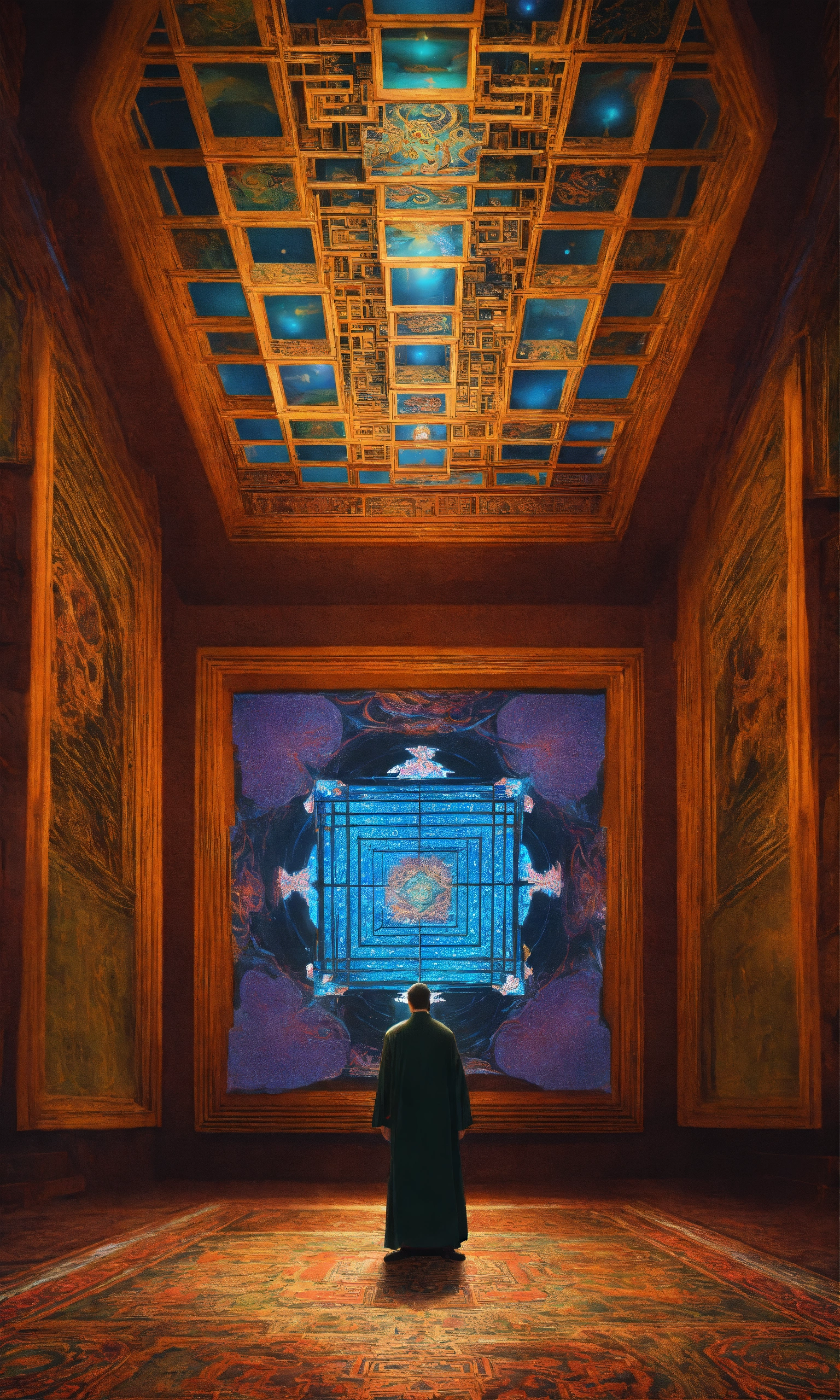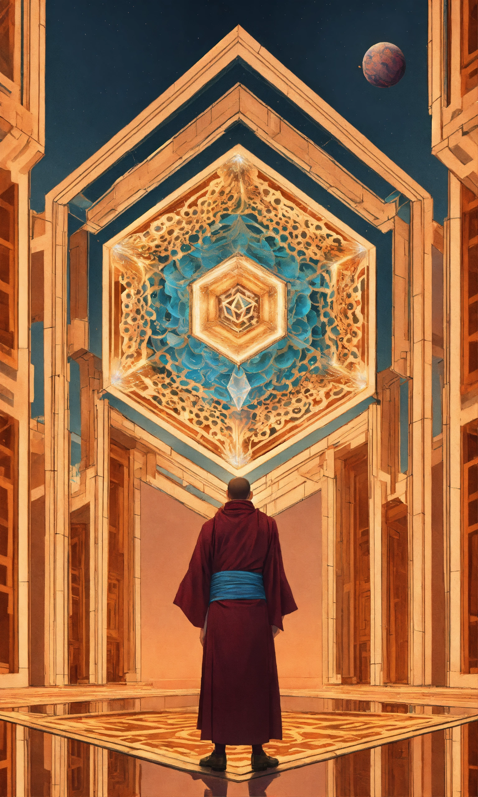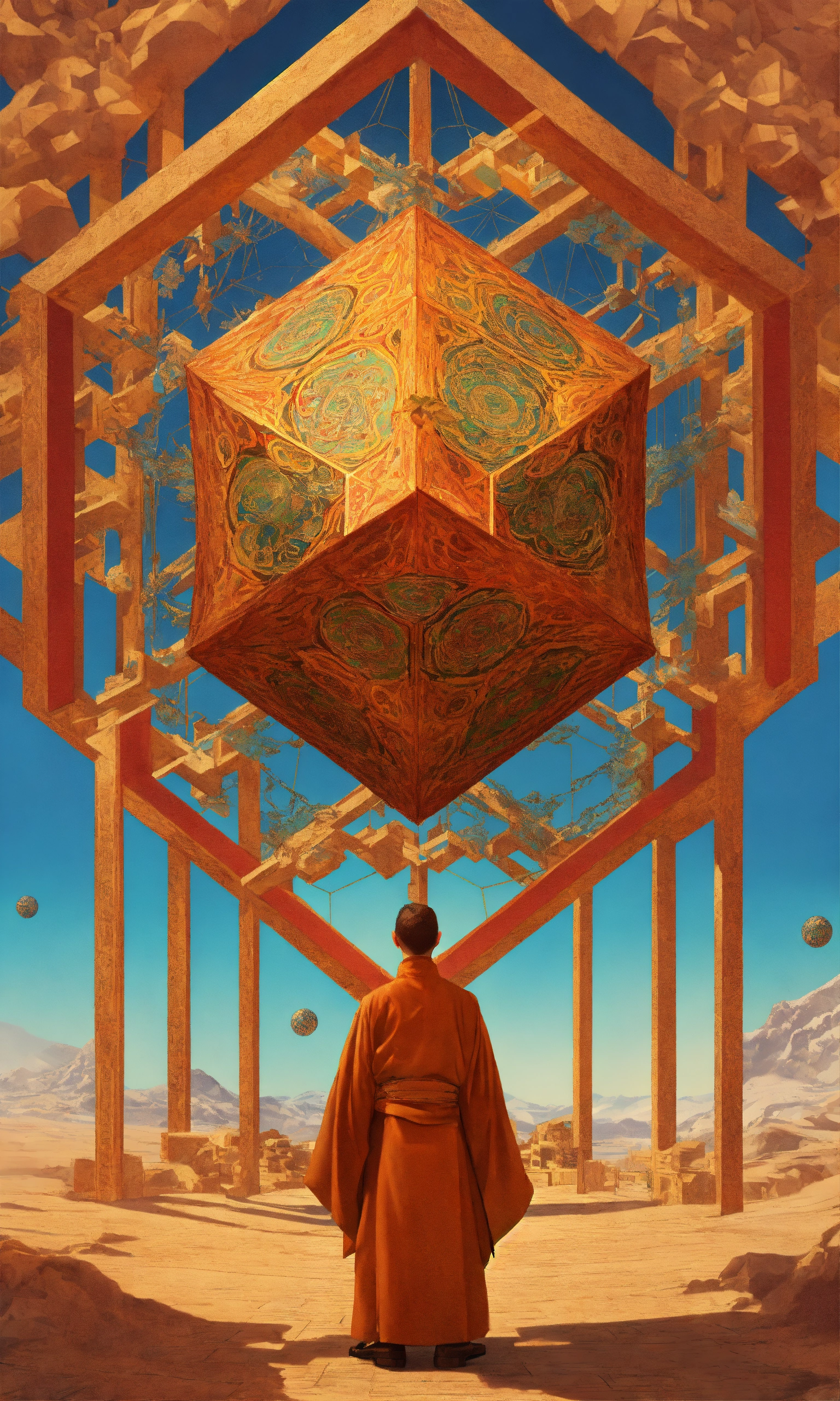 Taoist monk octopus tesseract body fractal three point perspective hypercube mirror