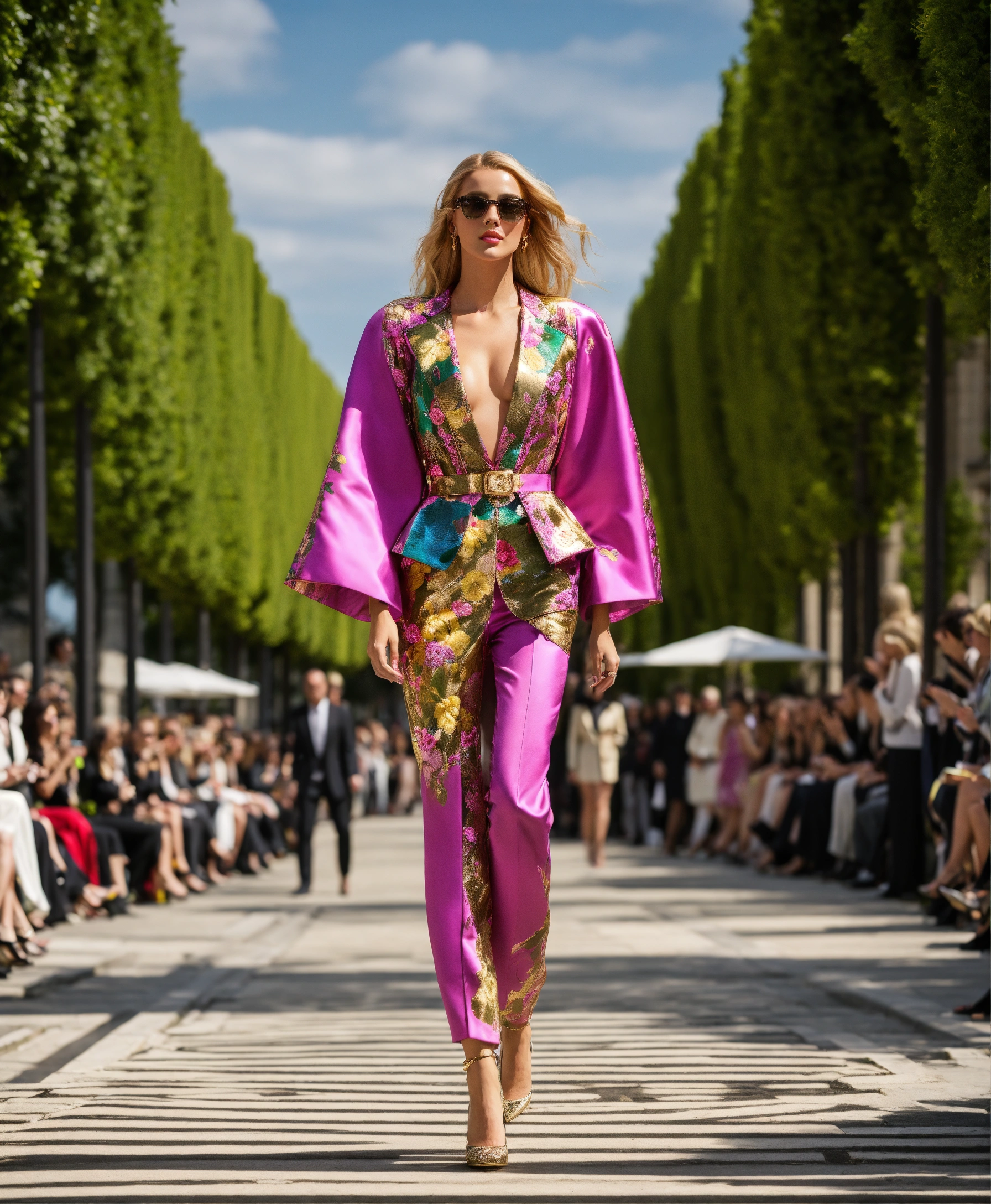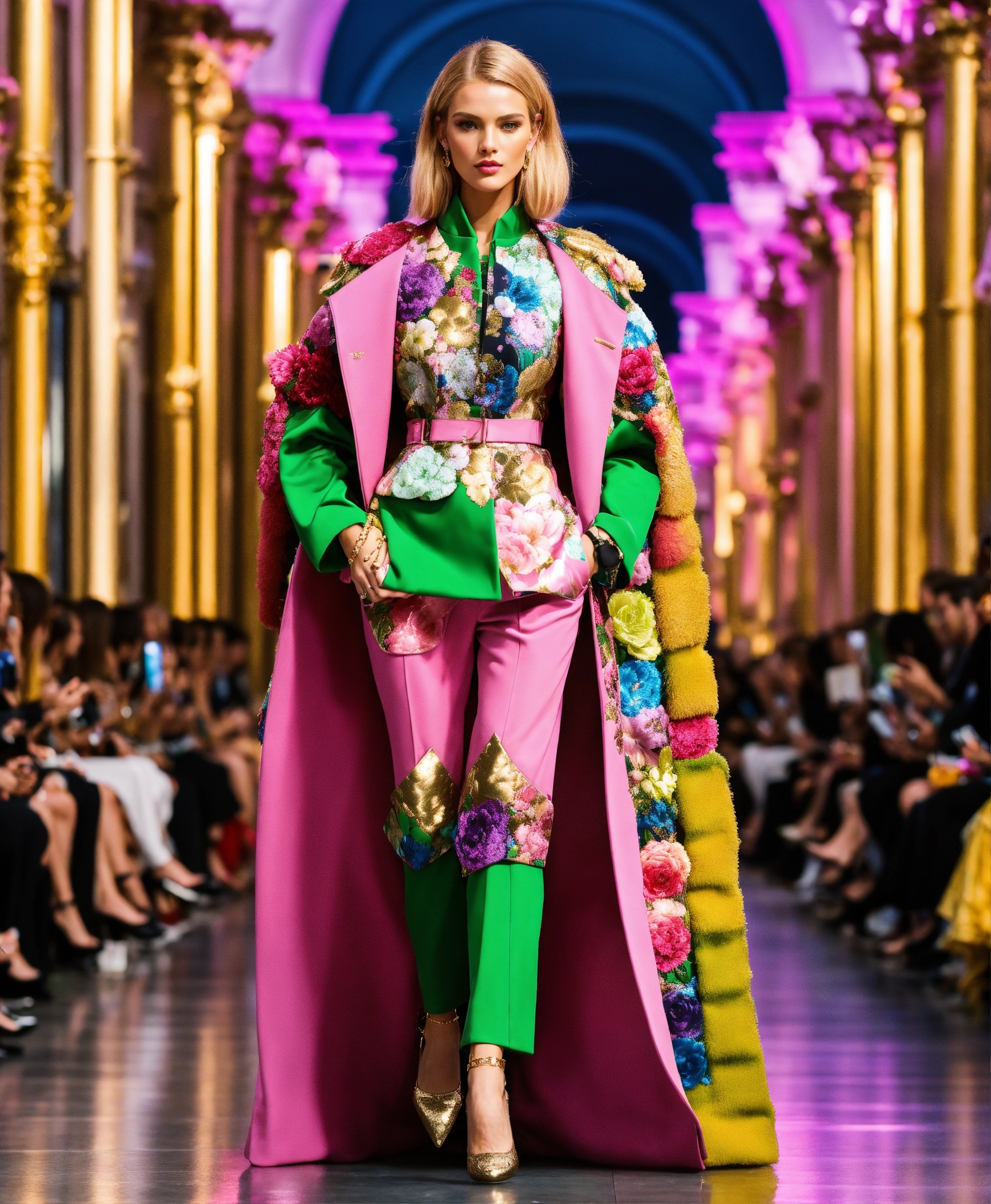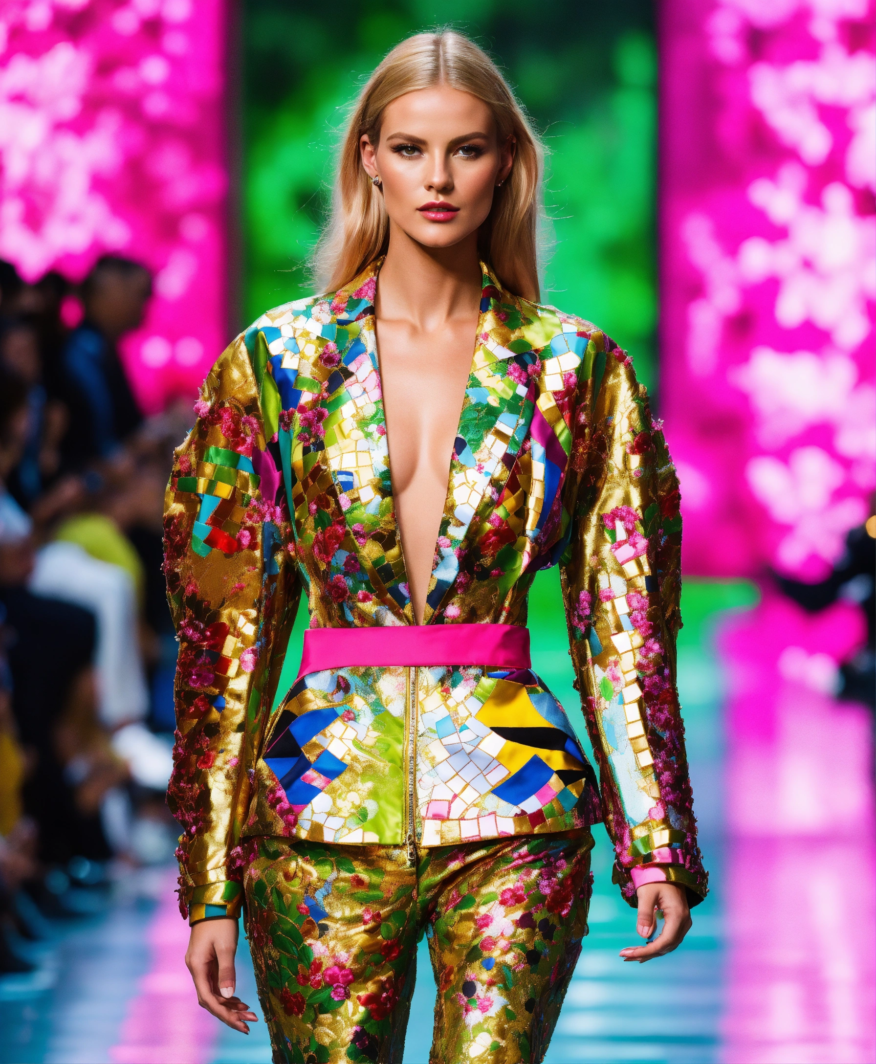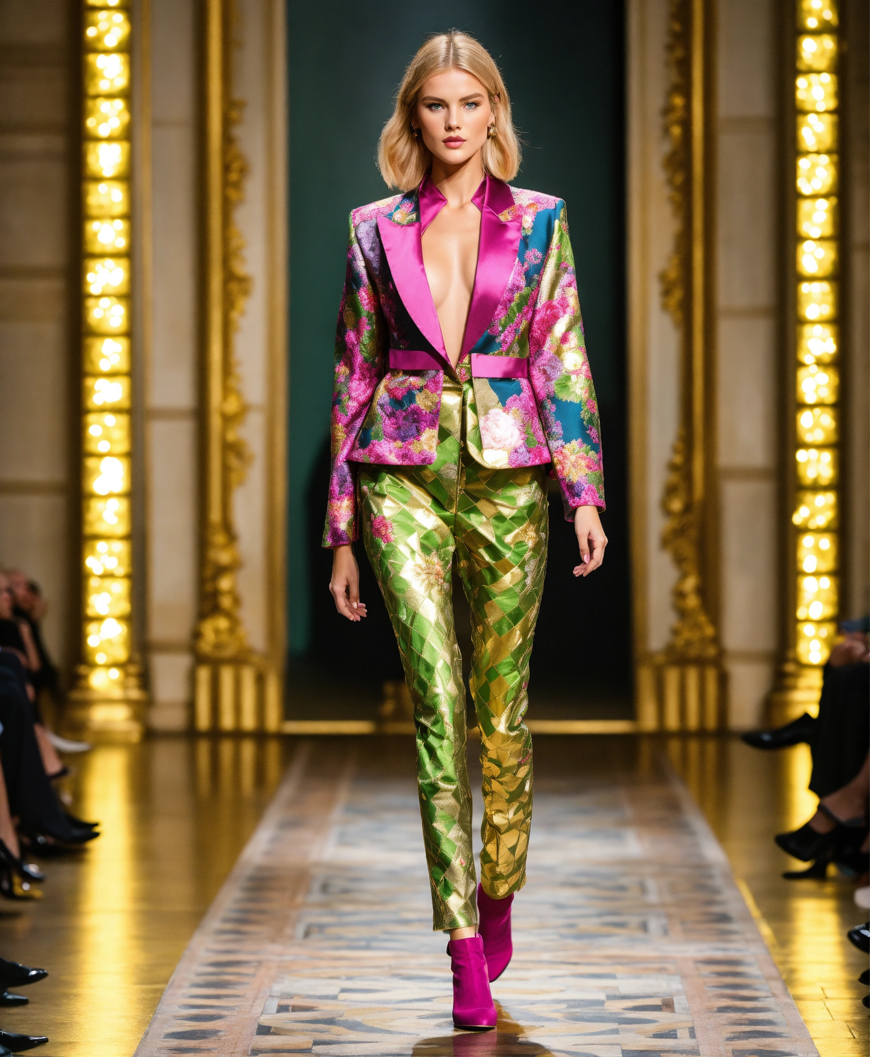Ultra realistic full body photo of an fashionable german blonde model walking the runway modeling summer designer novelty interesting complex unusual street sporty classy modern dolman sleeve outfit brave, paris versailles details cutouts and and gold geometric pattern floral structured tailored jacket pink gold green lilac peridot silver magenta lime fuchsia yellow blue black gray copper mauve bronze haute couture ultimate elegance beautiful luxurious awesome wealthy opulent resplendent magnificent sublime 12k