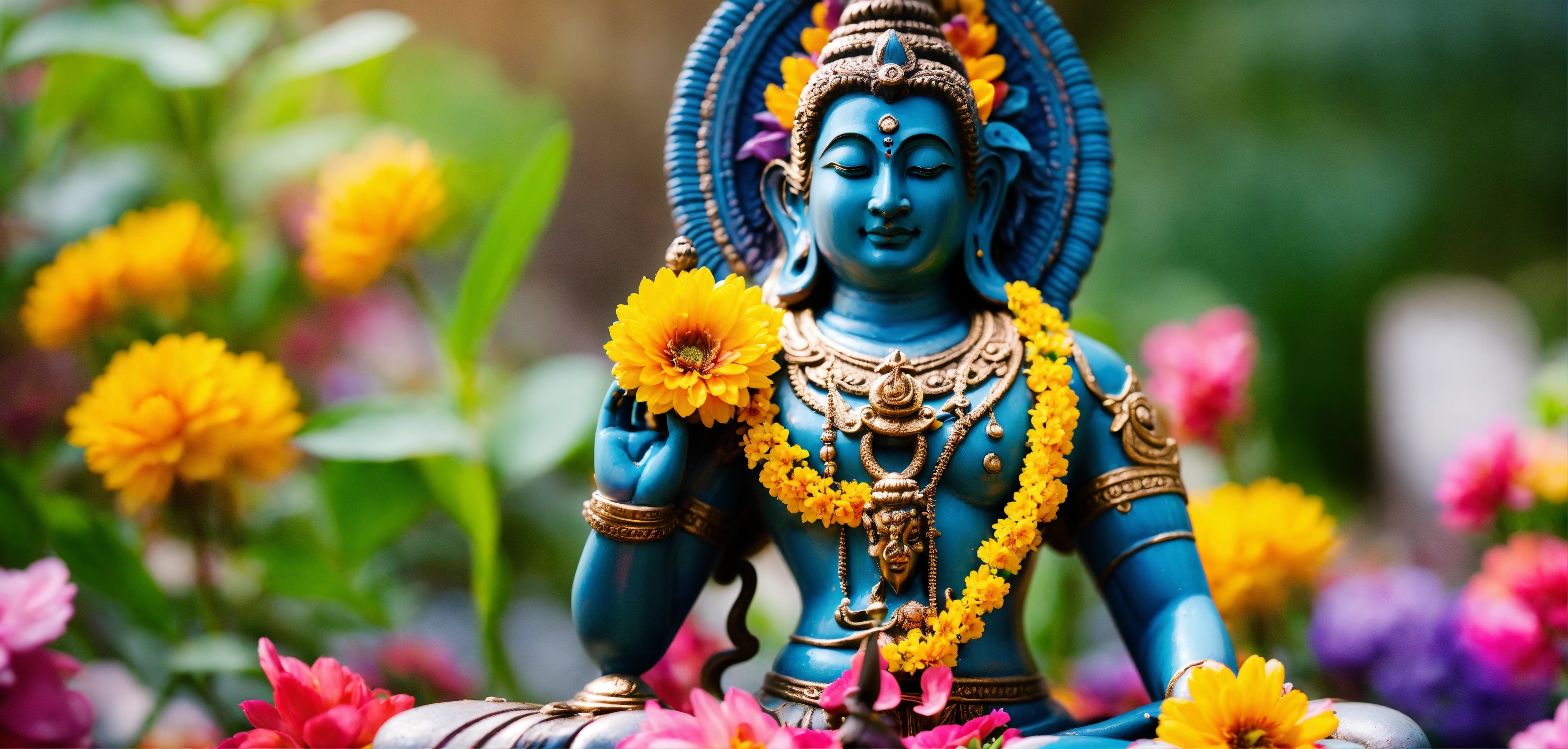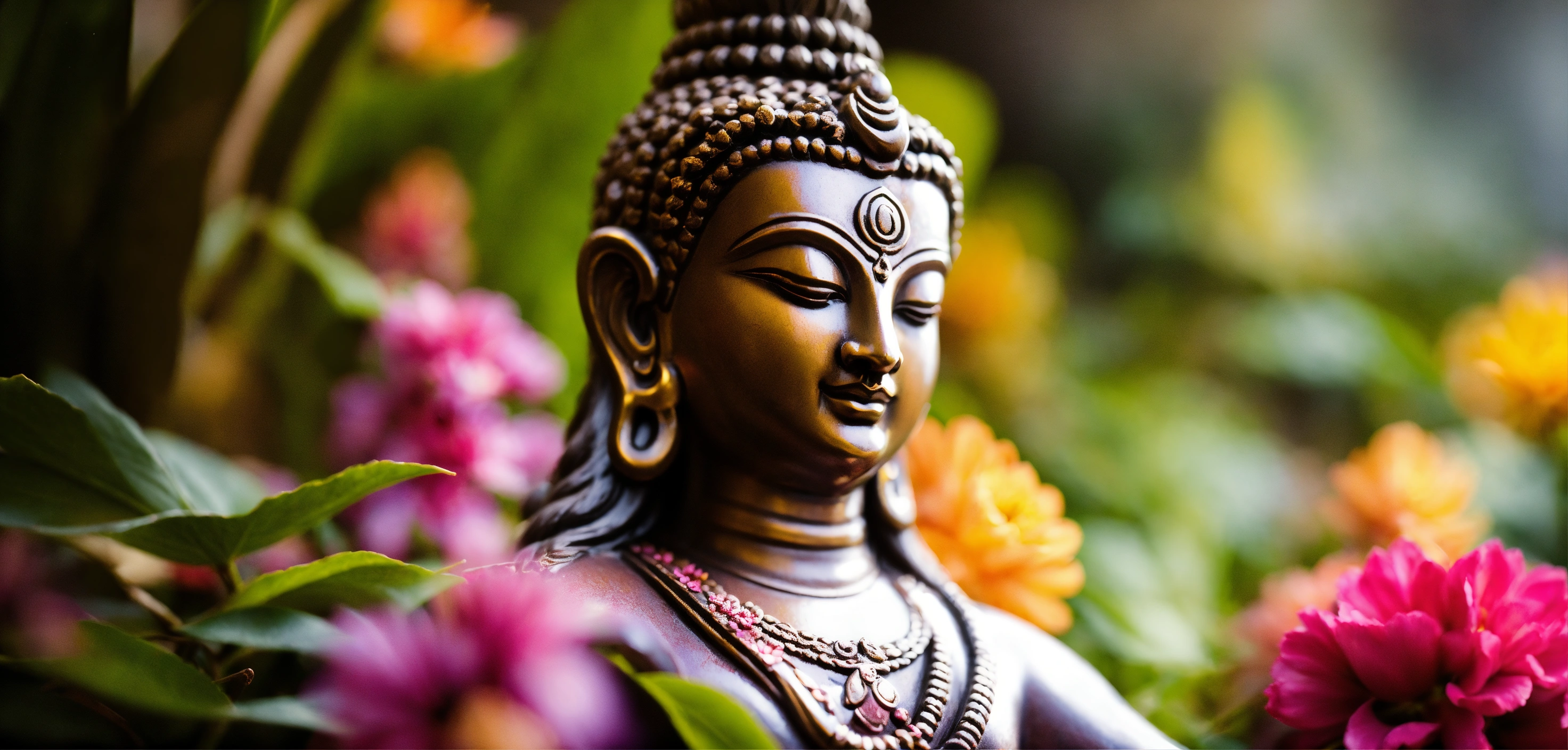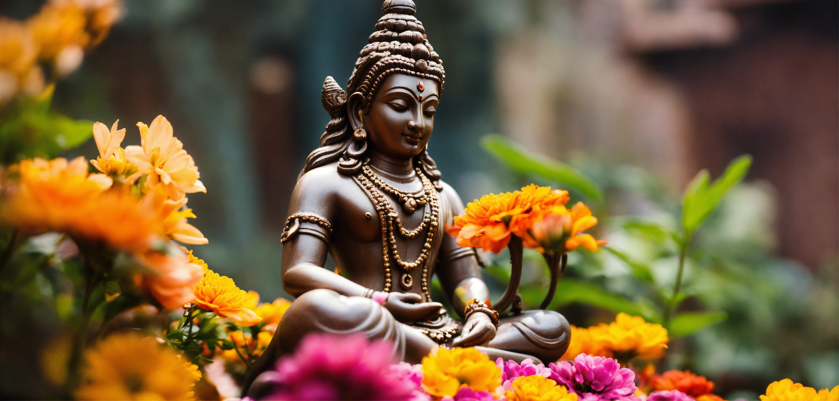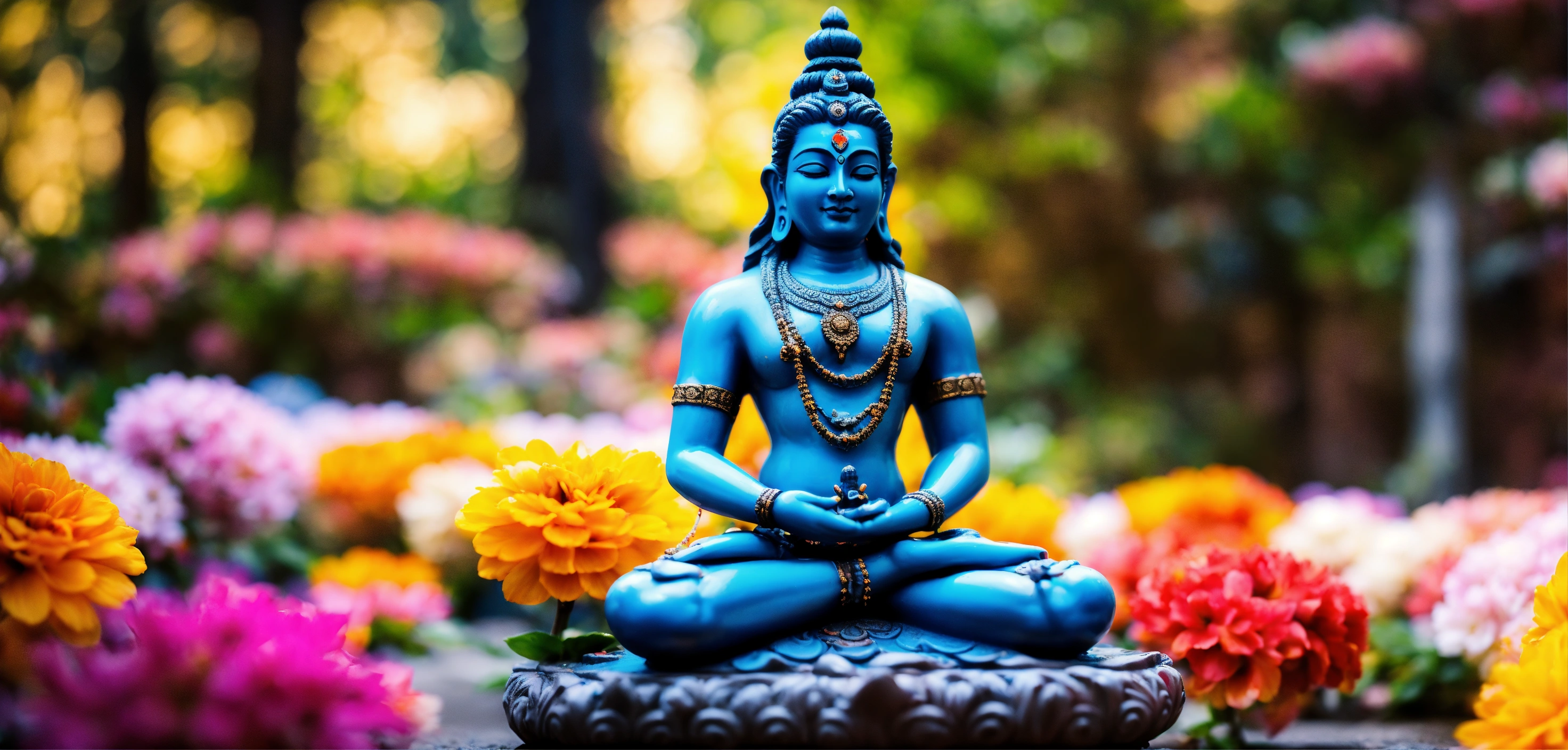 Hindu god shiva statue in meditation with colourful flowers, selective focus on the statue, realistic, film grain, 35mm, 1600 iso, sony a7riv, 16k, vintage filter, high quality photo, photorealistic, 8k, vivid bright color, natural colors, ambience light, studio quality, rich skin quality
