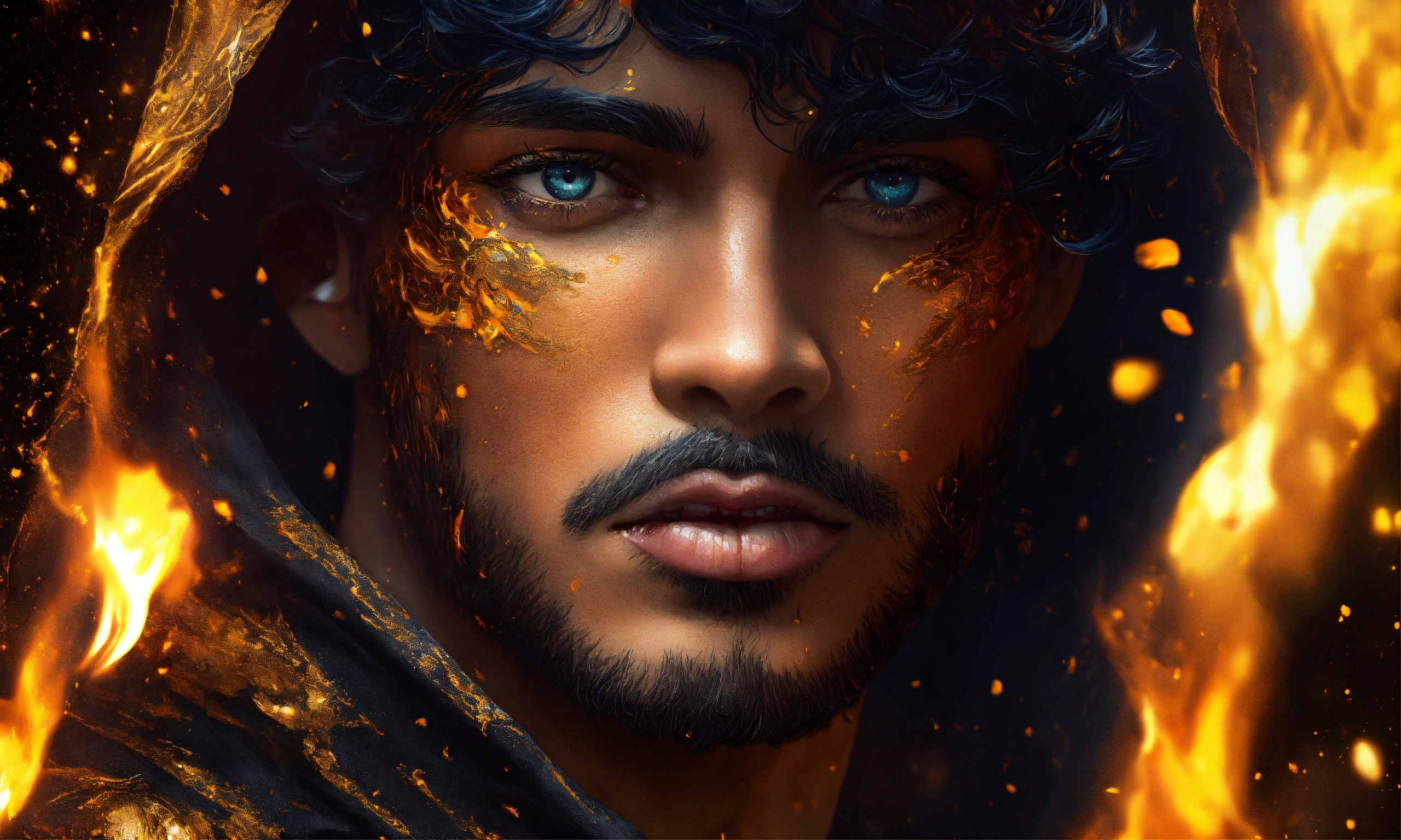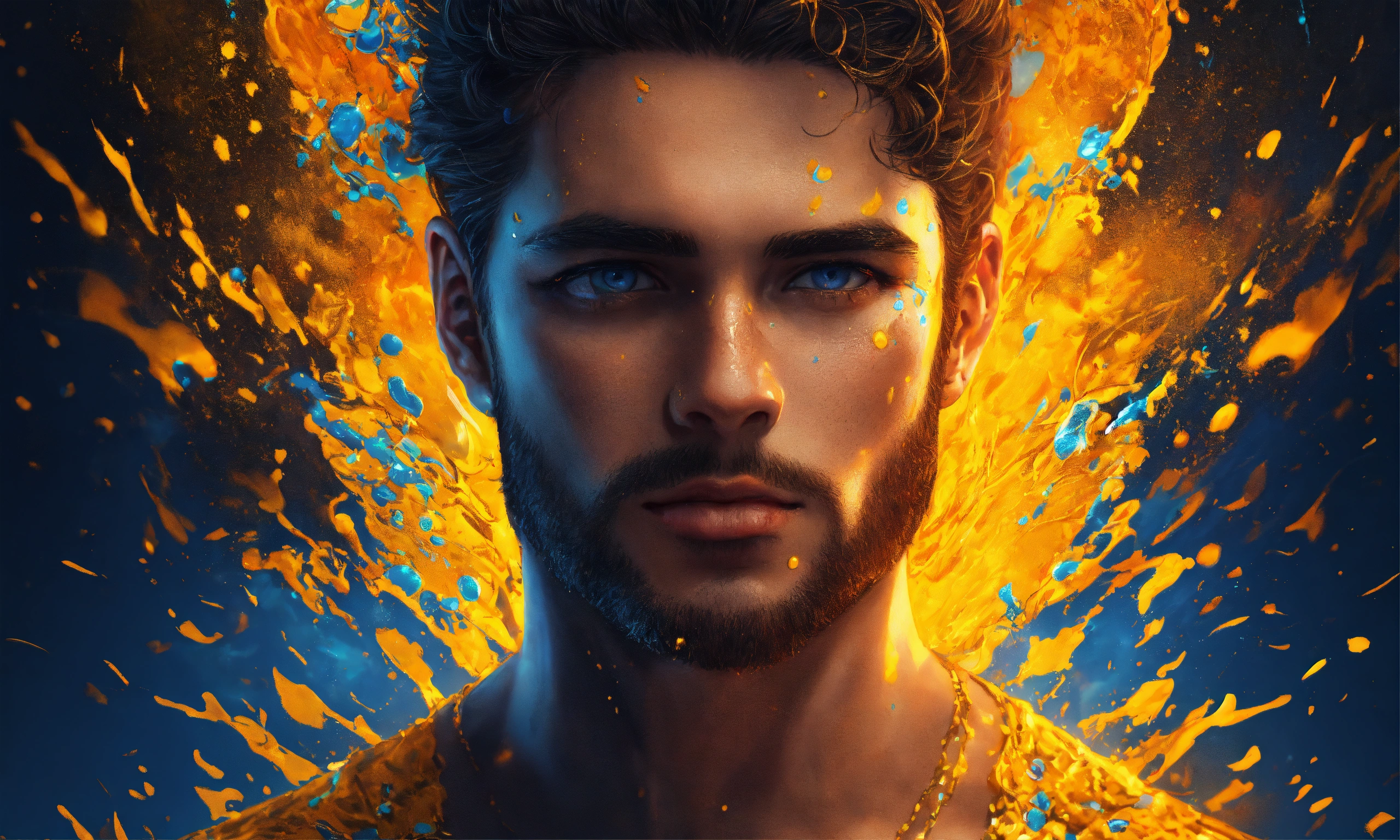 A handsome man, hyperdetailed eyes, tee-shirt design, line art, black background, ultra detailed artistic, detailed gorgeous face, natural skin, water splash, colour splash art, fire and ice, splatter, black ink, liquid melting, dreamy, glowing, glamour, glimmer, shadows, oil on canvas, brush strokes, smooth, ultra high definition, 8k, unreal engine 5, ultra sharp focus, intricate artwork masterpiece, ominous, golden ratio, highly detailed, vibrant, production cinematic character render, ultra high quality model