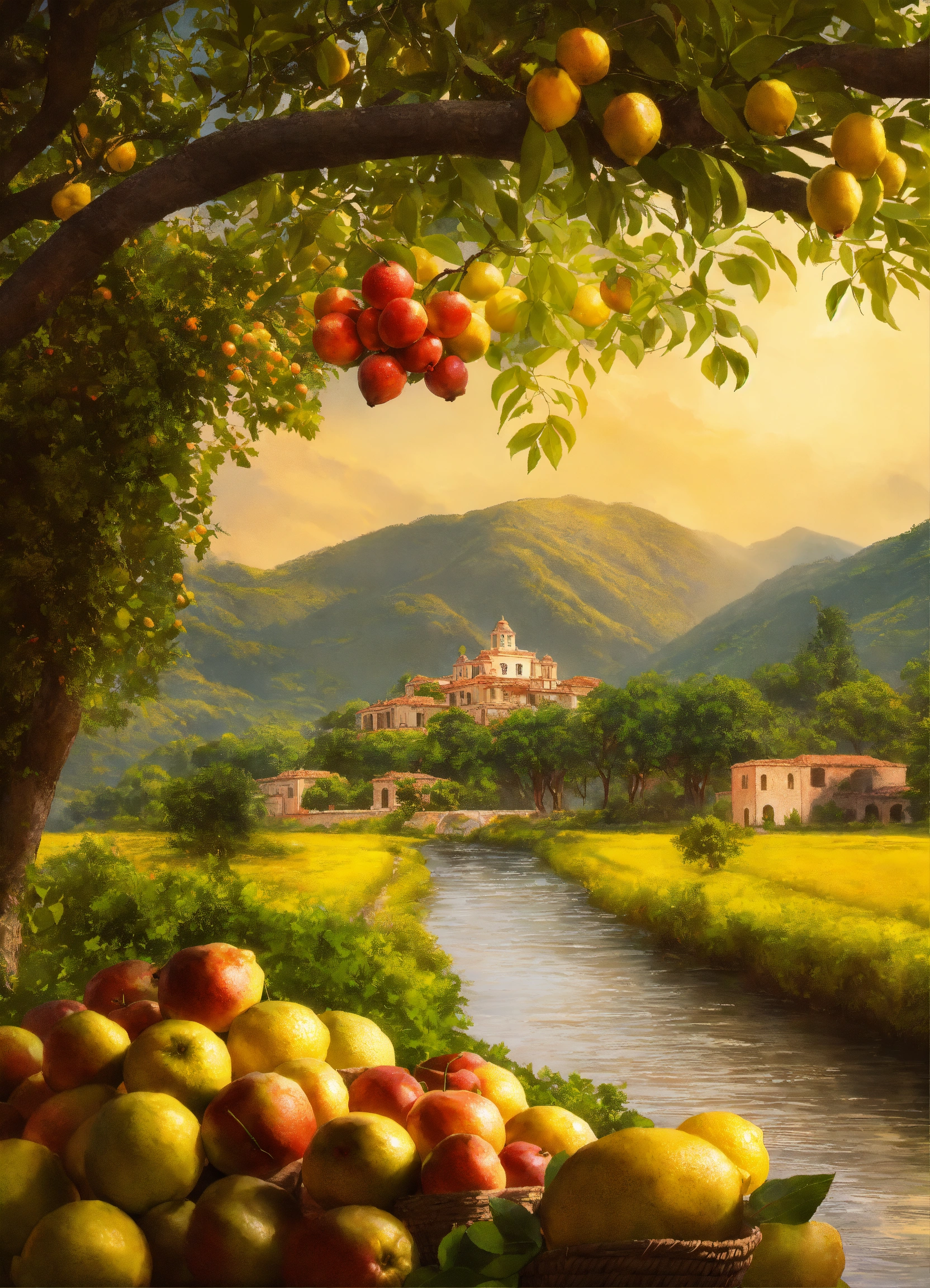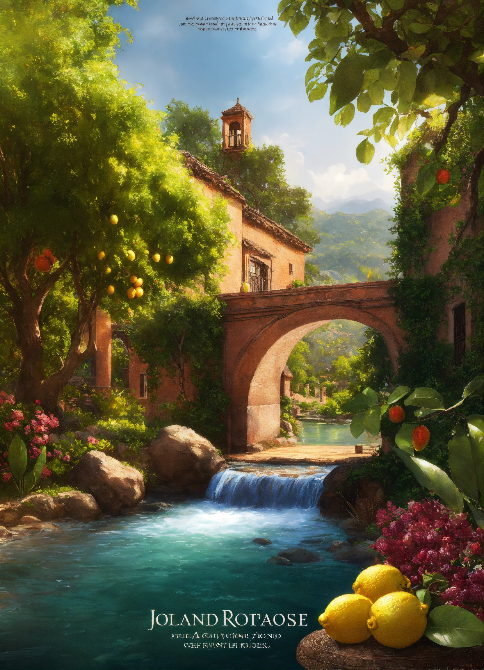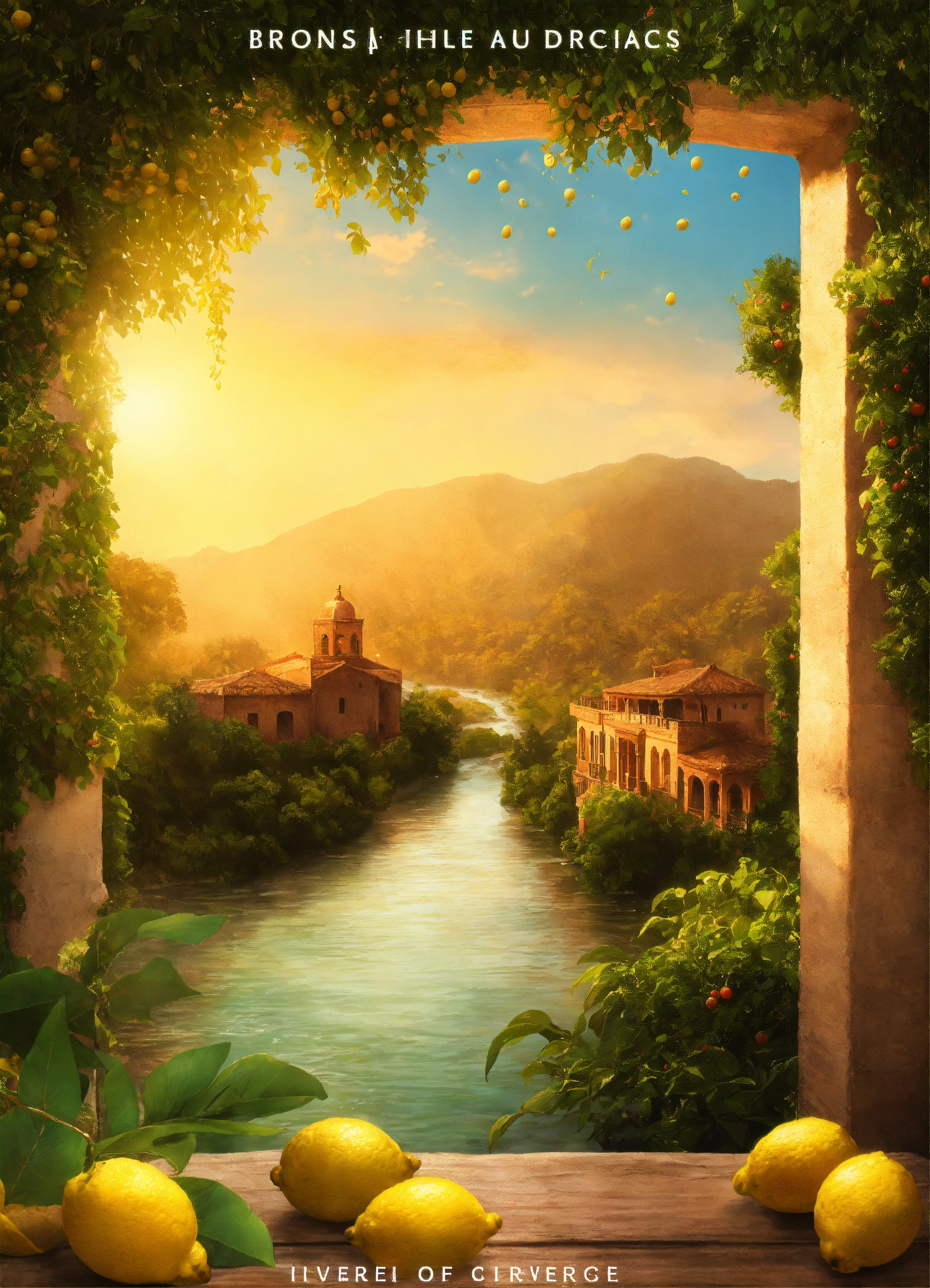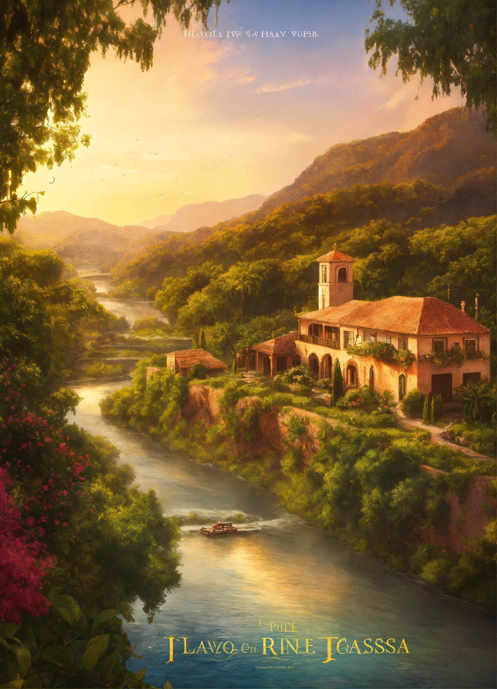 Create a captivating book cover design that conveys the theme of romance fantasy, fiction historical to the right of the hacienda, a river runs near the hacienda, with a couple of fruit-bearing trees to the right of the river, one of guavas and one of lemon.