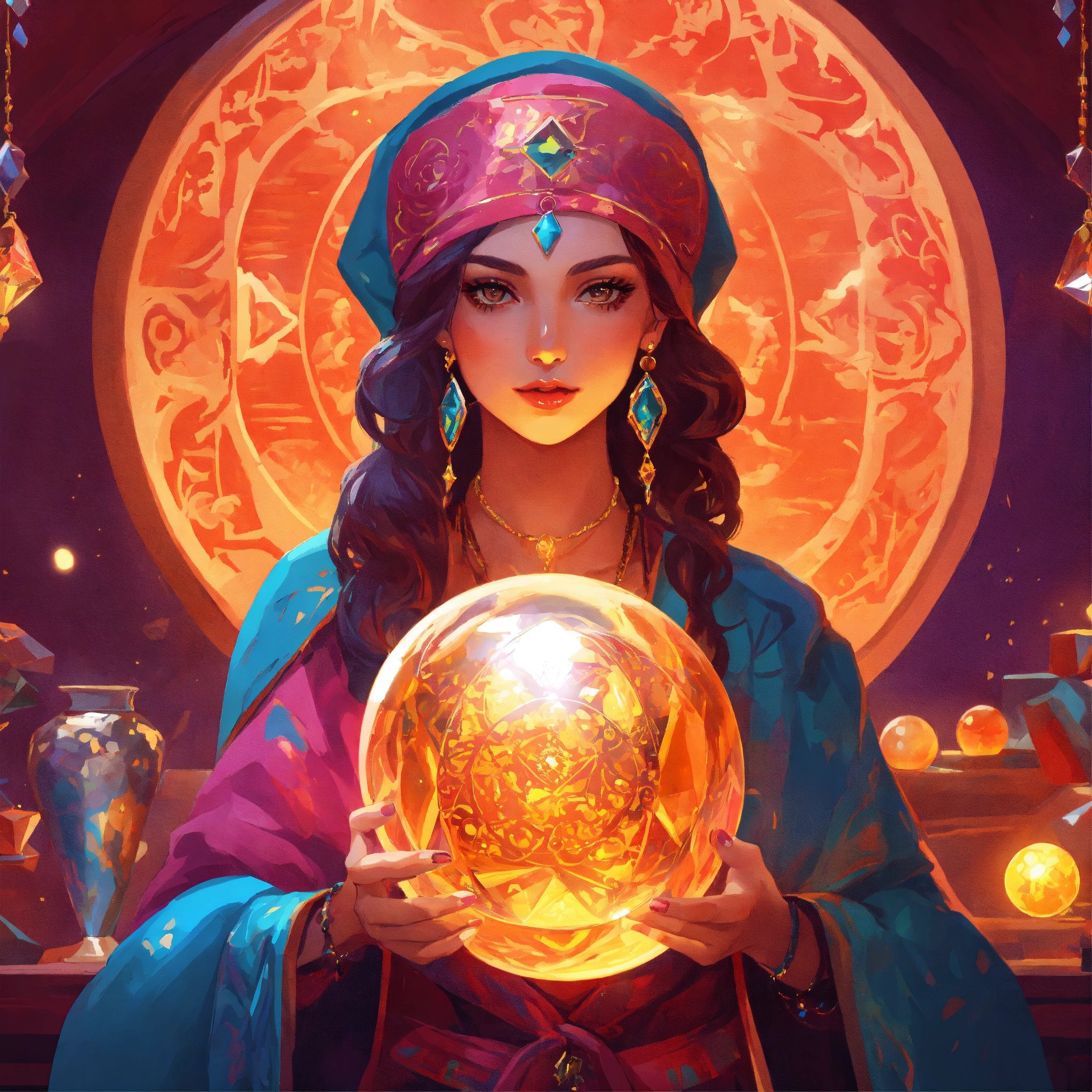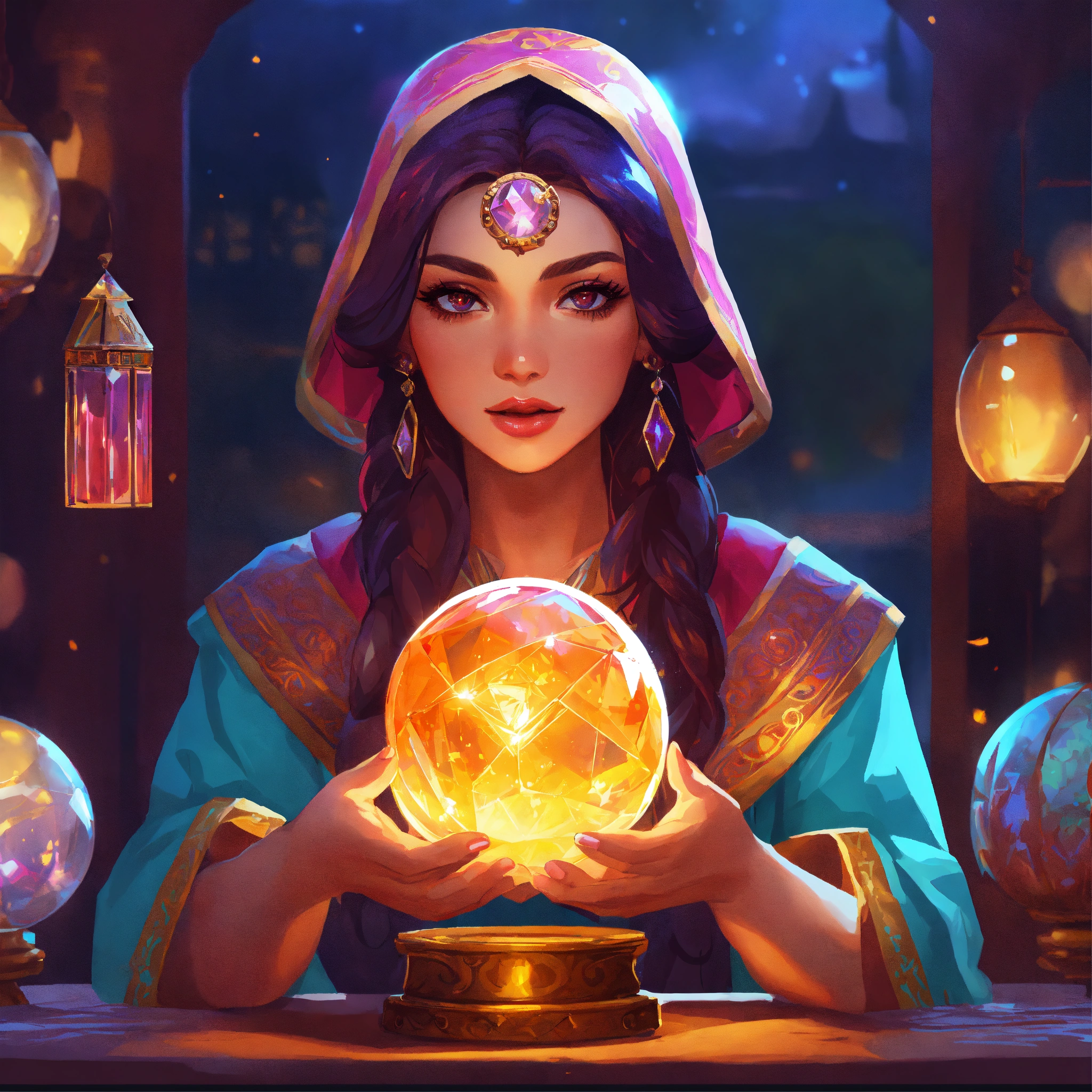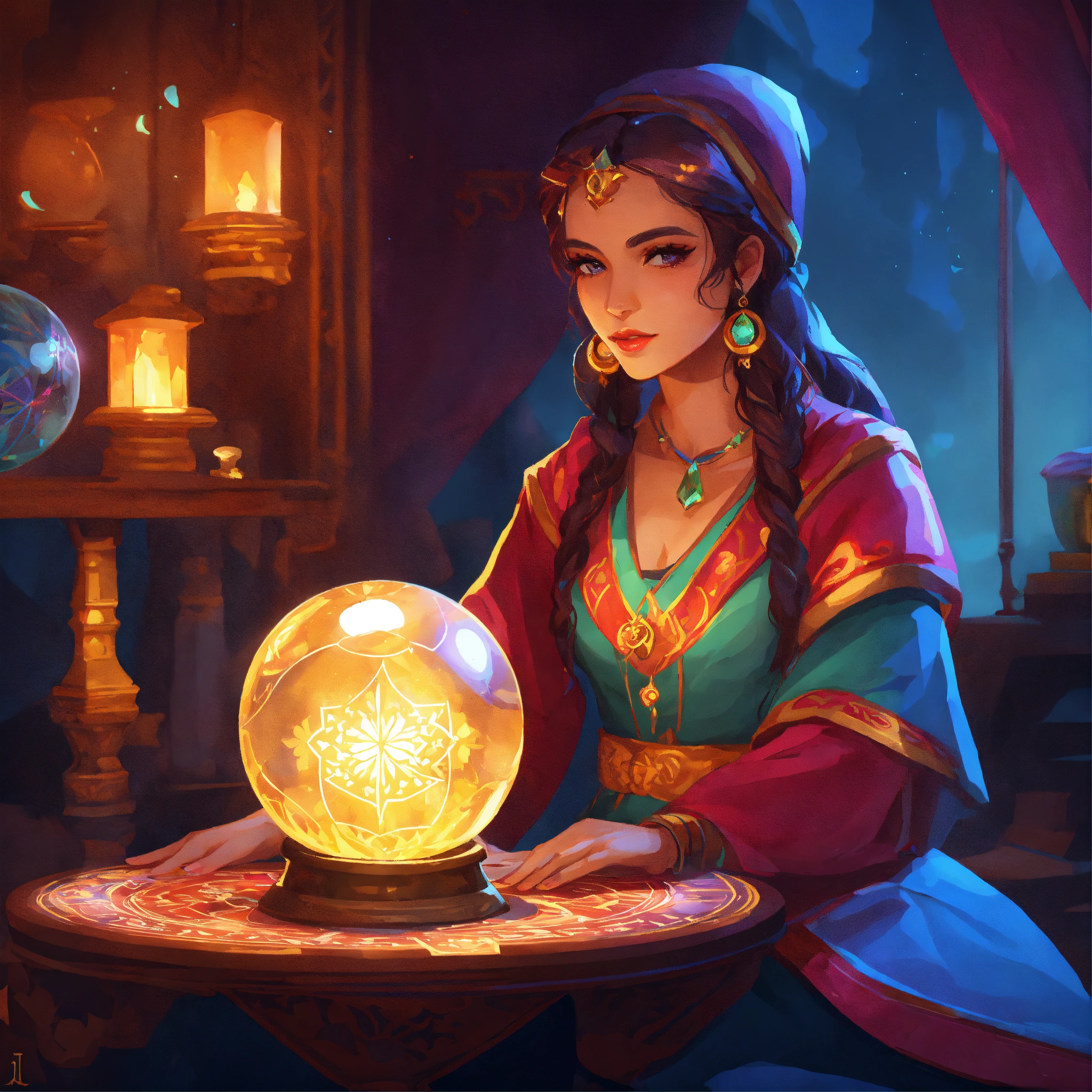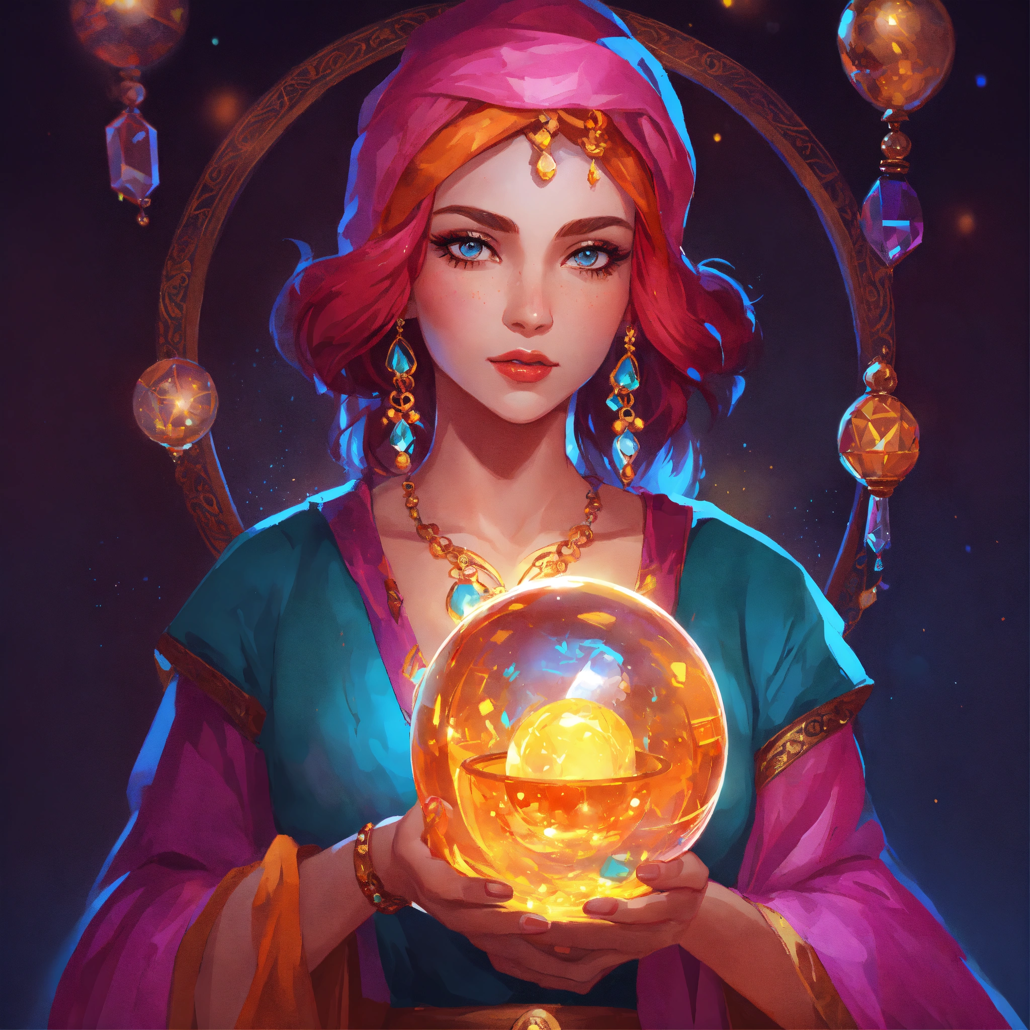 Young woman, fortune teller with a crystal ball, game design, 2d style, sharp focus, bright color, digital paint character design, trending on artstation, high details