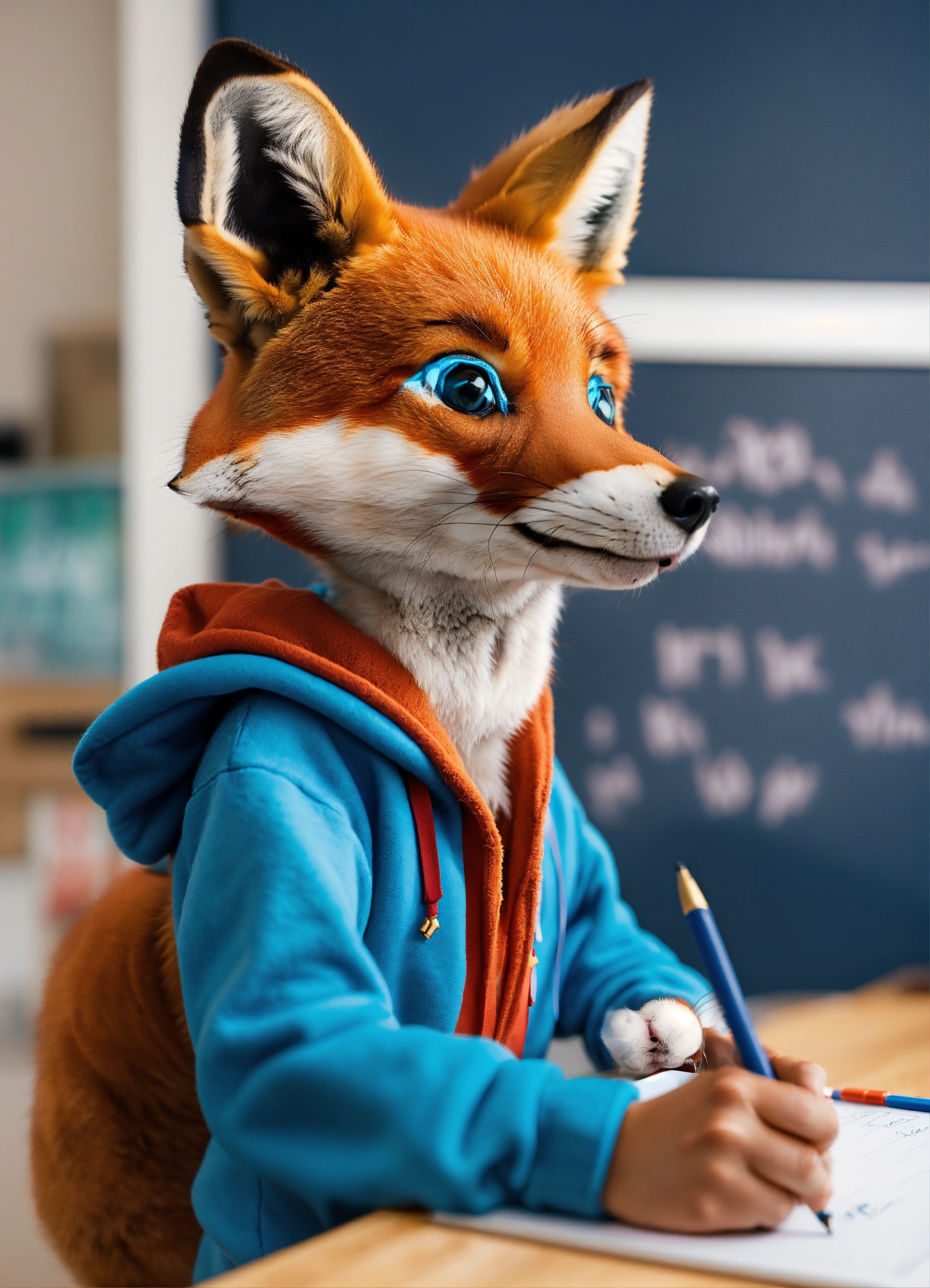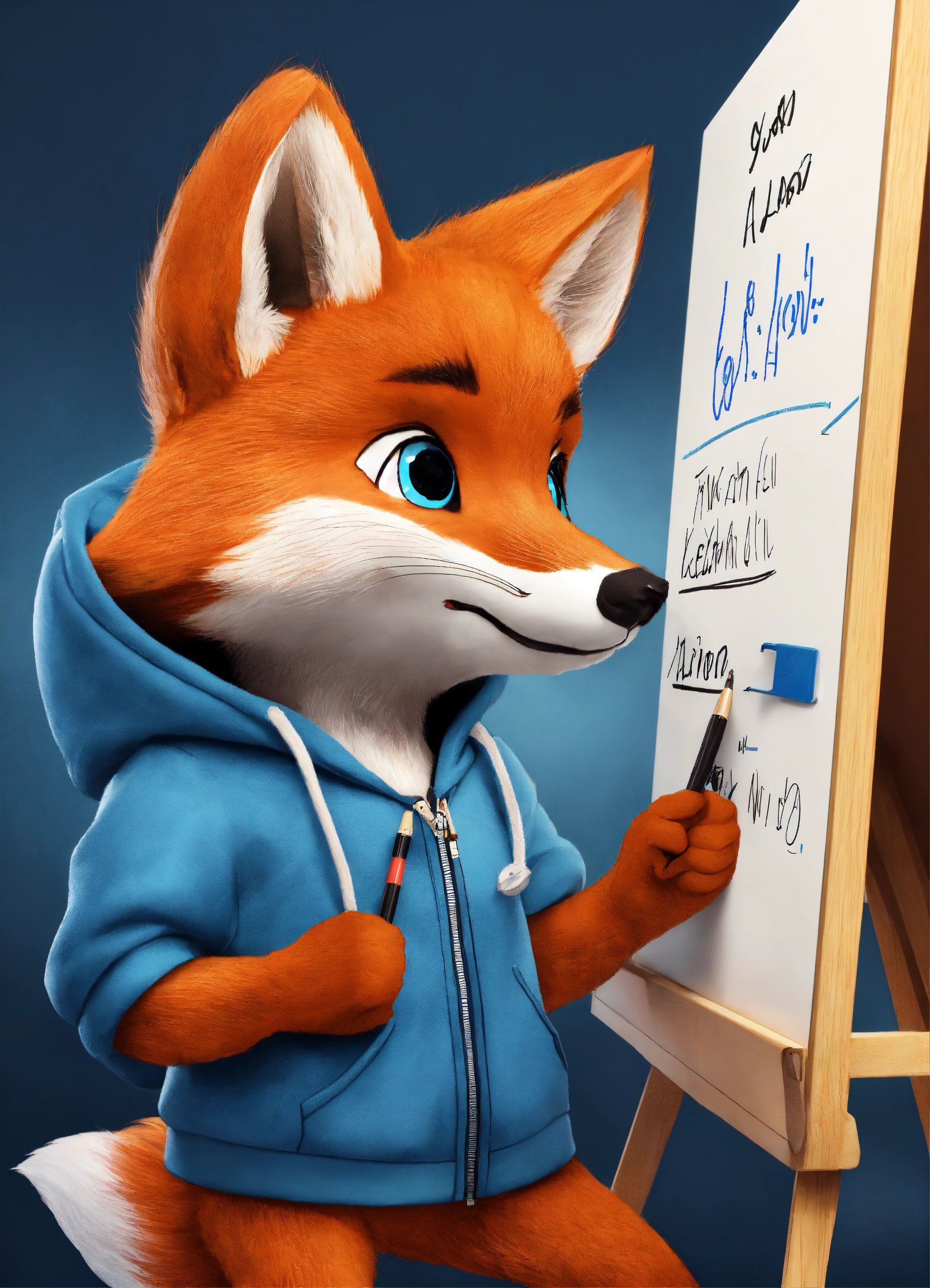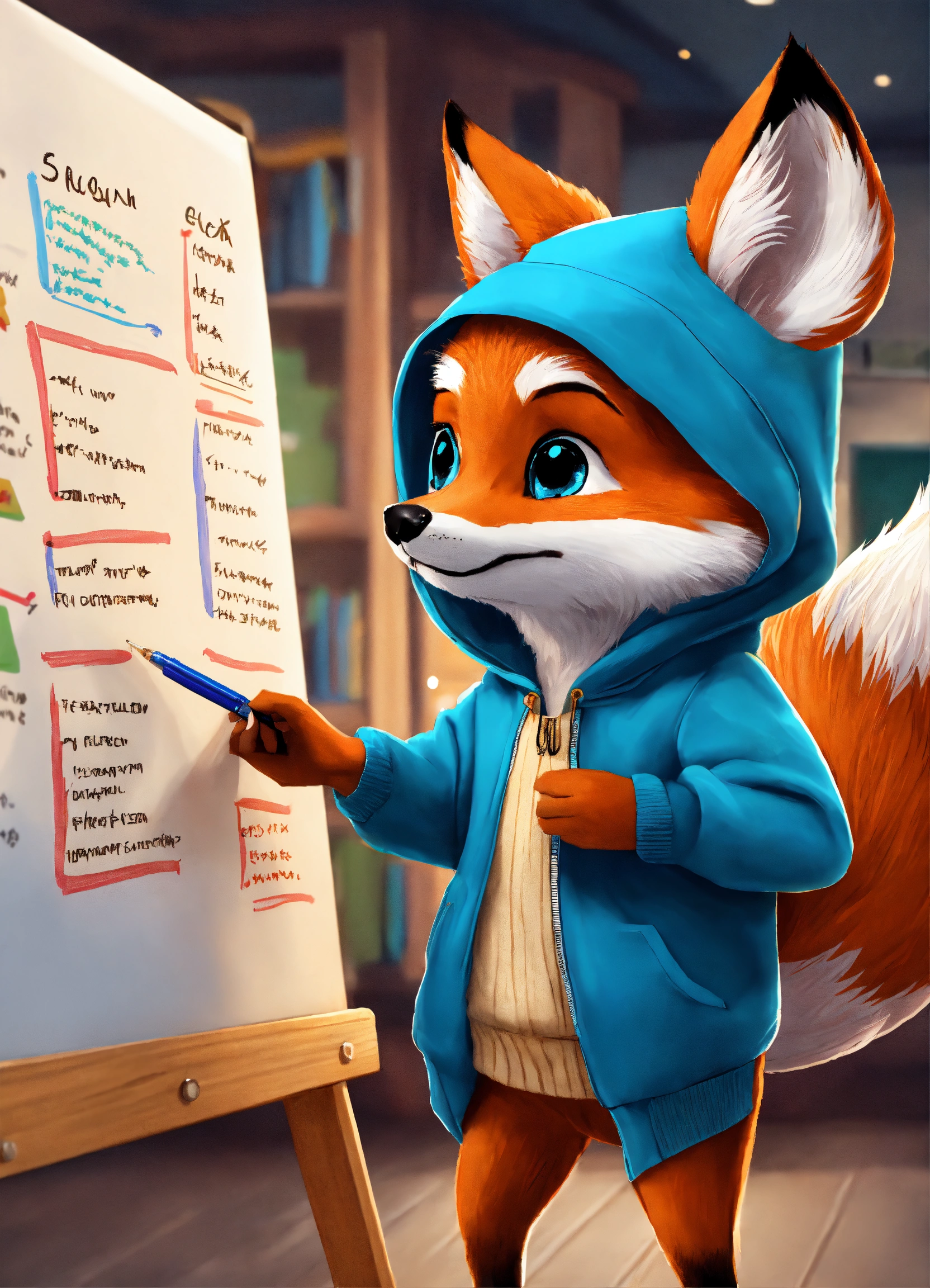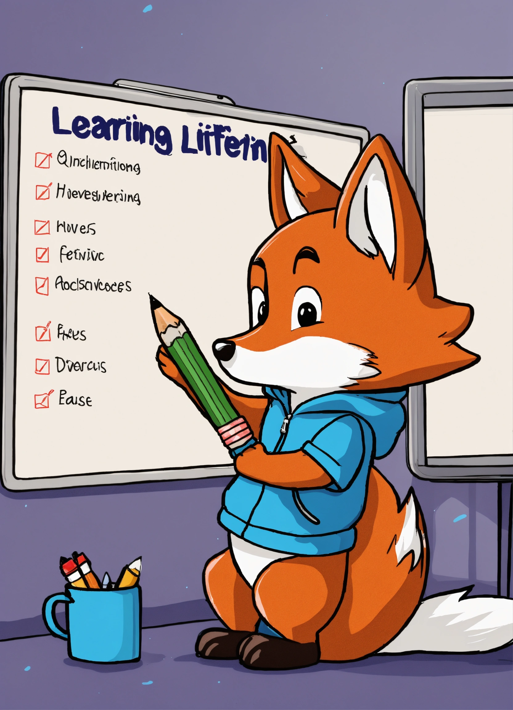 A cute fox in a blue hoodie writing learning objectives on a whiteboard