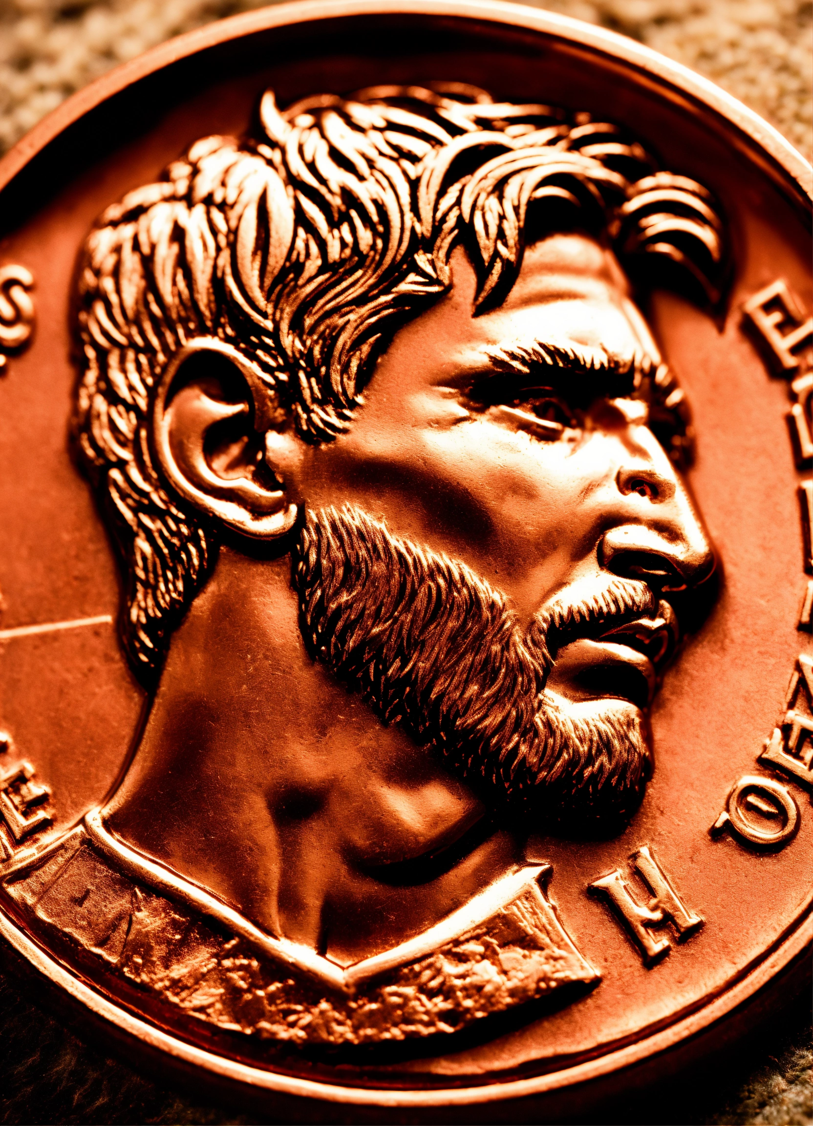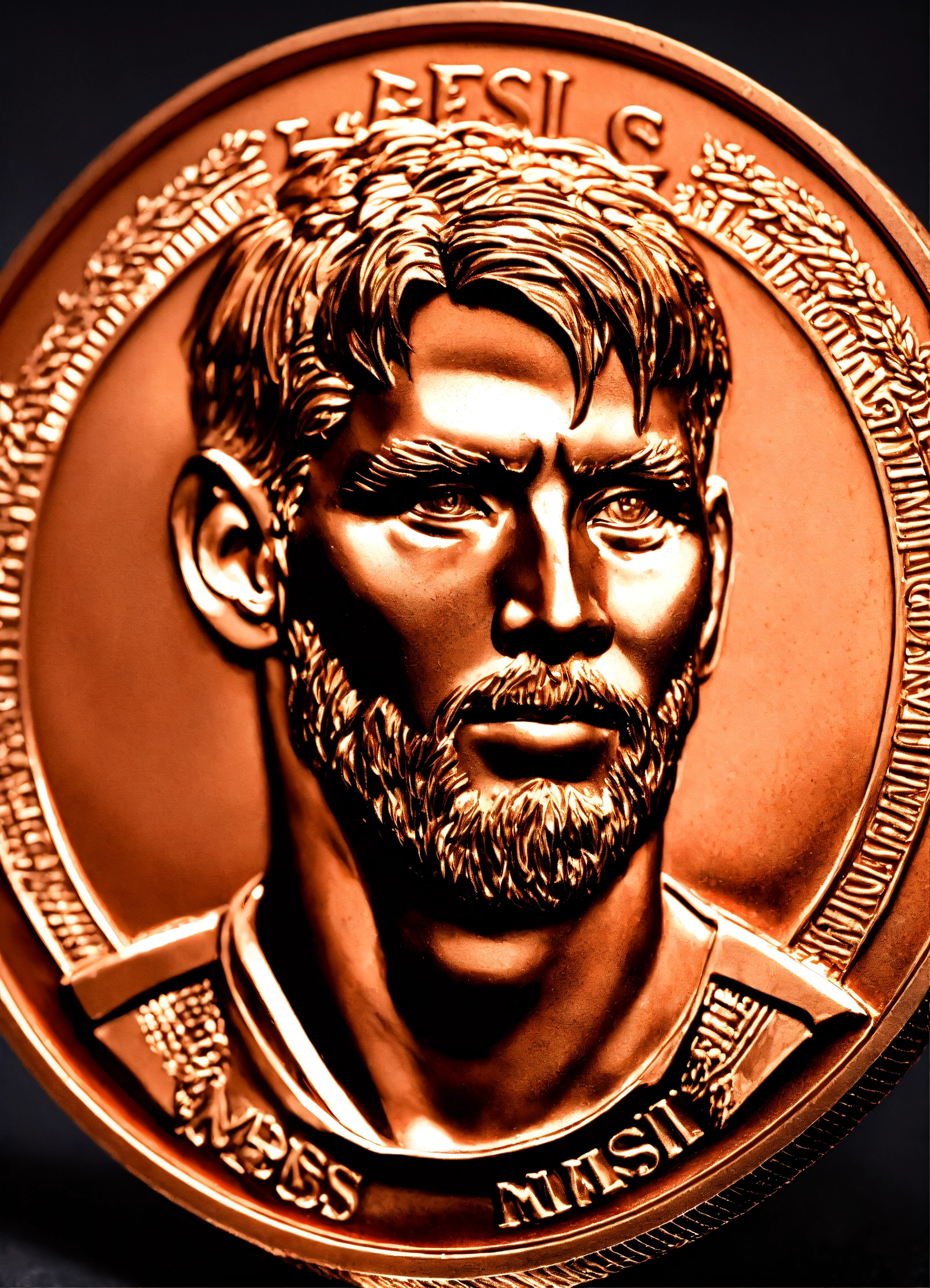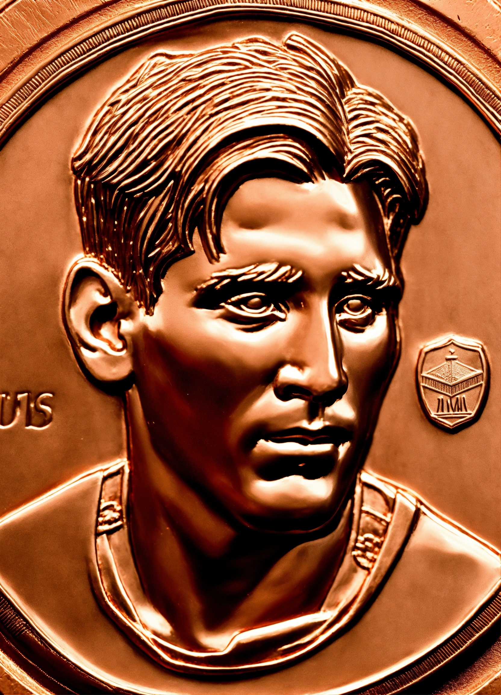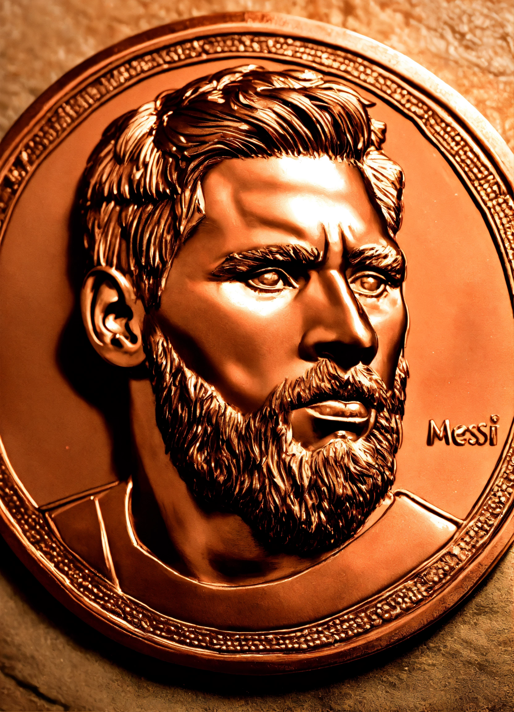 Portrait of a football player messi profile in bas-relief on a highly detailed collectible copper coin