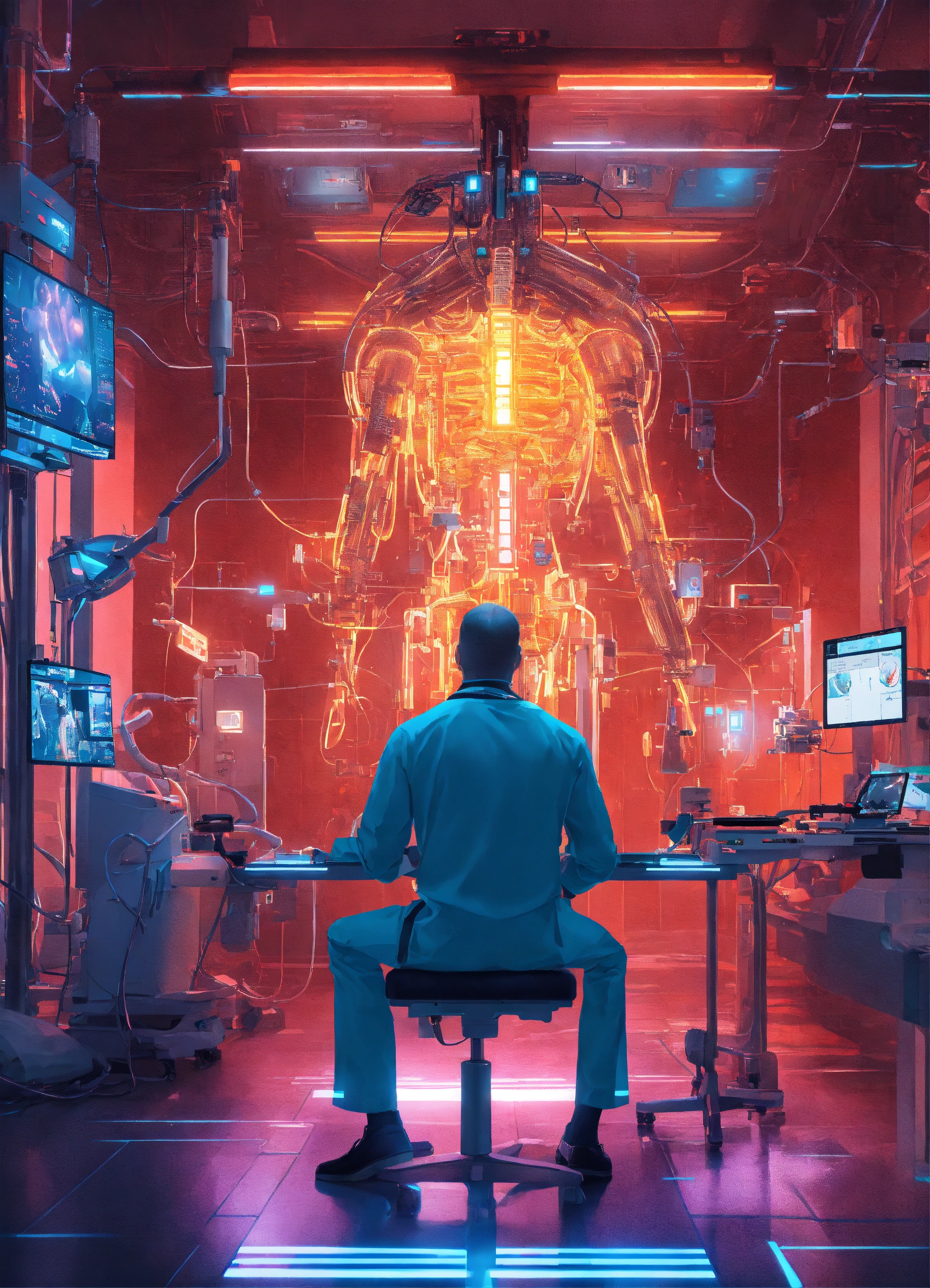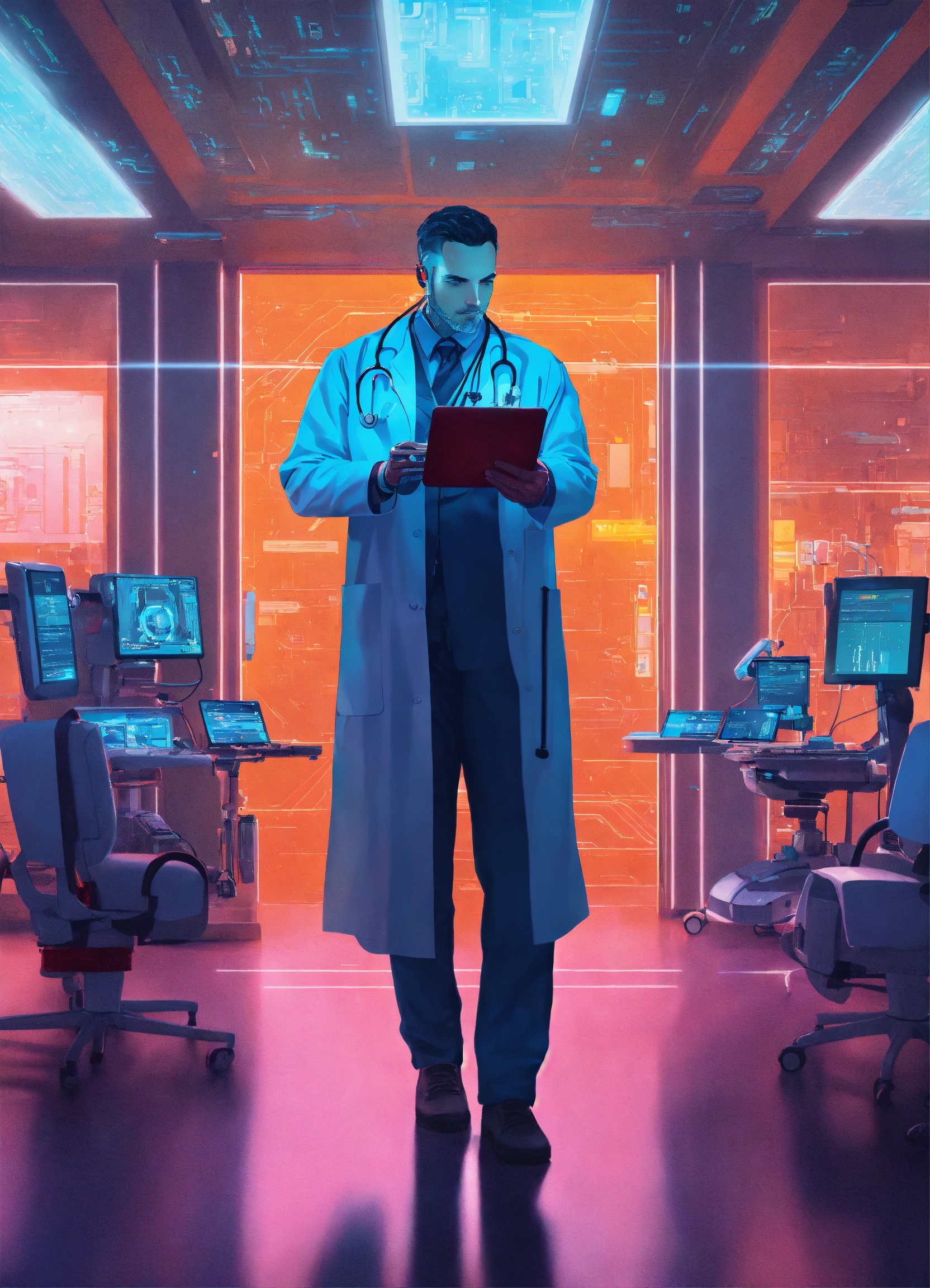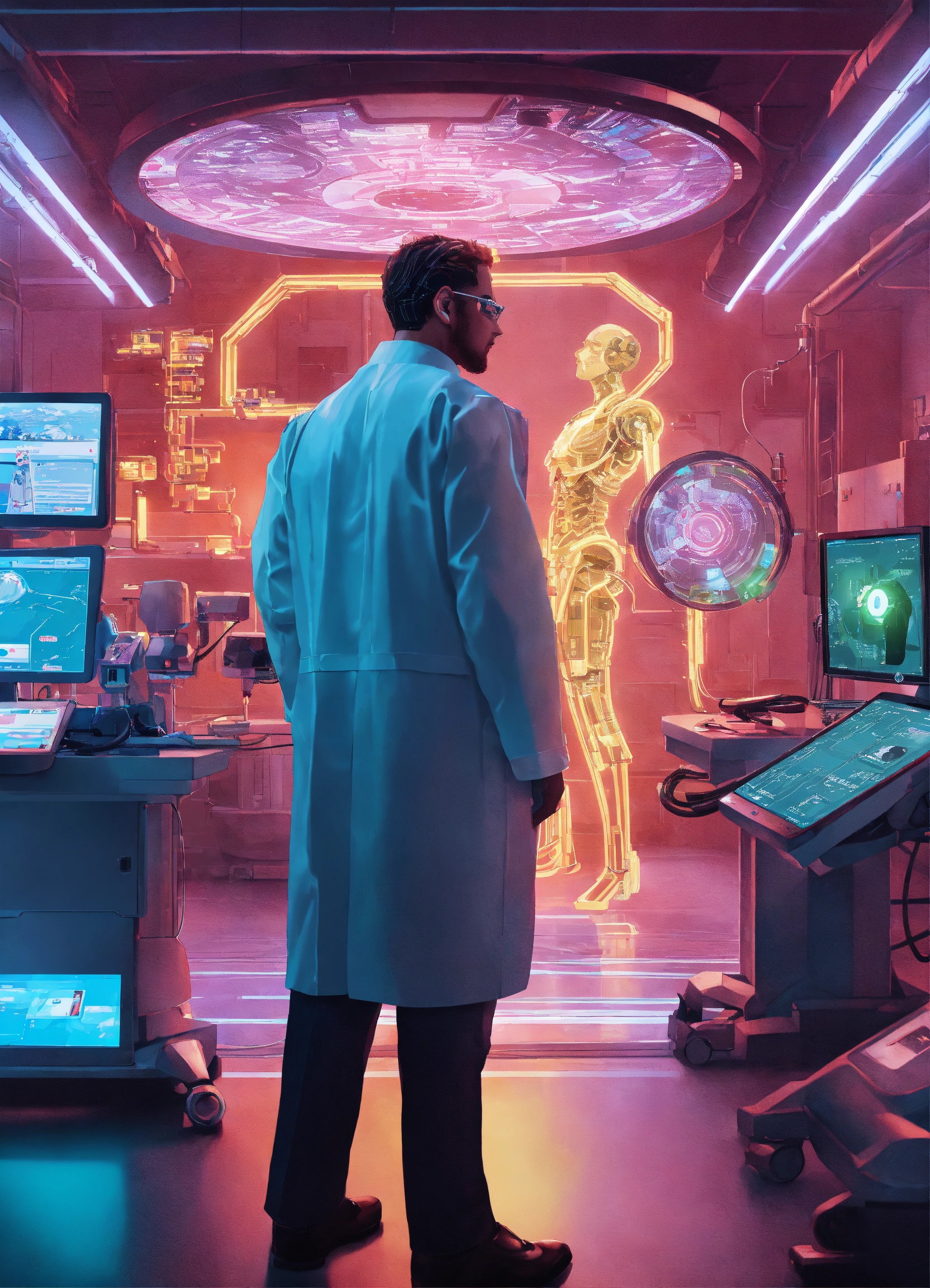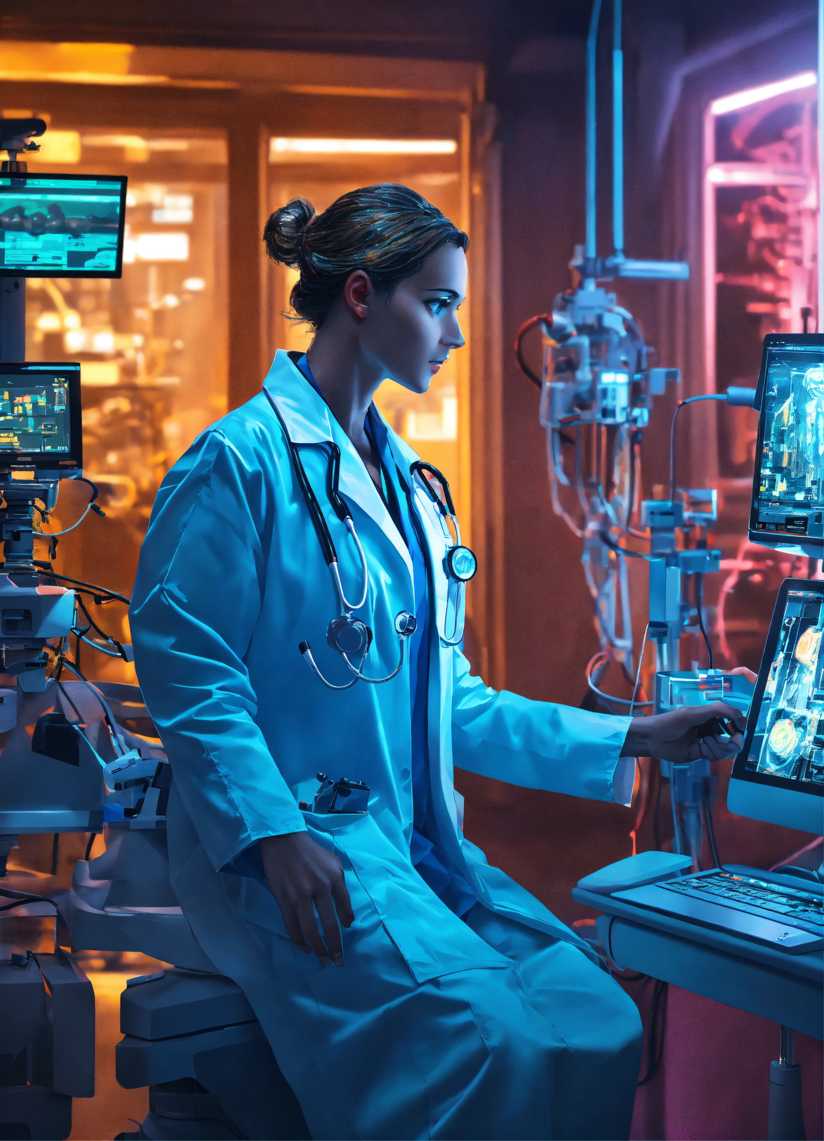 Create an image depicting a doctor in a modern hospital, surrounded by cutting-edge artificial intelligence technologies that enhance healthcare. show the doctor using ai-powered diagnostic tools, robotic assistants, and advanced data analytics to provide personalized and efficient medical care. capture the futuristic atmosphere of ai-driven healthcare innovations in the scene cyberpunk, blade runner, neons, future
