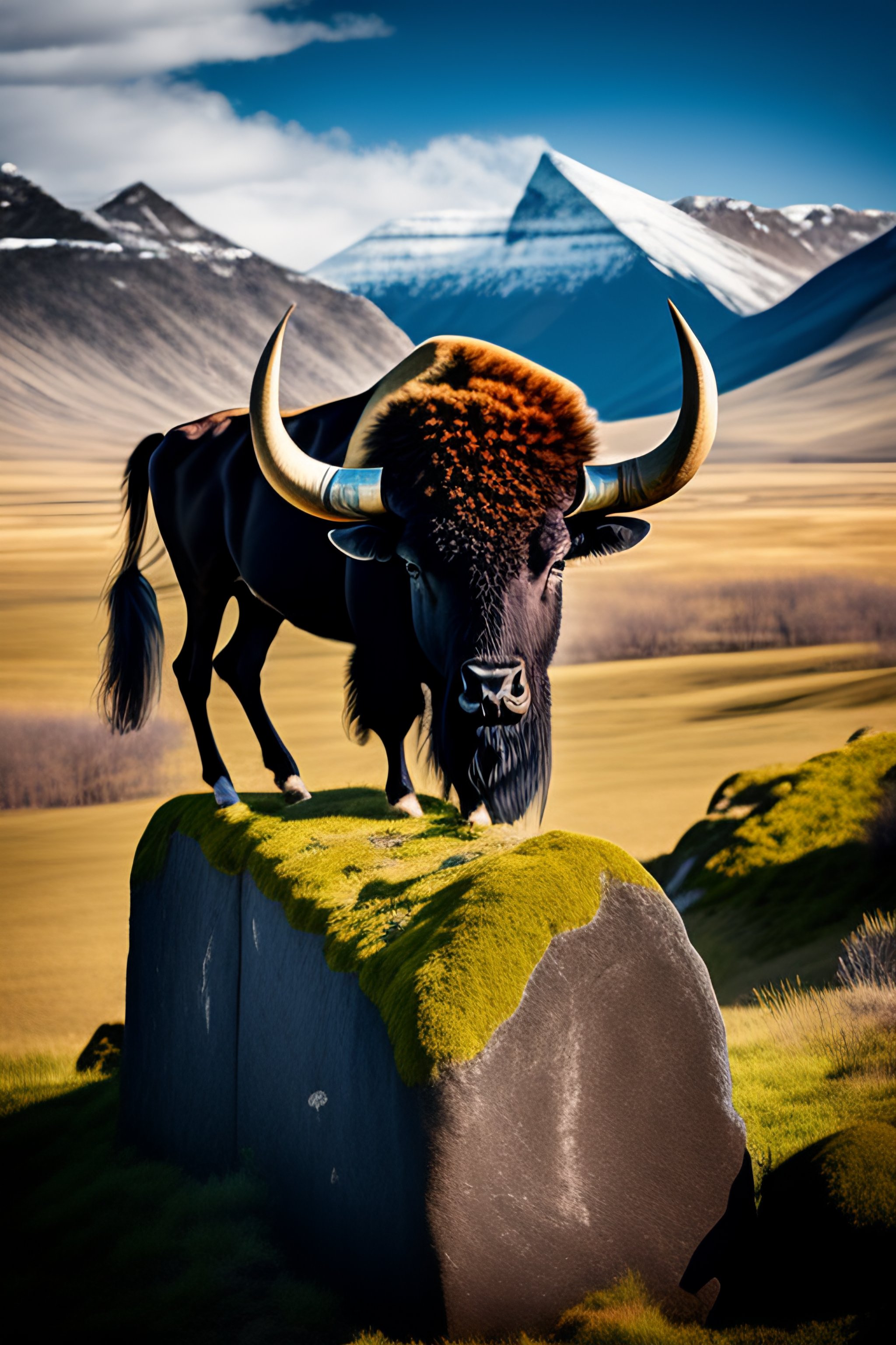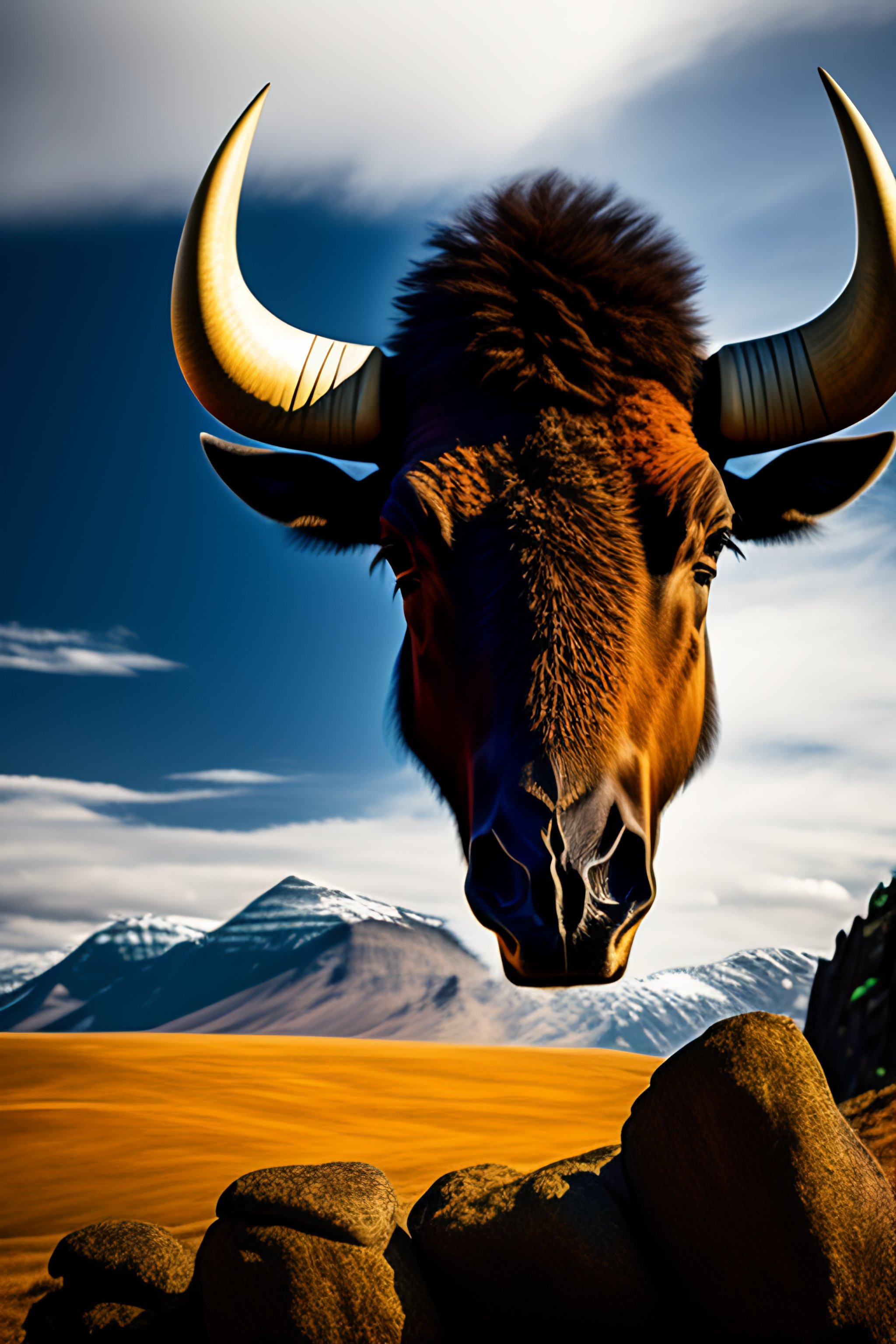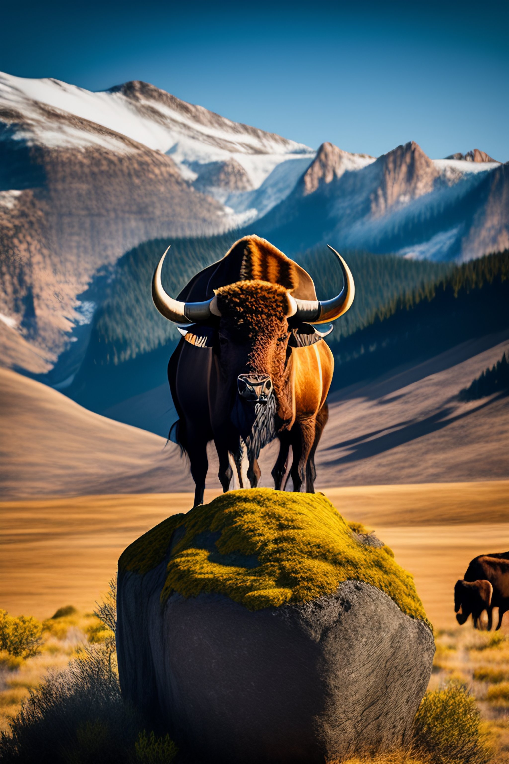 Bison skull with a rocky mountain scene on it. the skull should be hanging on a greyed, weathered, wooden fence post with rusty barbed wire wrapped around the post.