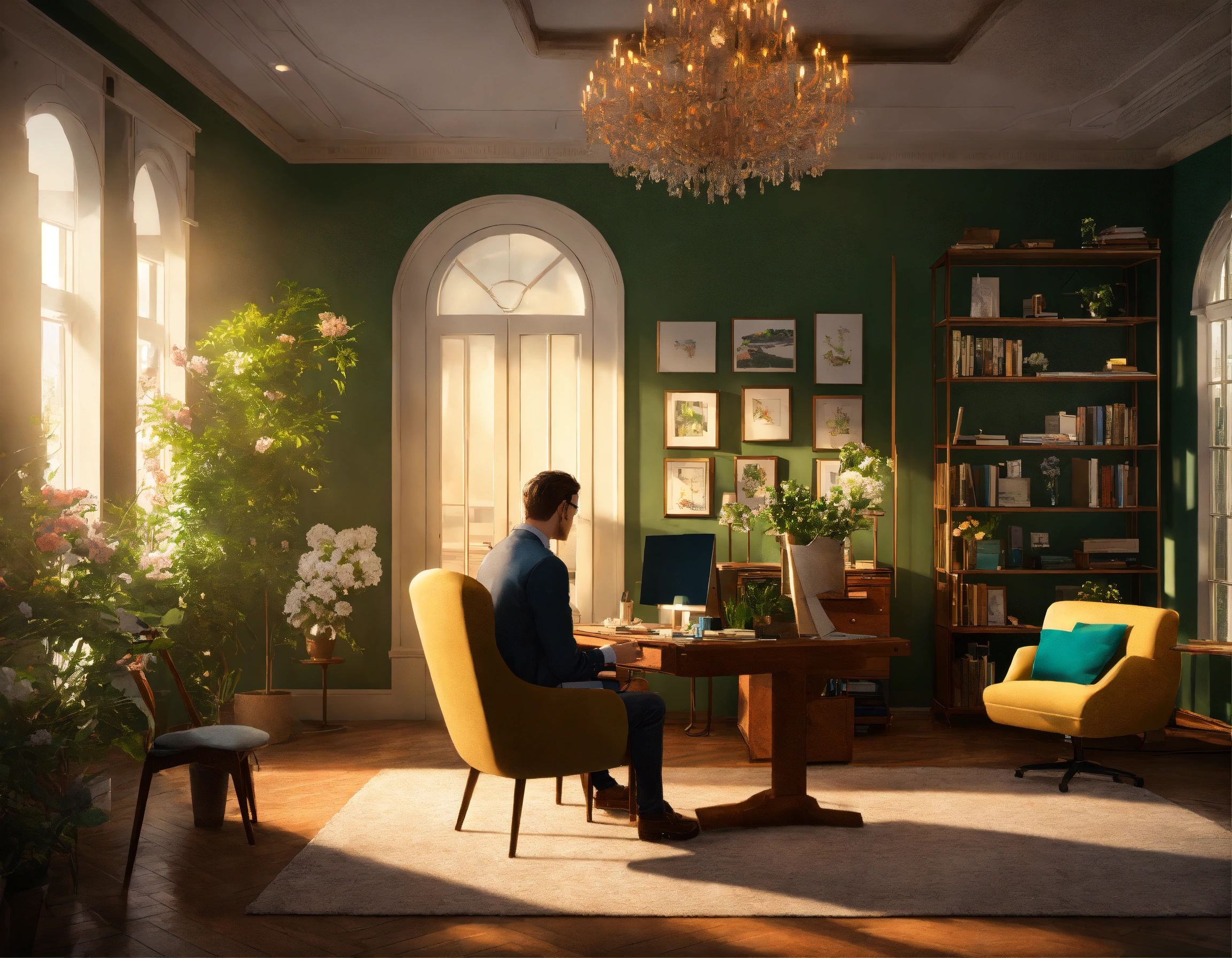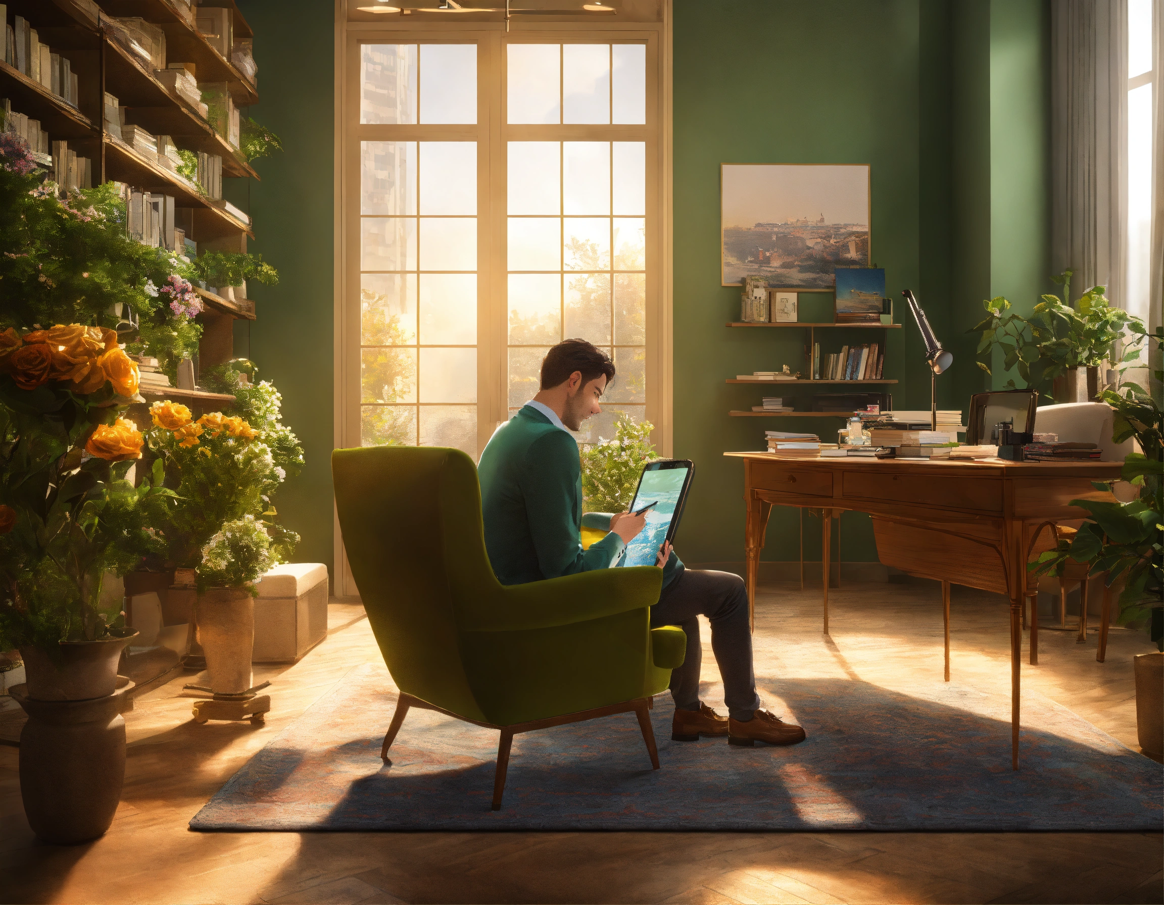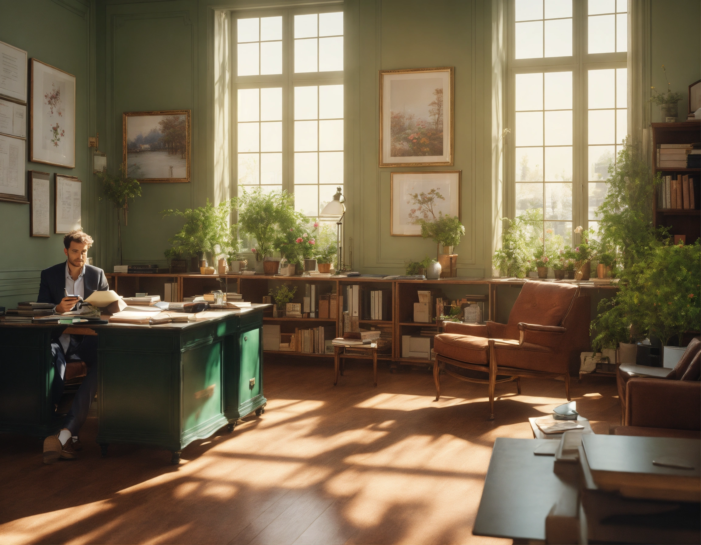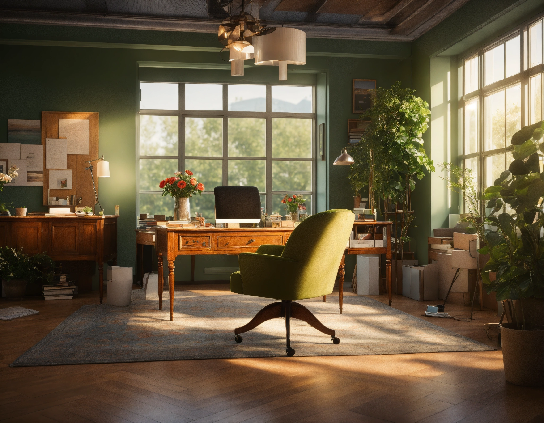 Several people are studying a beautiful office, books, flowers in the background, there is an armchair. one person is photographing a room with a phone, the second person has climbed onto a chair and is looking at what is behind him. beautiful regular facial features. clear detail, soft light, realistic photo, high quality. the correct proportions of the human body. 4k. daylight, the office is large, beautiful, the chair is green. people are different.