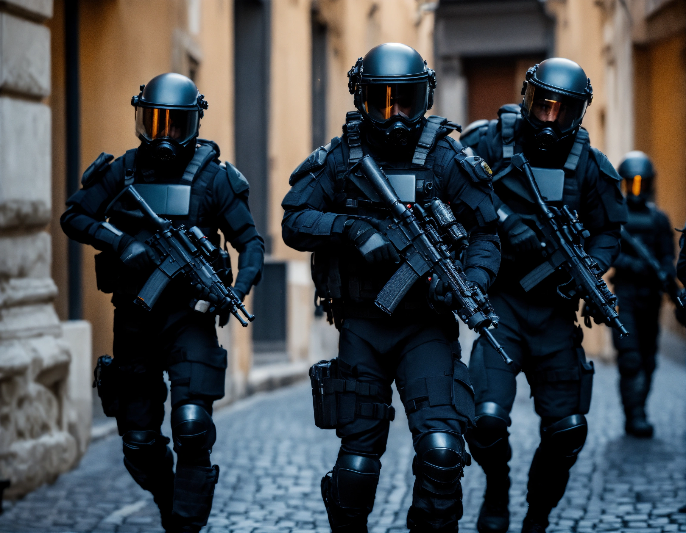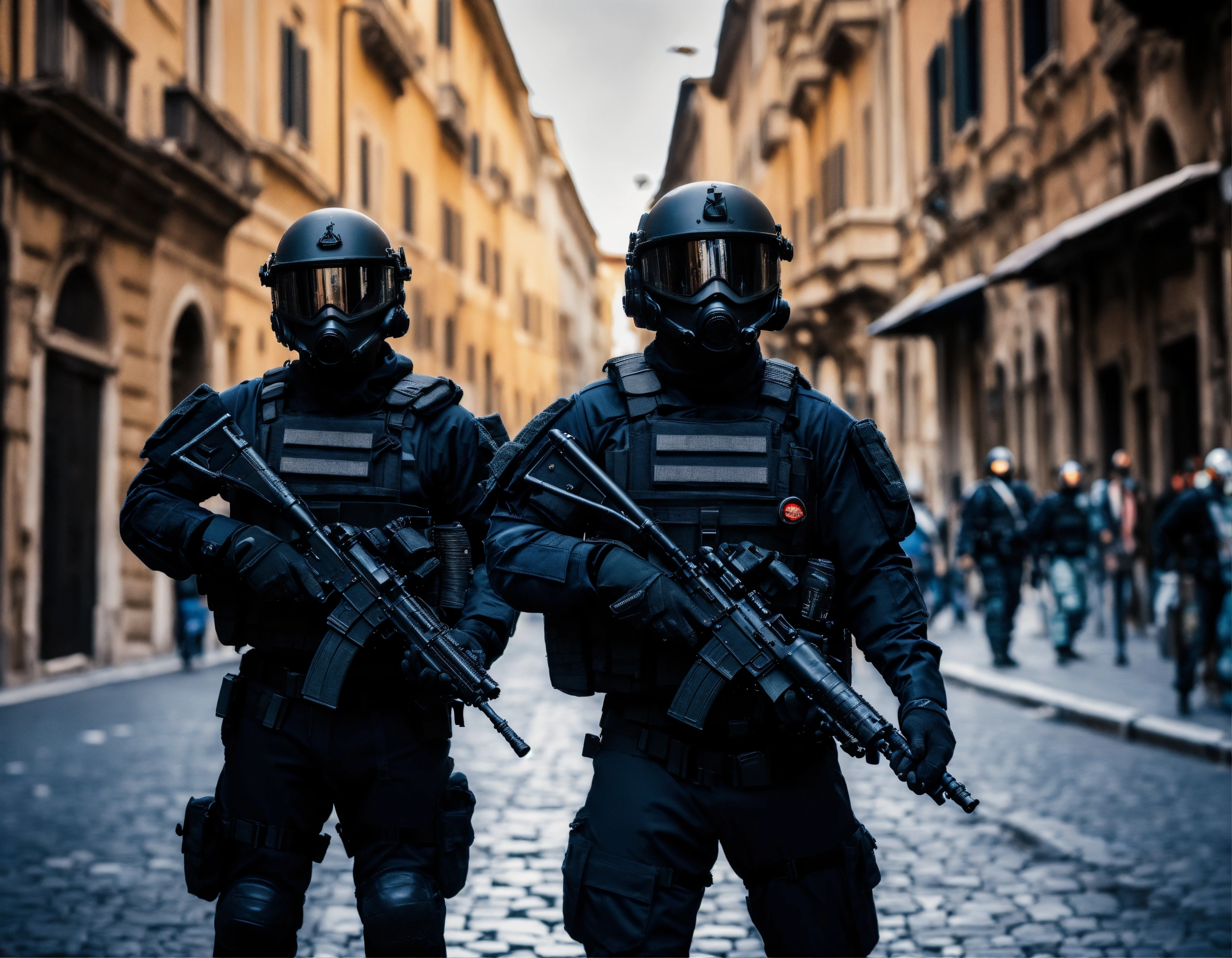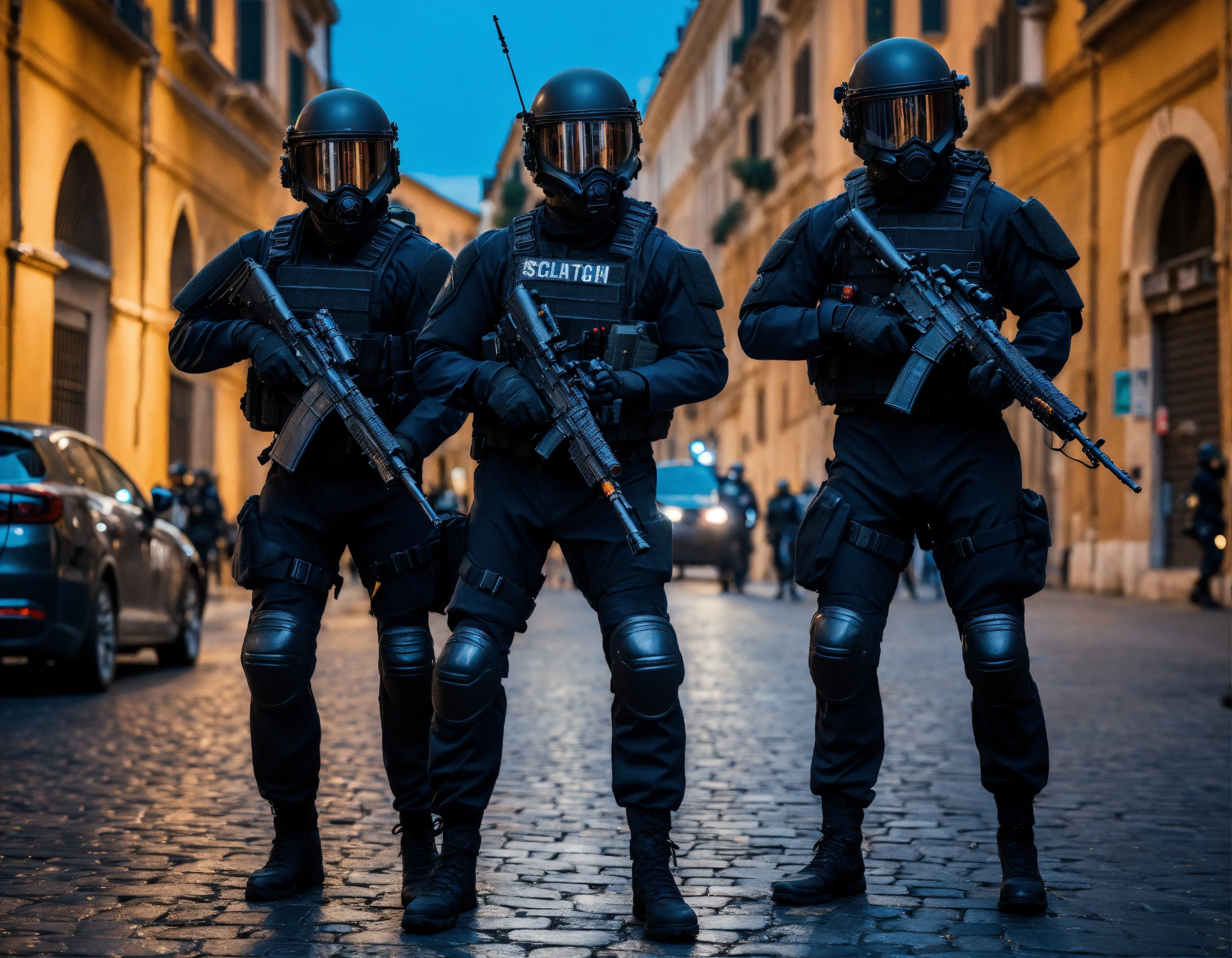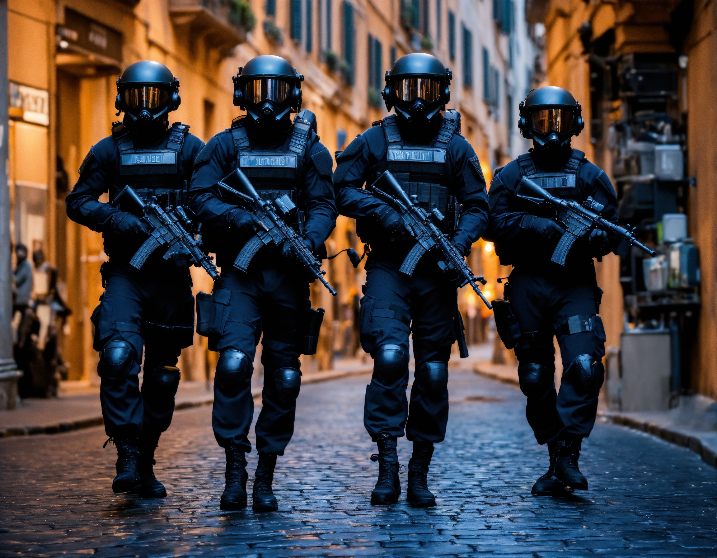 A highly realistic photo of three soldiers wearing a black sci-fi tactic suit, with a black helmet, face covered, with electric batons. in a large street in rome, hyperrealistic, hyperdetailed, 8k.