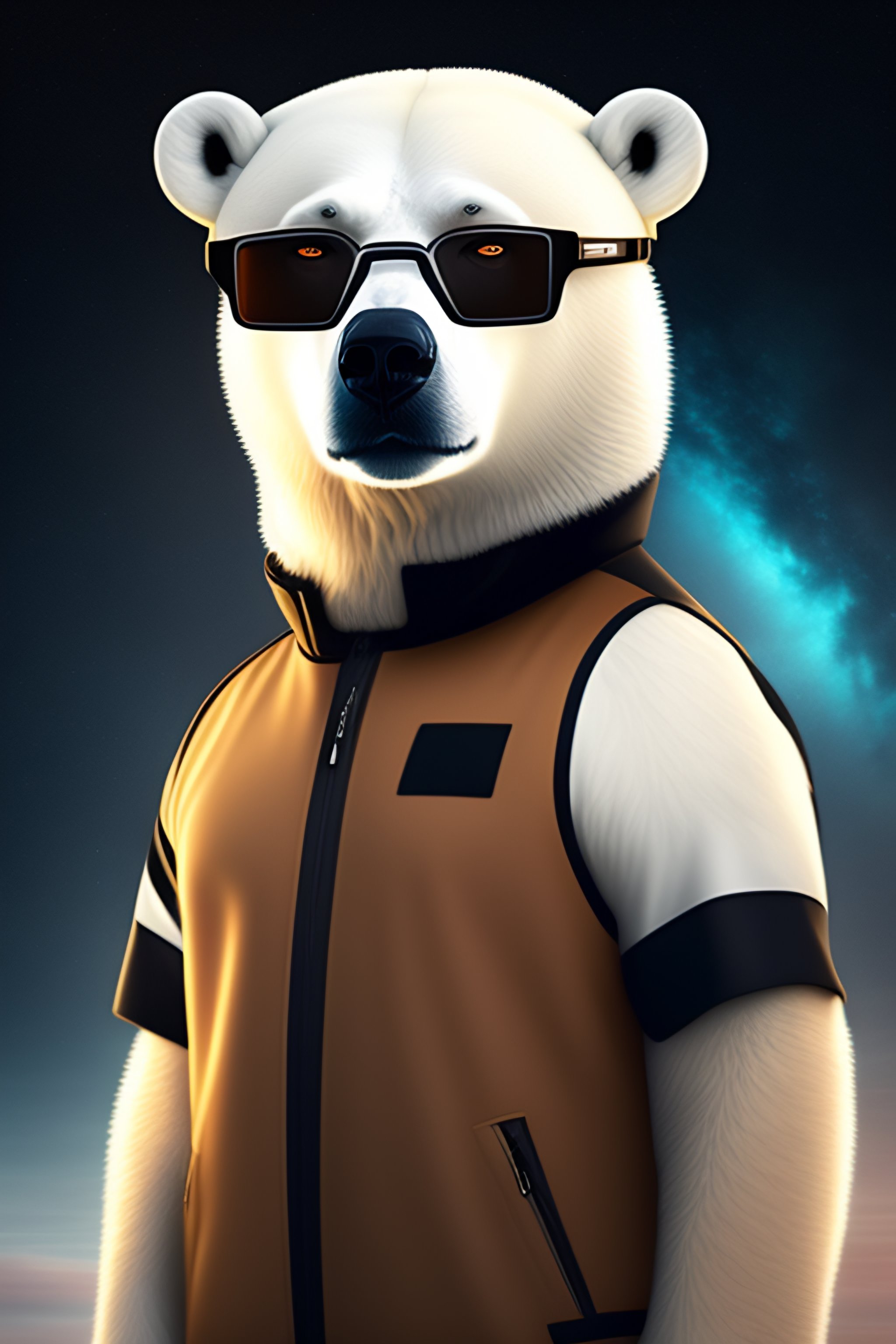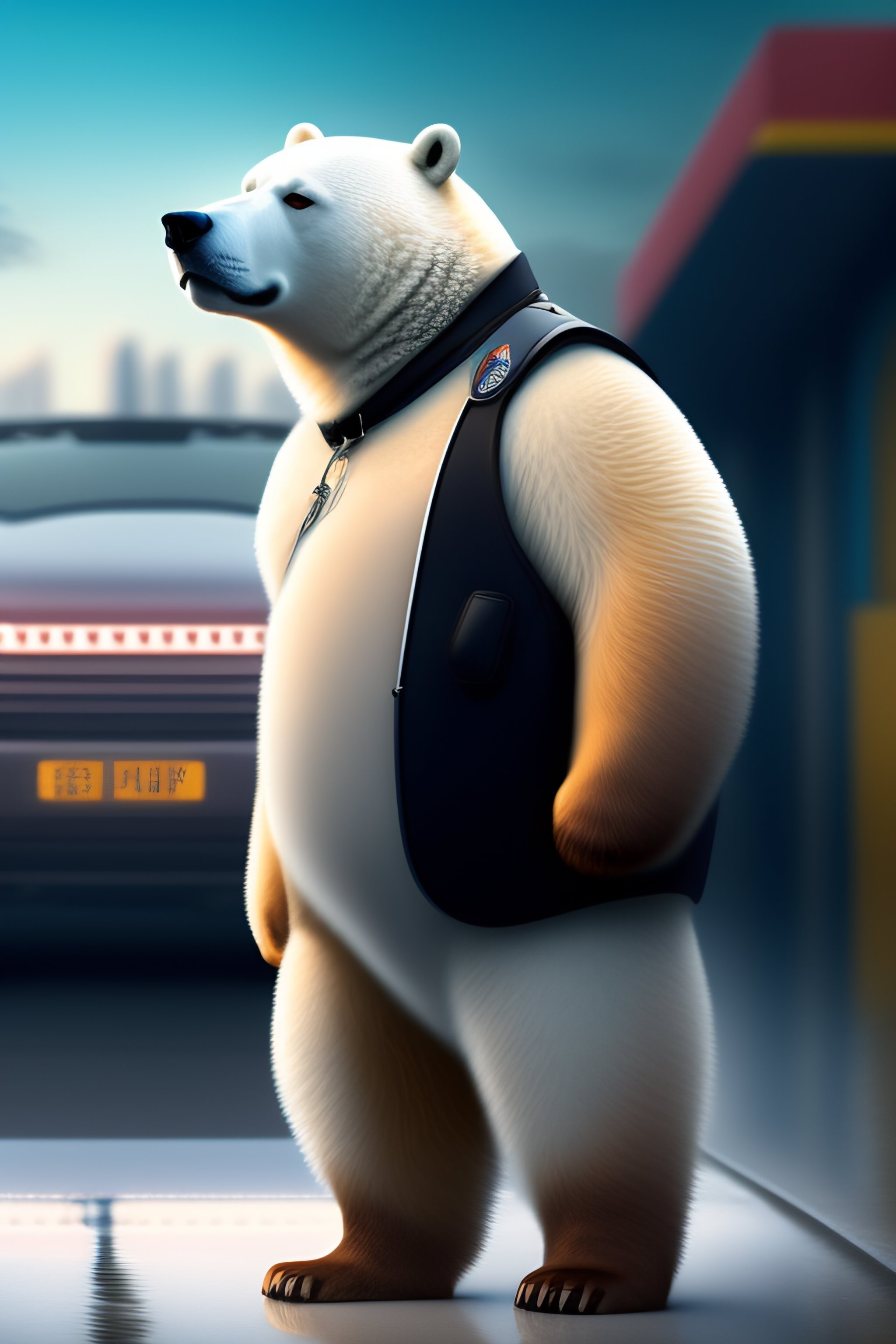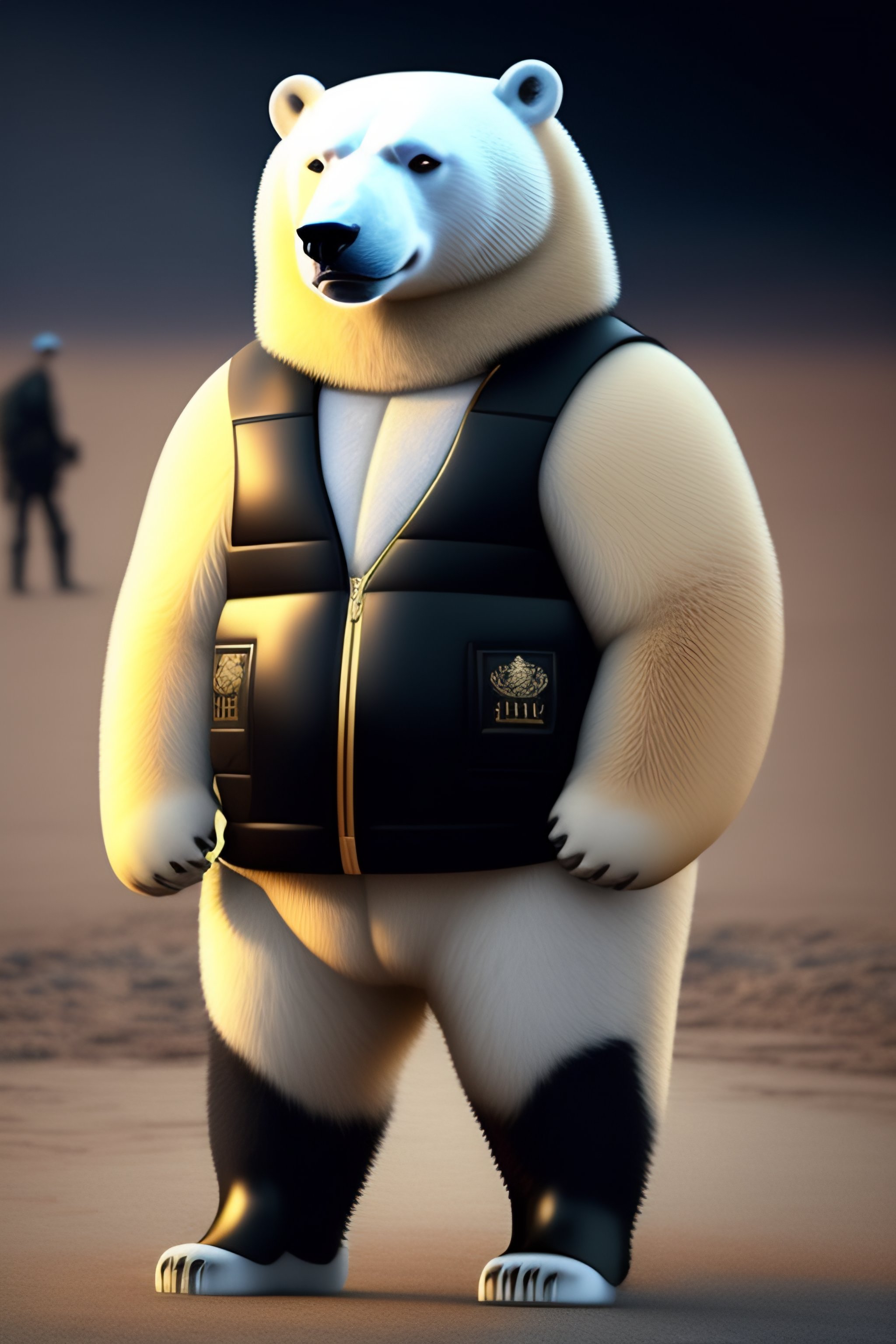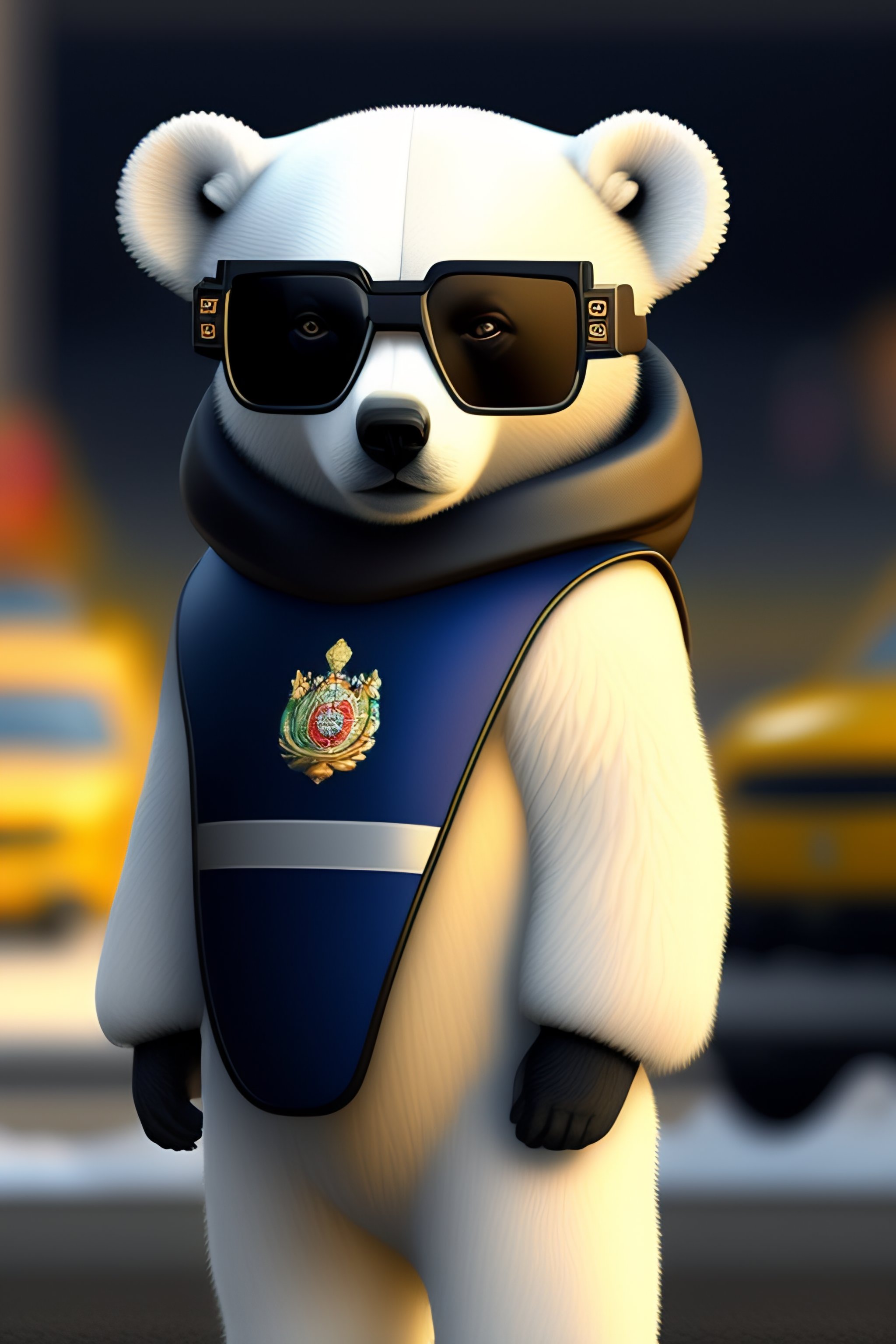 An anthropomorphic polar bear in a colombian police suit and black glasses