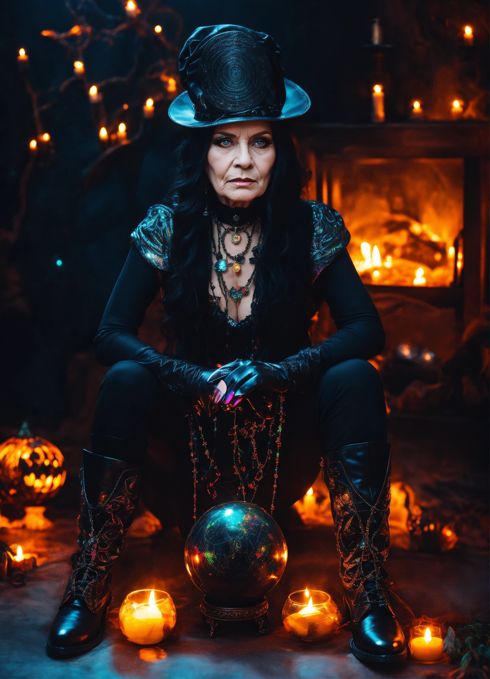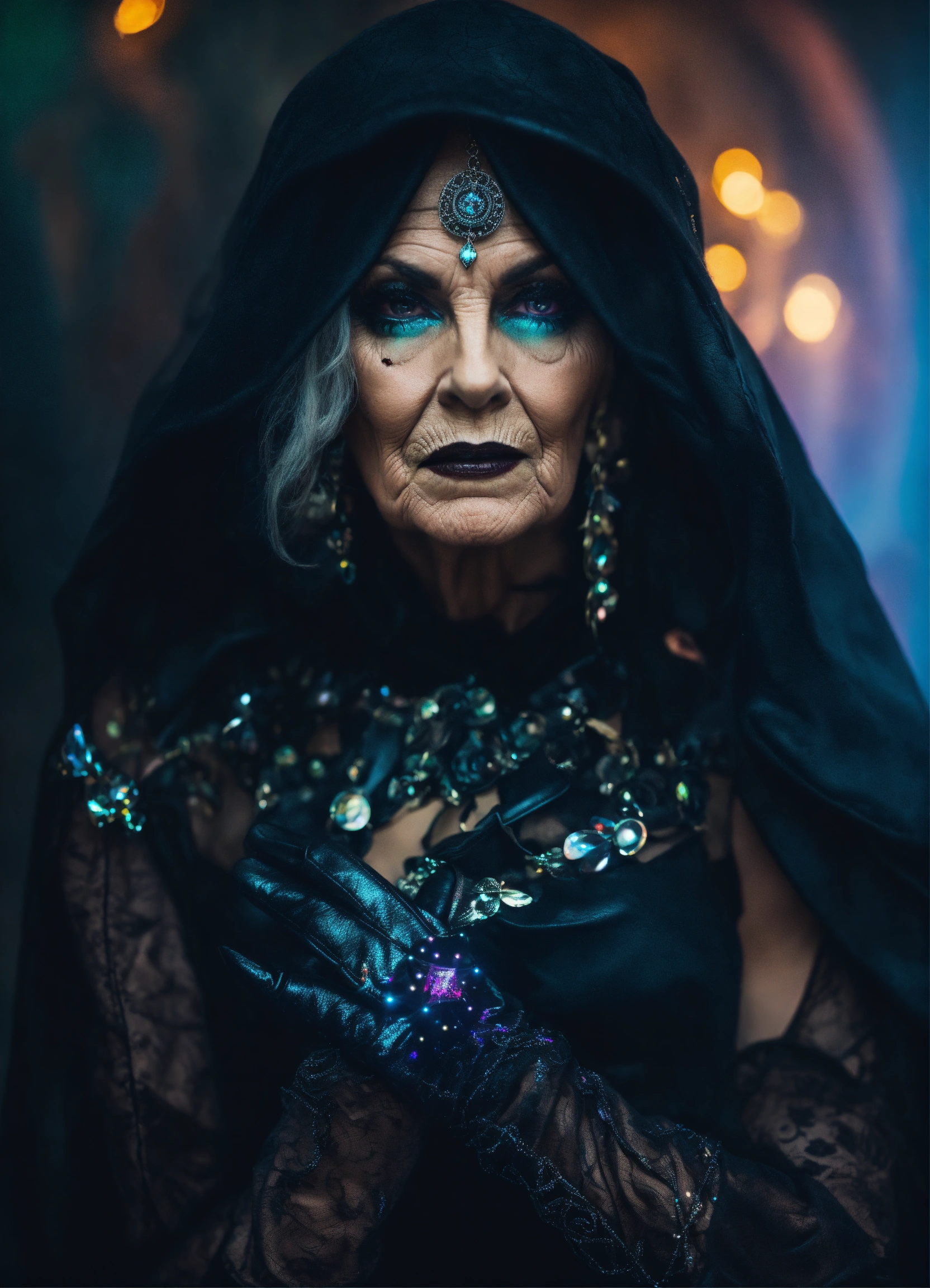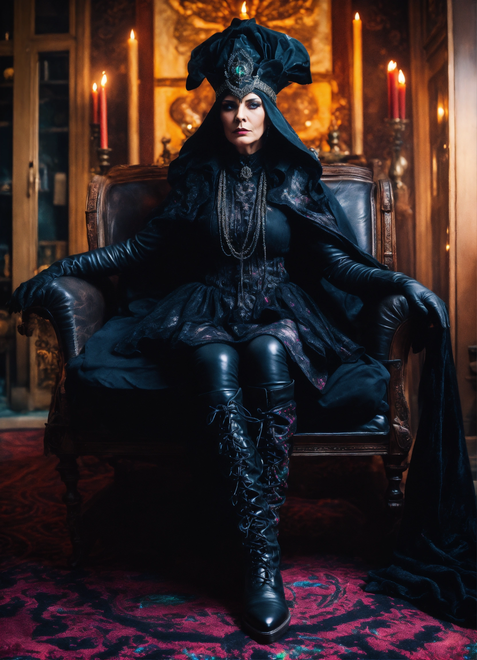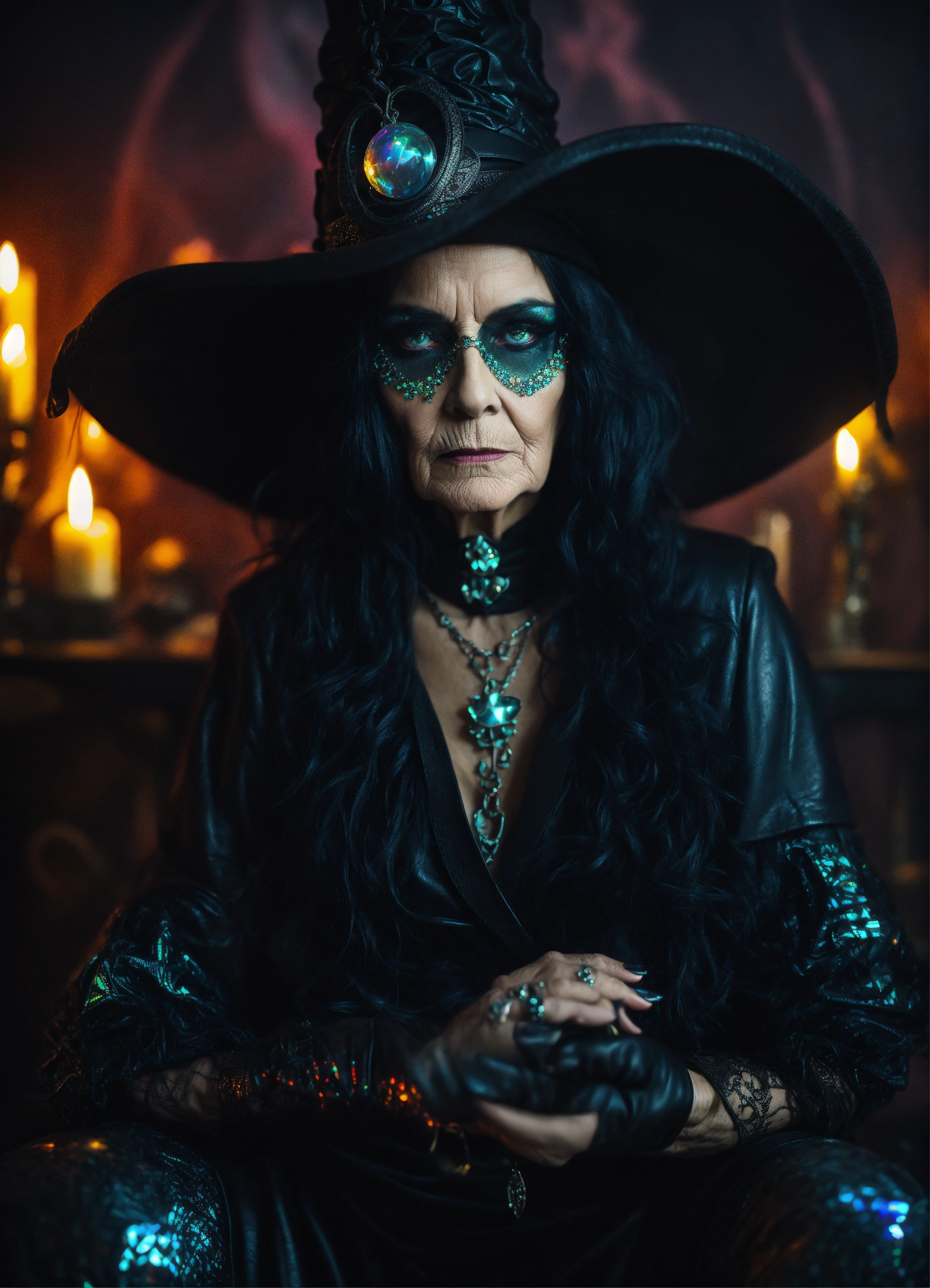 Hypnotic powerful bewitching captivating grandmother occult "black magic" wicked sorceress wearing holographic black leather boots & gloves with evil deep spellbinding doom gaze eyes, hypnotizing with her fingers