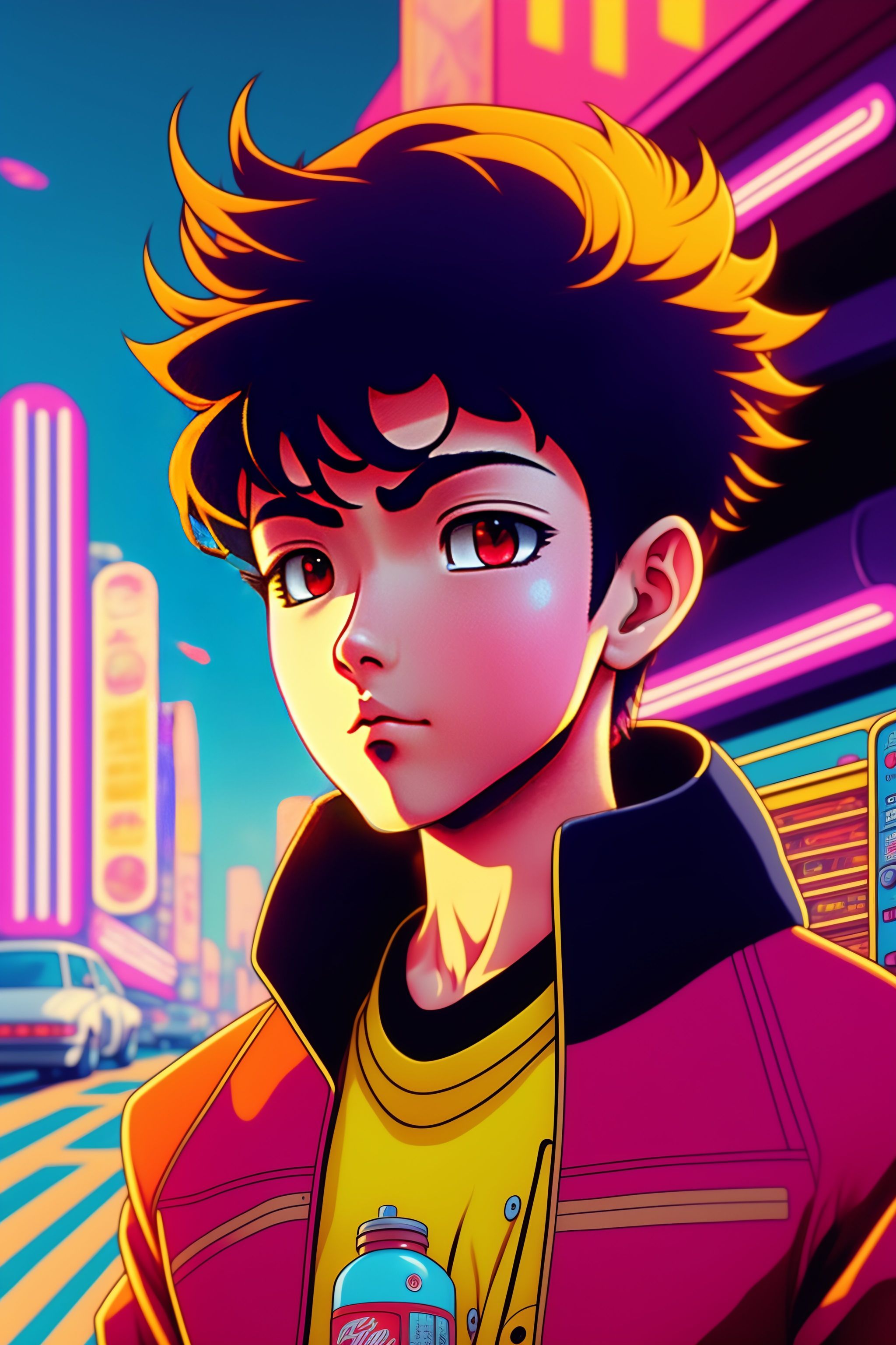 Boy in the style of 90's vintage anime, surrealism, akira style. detailed line art. fine details. inside a 7/11 convenience store. drink aisle. neon.