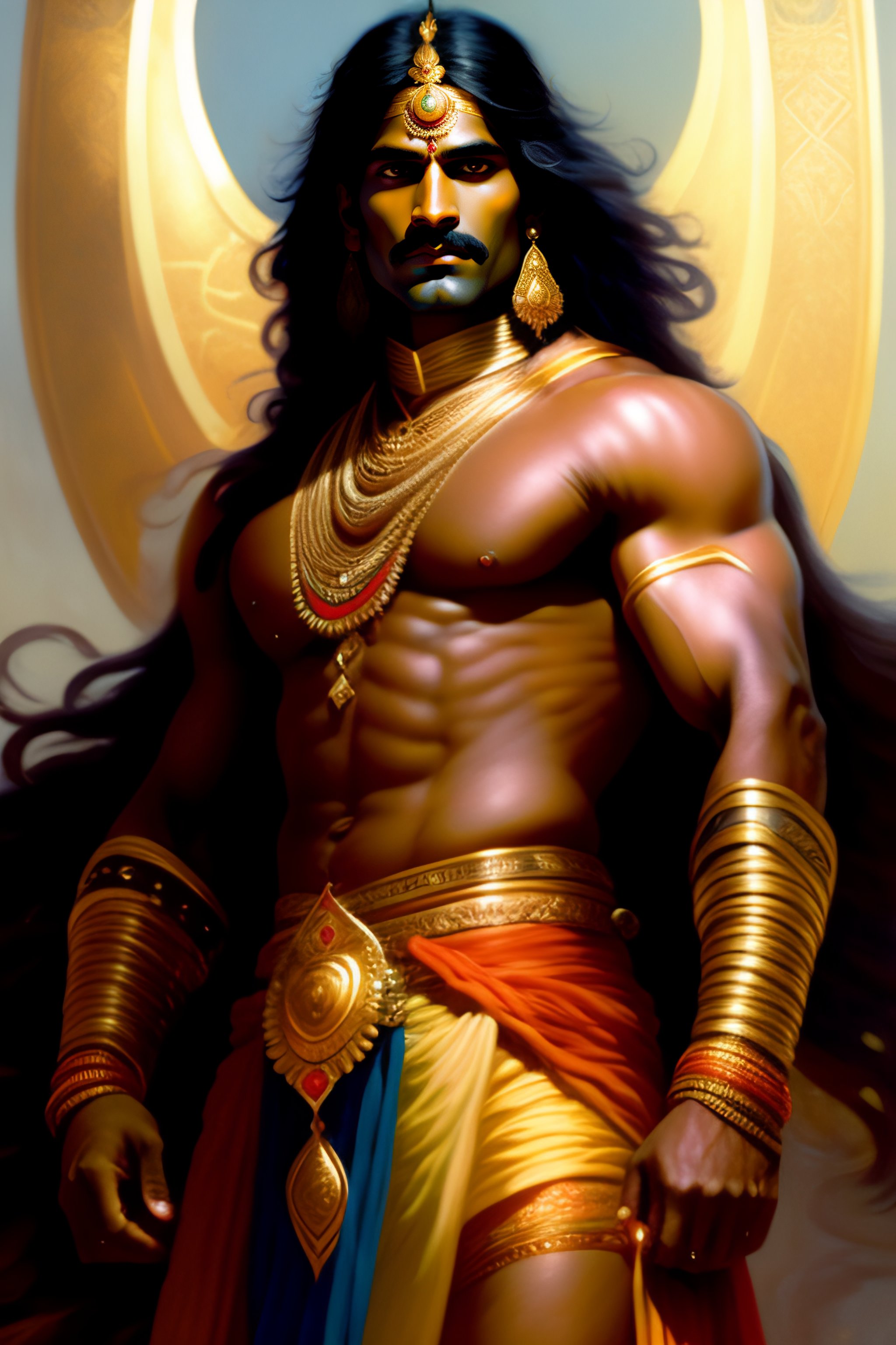 Foll body potrait of mahabharata( indian epic) character arjuna was known as for handsome appearance and was considered one of the most physically attractive characters in the epic. he was tall and well-built, with a strong and muscular physique. it is said that he was as radiant as the sun fair skin and that his arms were as thick as the trunks of small trees. arjuna was also skilled in various arts and was an accomplished warrior, known for his strength, agility, and bravery on the battlefield, art by greg rutkowski and alphonse mucha