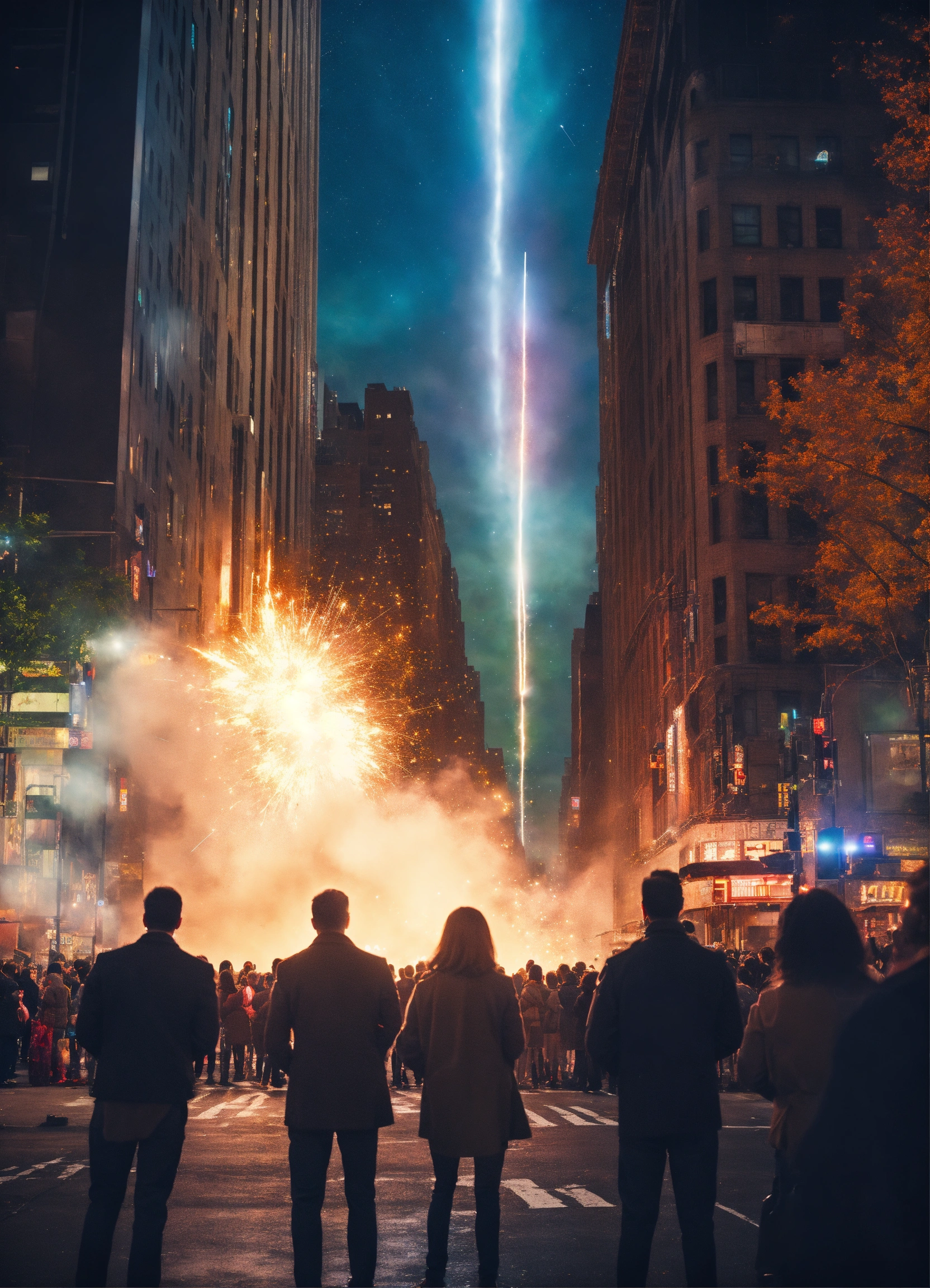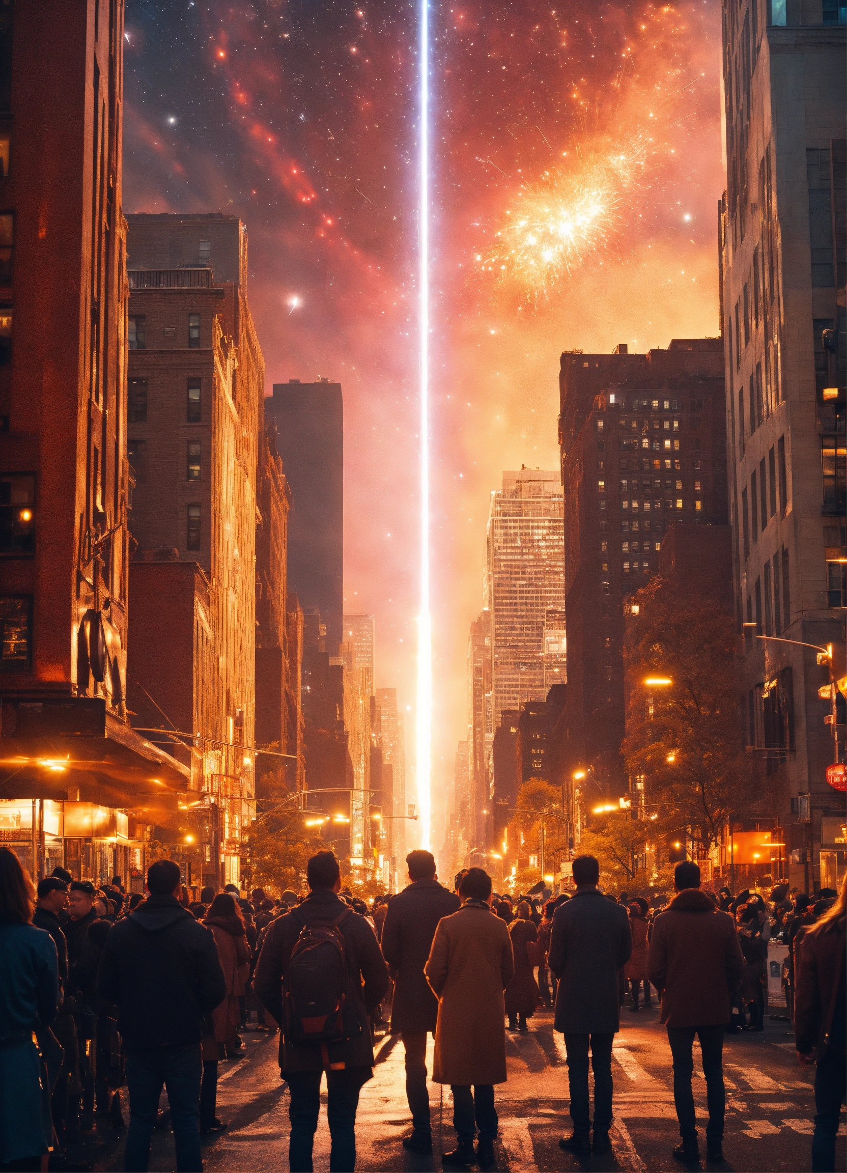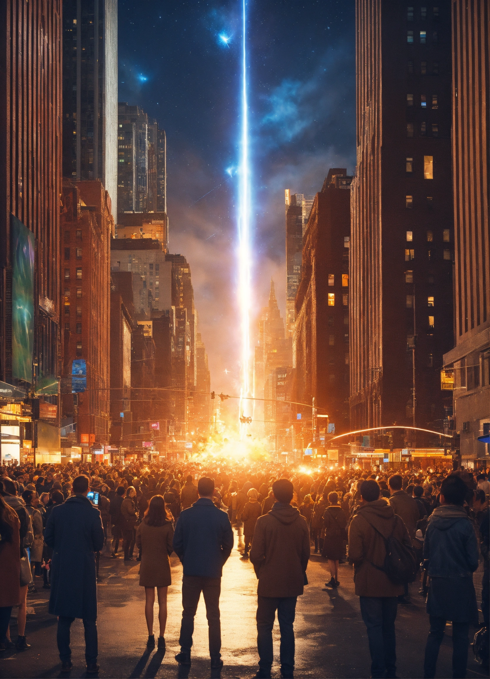 Crowd in the street of a eco futuristic new york city watching a shooting star, beam light, explosion, cinematic
