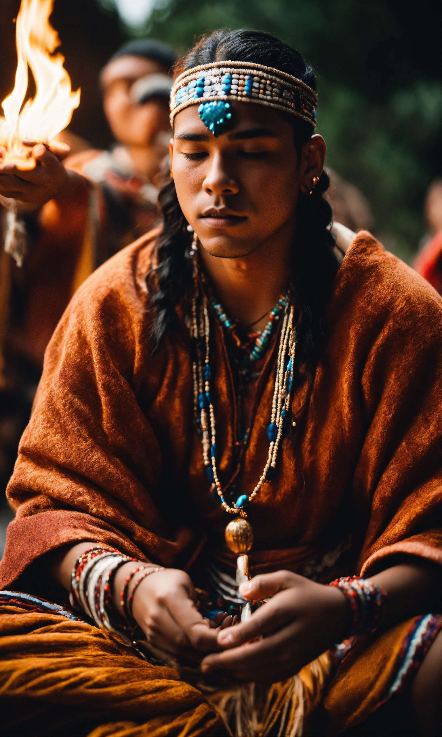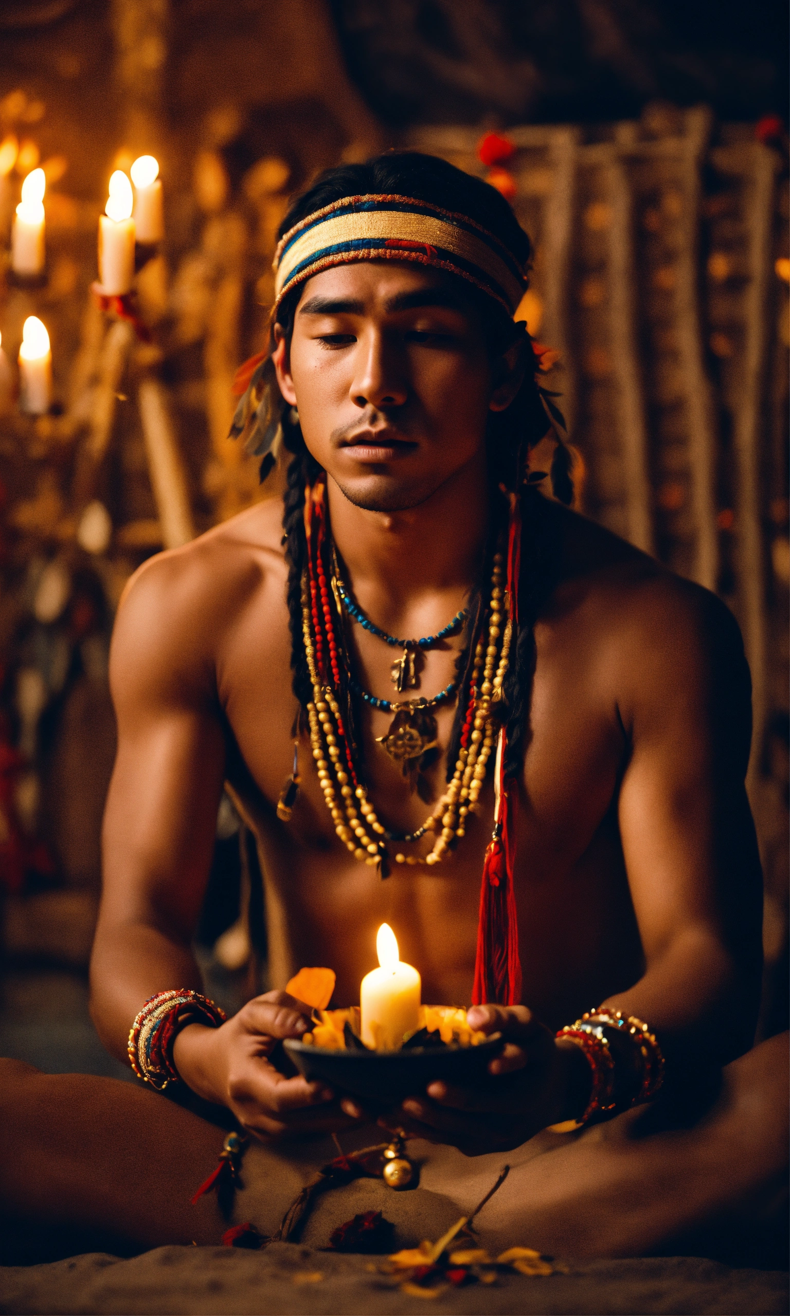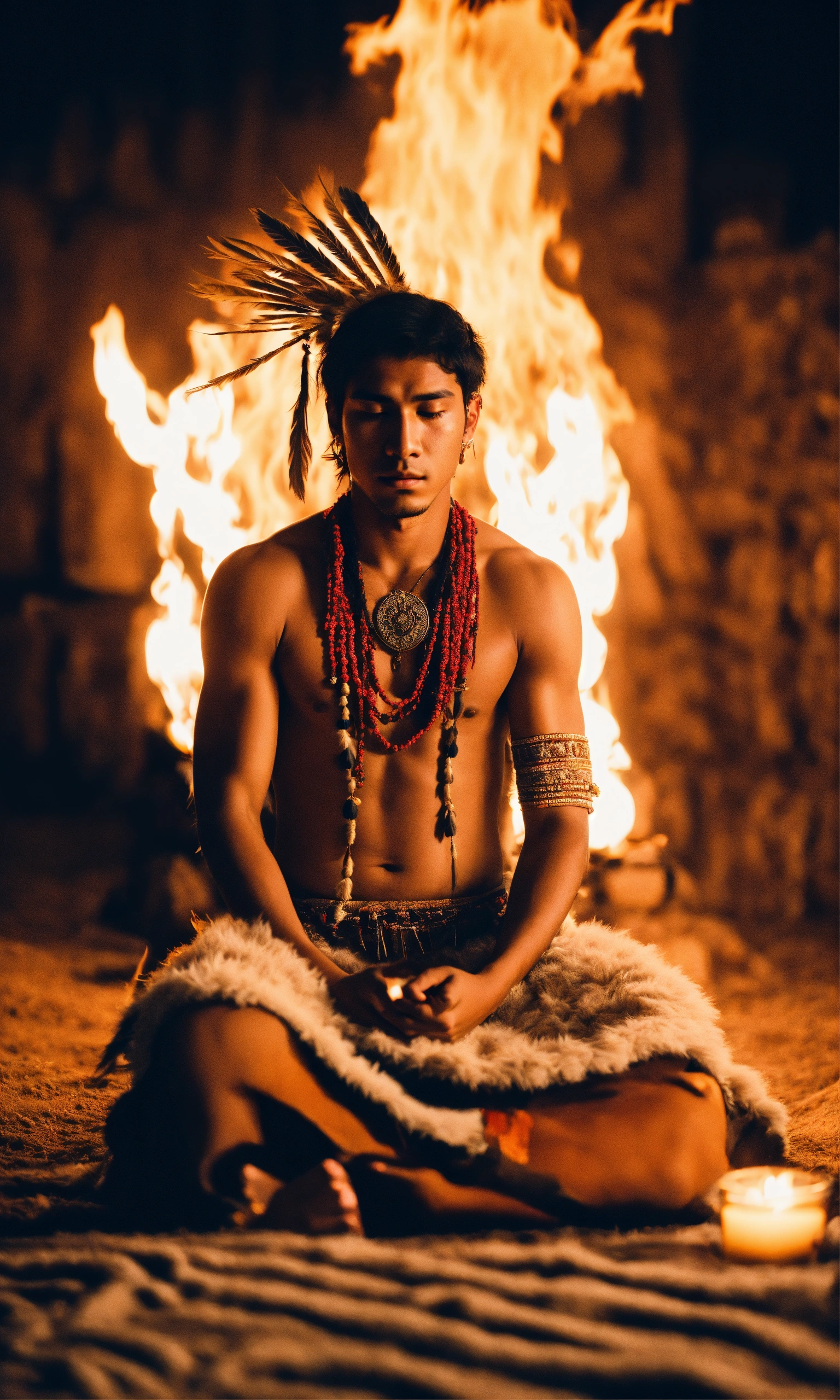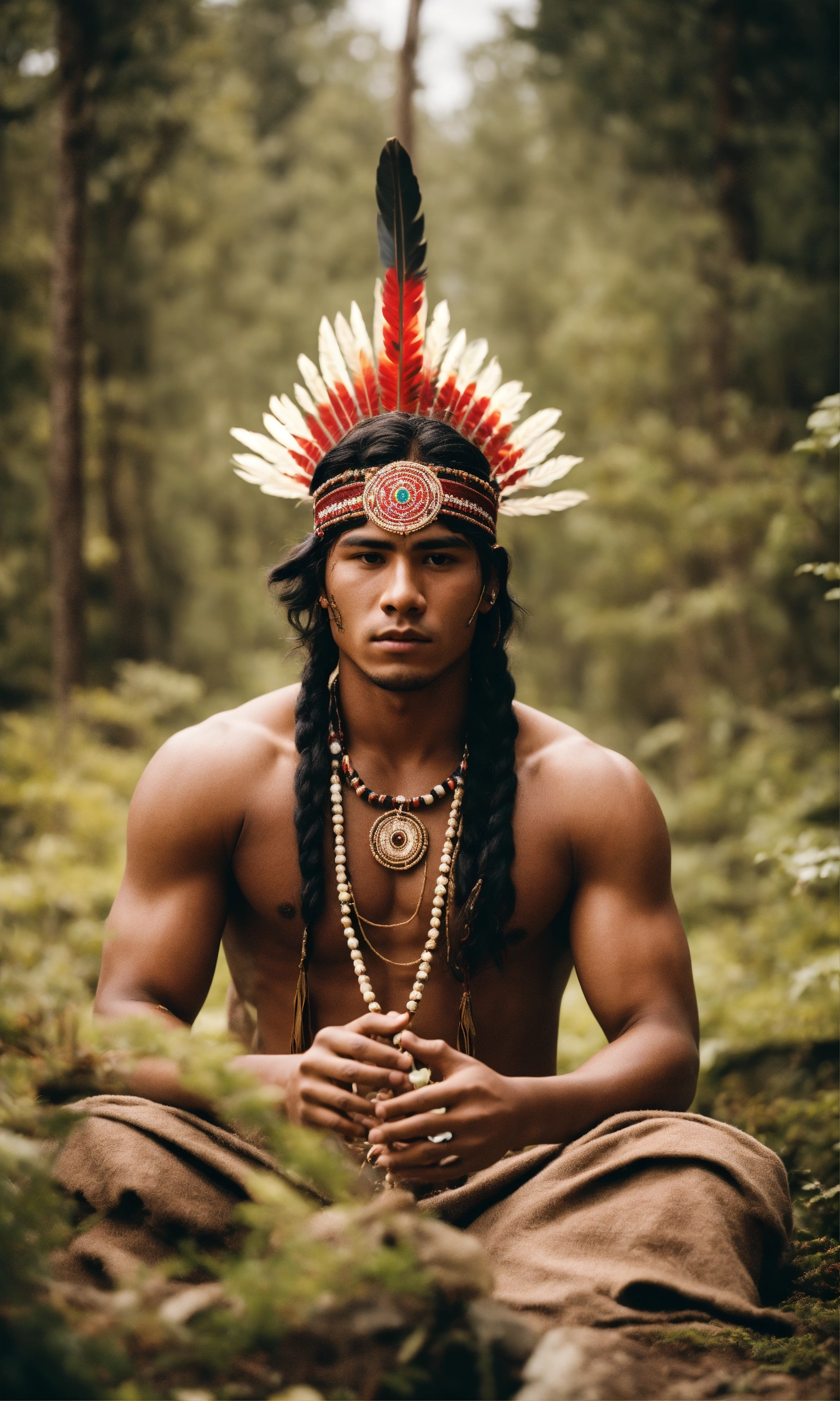Cinematic image of indigenous young man of north america performing spiritual ritual