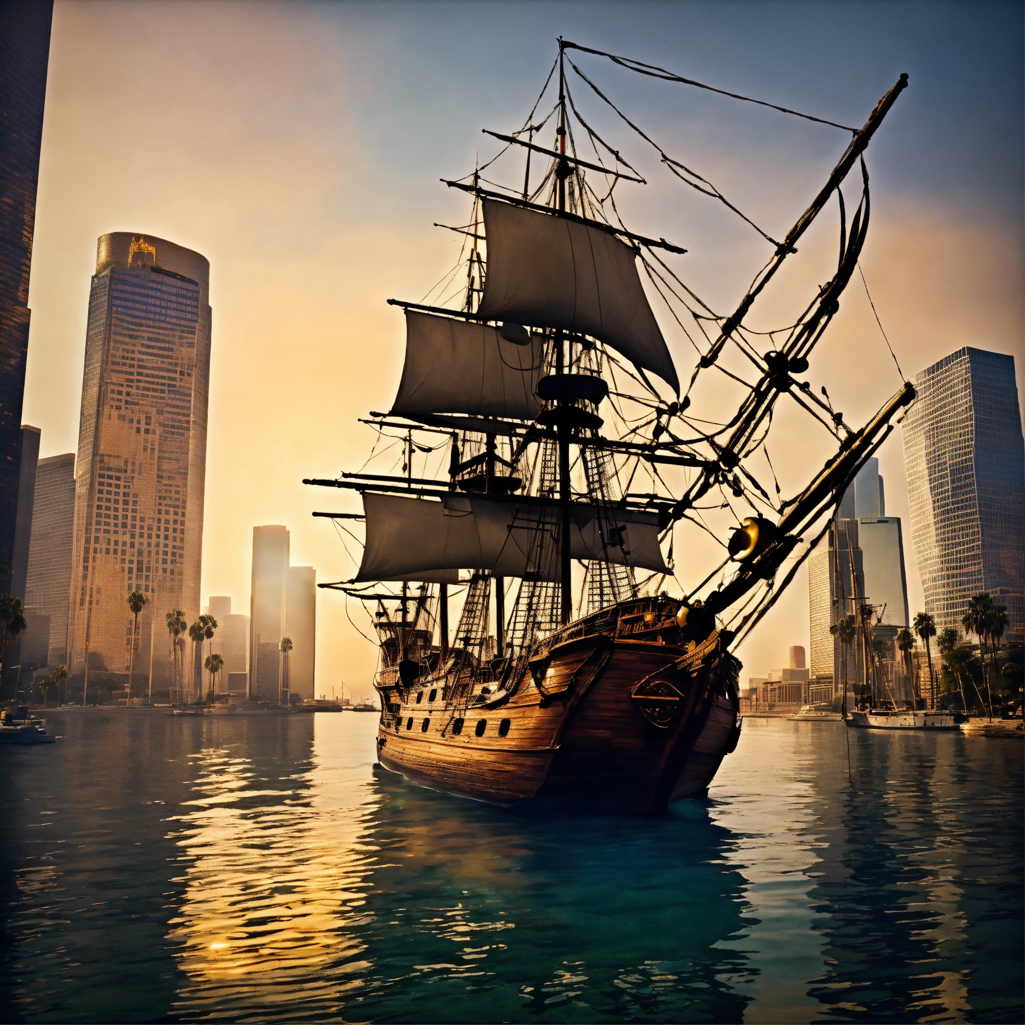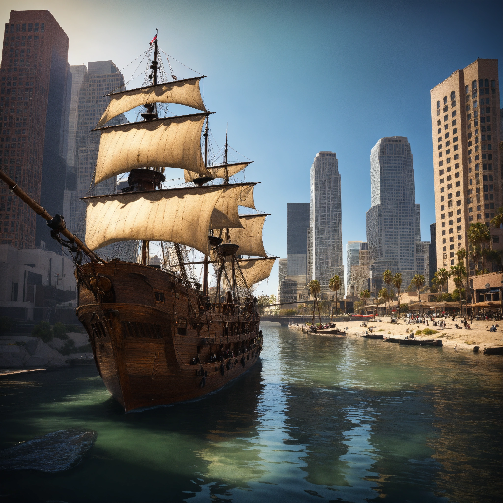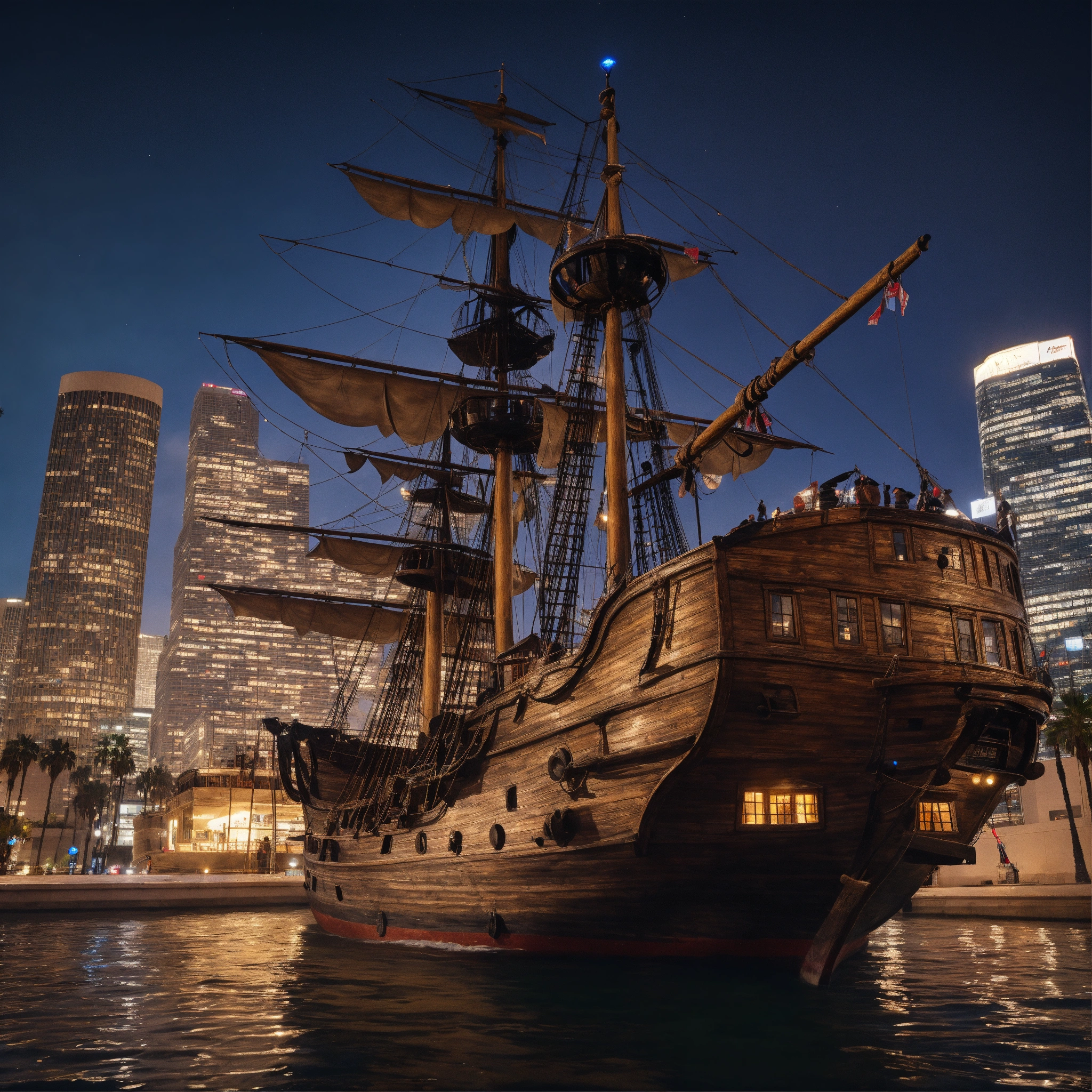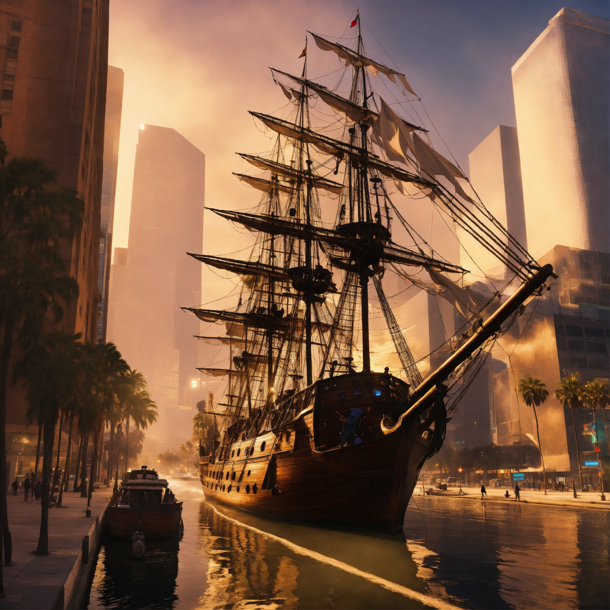 A pirate ship in the middle of downtown los angeles