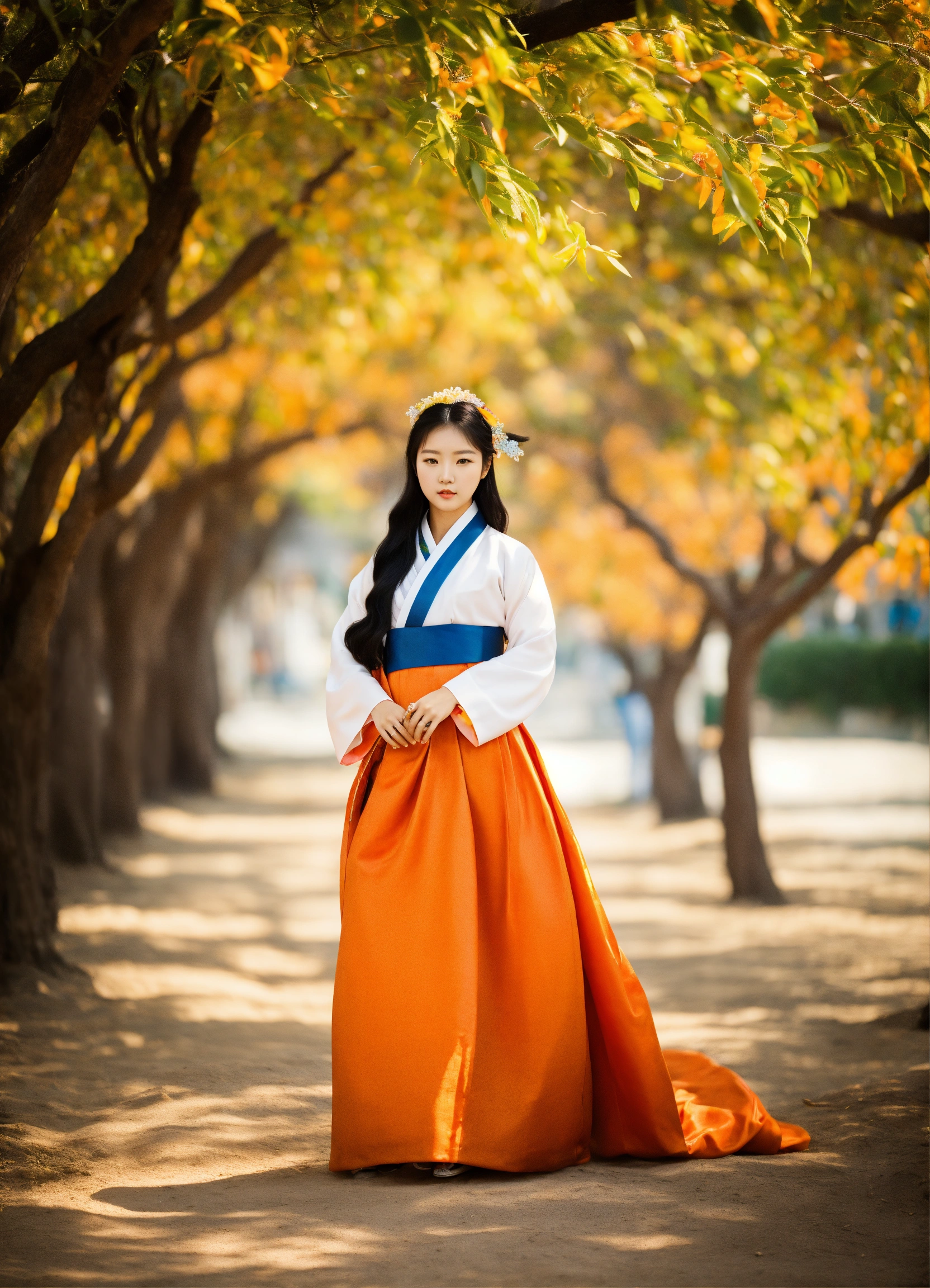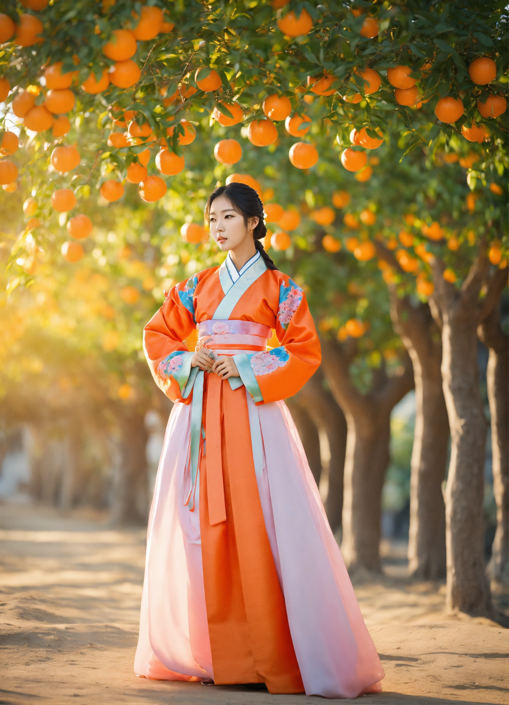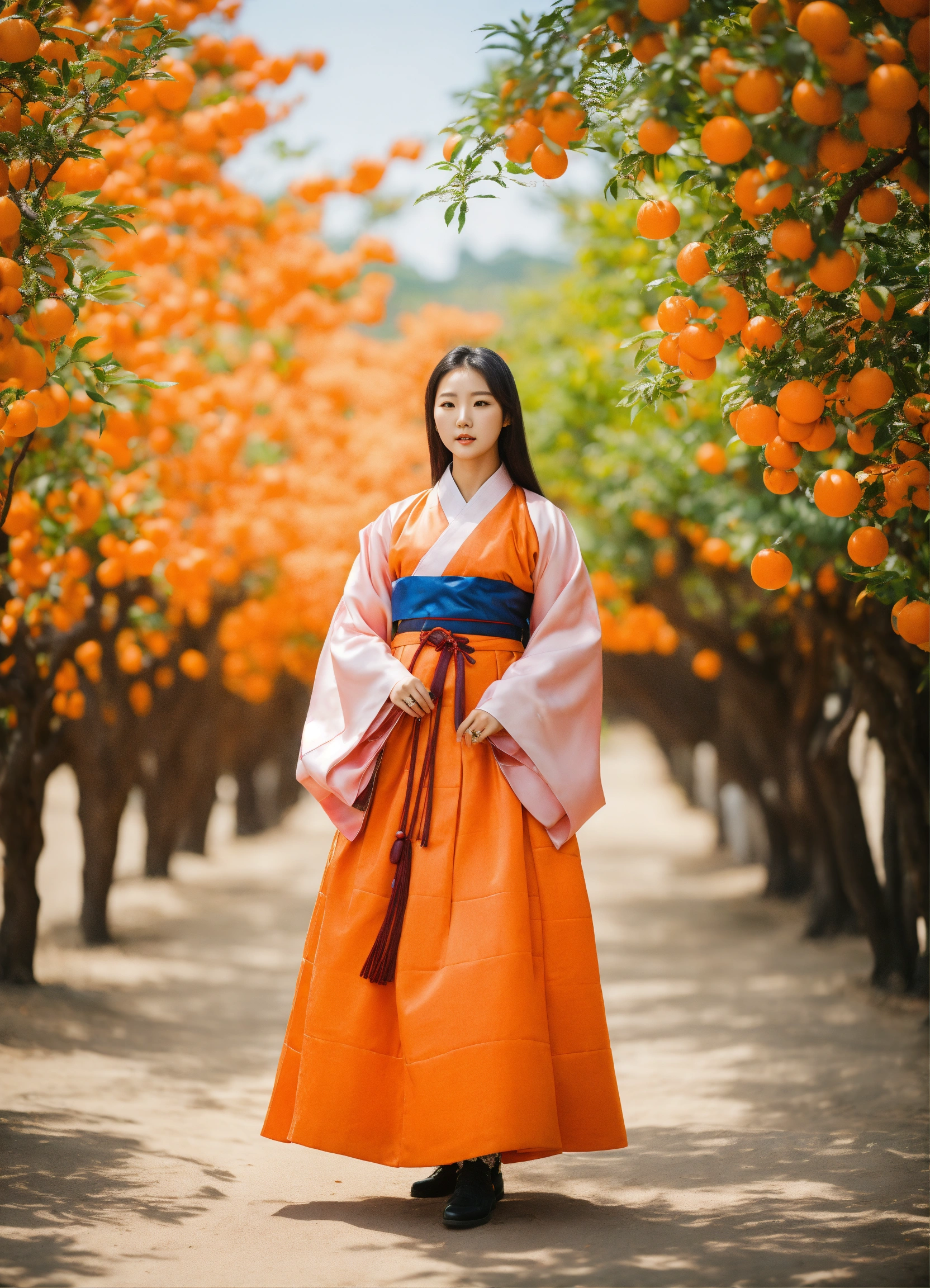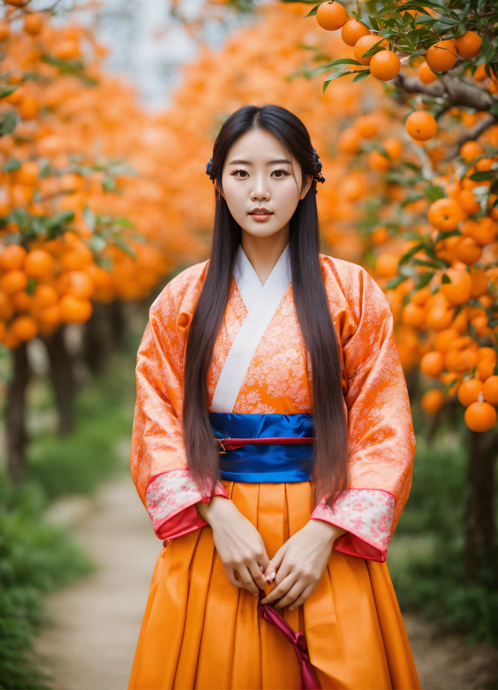 Beautiful young korean woman wearing hanbok with long hair is standing in orange grove