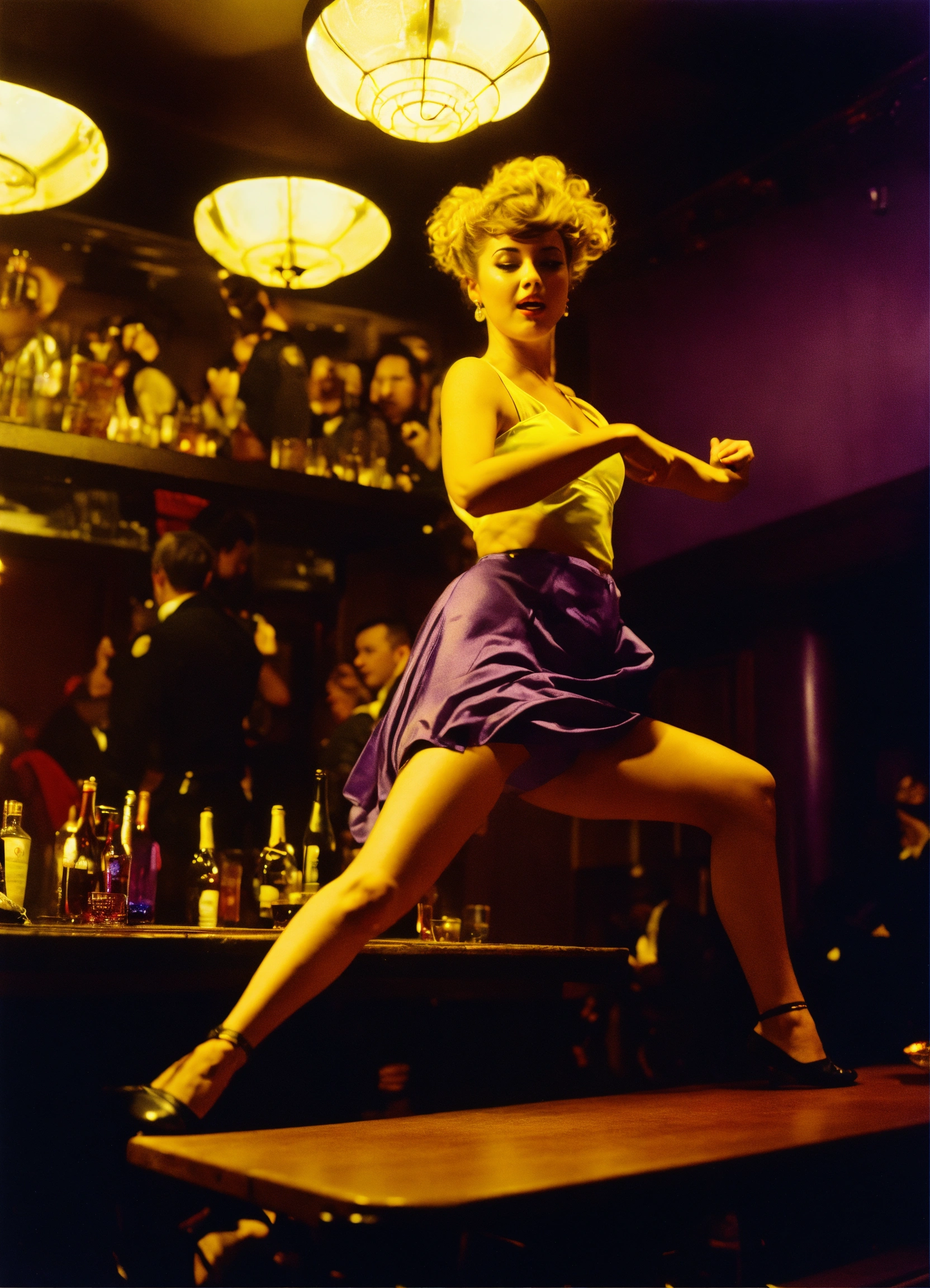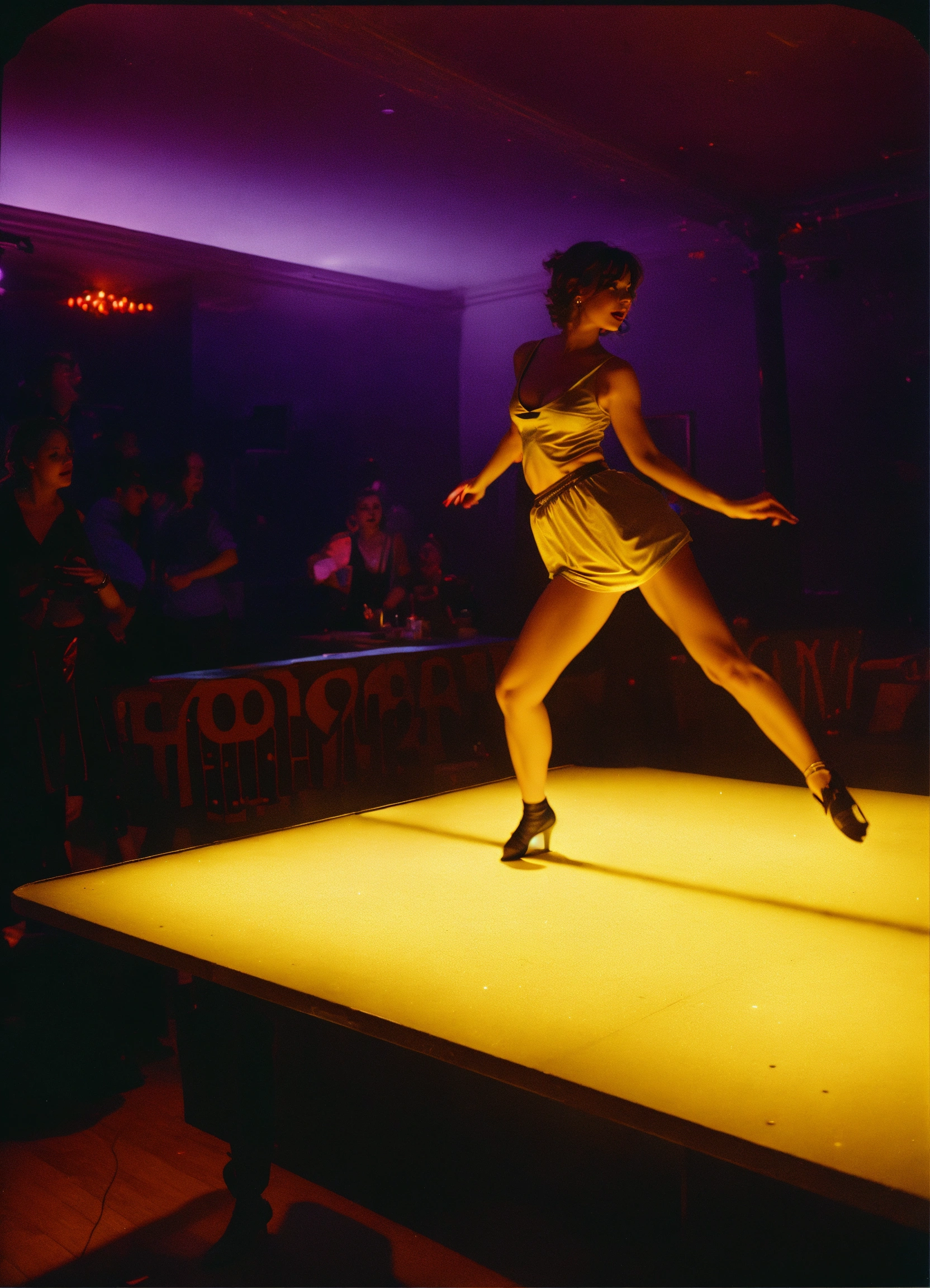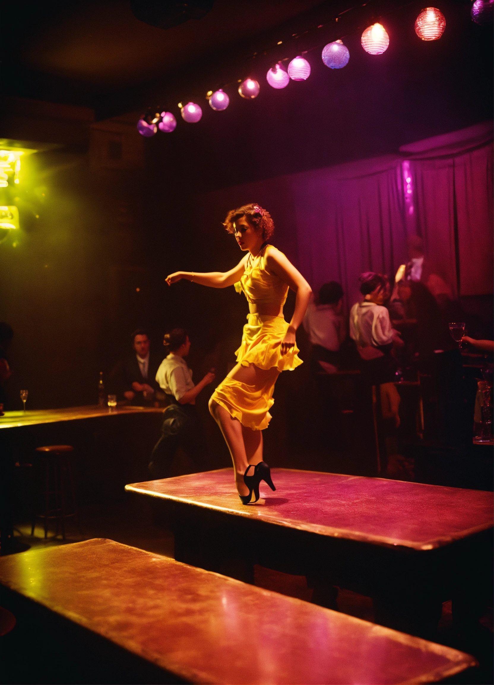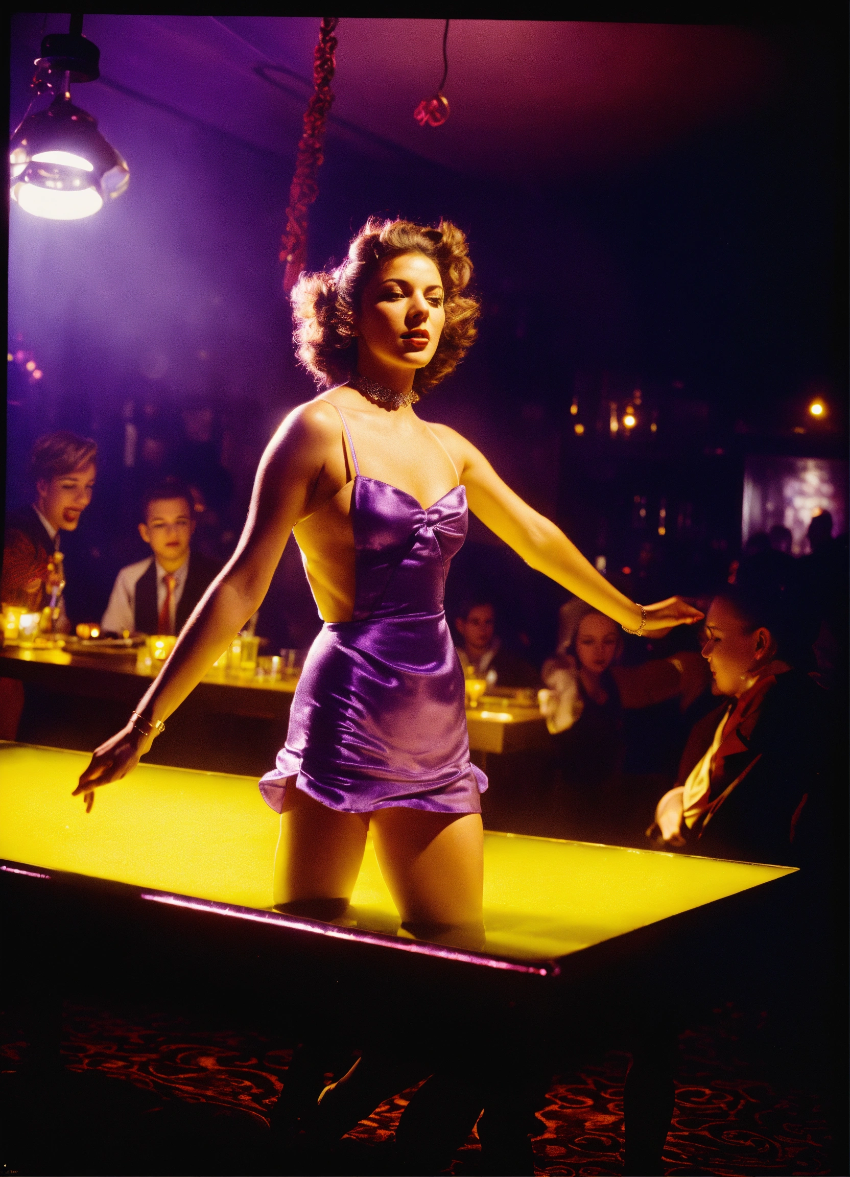 Glasgow club interior, female character, dancing on table, dark, purple and yellow artificial lighting by weegee