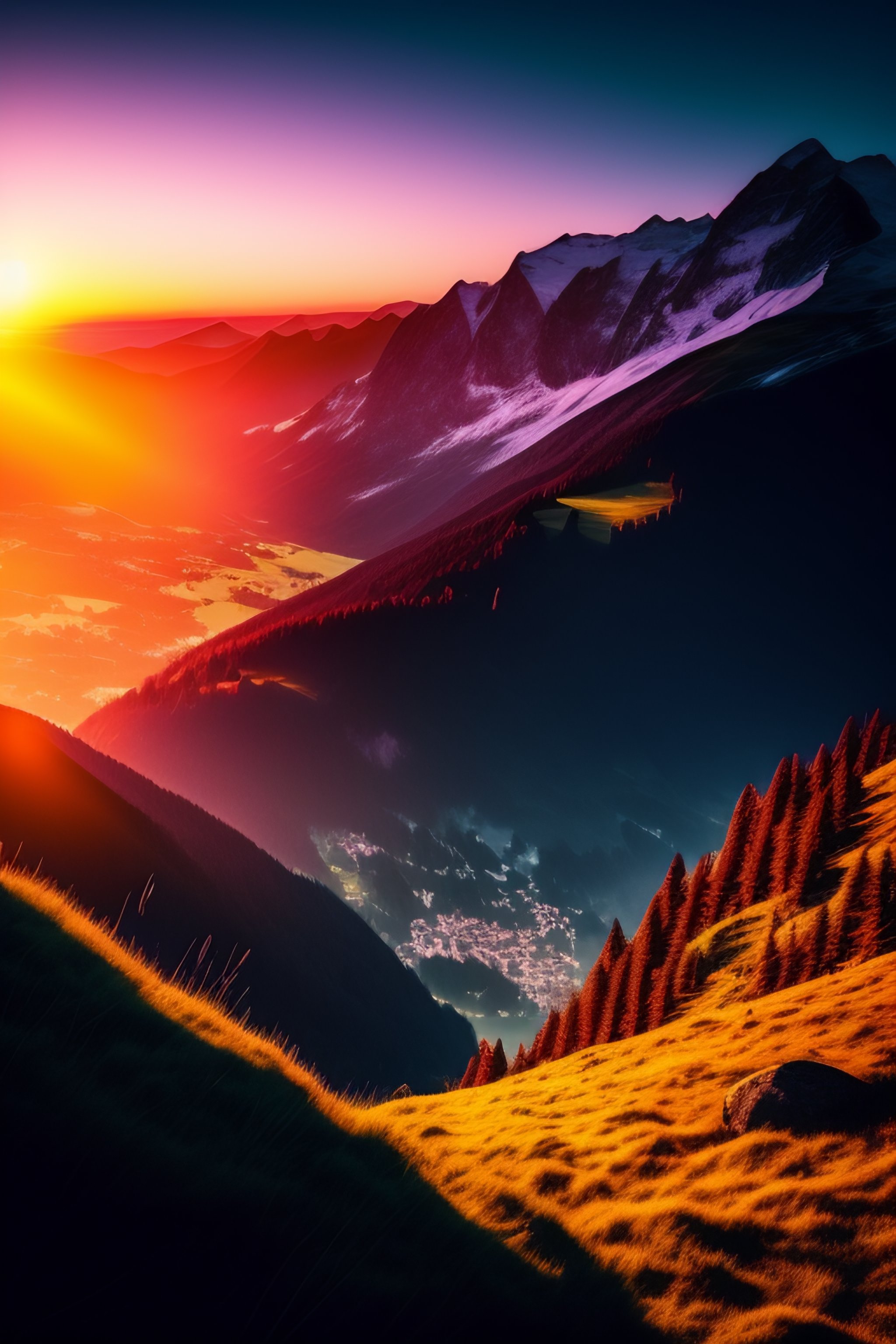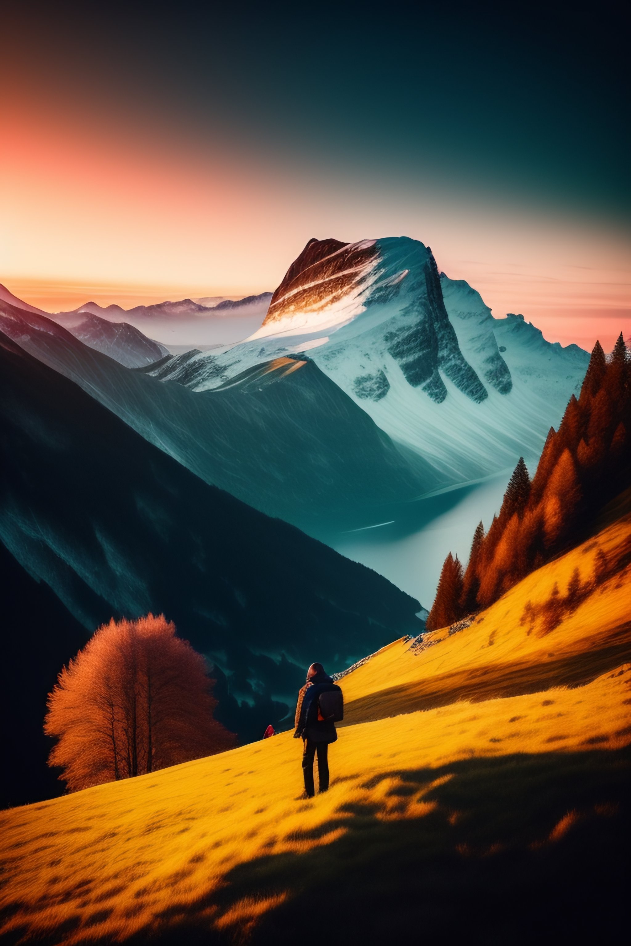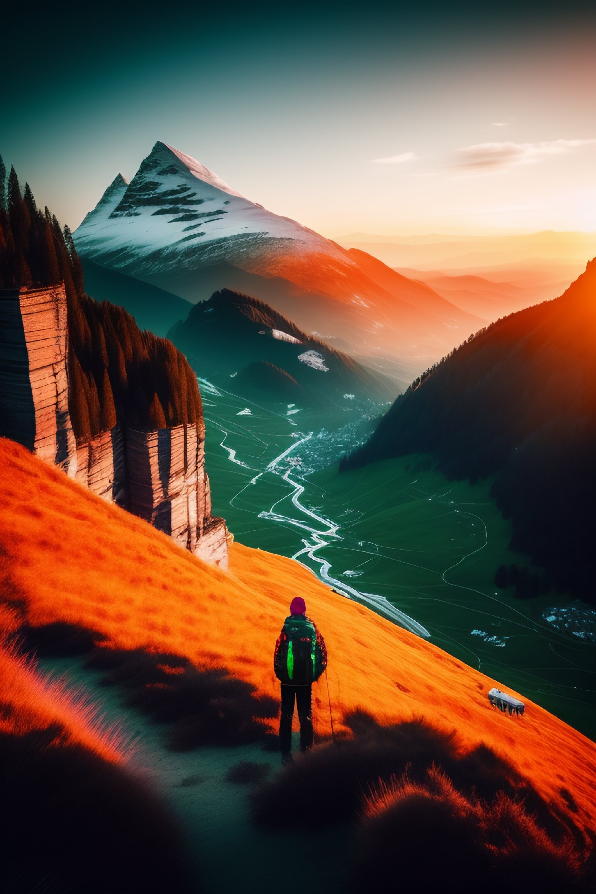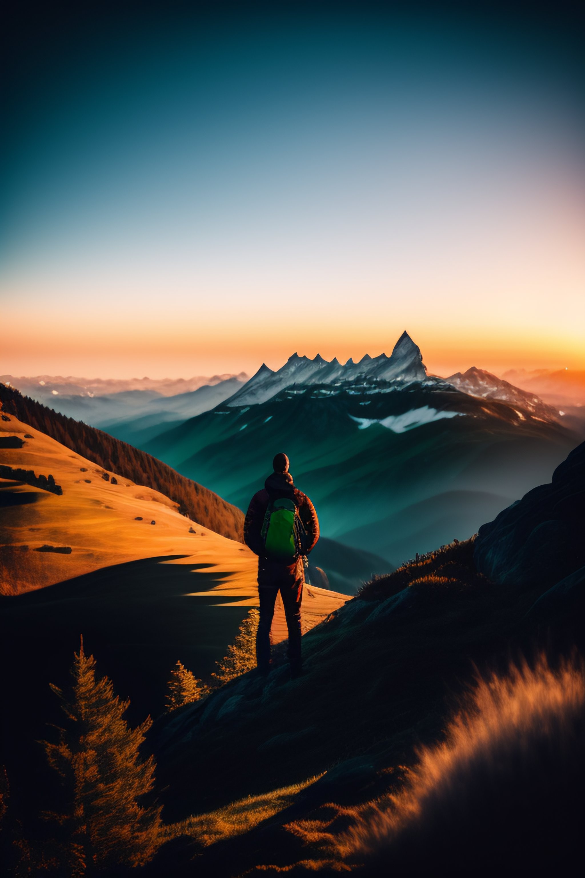 "create an image of a person standing on a mountain in switzerland at sunset. the person should be facing the camera, and the mountain should slope down away from them. the sky should be orange and red at the horizon, gradually blending into a deep blue towards the top of the image. the mountain should be covered in grass and small shrubs, with patches of vibrant green where the grass is particularly thick. there should also be tall pine trees growing on the mountain's slopes, with their needles a deep shade of green. the sun should be setting behind the mountain, casting a warm glow over the scene. the person should be dressed in warm layers, with a hat and gloves to protect them from the cold. they should be looking out at the sunset, taking in the breathtaking view. the image should be highly realistic and cinematic in quality, with attention to detail in the lighting, materials, and composition."