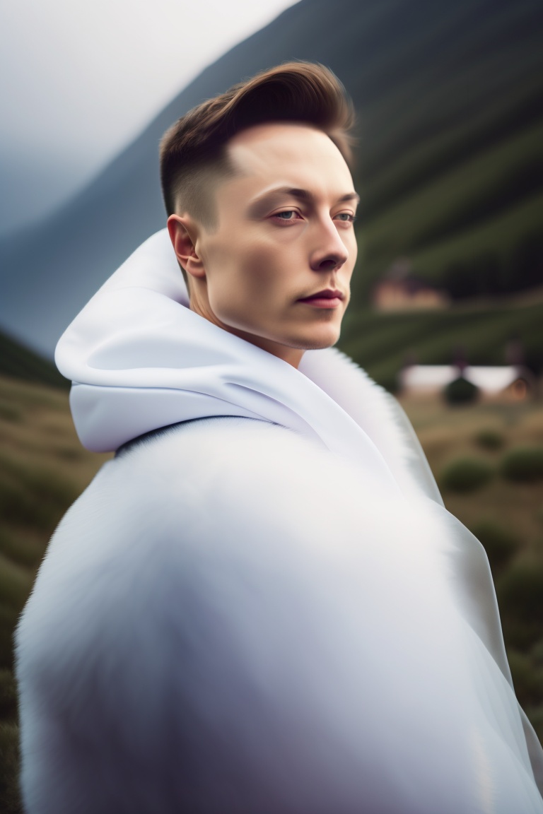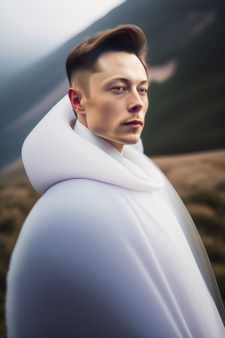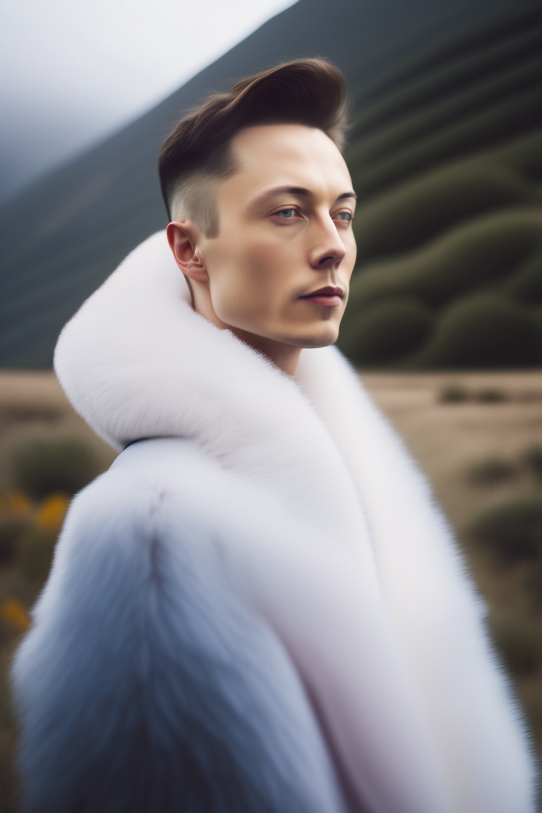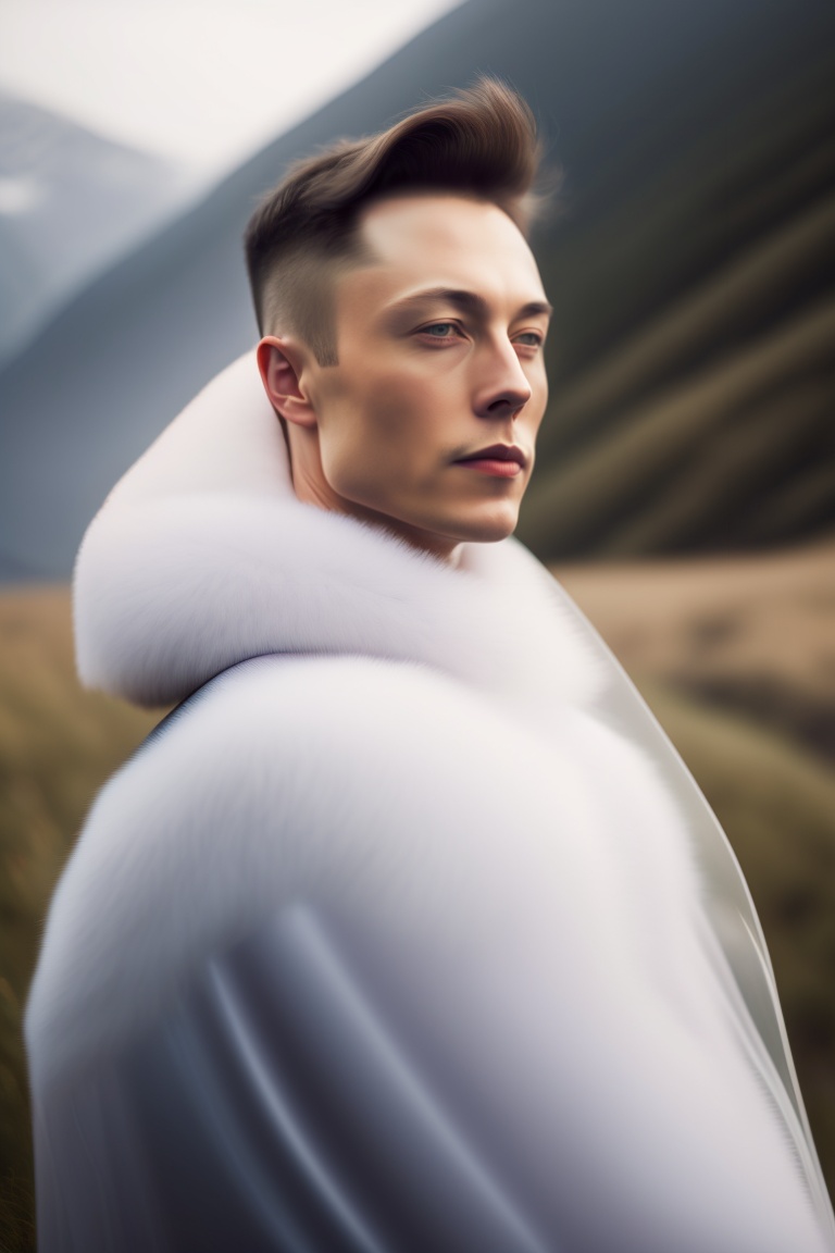 Elon musk, portrait of haute couture beautiful weather, ethereal dreamy foggy, photoshoot by arron nace, editorial fashion magazine photoshoot, fashion poses, in front of mountain. kinfolk magazine. film grain.