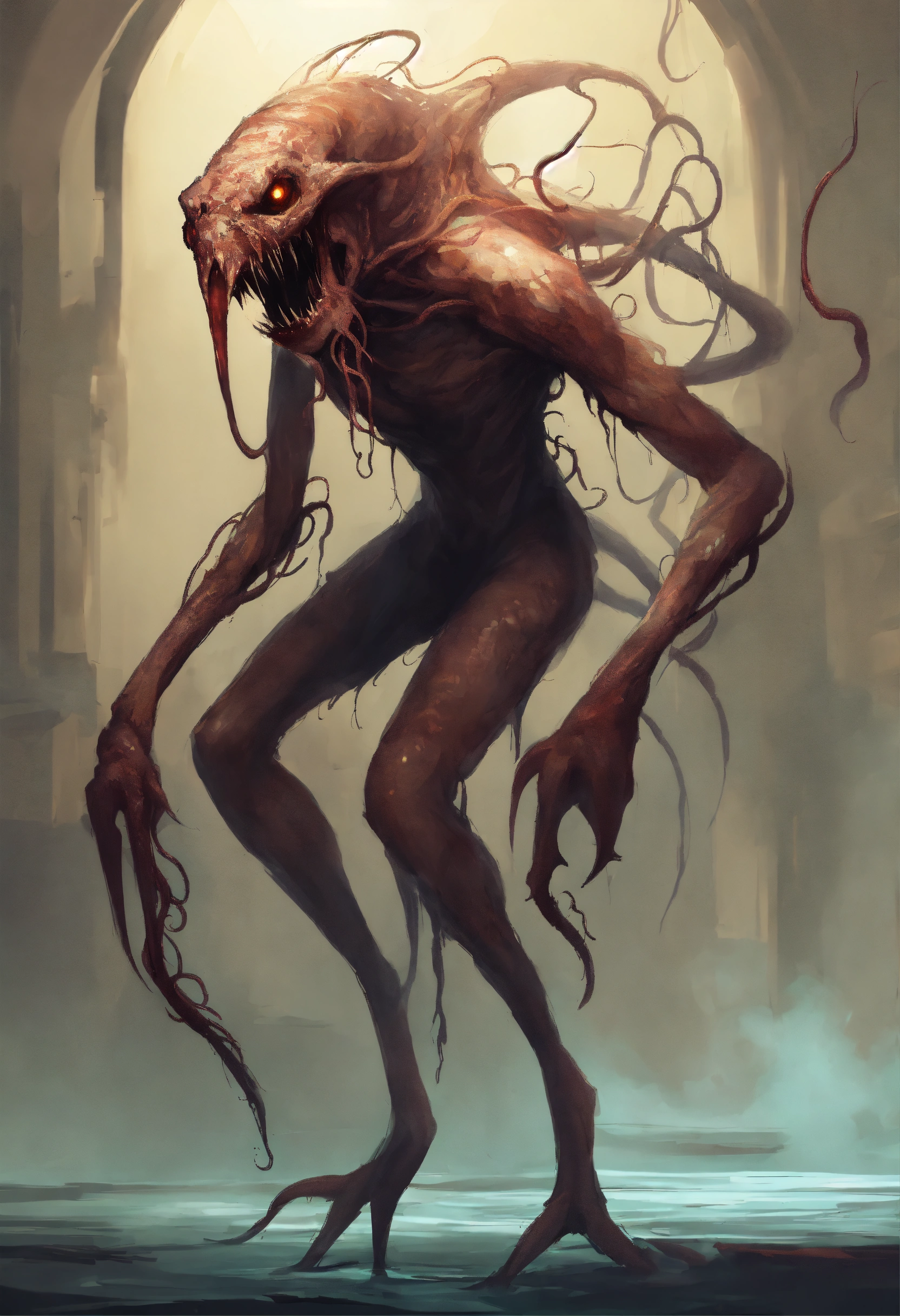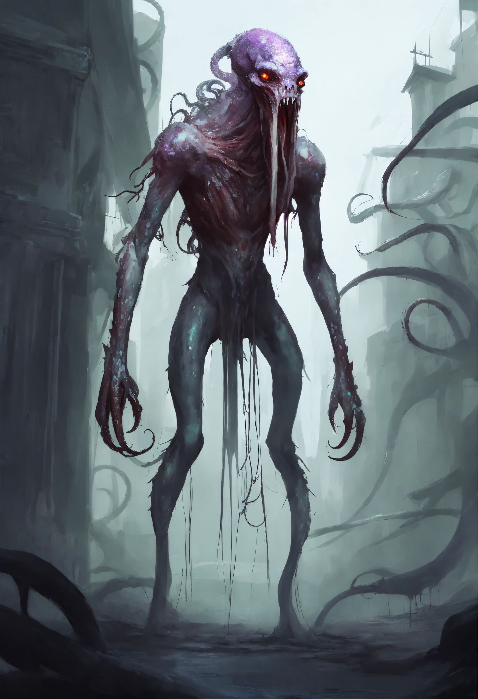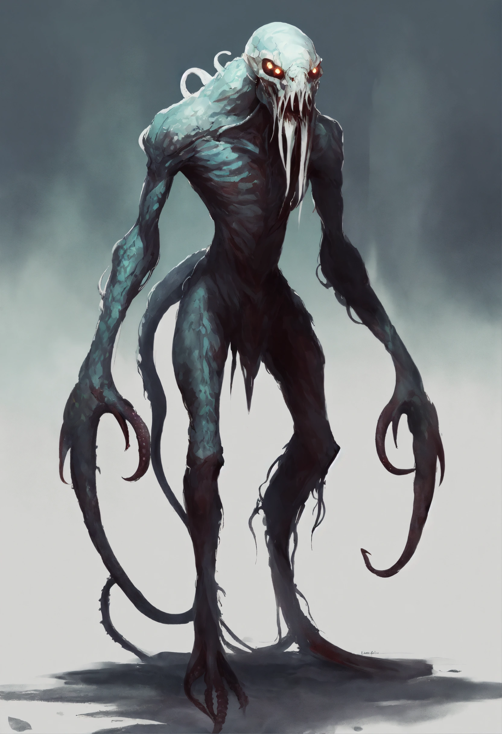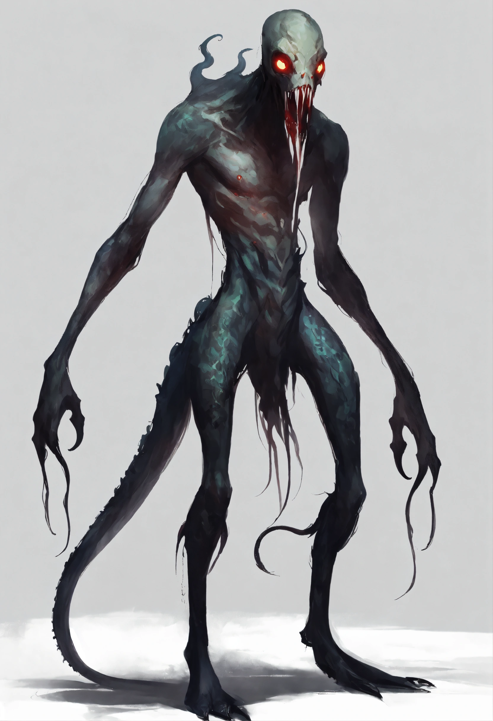 Concept art, side view, digital paintng, skiny ghostly monster, two long legs, tentacle arms, dark skin, mouth with fangs, empty eye sockets, clean white background, no background