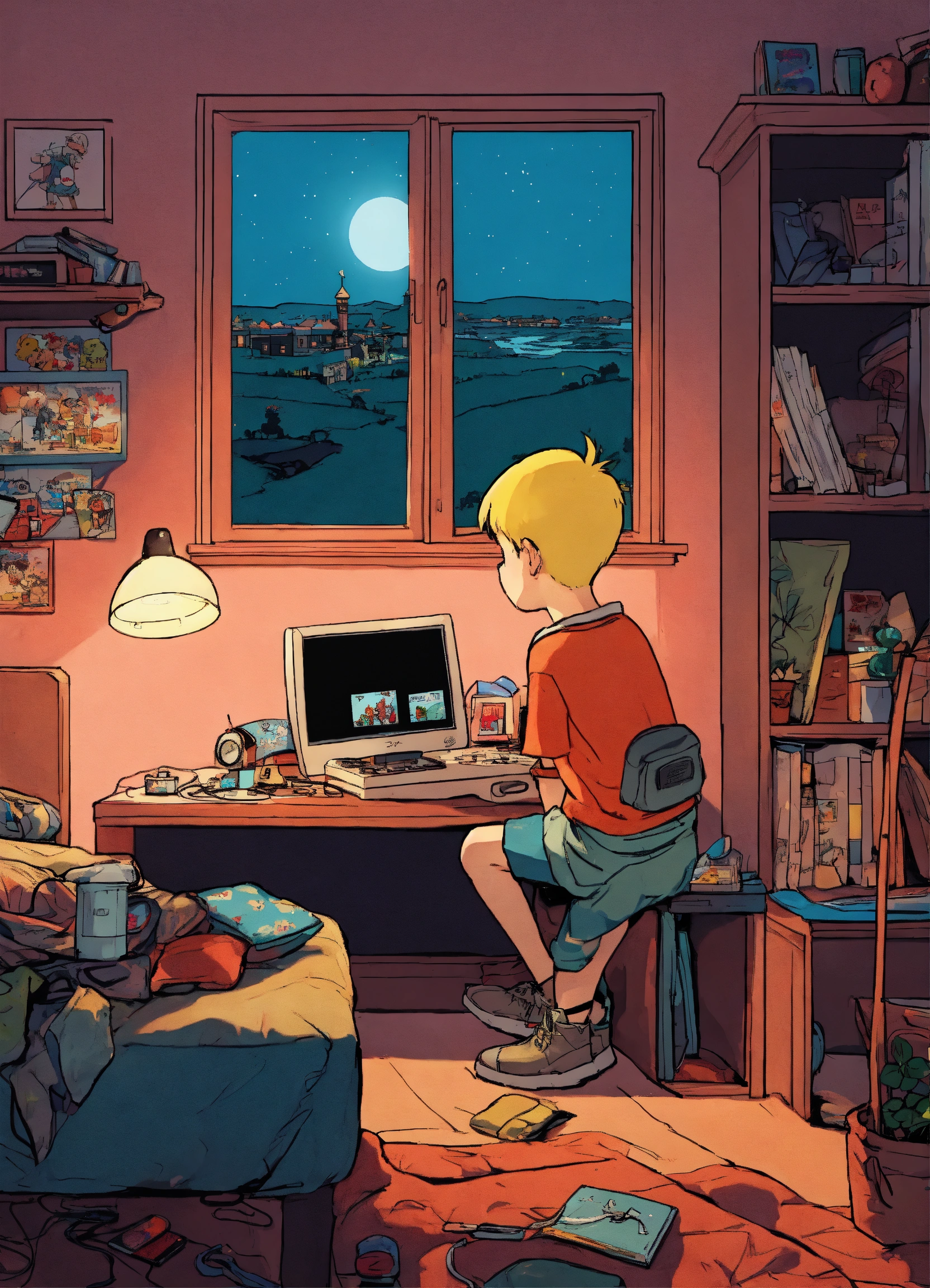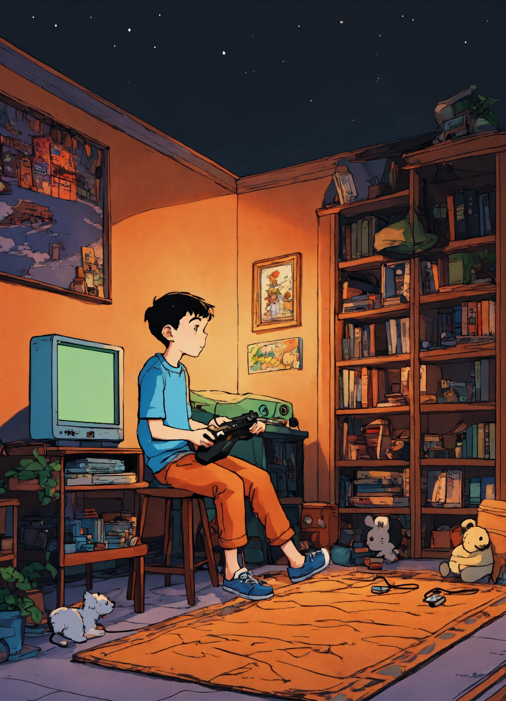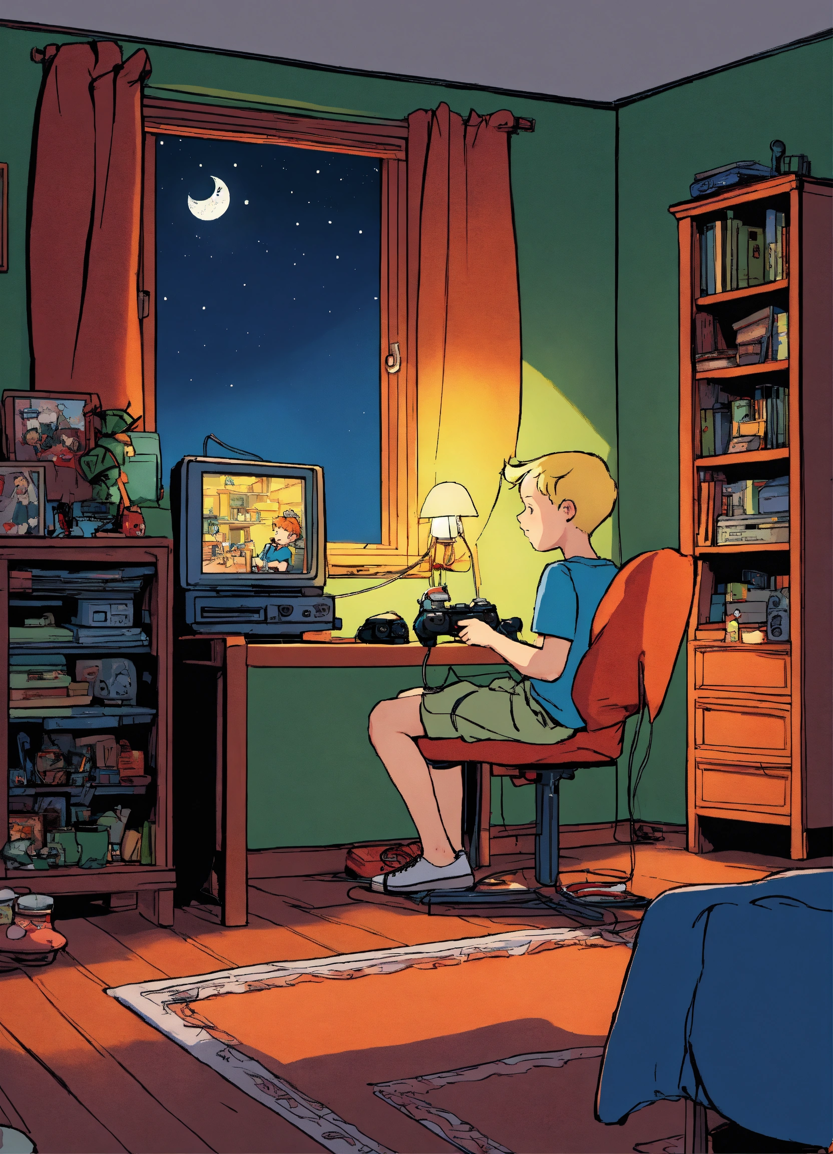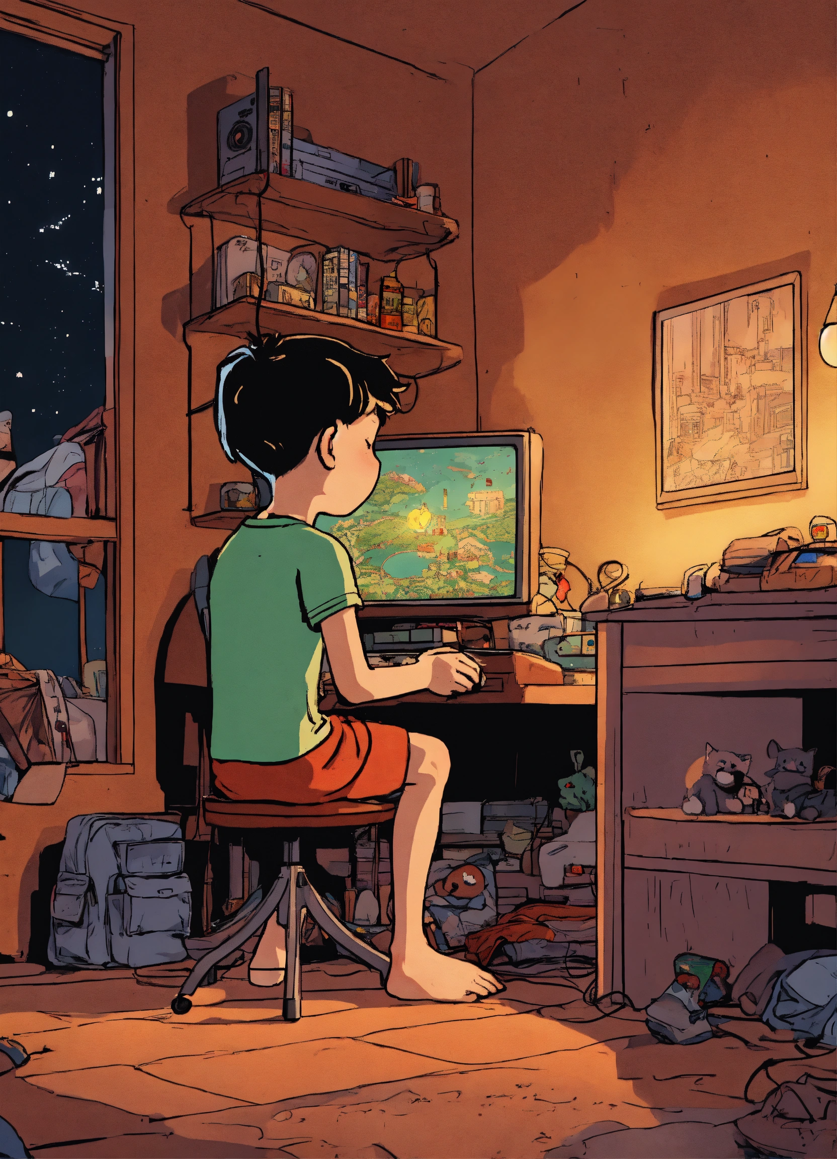 A boy playing video games at night in his room