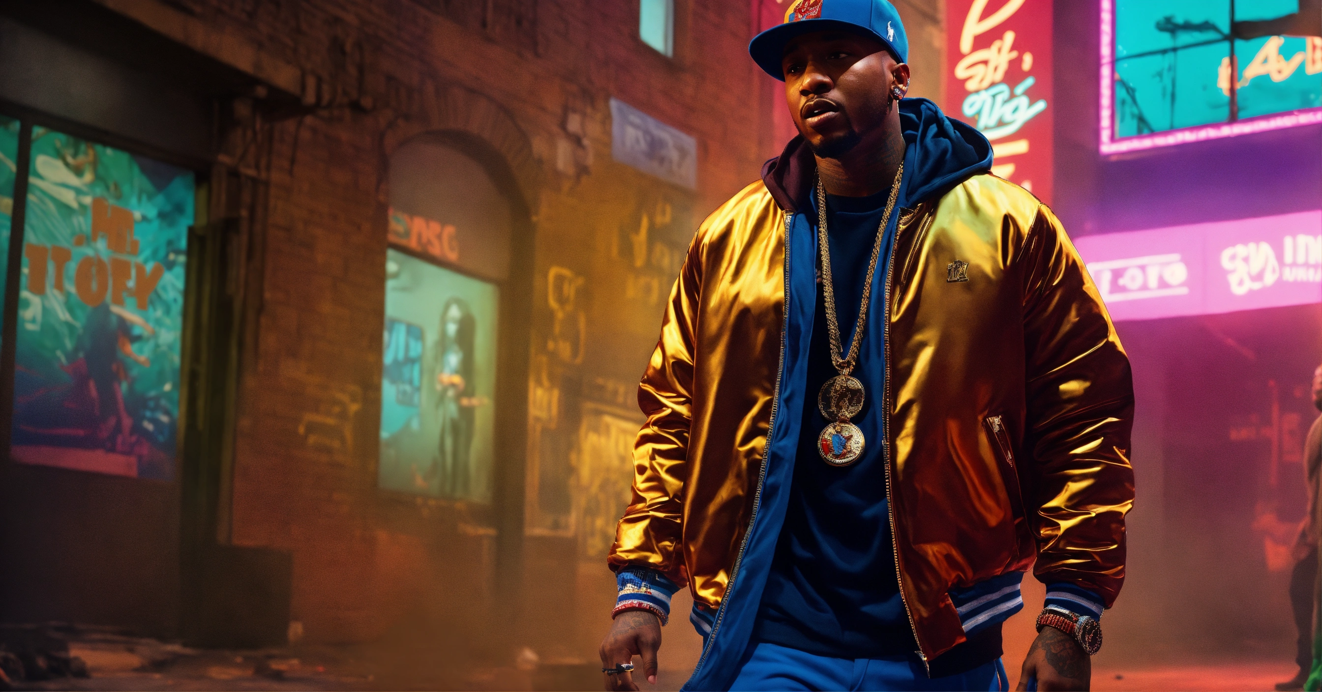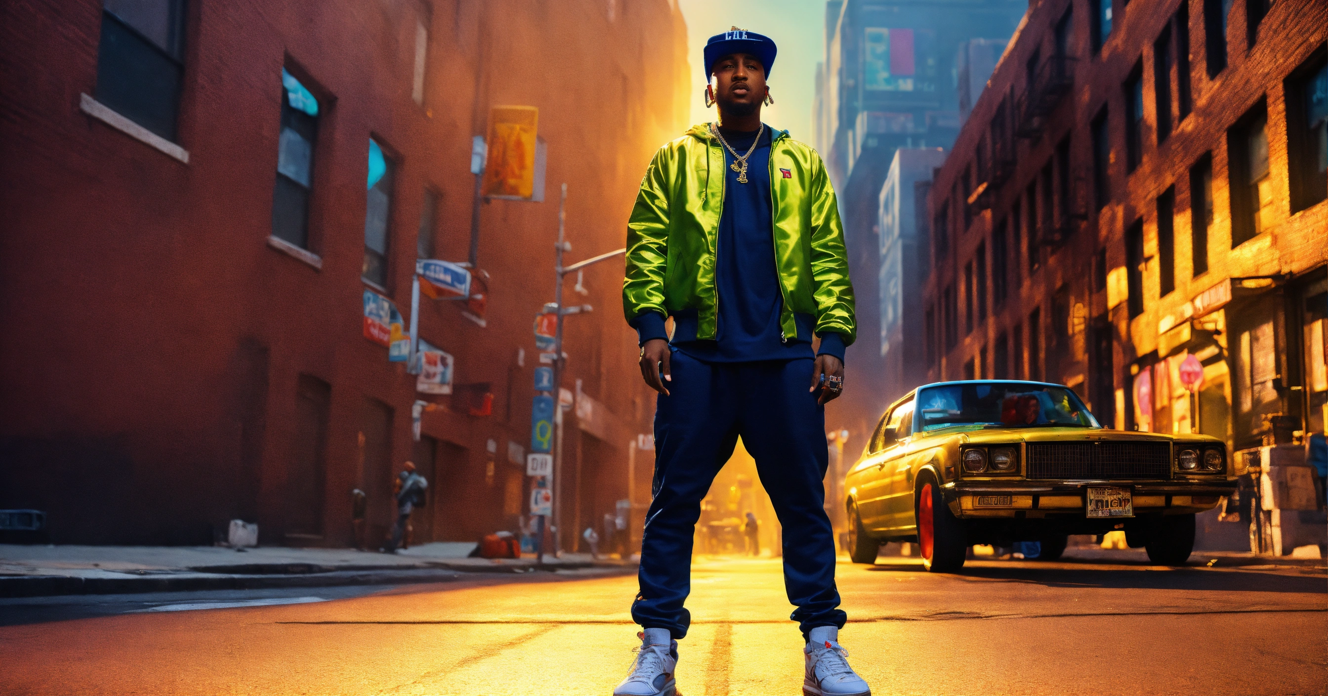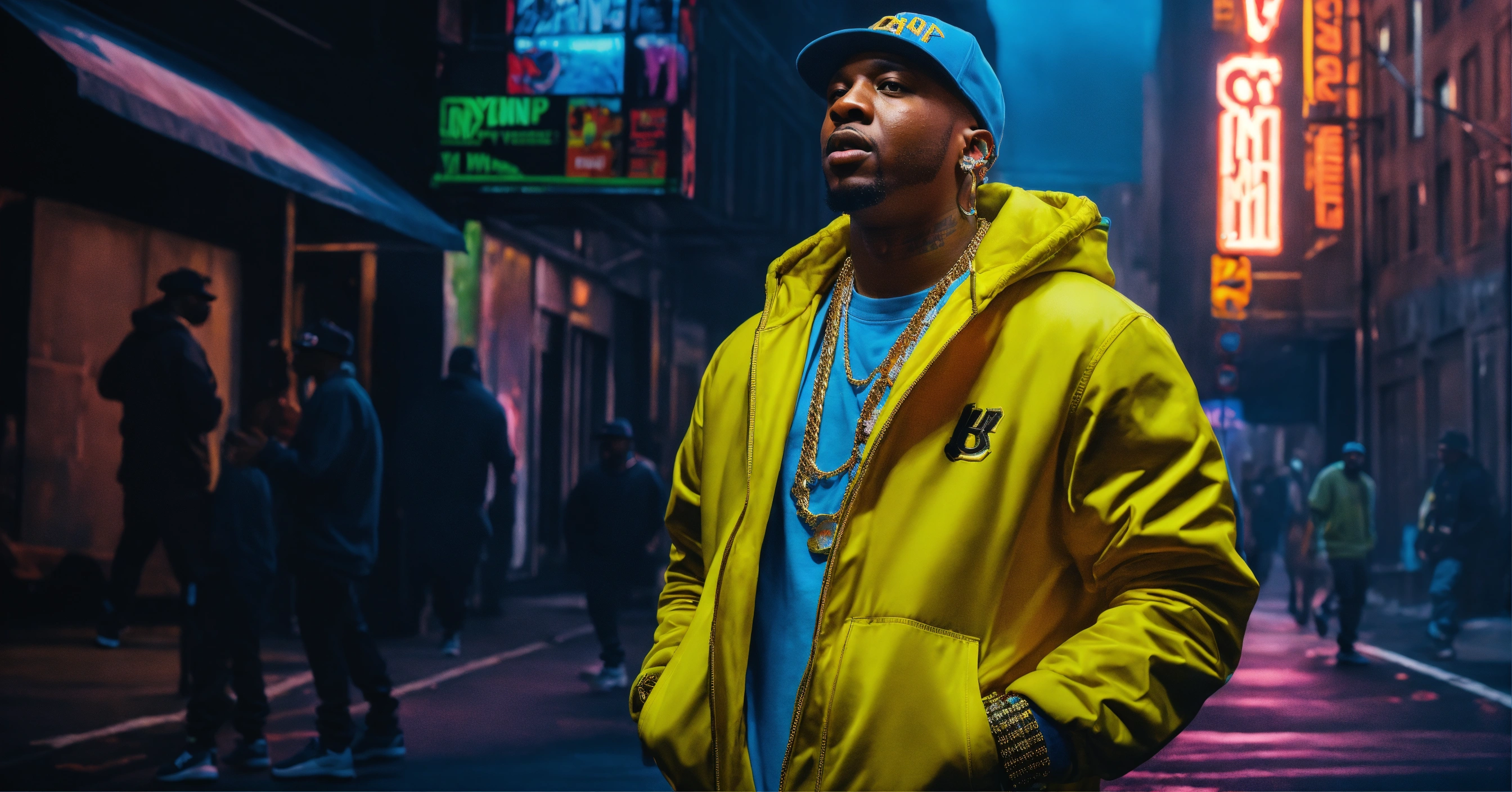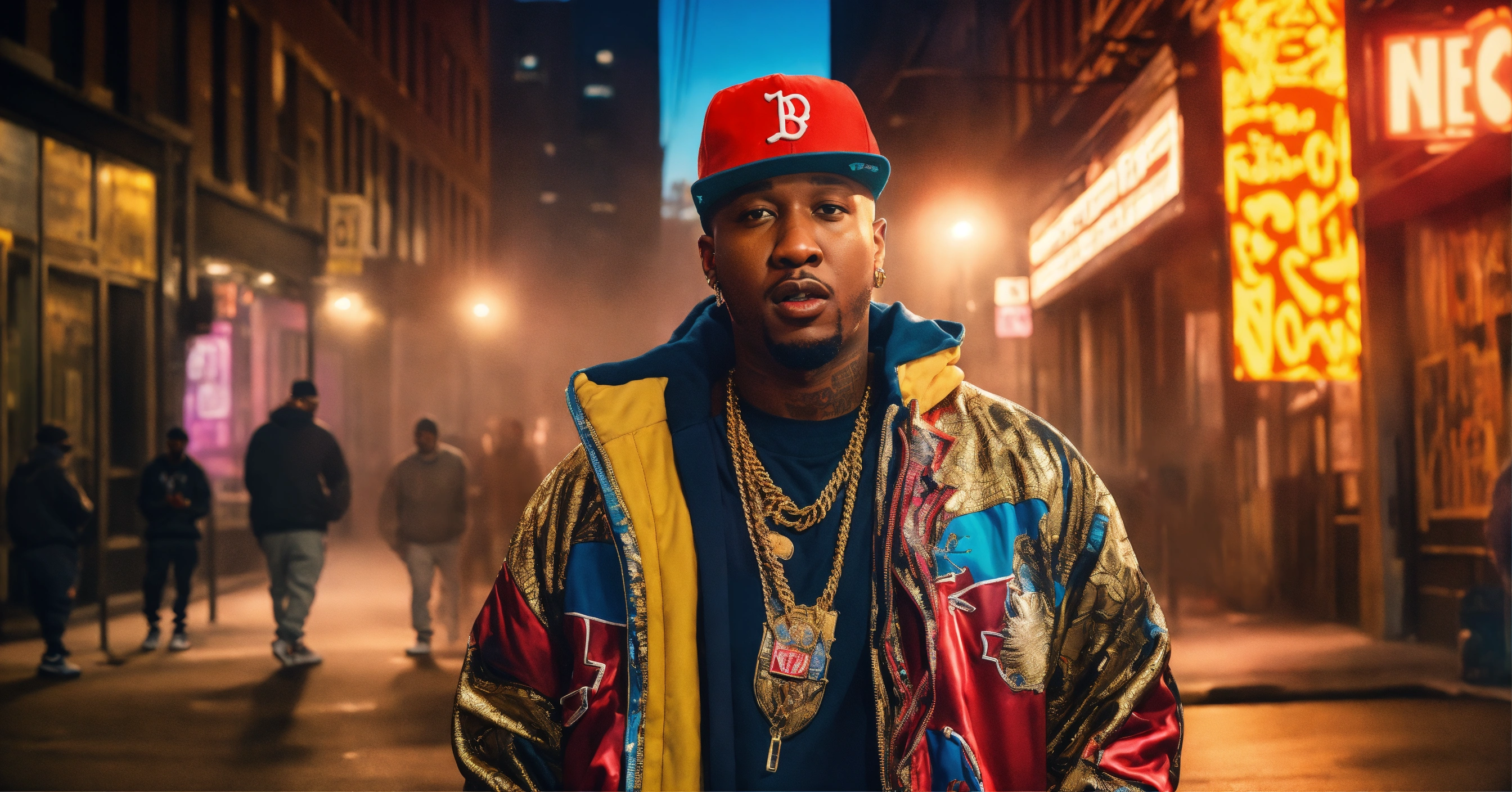 Full body shot pop art, hyperrealist portrait of rapper "maino " rapping in a hip hop cypher om the streets of brooklyn with cinematic feel fantasy art, photo realistic, dynamic lighting, artstation, poster, volumetric lighting, very detailed faces, 4 k, award winning