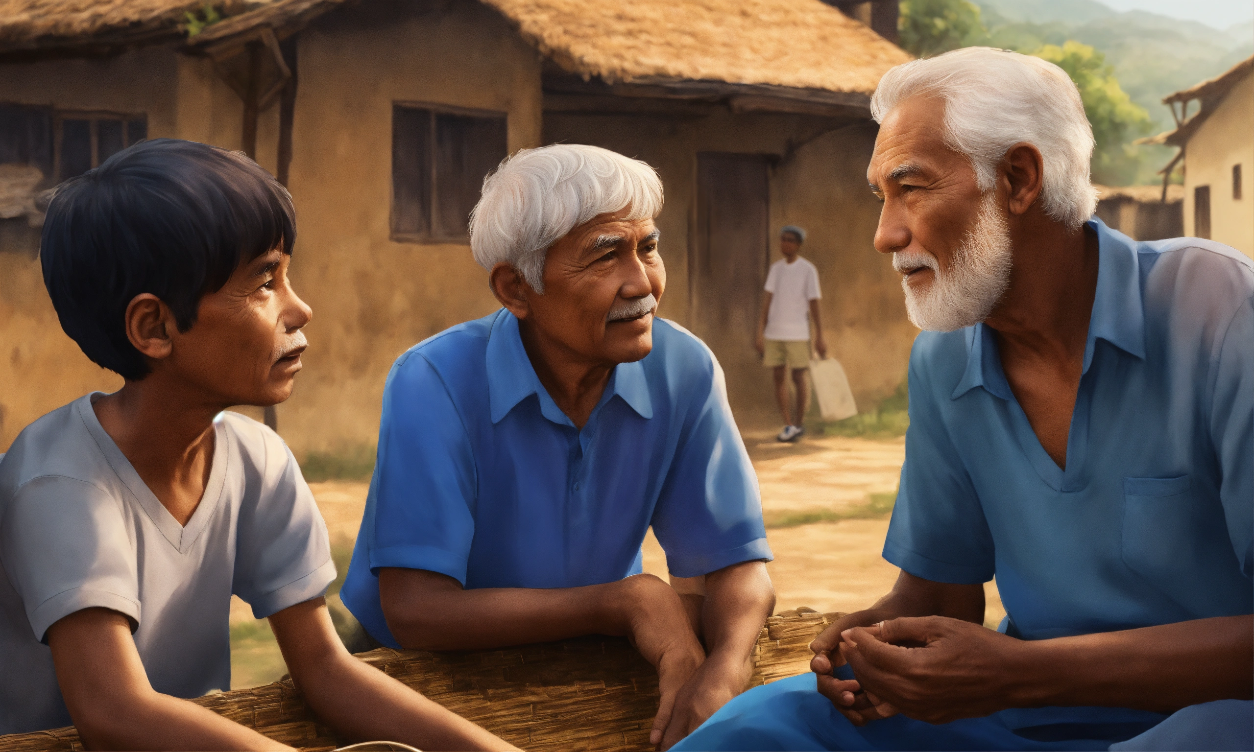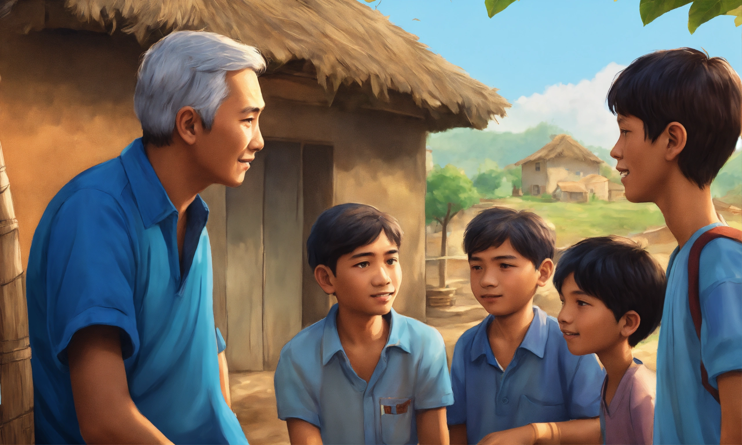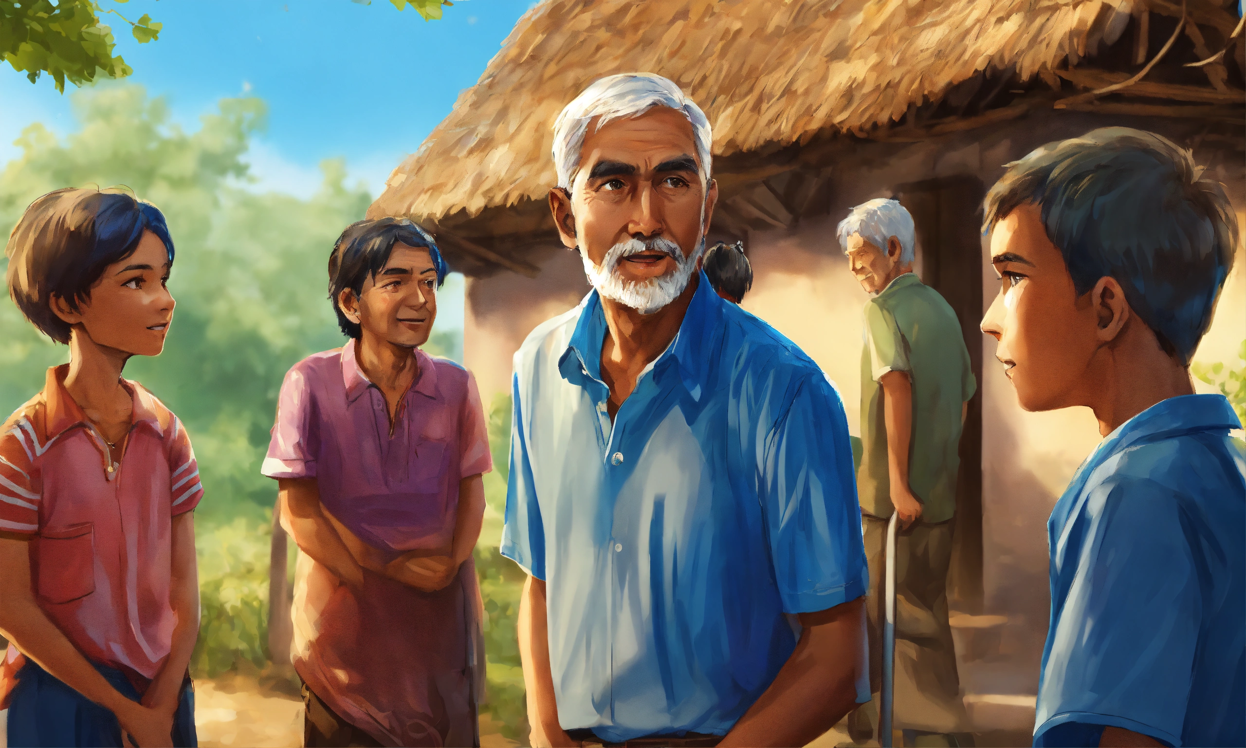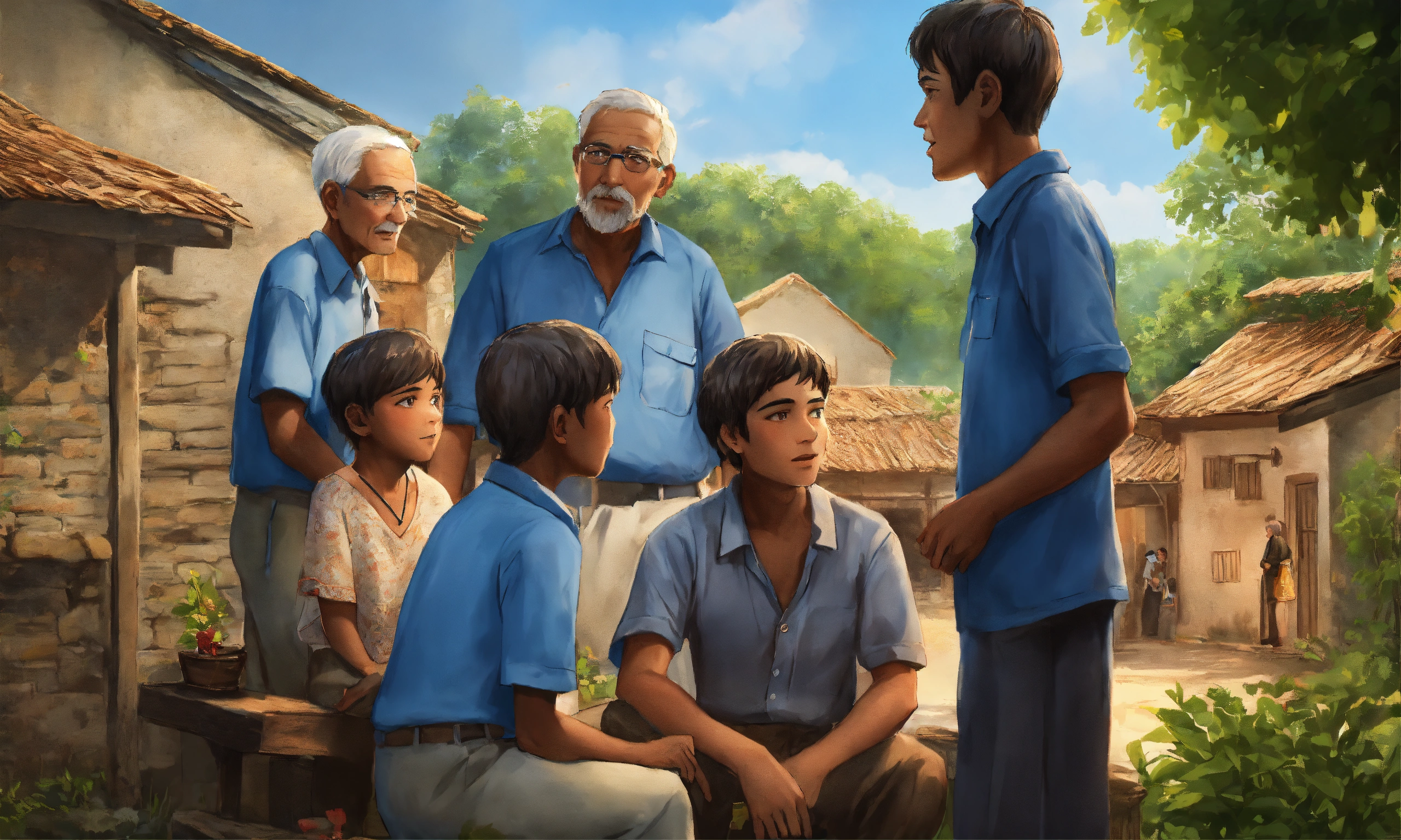 Very high detailed 2d illustration, closeup of a boy in blue shirt talking to 5 older people in village