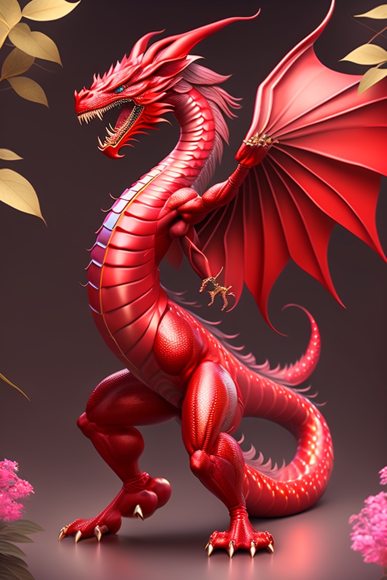 Realistic humanoid red dragon in dynamic pose with asword and japanese background with lightning, sakura leaves, dynamic pose, red