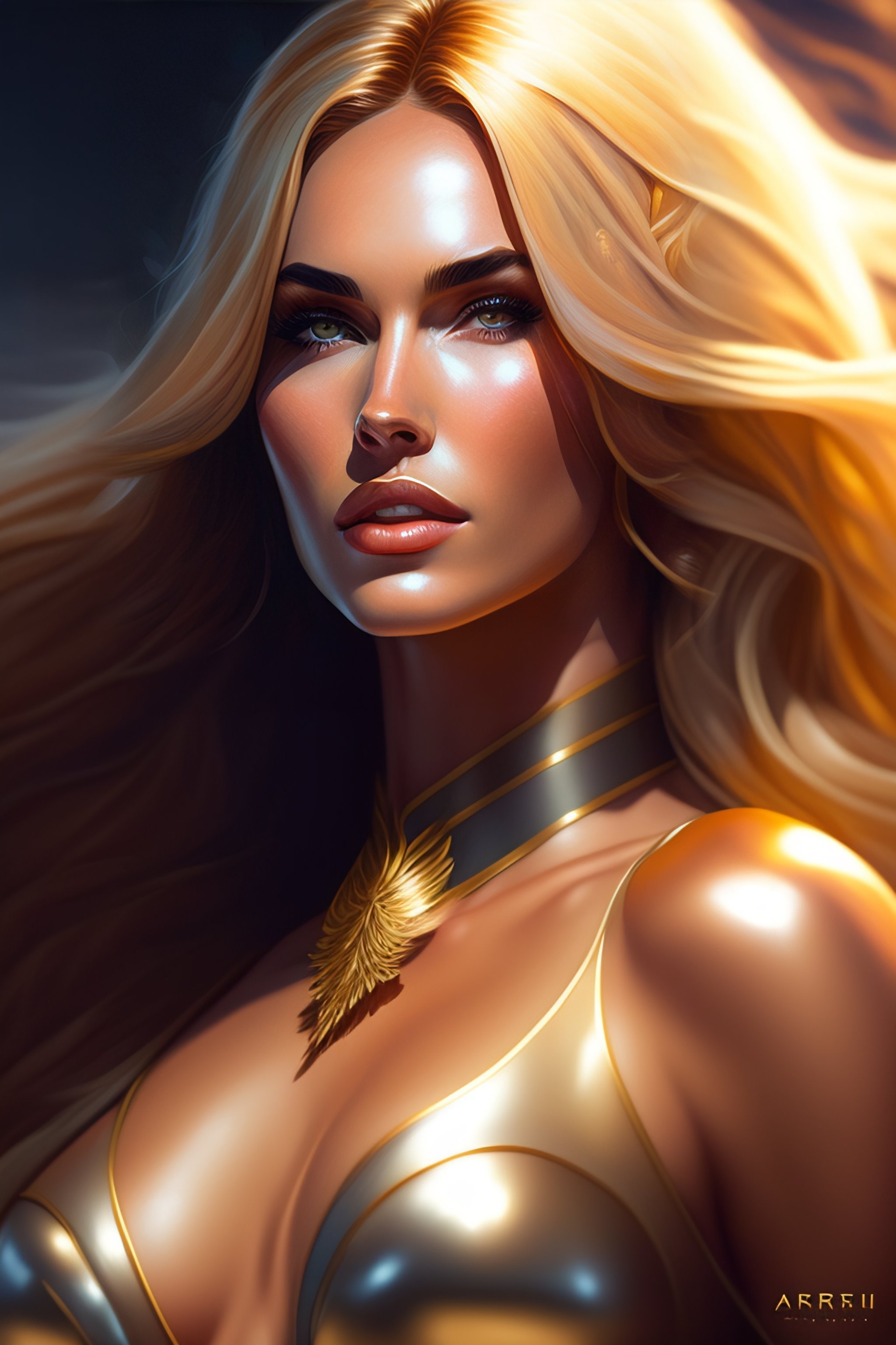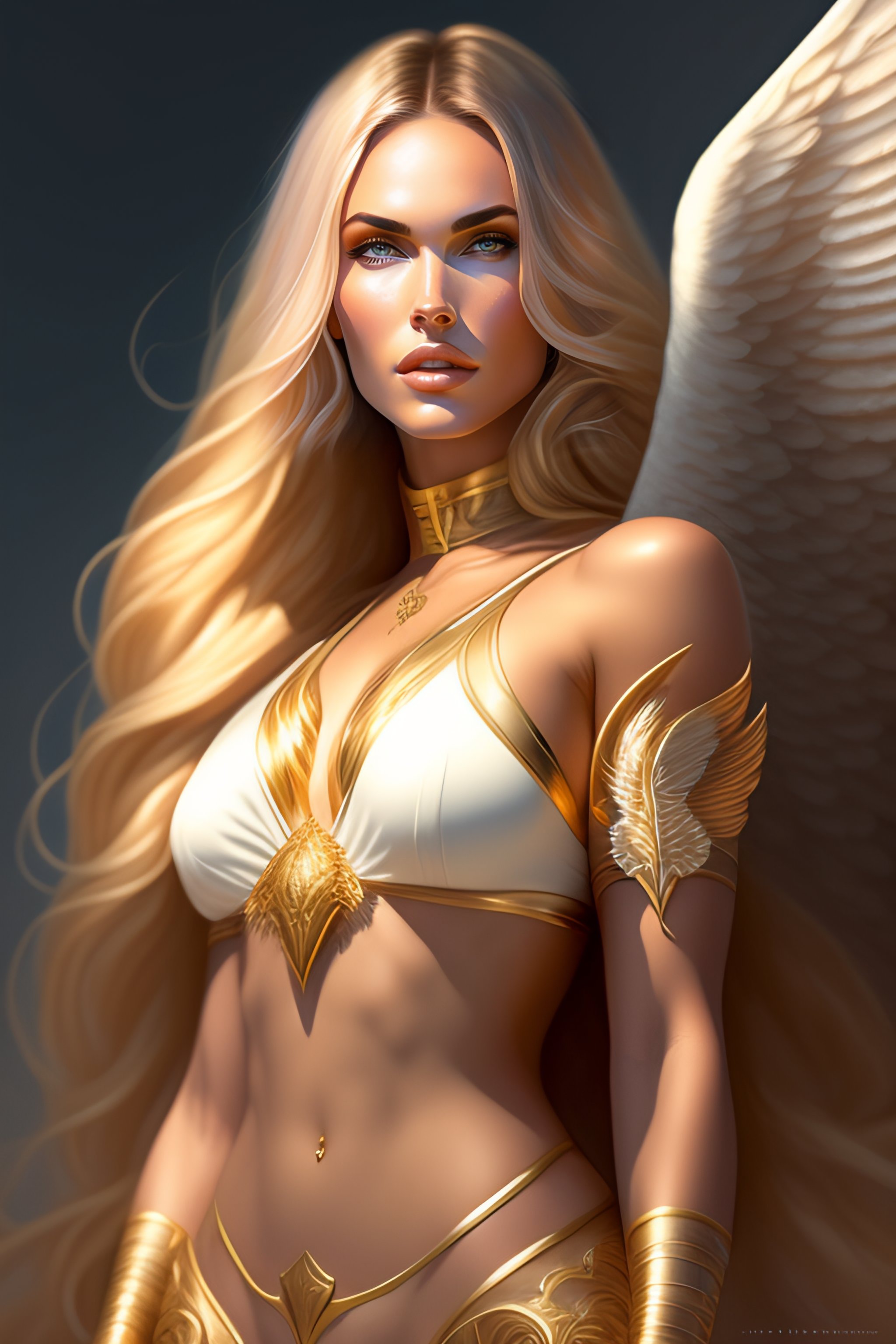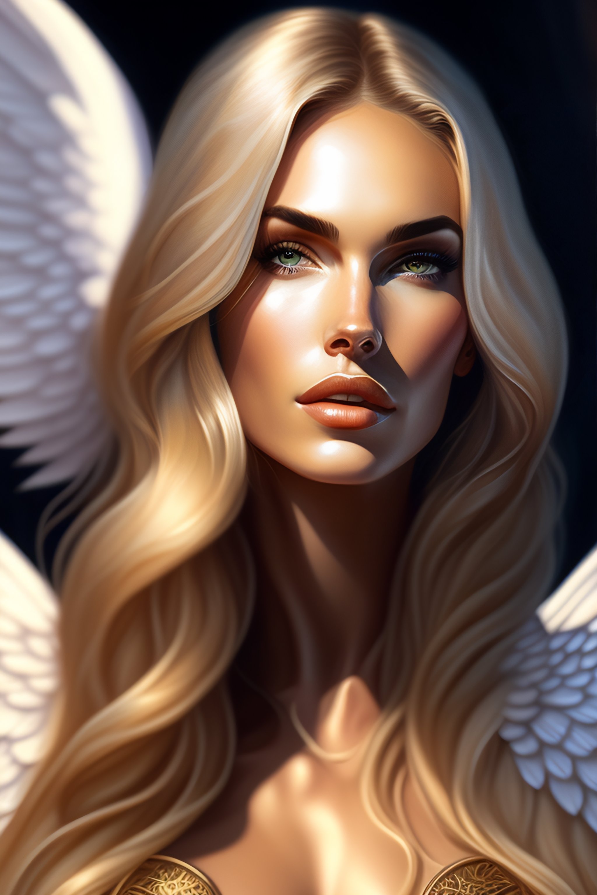 Portrait of megan fox as an blonde angel, wings, intricate, headshot, highly detailed, digital painting, artstation, concept art, sharp focus, cinematic lighting, illustration, art by artgerm and greg rutkowski, alphonse mucha, cgsociety