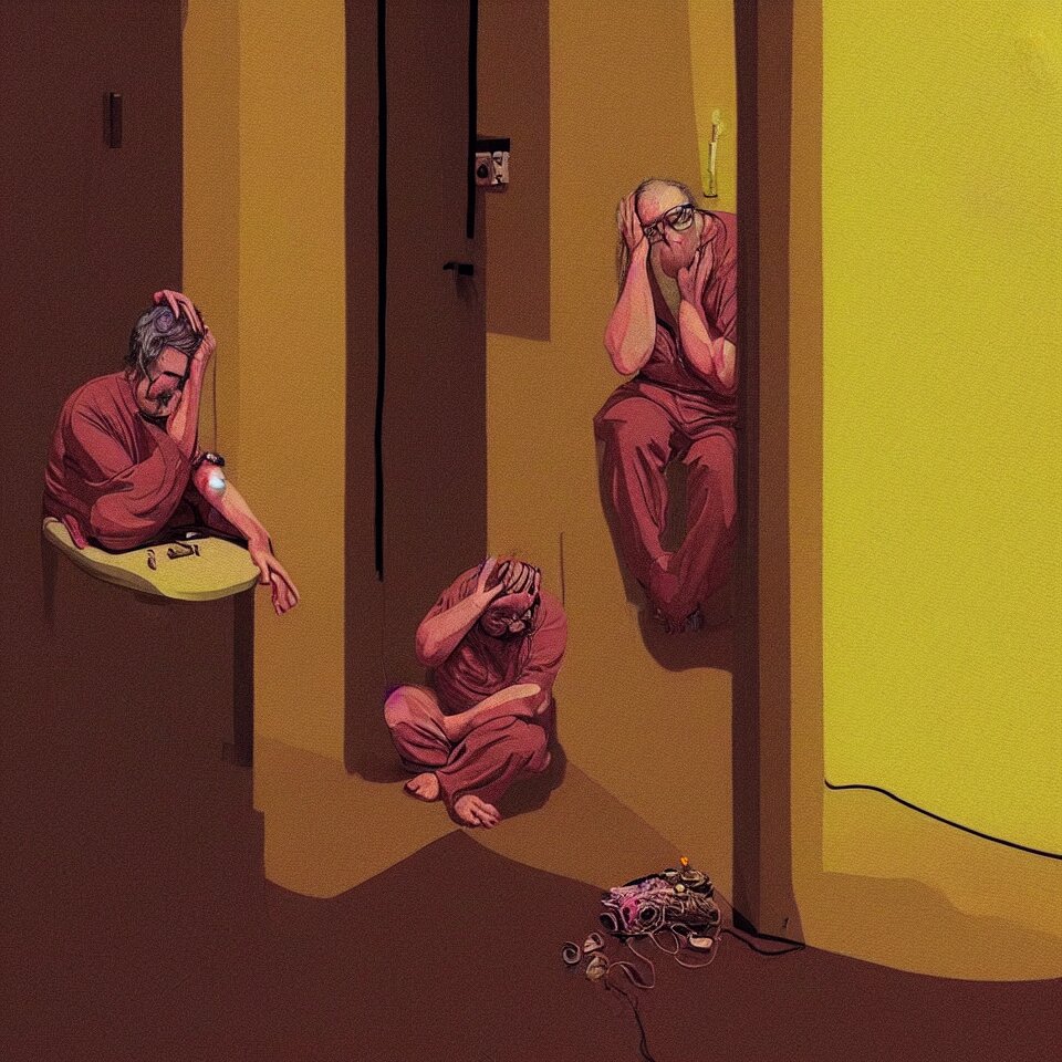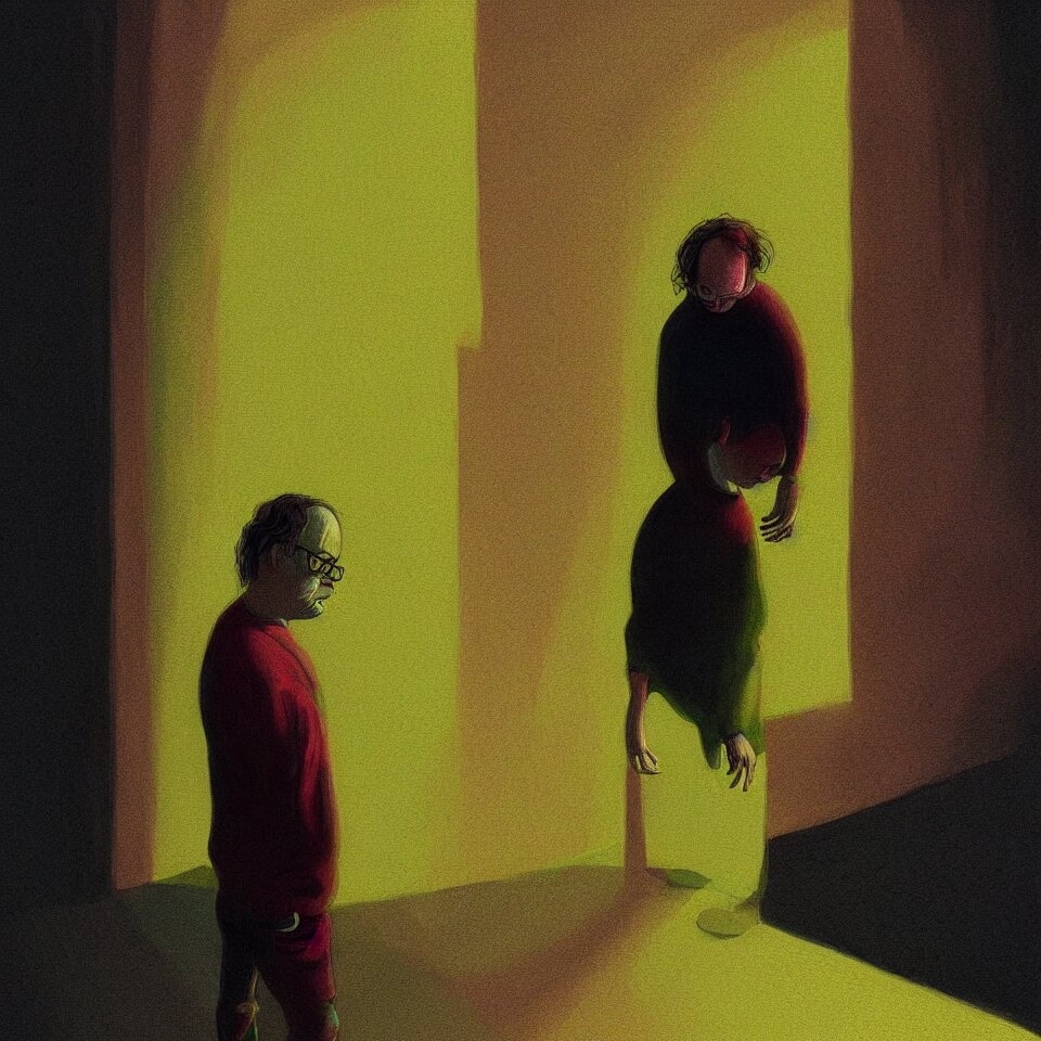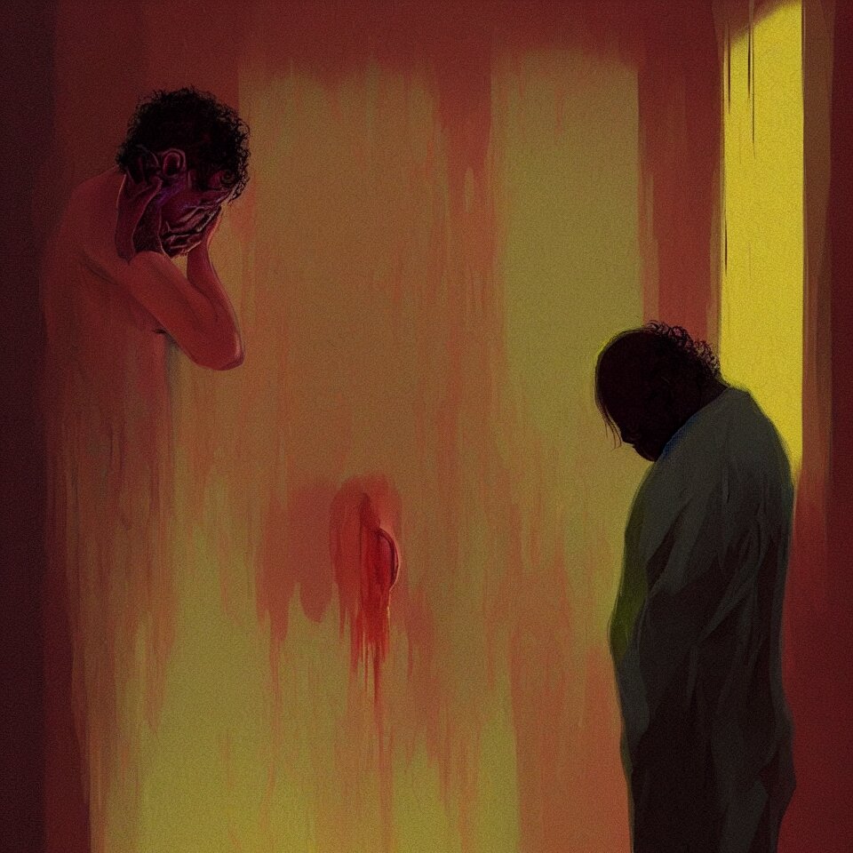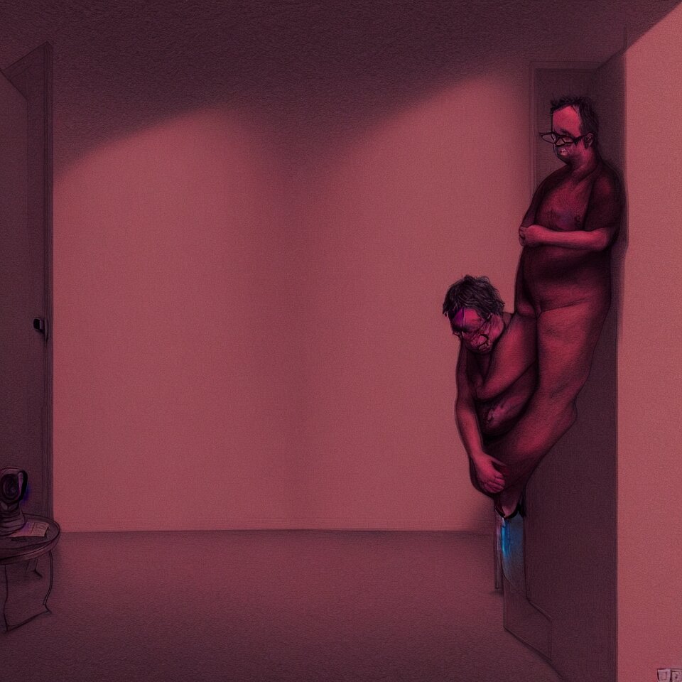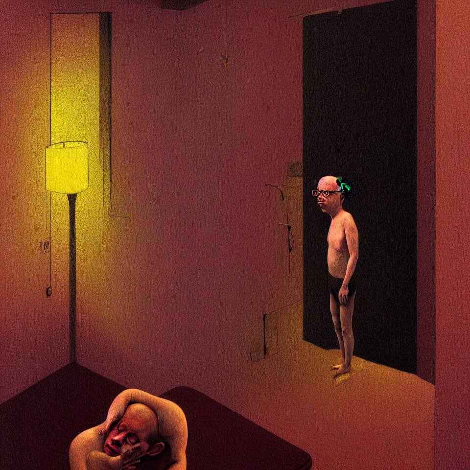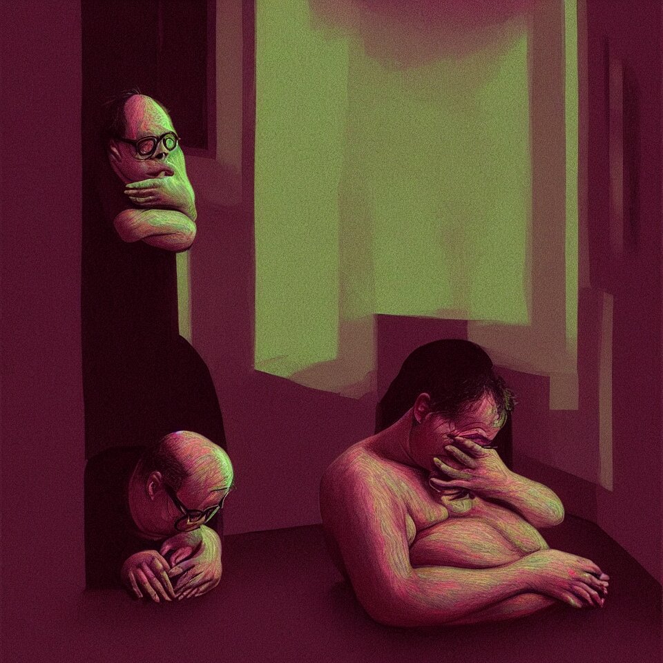 Sad and lonely psychedelic todd solondz crying alone in an empty appartment, diffuse lighting, fantasy, intricate, elegant, highly detailed, lifelike, photorealistic, digital painting, artstation, illustration, concept art, smooth, sharp focus, art by francis bacon