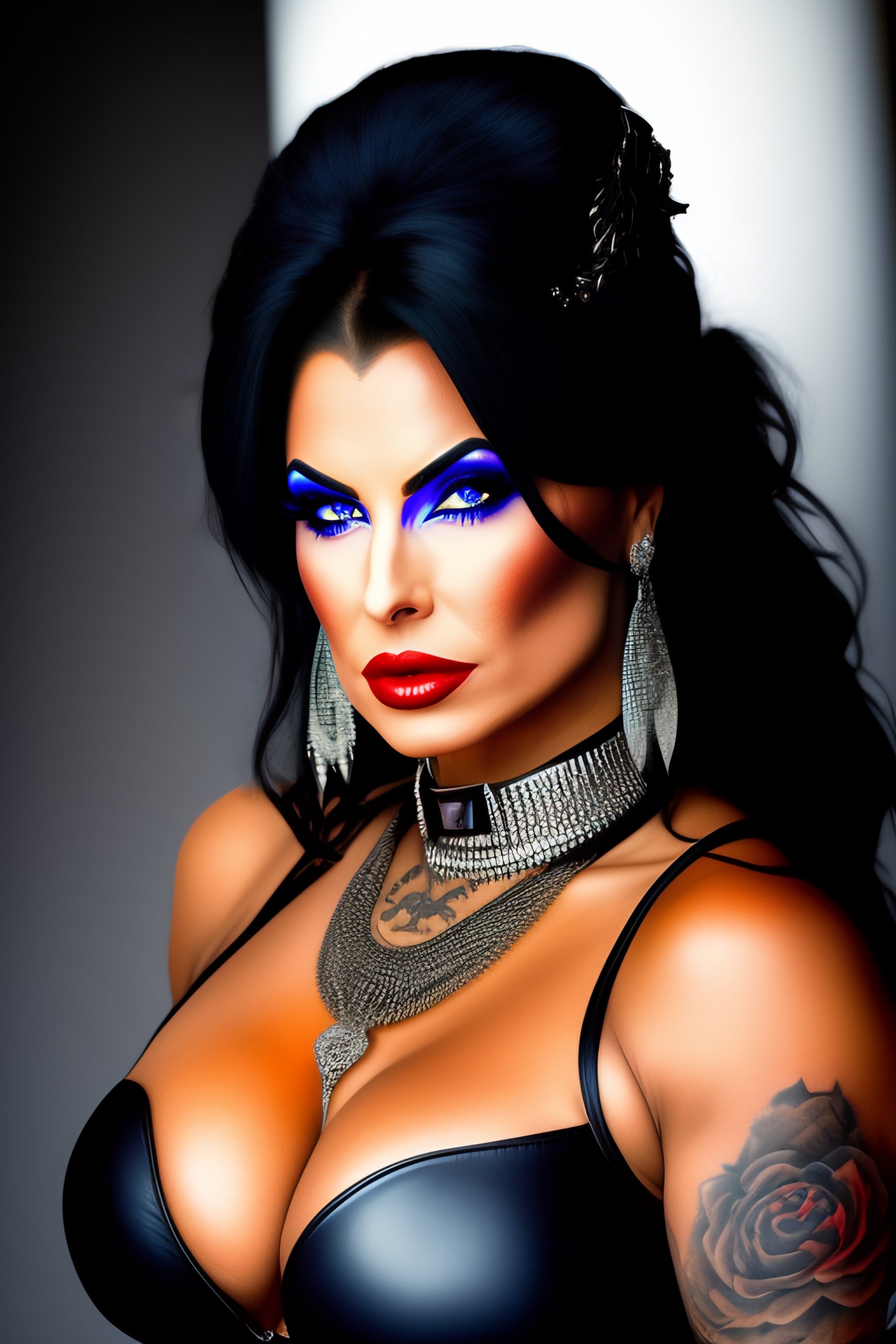 Blue eyes, very big full lips, wendy fiore in a goth outfit, red lipstick, dark eye shadow, tattoos on both arms and shoulders, oily shiny skin, big eyes, red nails