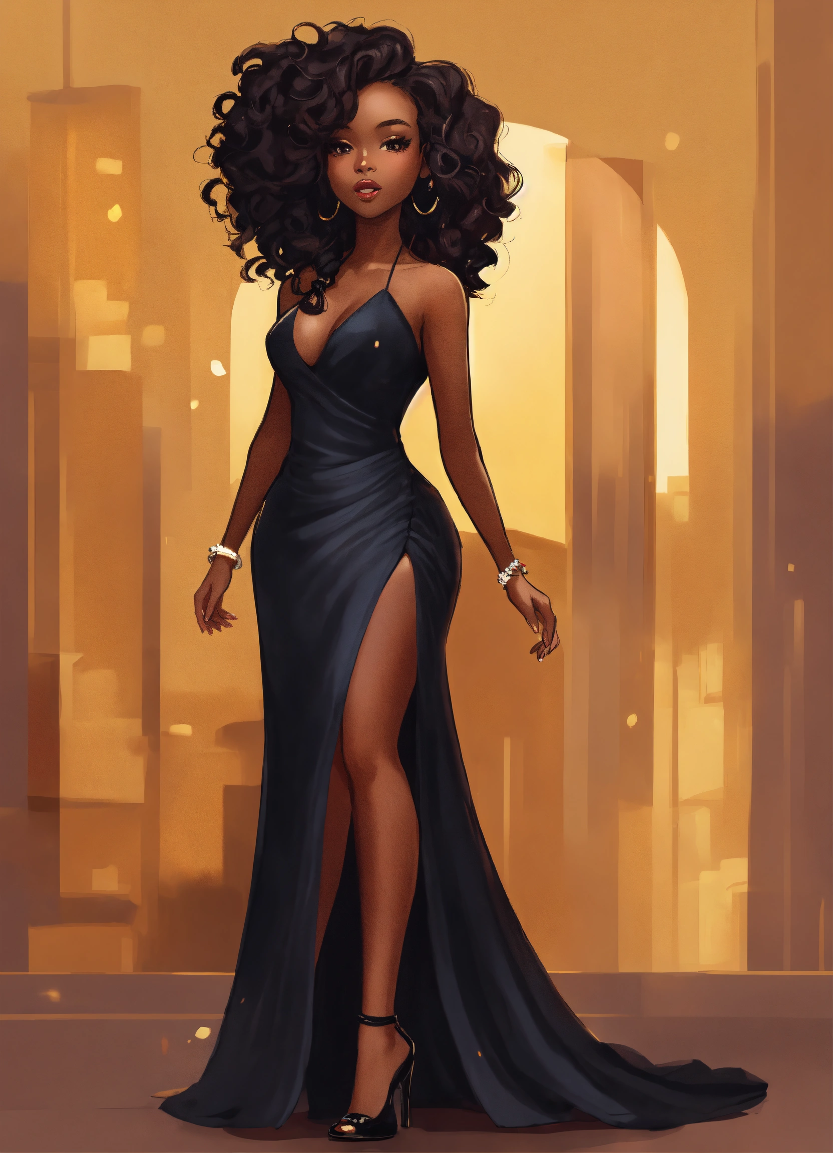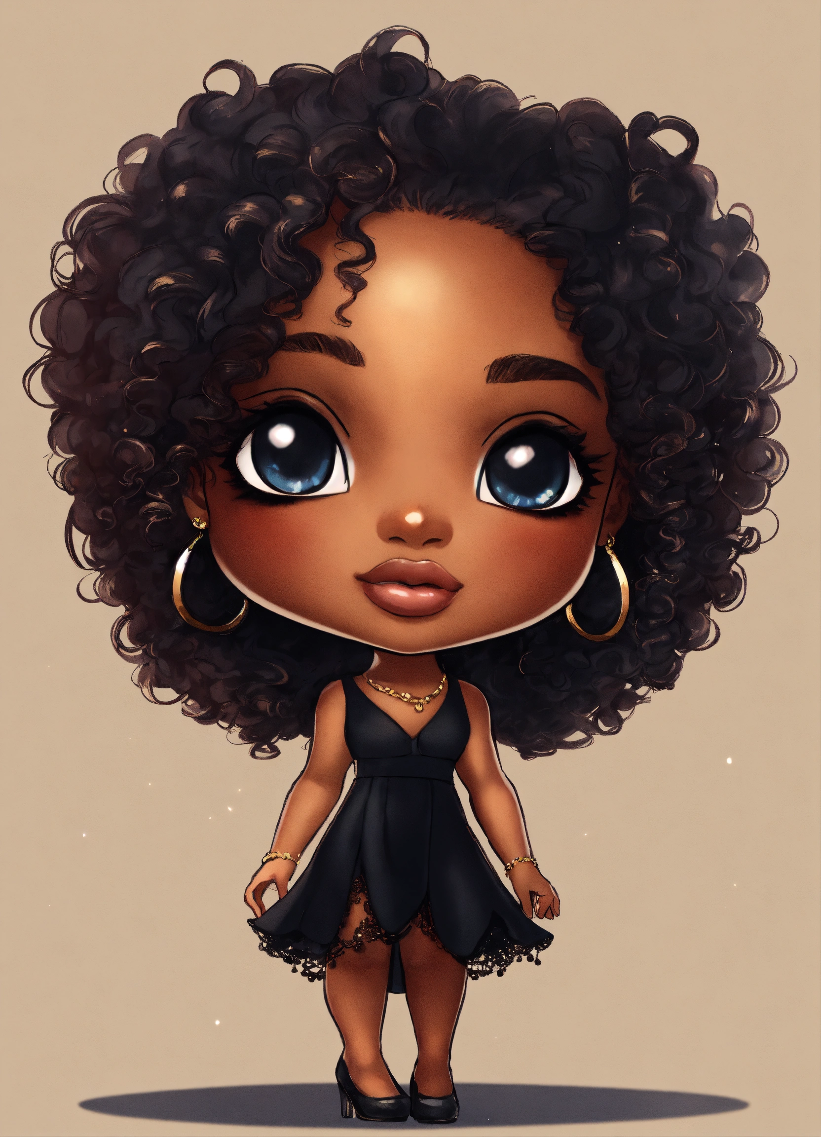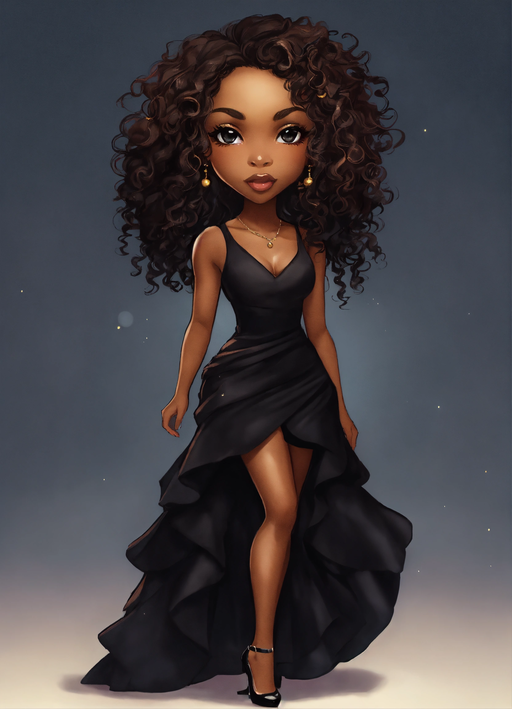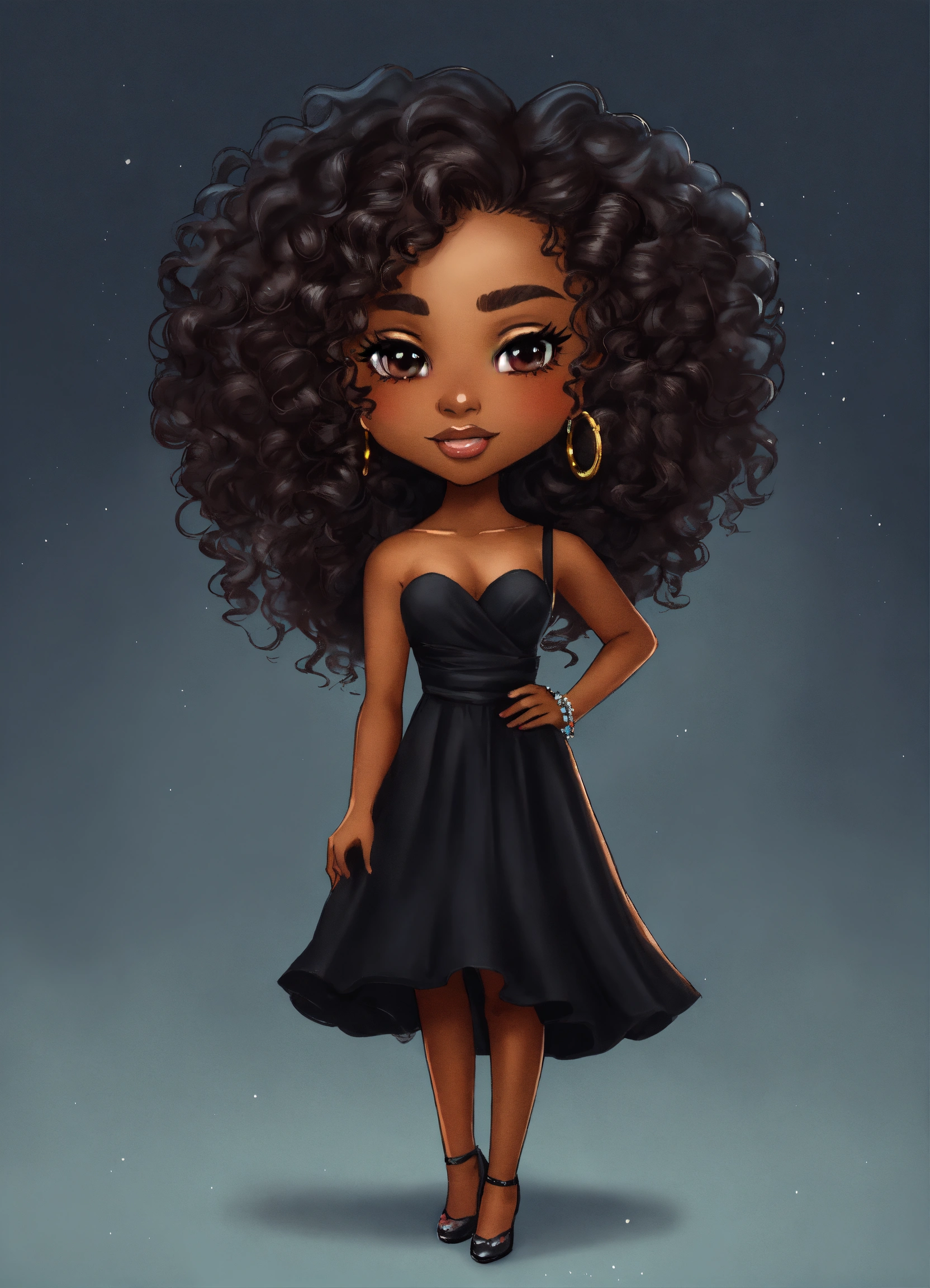Digital illustration of a sophisticated chibi african american woman with long curly hair, wearing a black cocktail dress. full body.