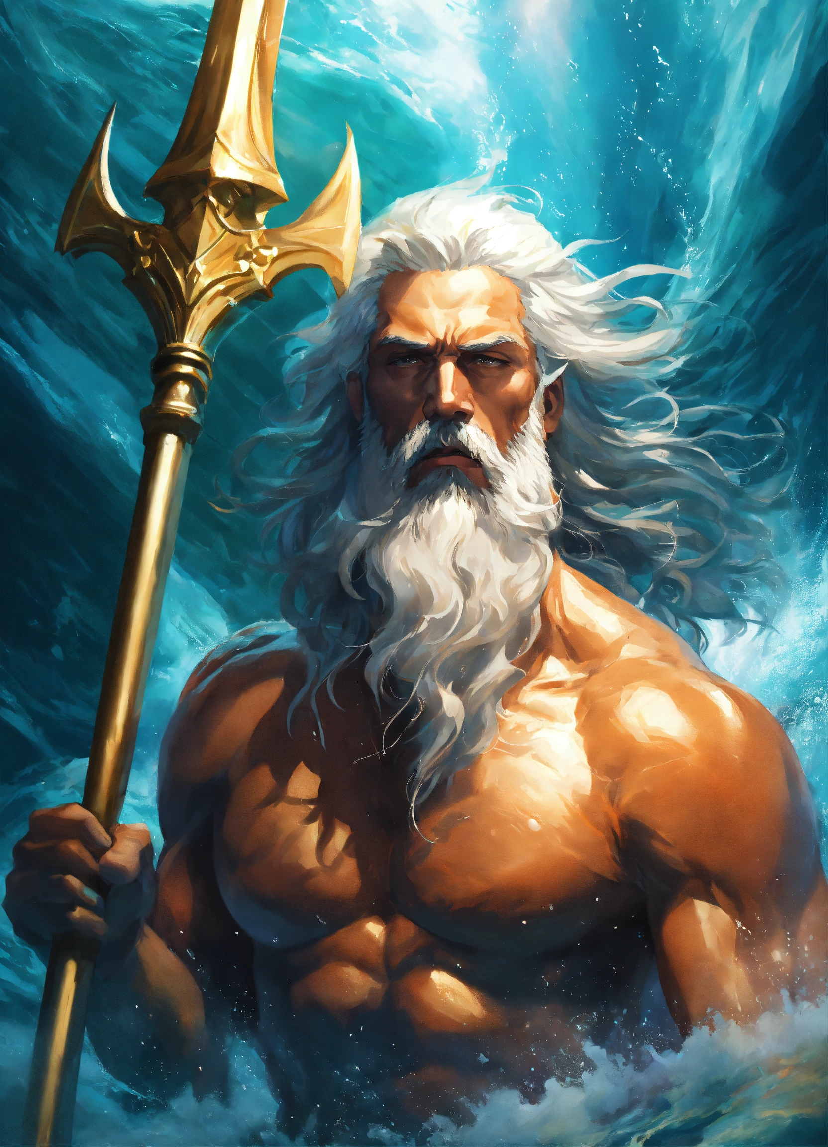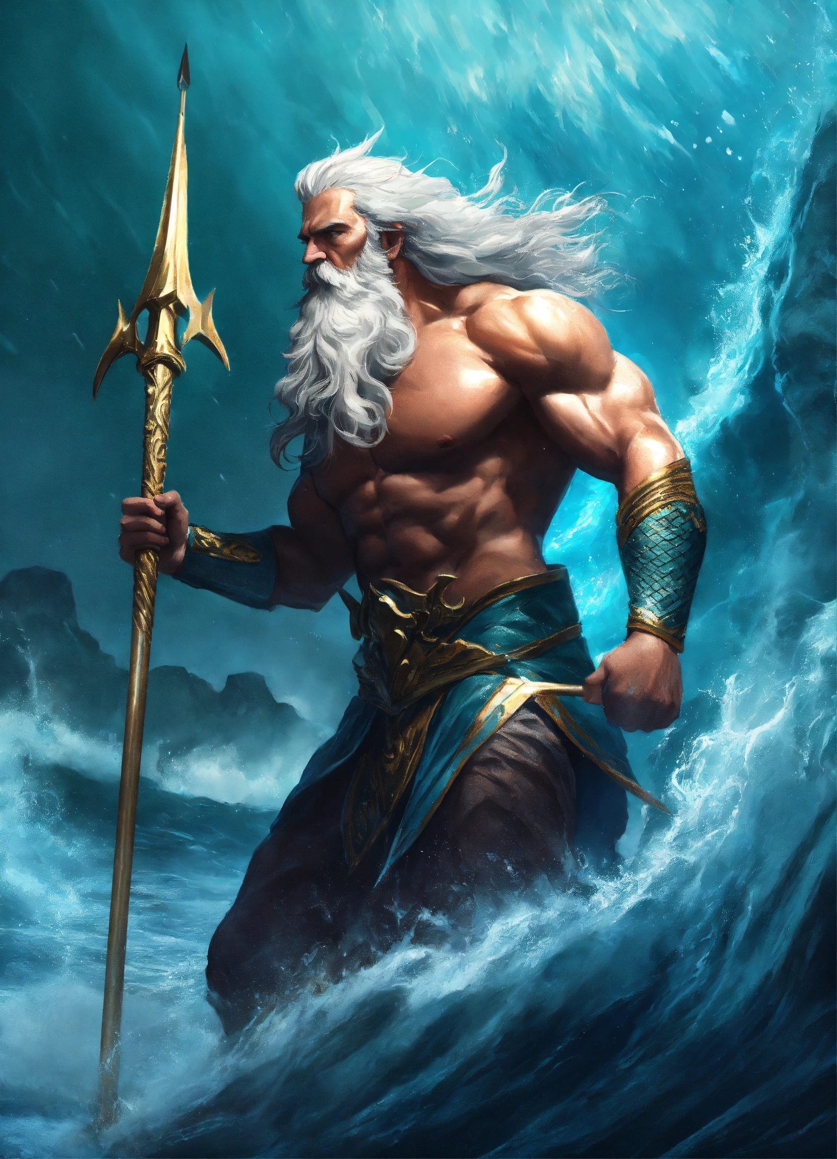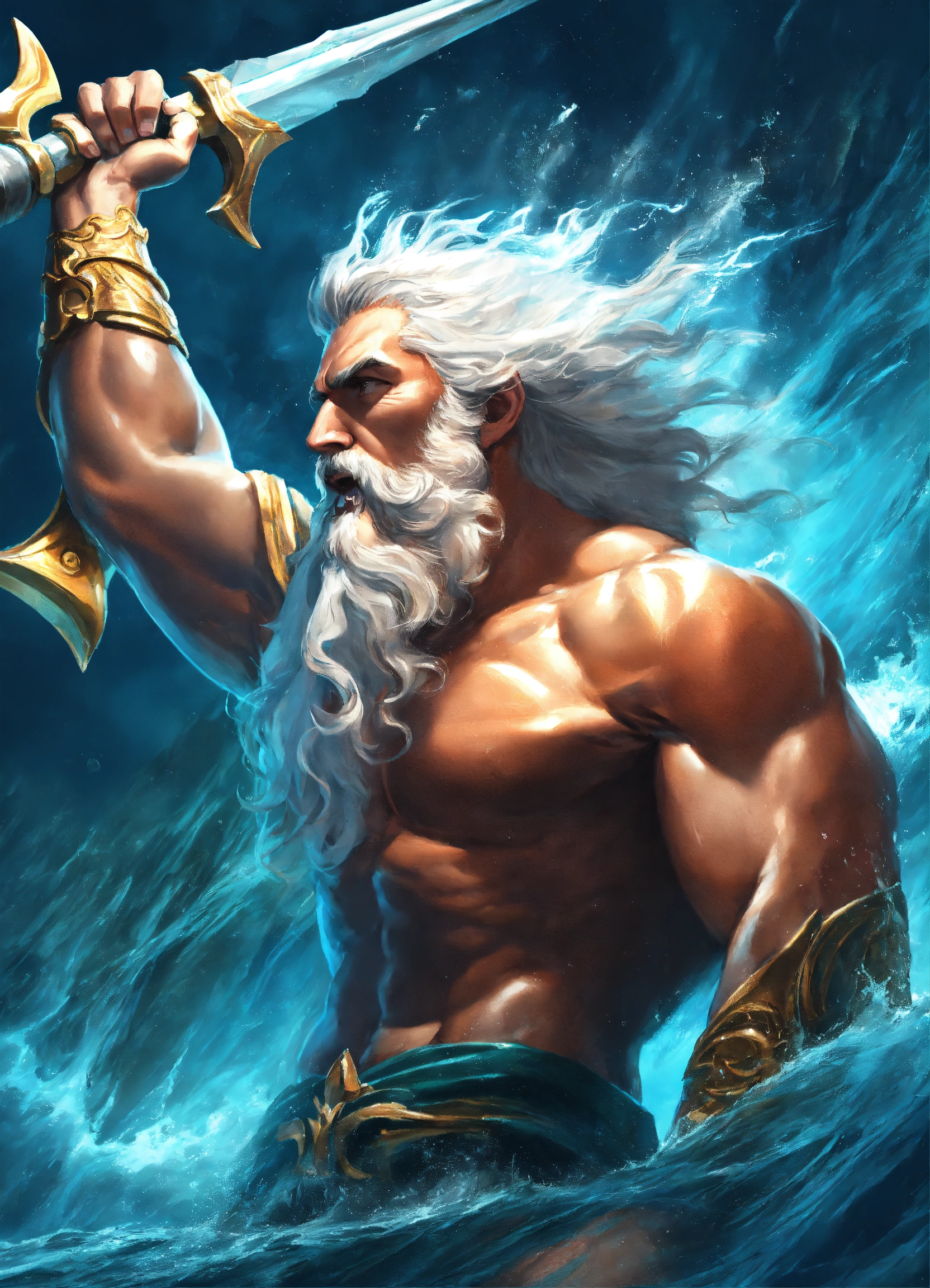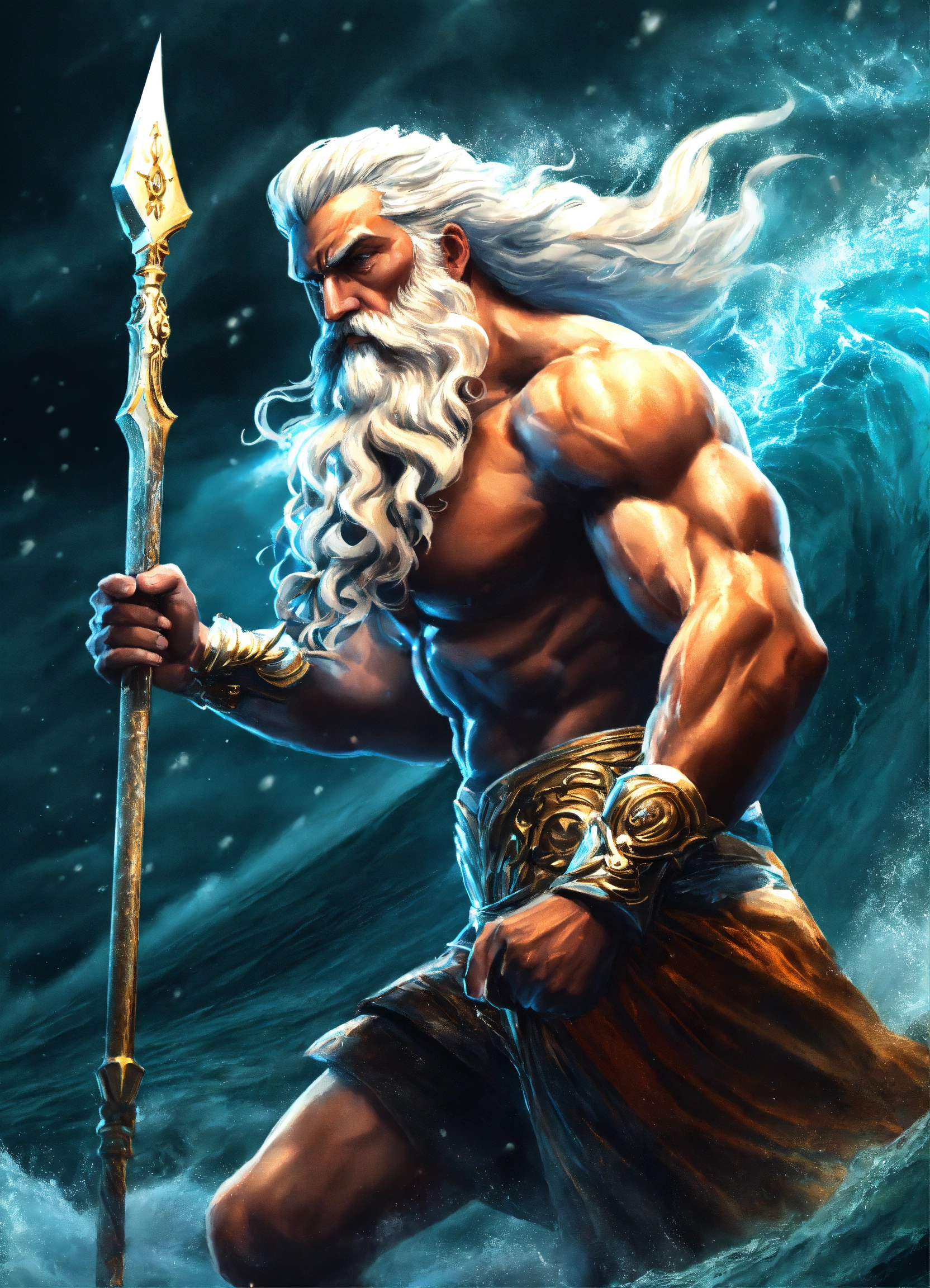 Poseidon in profile, god poseidon emerging from a raging hip-deep sea, harpooning his trident like a javelin thrower, thunder, fighting stance, realistic art style, white beard and long white hair, muscle, hd