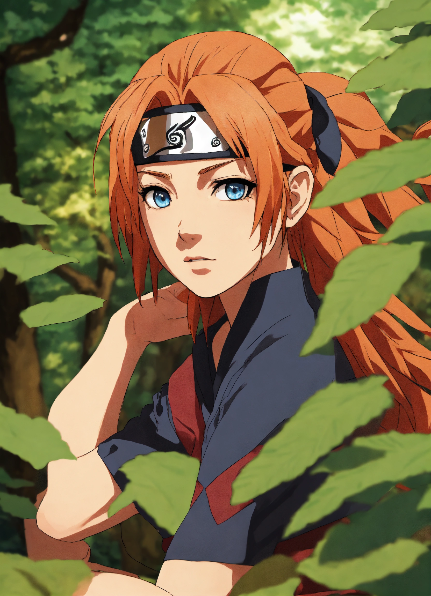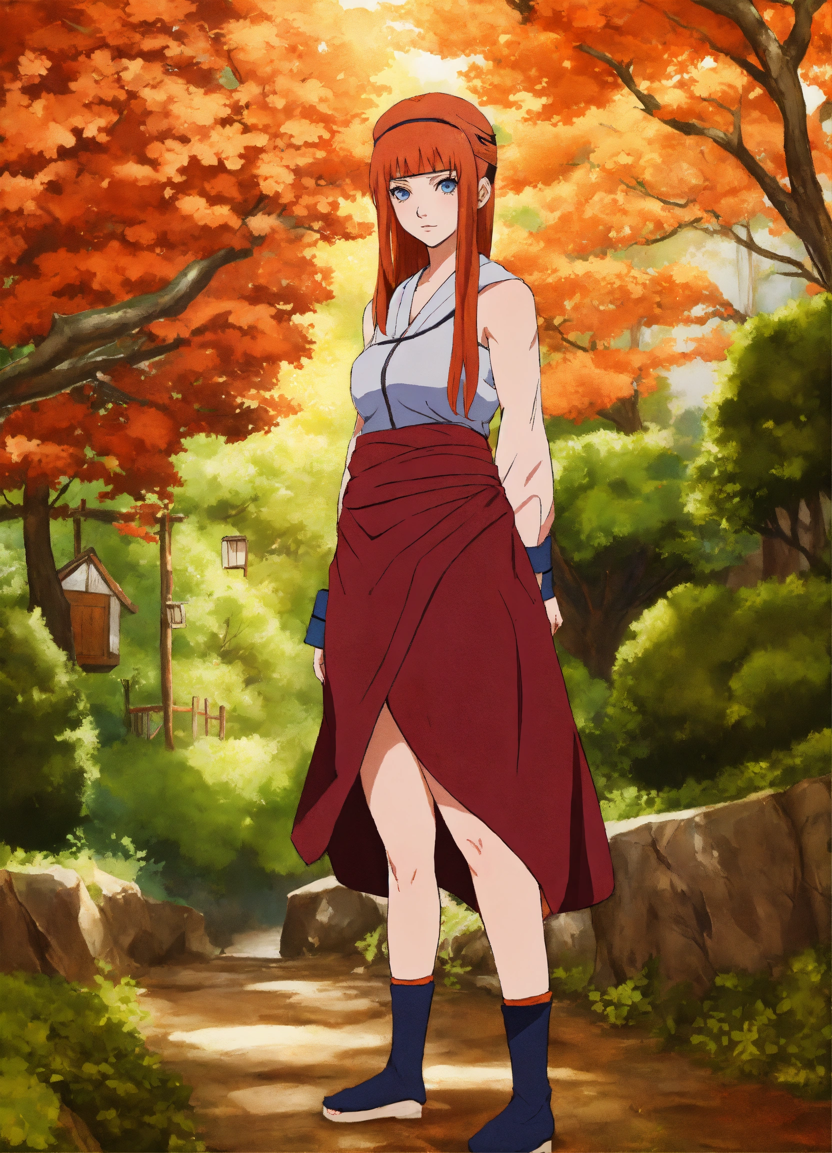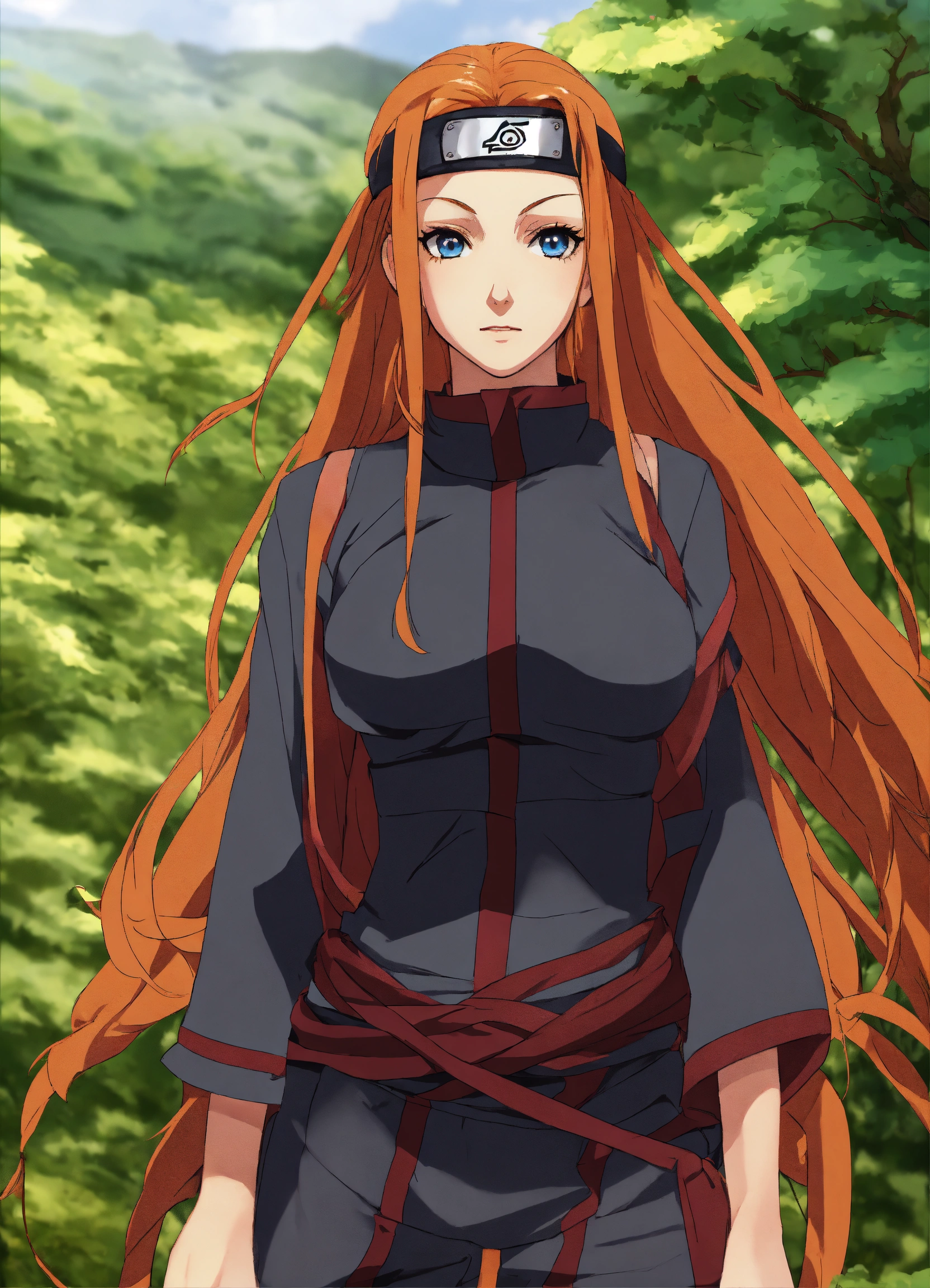 Naruto-style art, masashi kishimoto art, anime, naruto manga, naruto anime, original character, ginger hair, blue eyes, pretty woman, kunoichi, shinobi, konoha, ginger long hair, ginger hair, blue eyes, beautiful girl, beautiful young woman in naruto style art, feminine, fishnets, village hidden in the leaves headband, fishnets, maroon kunoichi attire, feminine kunoichi attire, naruto headband, fishnets tights on legs, flattering kunoichi fishnets with maroon outfit, long hair down and flowing, full body, older woman, jonin, jonin kunoichi, stylish outfit, mid 20’s in age